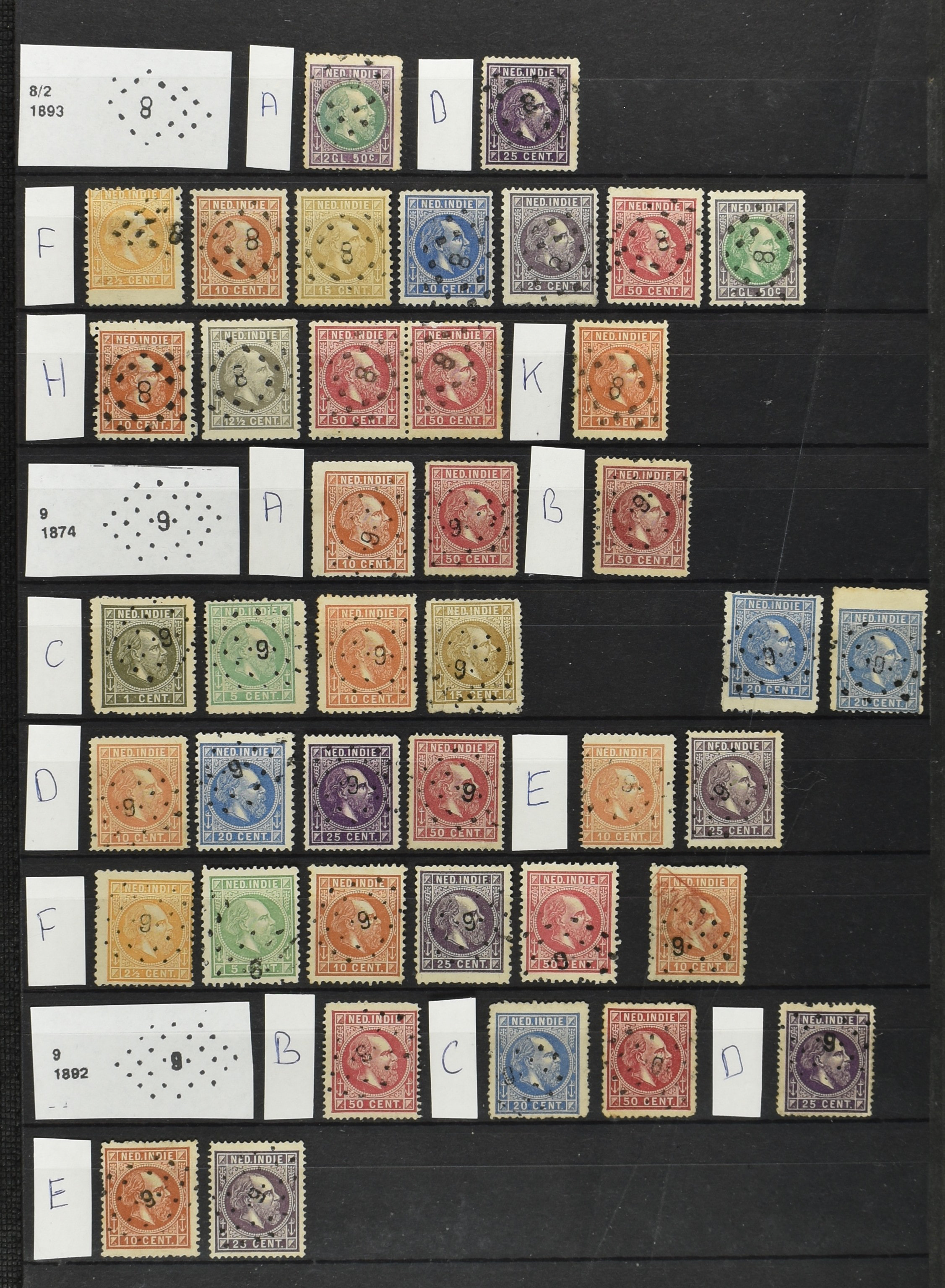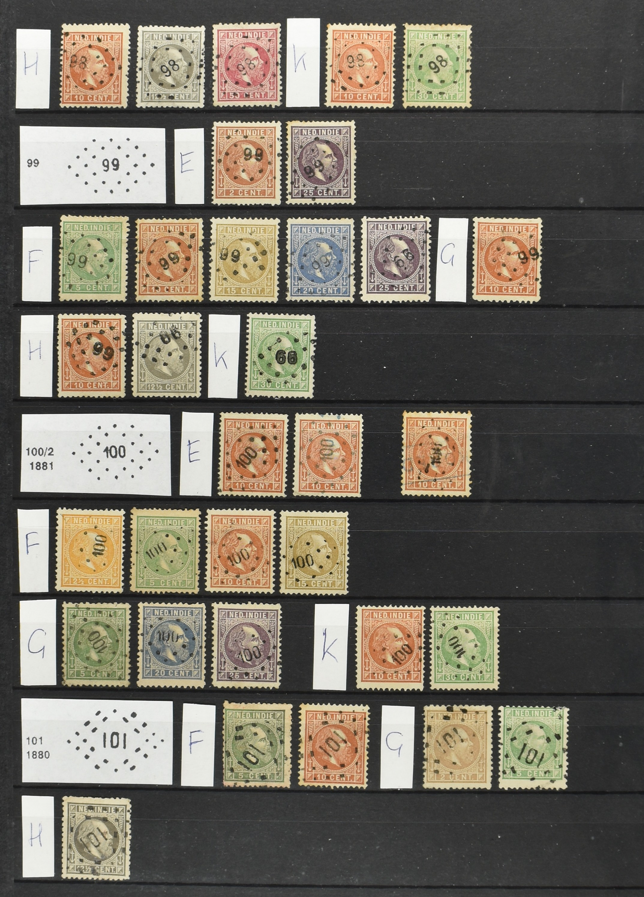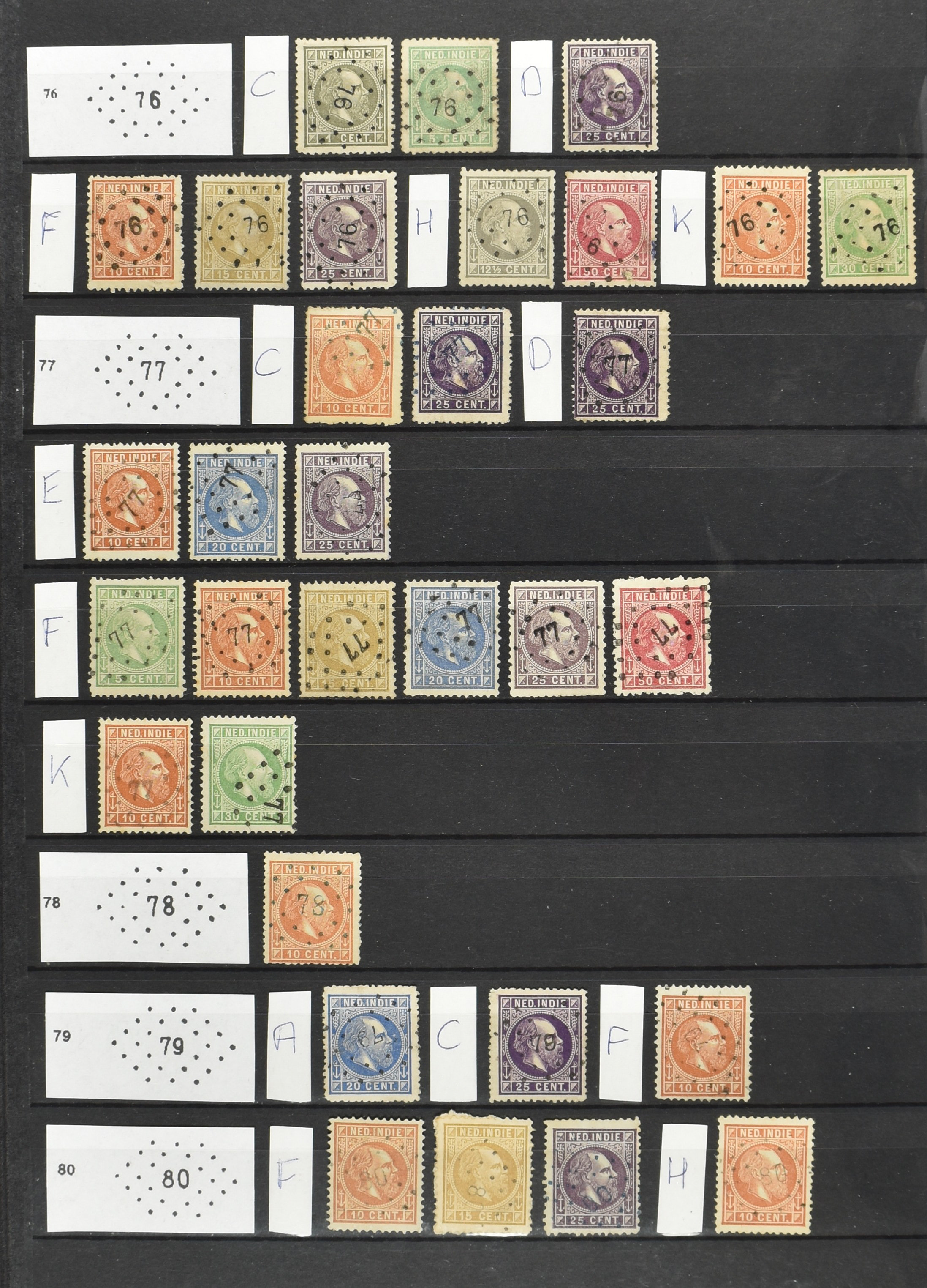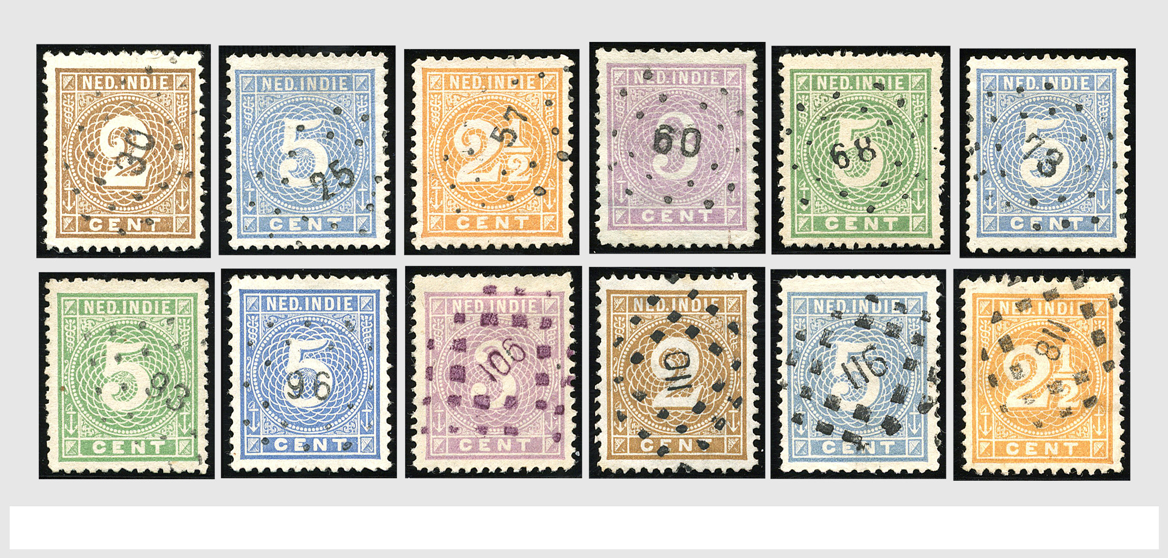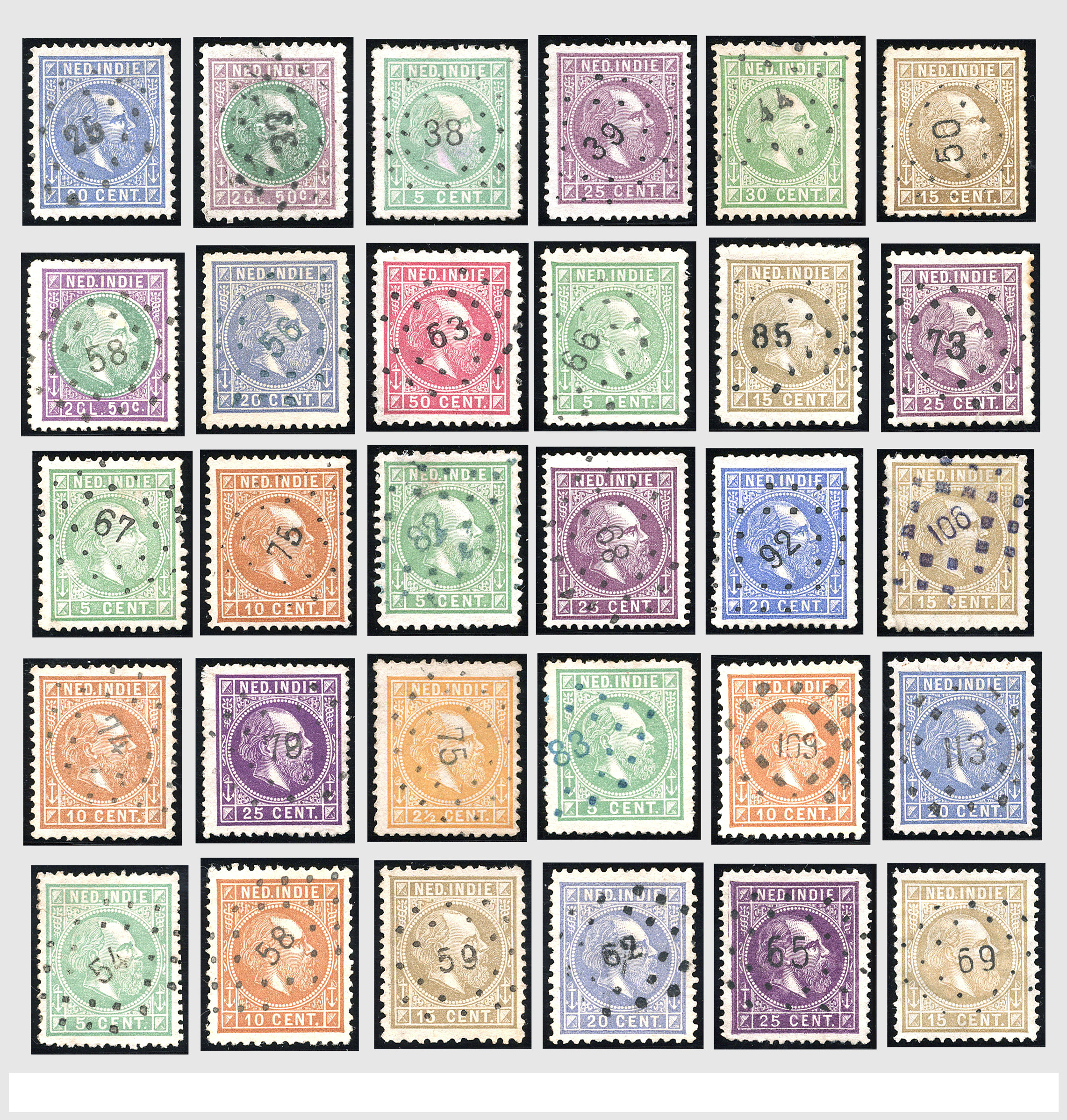 2249 imageNED.- INDIË PUNTSTEMPELS op Emissie Koning Willem III 1870-88, zeer uitgebreide collectie opgezet volgens Bulterman (De Postzak nr. 153, sep. 1987), per puntstempelnummer ieder type op zo veel mogelijk verschillende waarden en bovendien per waarde in de verschillende tandingen (!), diverse afstempelingen ook in blauw en violet, het geheel in uitgezochte kwaliteit met vrijwel uitsluitend volledige afstempelingen op zegels in doorgaans prachtkwaliteit, overzichtelijk op nummervolgorde en typen opgezet in 2 insteekboeken. Op nr. 100 type 1 (= Langkat) en 114 na zijn alle nummers vertegenwoordigd (1x 74 op 10 cent, 4x 75, 2x 112 op 10 en 12½ cent). De verzameling is een lust voor het oog, een uitgelezen kans om topkwaliteit te kopen en op te zetten, uiteraard ook geschikt voor kwaliteitsverbetering of detailleren. Een dergelijke op puntstempeltype, waarden en in de verschillende tandingen in zo'n kwaliteit hebben wij nog niet eerder aangeboden! (Image) (Image2) (Image3) (Image4) (Image5) (Image6) (Image7) (Image8) (Image9) (Image10) (Image11) (Image12) (Image13) (Image14) (Image15) (Image16) (Image17) (Image18) (Image19) (Image20) (Image21) (Image22) (Image23) (Image24) (Image25) (Image26) (Image27) (Image28) (Image29) (Image30) (Image31) (Image32) (Image33) (Image34) (Image35) (Image36) (Image37) (Image38) (Image39) (Image40) (Image41) (Image42) (Image43) (Image44) (Image45) (Image46) (Image47) (Image48) (Image49) (Image50) (Image51) (Image52) (Image53) (Image54) (Image55) (Image56) (Image57) (Image58) (Image59) (Image60) (Image61) (Image62) (Image63) (Image64) (Image65) (Image66) (Image67) (Image68) (Image69) (Image70) (Image71) (Image72) (Image73) (Image74) (Image75) (Image76) (Image77) (Image78) (Image79) (Image80) (All Images)