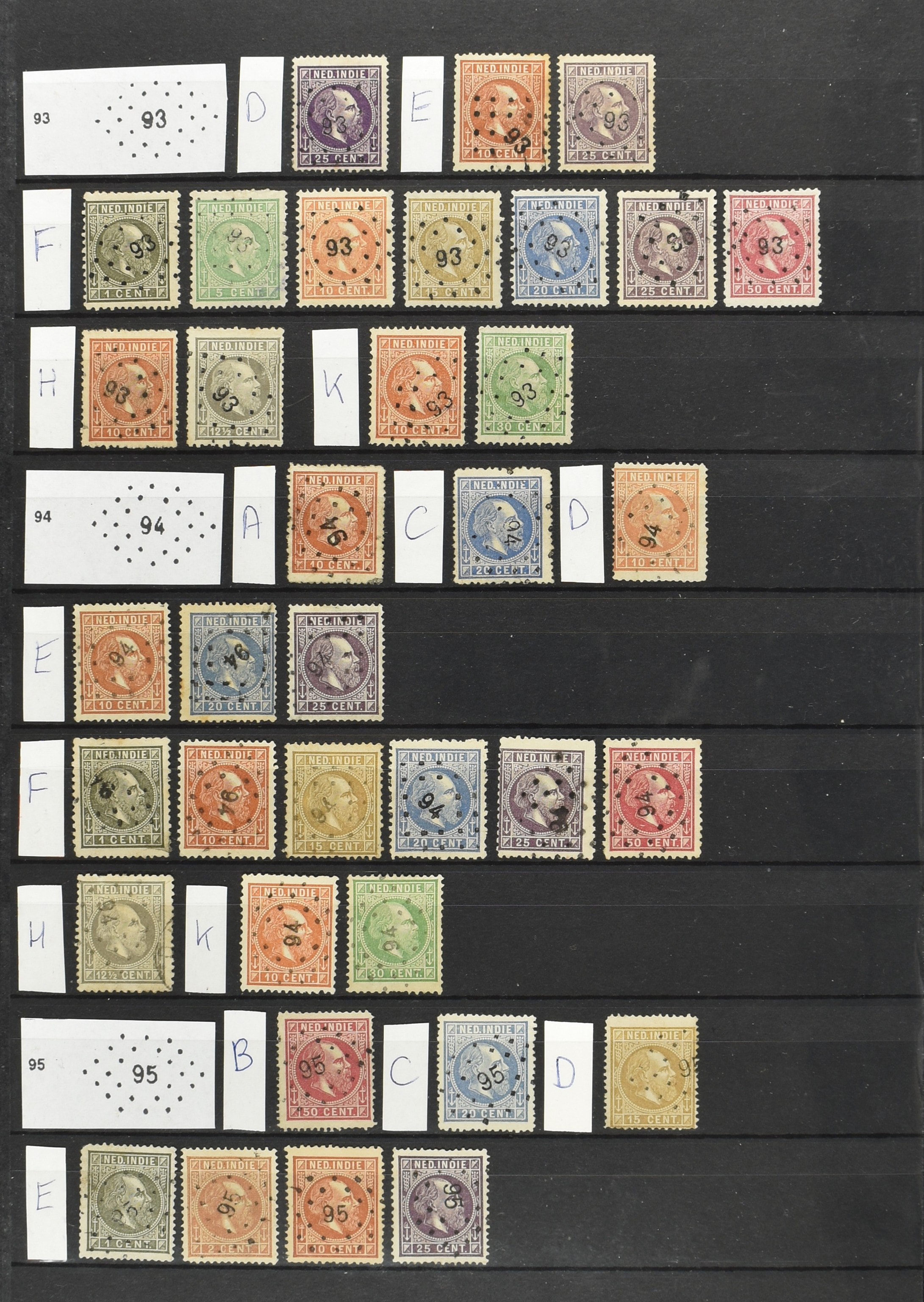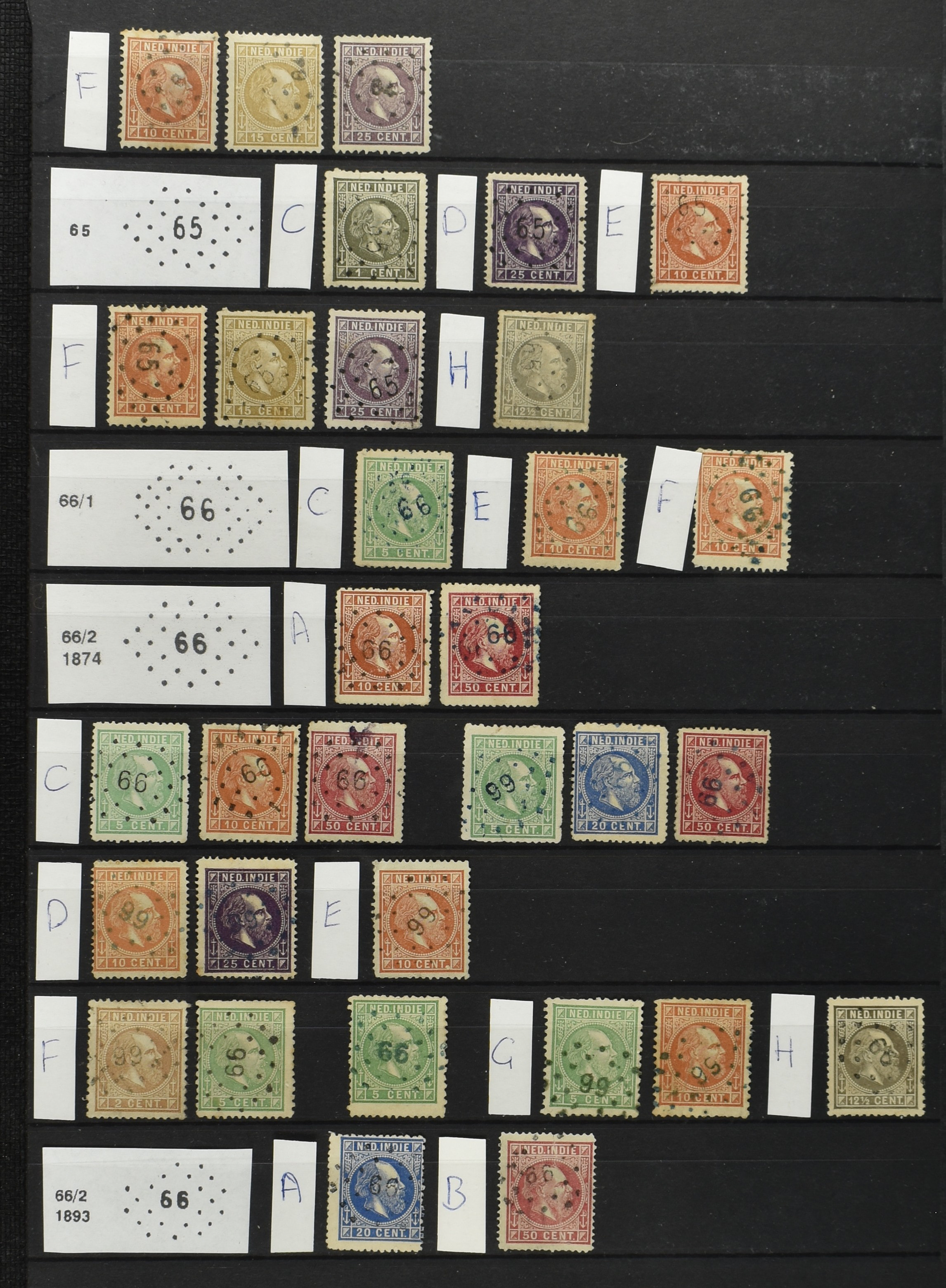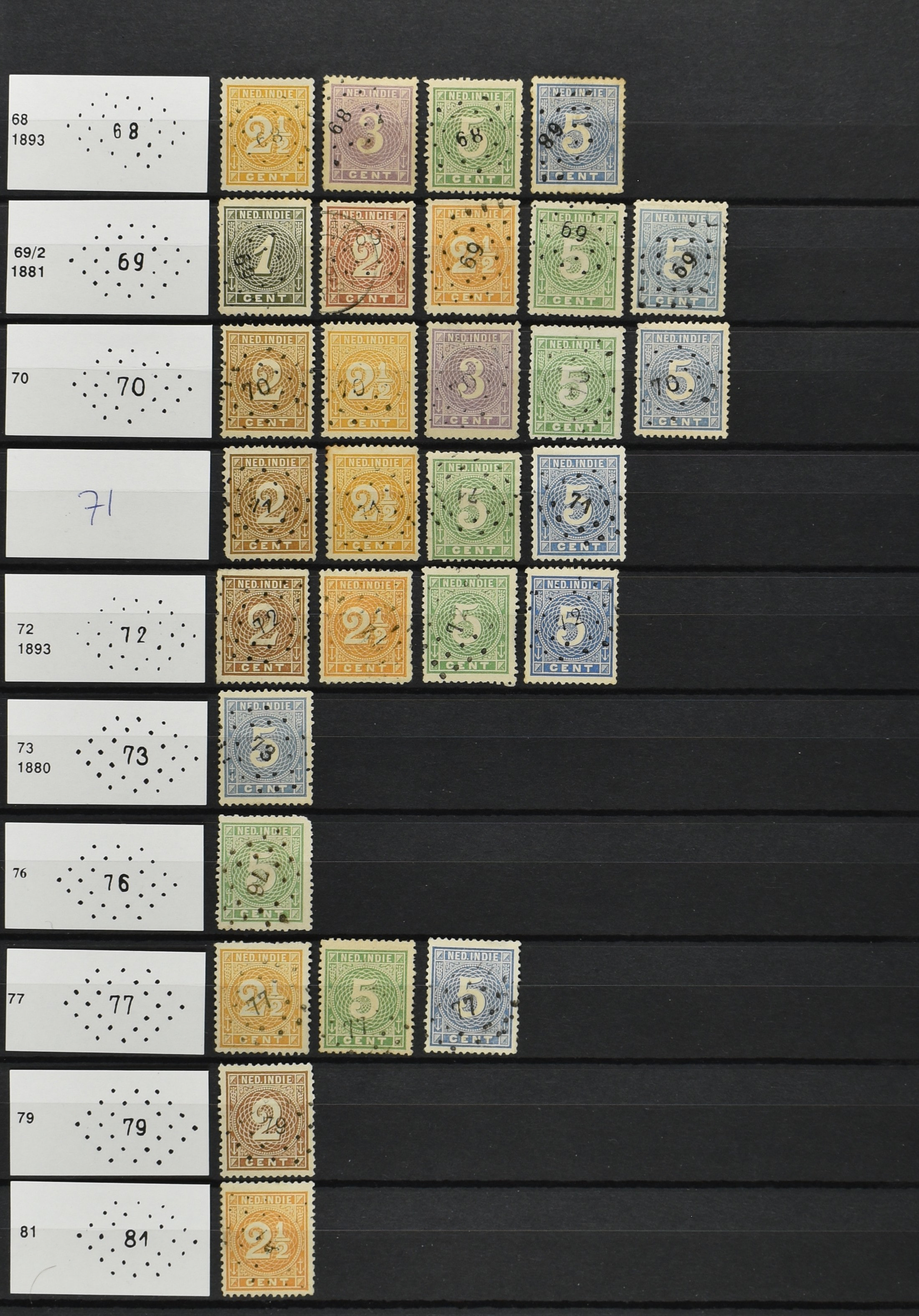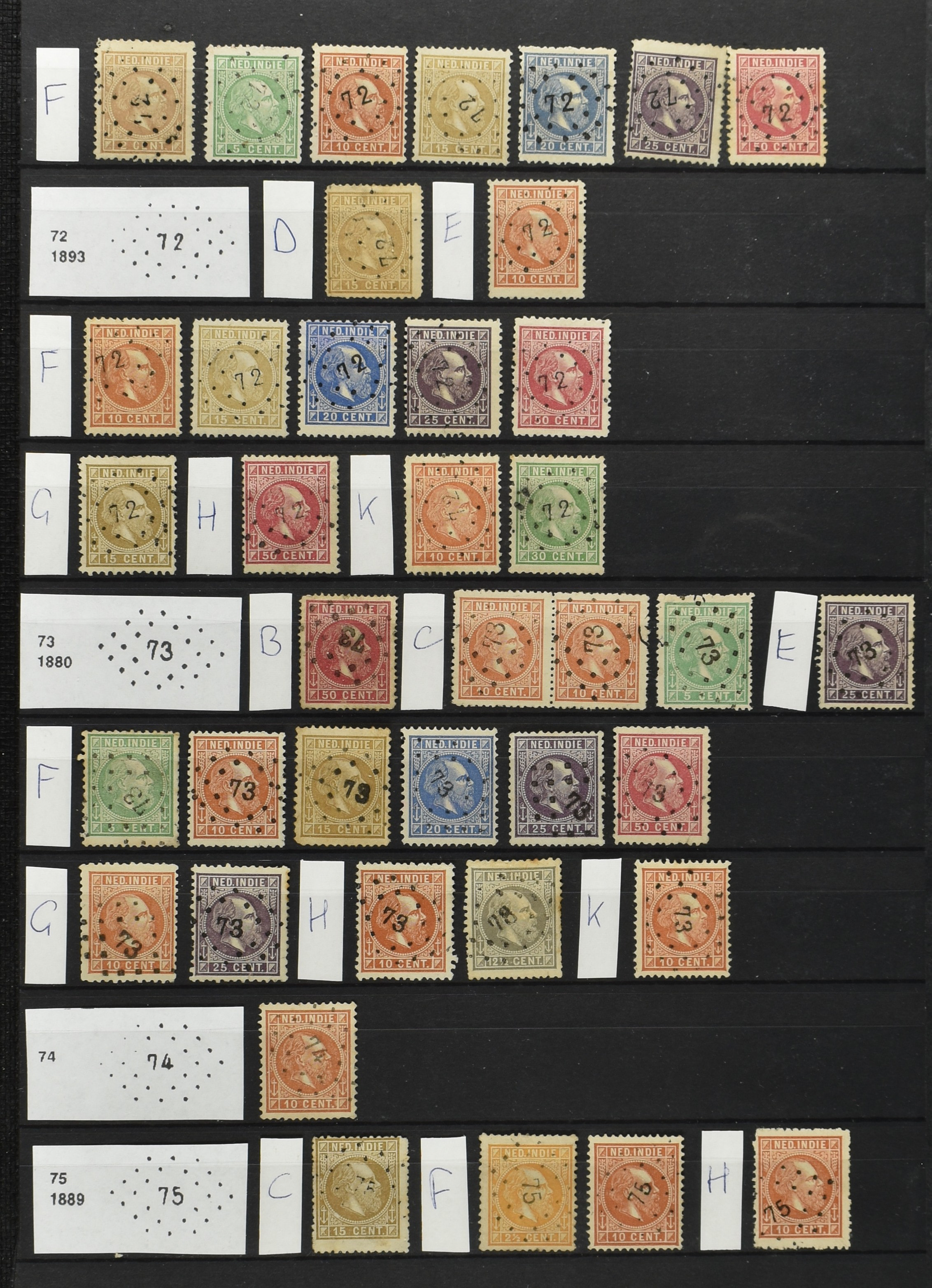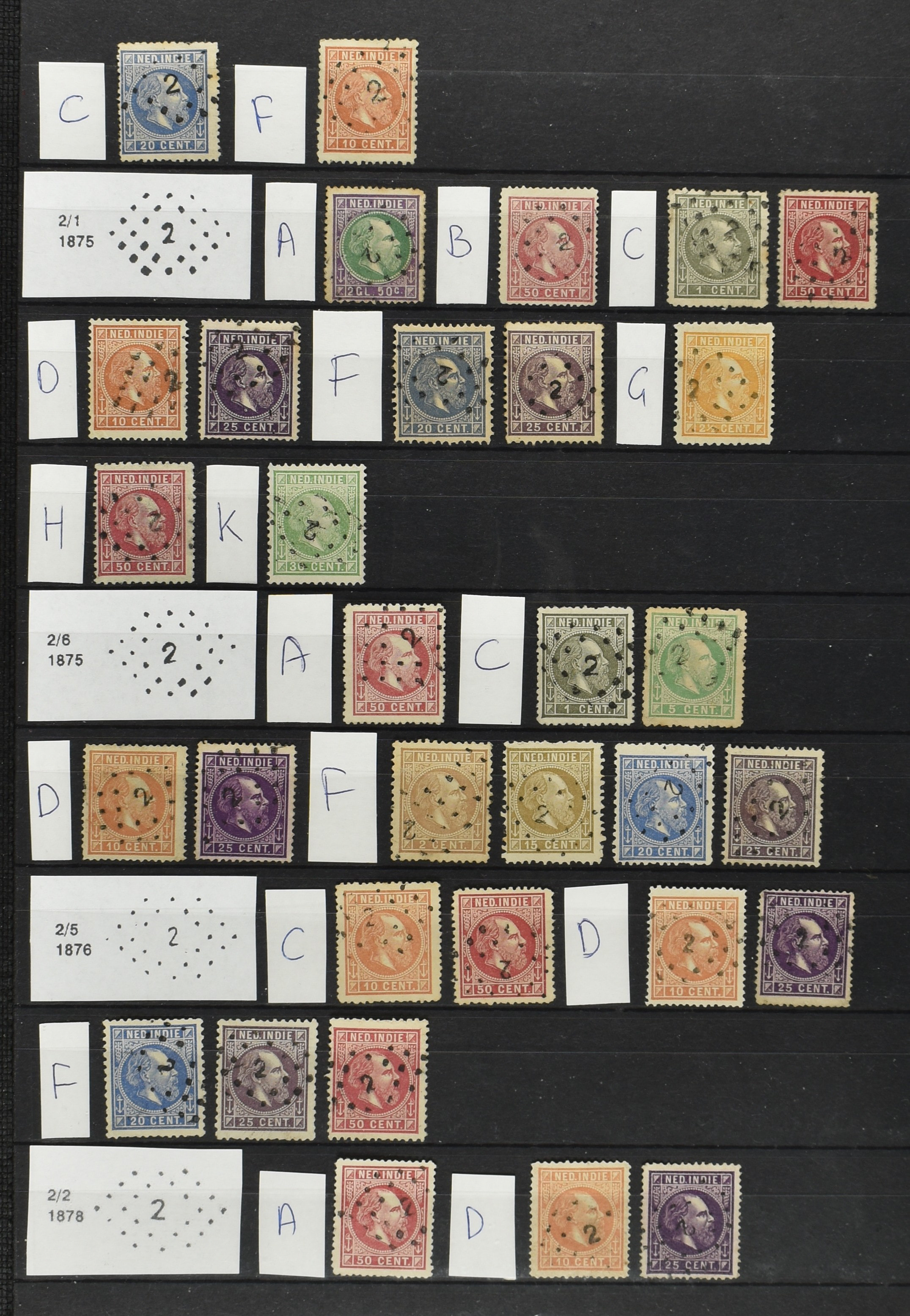 2249 imageNED.- INDIË PUNTSTEMPELS op Emissie Koning Willem III 1870-88, zeer uitgebreide collectie opgezet volgens Bulterman (De Postzak nr. 153, sep. 1987), per puntstempelnummer ieder type op zo veel mogelijk verschillende waarden en bovendien per waarde in de verschillende tandingen (!), diverse afstempelingen ook in blauw en violet, het geheel in uitgezochte kwaliteit met vrijwel uitsluitend volledige afstempelingen op zegels in doorgaans prachtkwaliteit, overzichtelijk op nummervolgorde en typen opgezet in 2 insteekboeken. Op nr. 100 type 1 (= Langkat) en 114 na zijn alle nummers vertegenwoordigd (1x 74 op 10 cent, 4x 75, 2x 112 op 10 en 12½ cent). De verzameling is een lust voor het oog, een uitgelezen kans om topkwaliteit te kopen en op te zetten, uiteraard ook geschikt voor kwaliteitsverbetering of detailleren. Een dergelijke op puntstempeltype, waarden en in de verschillende tandingen in zo'n kwaliteit hebben wij nog niet eerder aangeboden! (Image) (Image2) (Image3) (Image4) (Image5) (Image6) (Image7) (Image8) (Image9) (Image10) (Image11) (Image12) (Image13) (Image14) (Image15) (Image16) (Image17) (Image18) (Image19) (Image20) (Image21) (Image22) (Image23) (Image24) (Image25) (Image26) (Image27) (Image28) (Image29) (Image30) (Image31) (Image32) (Image33) (Image34) (Image35) (Image36) (Image37) (Image38) (Image39) (Image40) (Image41) (Image42) (Image43) (Image44) (Image45) (Image46) (Image47) (Image48) (Image49) (Image50) (Image51) (Image52) (Image53) (Image54) (Image55) (Image56) (Image57) (Image58) (Image59) (Image60) (Image61) (Image62) (Image63) (Image64) (Image65) (Image66) (Image67) (Image68) (Image69) (Image70) (Image71) (Image72) (Image73) (Image74) (Image75) (Image76) (Image77) (Image78) (Image79) (Image80) (All Images)