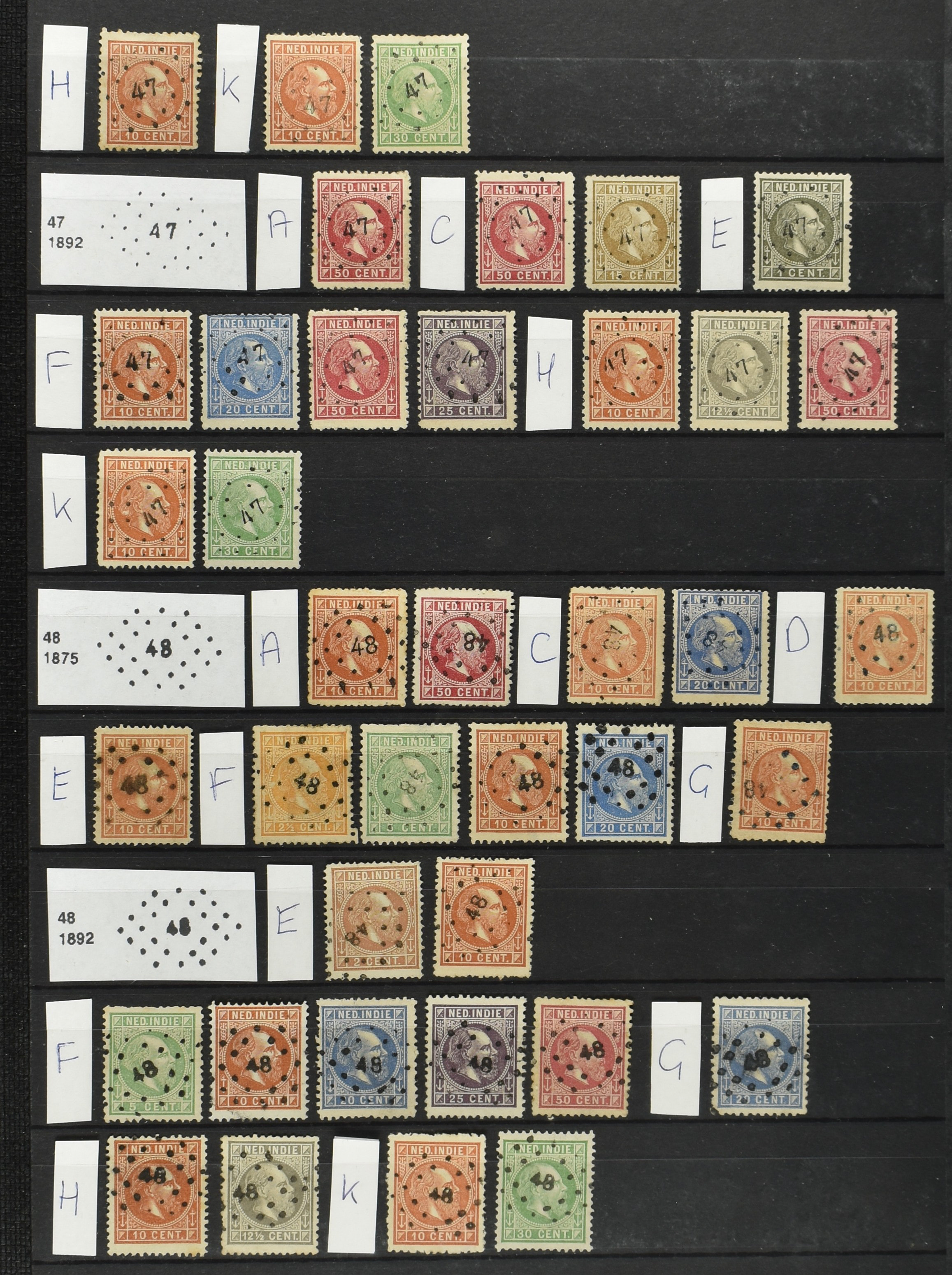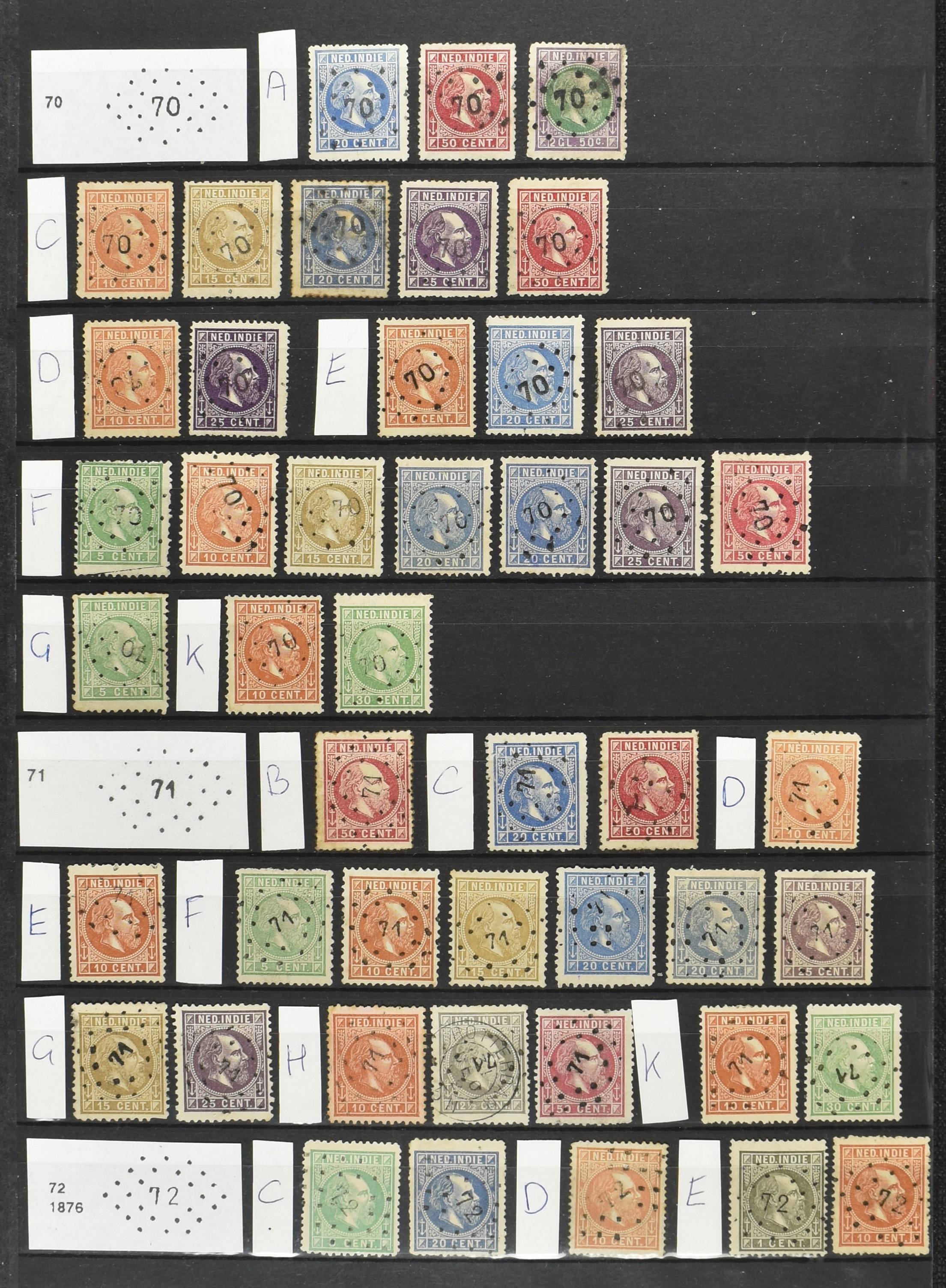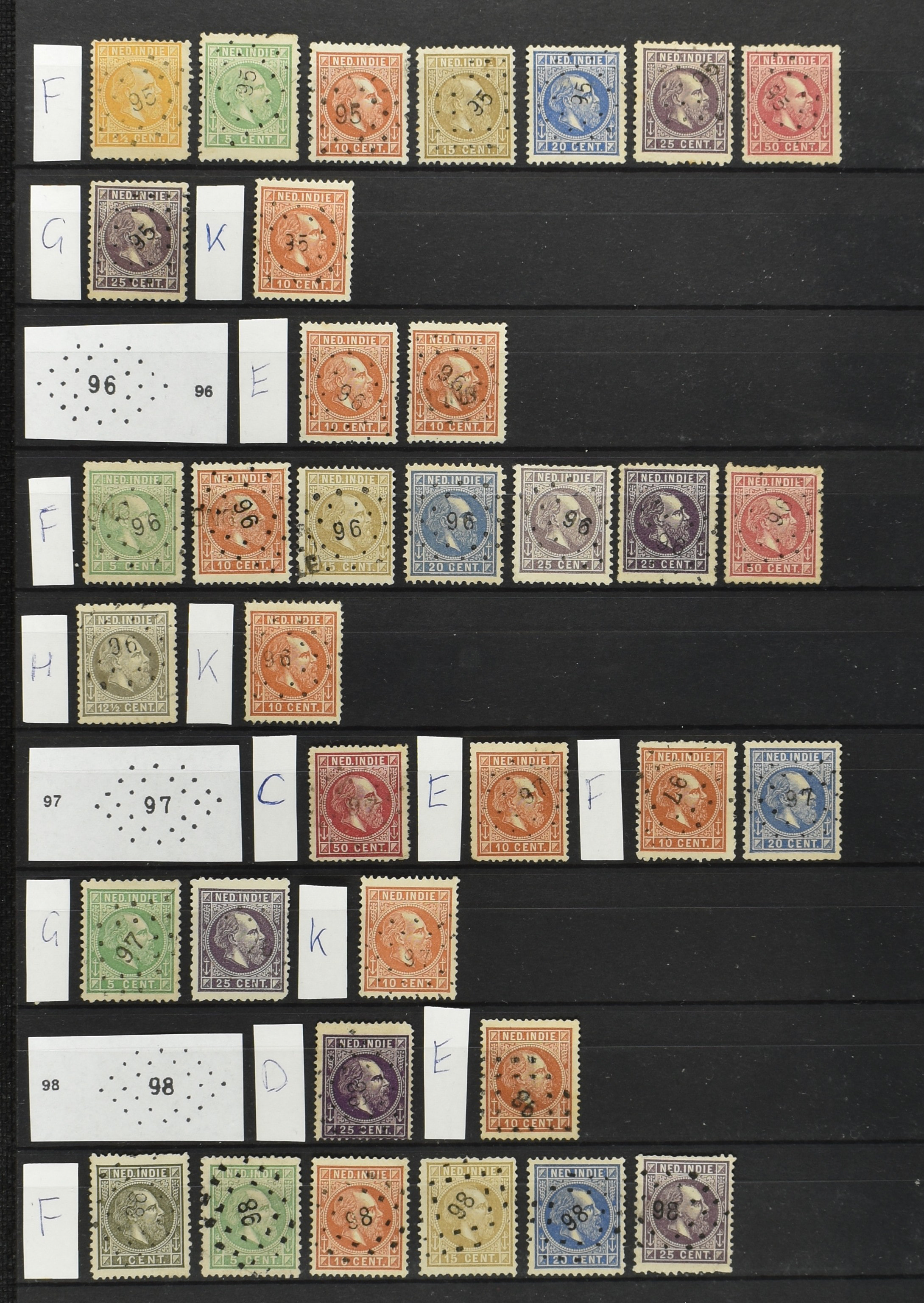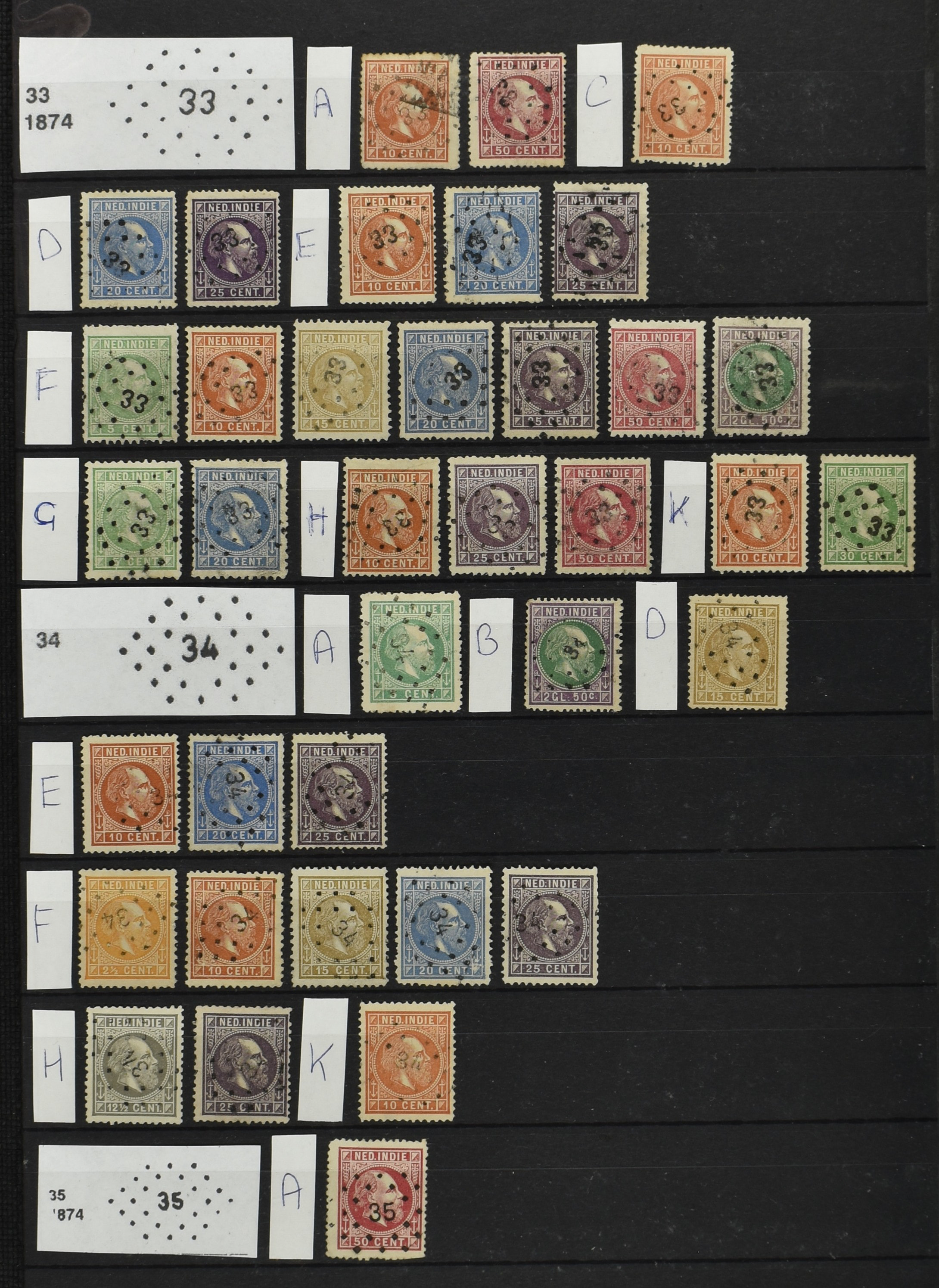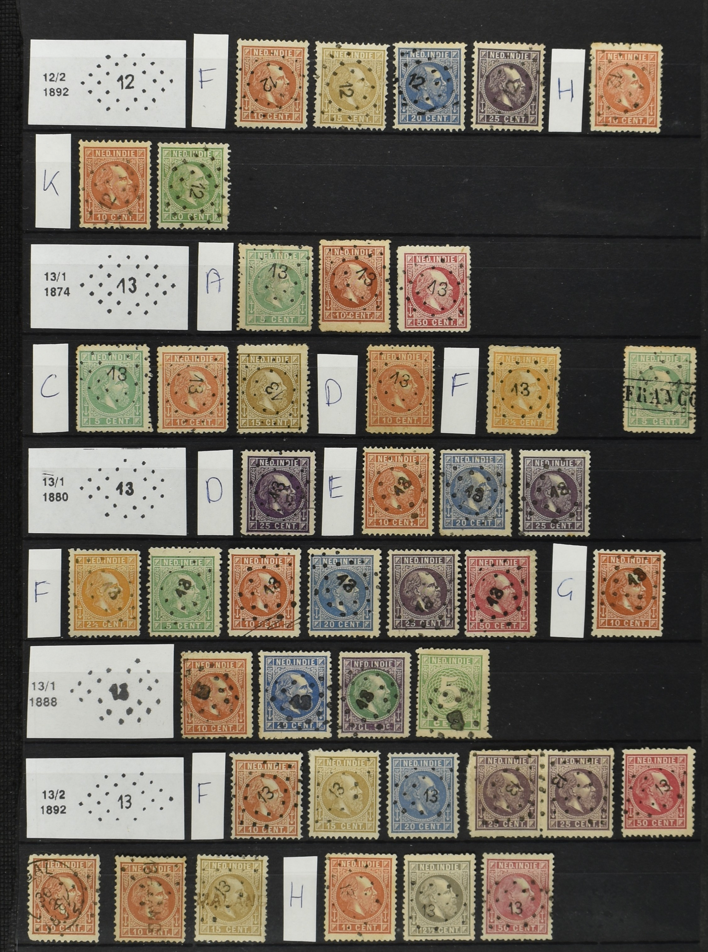 2249 imageNED.- INDIË PUNTSTEMPELS op Emissie Koning Willem III 1870-88, zeer uitgebreide collectie opgezet volgens Bulterman (De Postzak nr. 153, sep. 1987), per puntstempelnummer ieder type op zo veel mogelijk verschillende waarden en bovendien per waarde in de verschillende tandingen (!), diverse afstempelingen ook in blauw en violet, het geheel in uitgezochte kwaliteit met vrijwel uitsluitend volledige afstempelingen op zegels in doorgaans prachtkwaliteit, overzichtelijk op nummervolgorde en typen opgezet in 2 insteekboeken. Op nr. 100 type 1 (= Langkat) en 114 na zijn alle nummers vertegenwoordigd (1x 74 op 10 cent, 4x 75, 2x 112 op 10 en 12½ cent). De verzameling is een lust voor het oog, een uitgelezen kans om topkwaliteit te kopen en op te zetten, uiteraard ook geschikt voor kwaliteitsverbetering of detailleren. Een dergelijke op puntstempeltype, waarden en in de verschillende tandingen in zo'n kwaliteit hebben wij nog niet eerder aangeboden! (Image) (Image2) (Image3) (Image4) (Image5) (Image6) (Image7) (Image8) (Image9) (Image10) (Image11) (Image12) (Image13) (Image14) (Image15) (Image16) (Image17) (Image18) (Image19) (Image20) (Image21) (Image22) (Image23) (Image24) (Image25) (Image26) (Image27) (Image28) (Image29) (Image30) (Image31) (Image32) (Image33) (Image34) (Image35) (Image36) (Image37) (Image38) (Image39) (Image40) (Image41) (Image42) (Image43) (Image44) (Image45) (Image46) (Image47) (Image48) (Image49) (Image50) (Image51) (Image52) (Image53) (Image54) (Image55) (Image56) (Image57) (Image58) (Image59) (Image60) (Image61) (Image62) (Image63) (Image64) (Image65) (Image66) (Image67) (Image68) (Image69) (Image70) (Image71) (Image72) (Image73) (Image74) (Image75) (Image76) (Image77) (Image78) (Image79) (Image80) (All Images)