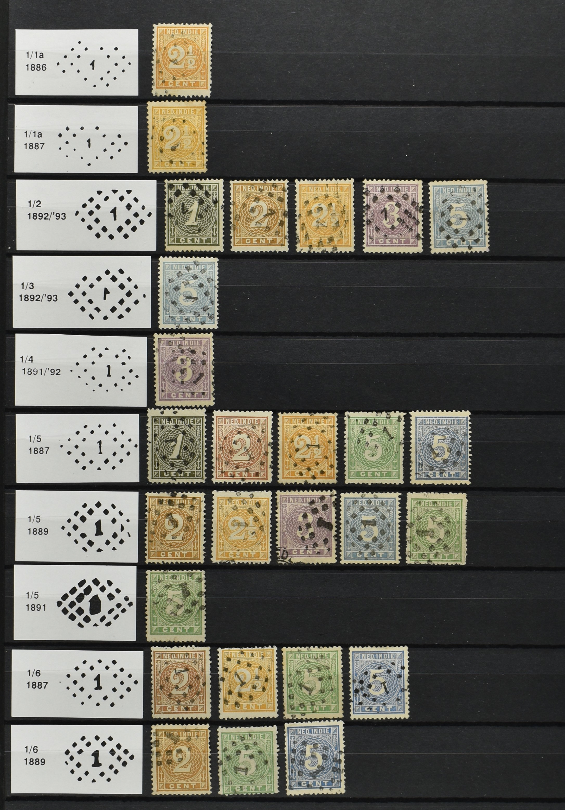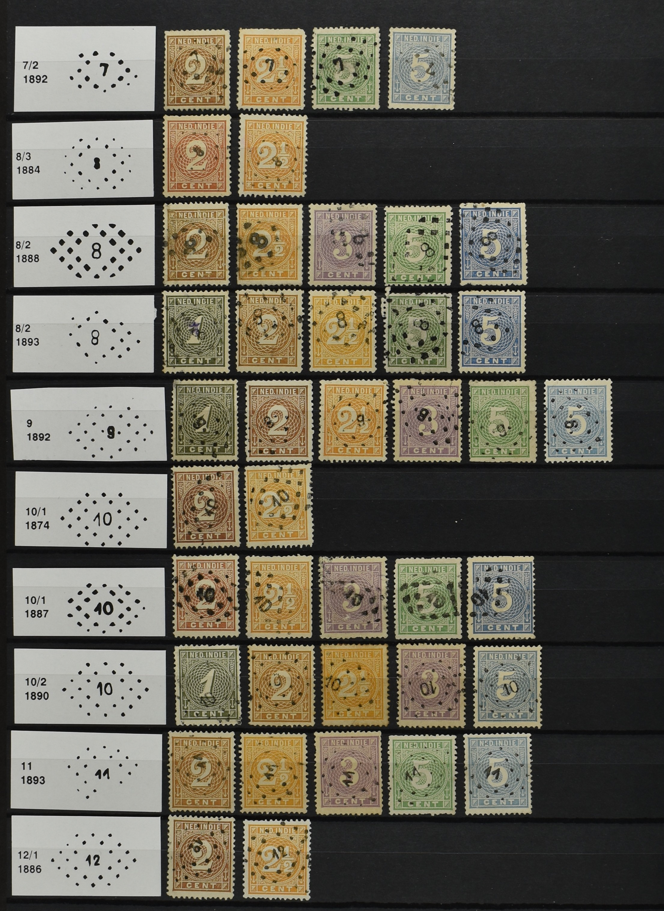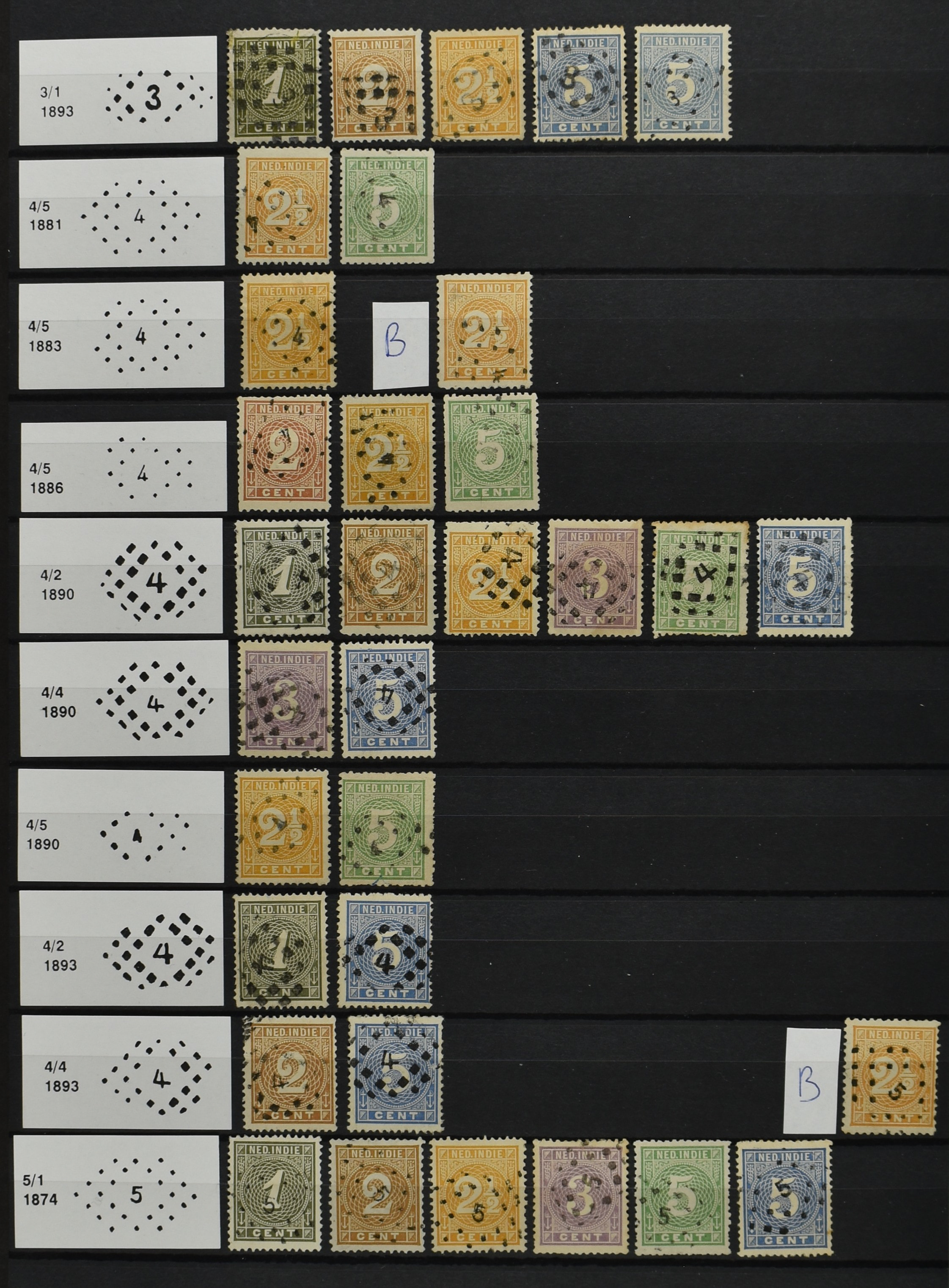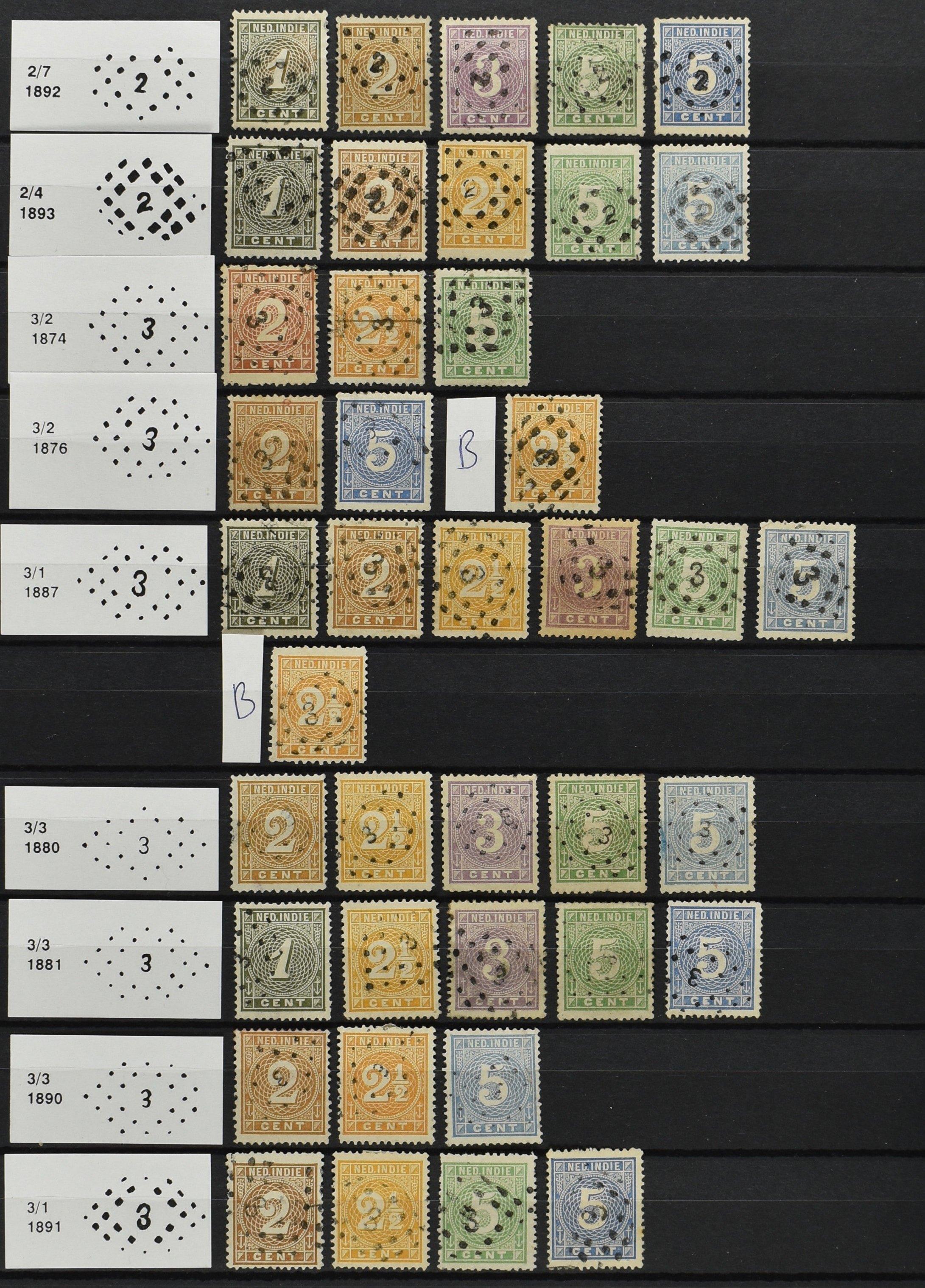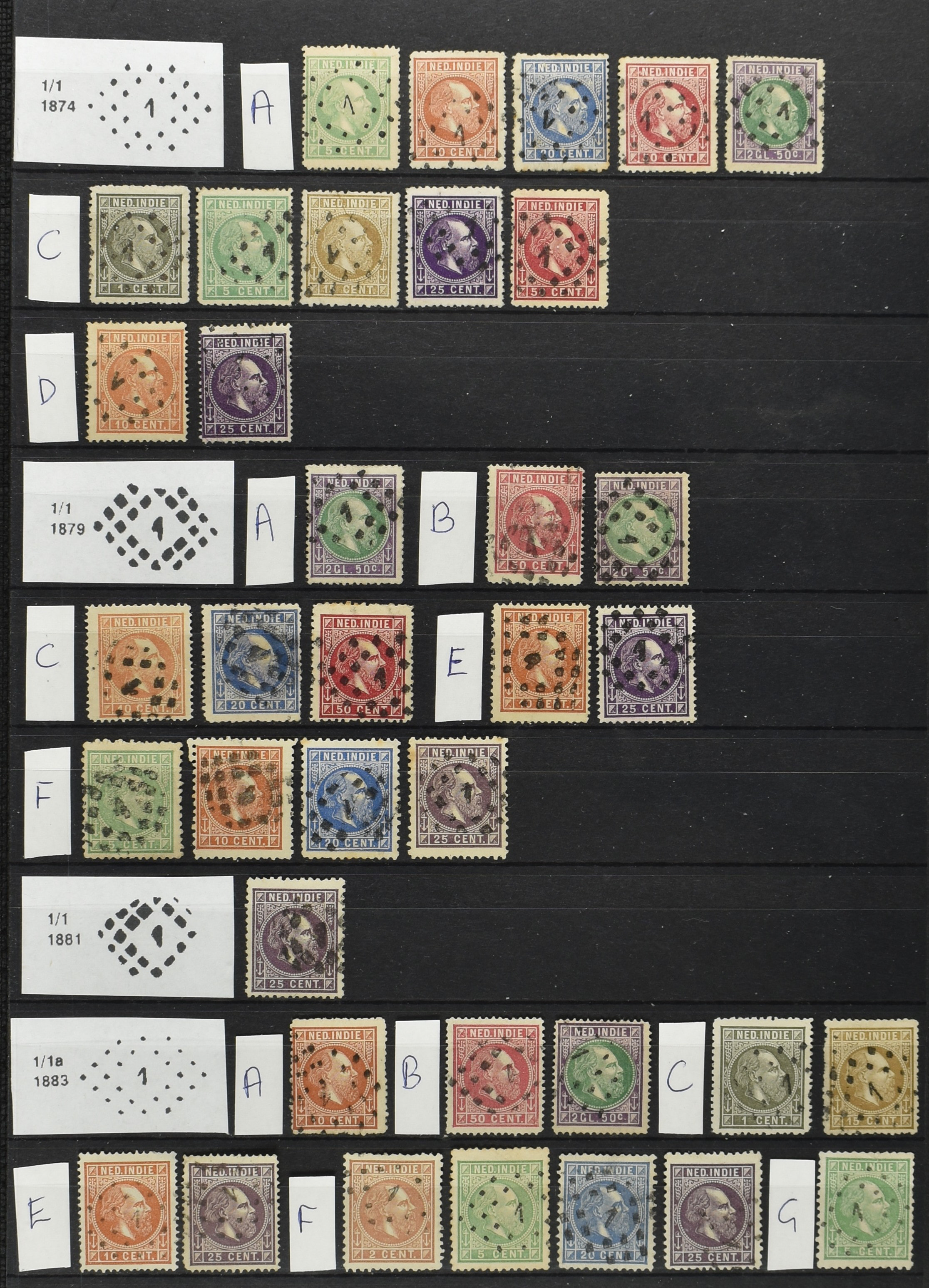 2250 imageNED.- INDIË PUNTSTEMPELS op Emissie Cijfer 1883-90, zeer uitgebreide collectie opgezet volgens Bulterman (De Postzak nr. 153, sep. 1987), per puntstempelnummer ieder type op zo veel mogelijk verschillende waarden en bovendien voor de 2 en 2½ cent ook in kamtanding 11½:12 gr.g., diverse afstempelingen in violet, het geheel in uitgezochte kwaliteit met vrijwel uitsluitend volledige afstempelingen op zegels in doorgaans prachtkwaliteit (perfecte 112 op 5 cent blauw, zegel mist hoektand), overzichtelijk op nummervolgorde en typen opgezet in 1 insteekboek. Prachtverzameling en daarmee een uitgelezen kans om topkwaliteit te kopen en op te zetten, uiteraard ook geschikt voor kwaliteitsverbetering of detailleren (Image) (Image2) (Image3) (Image4) (Image5) (Image6) (Image7) (Image8) (Image9) (Image10) (Image11) (Image12) (Image13) (Image14) (Image15) (Image16) (Image17) (Image18) (Image19) (Image20) (Image21) (All Images)