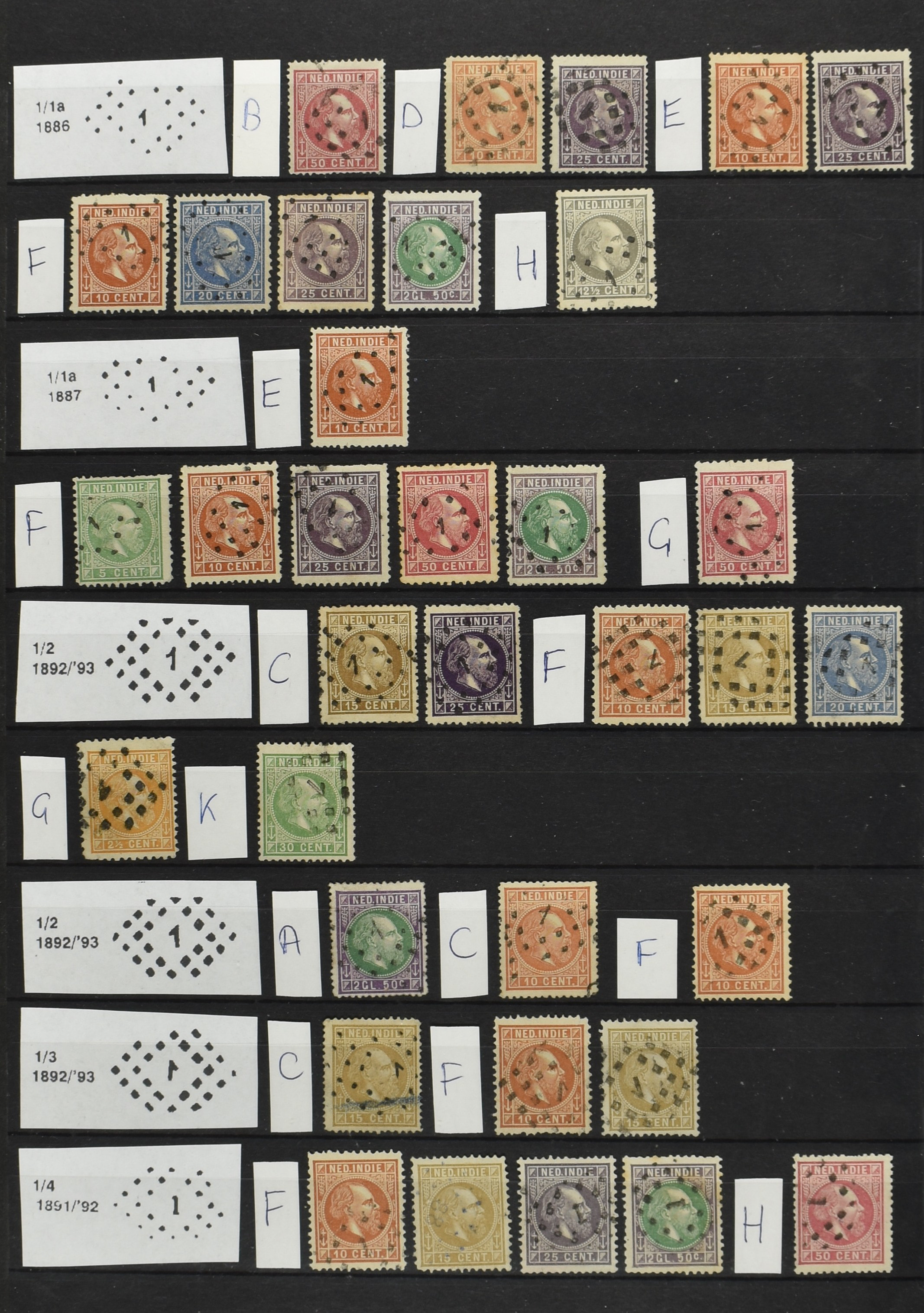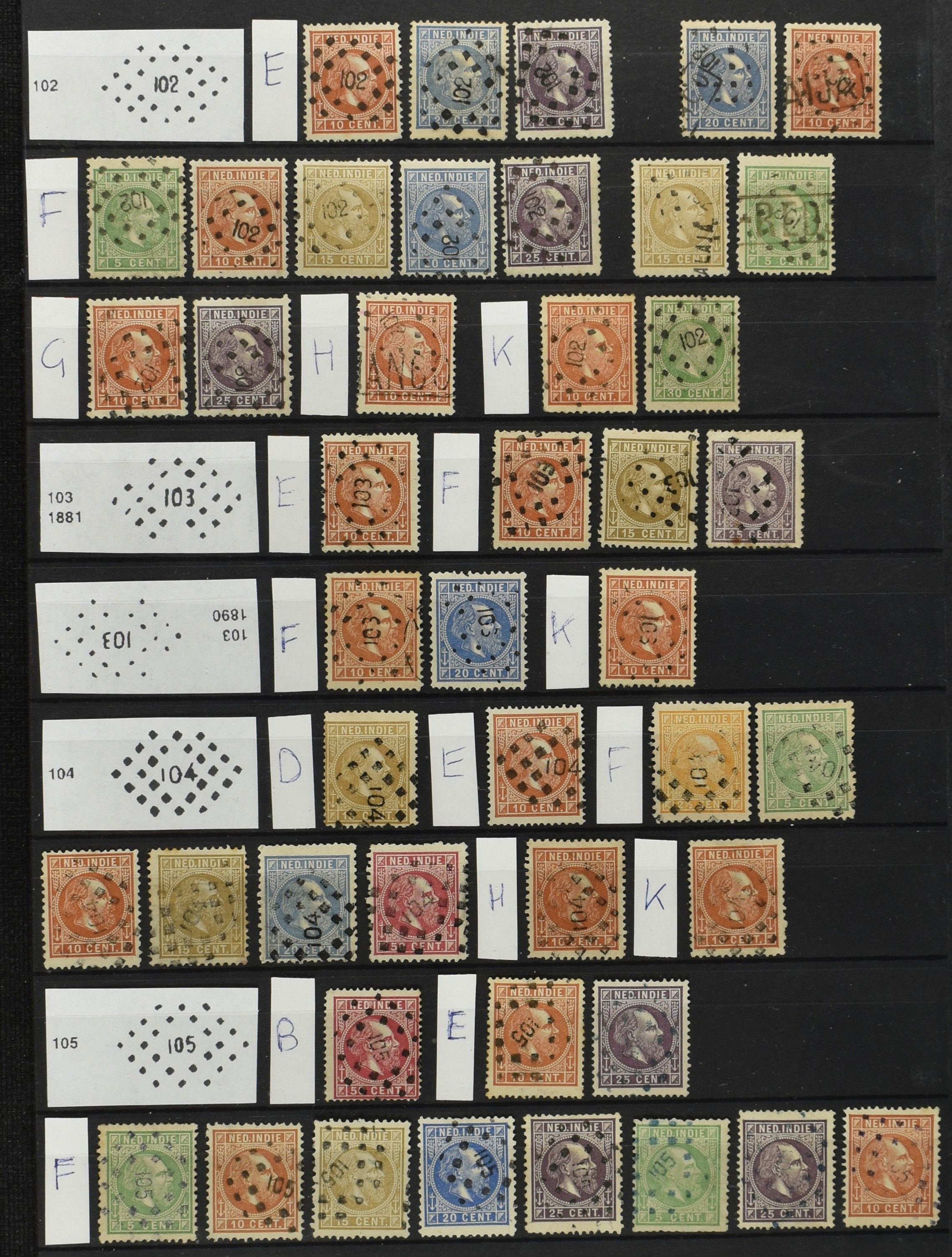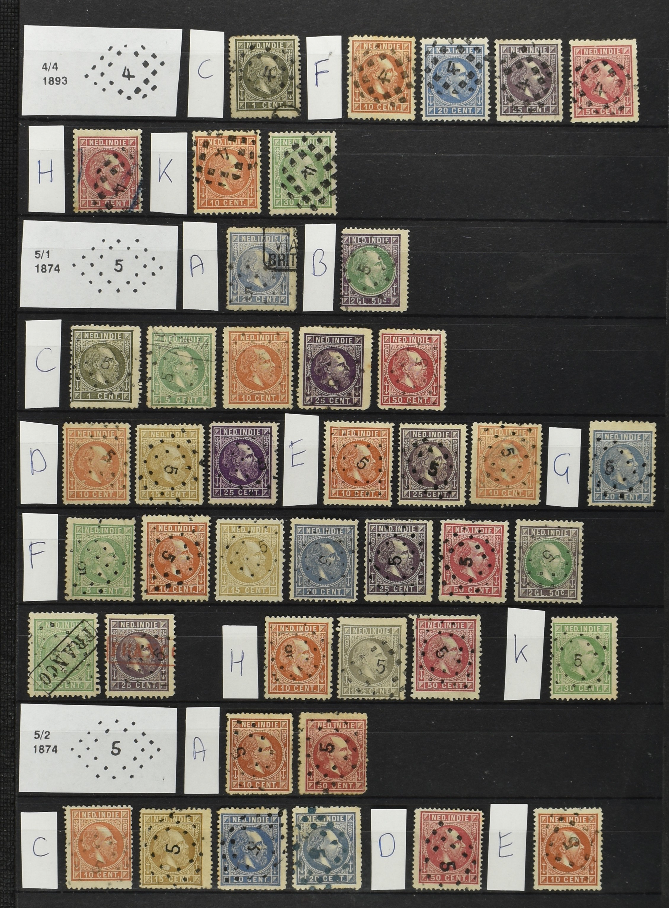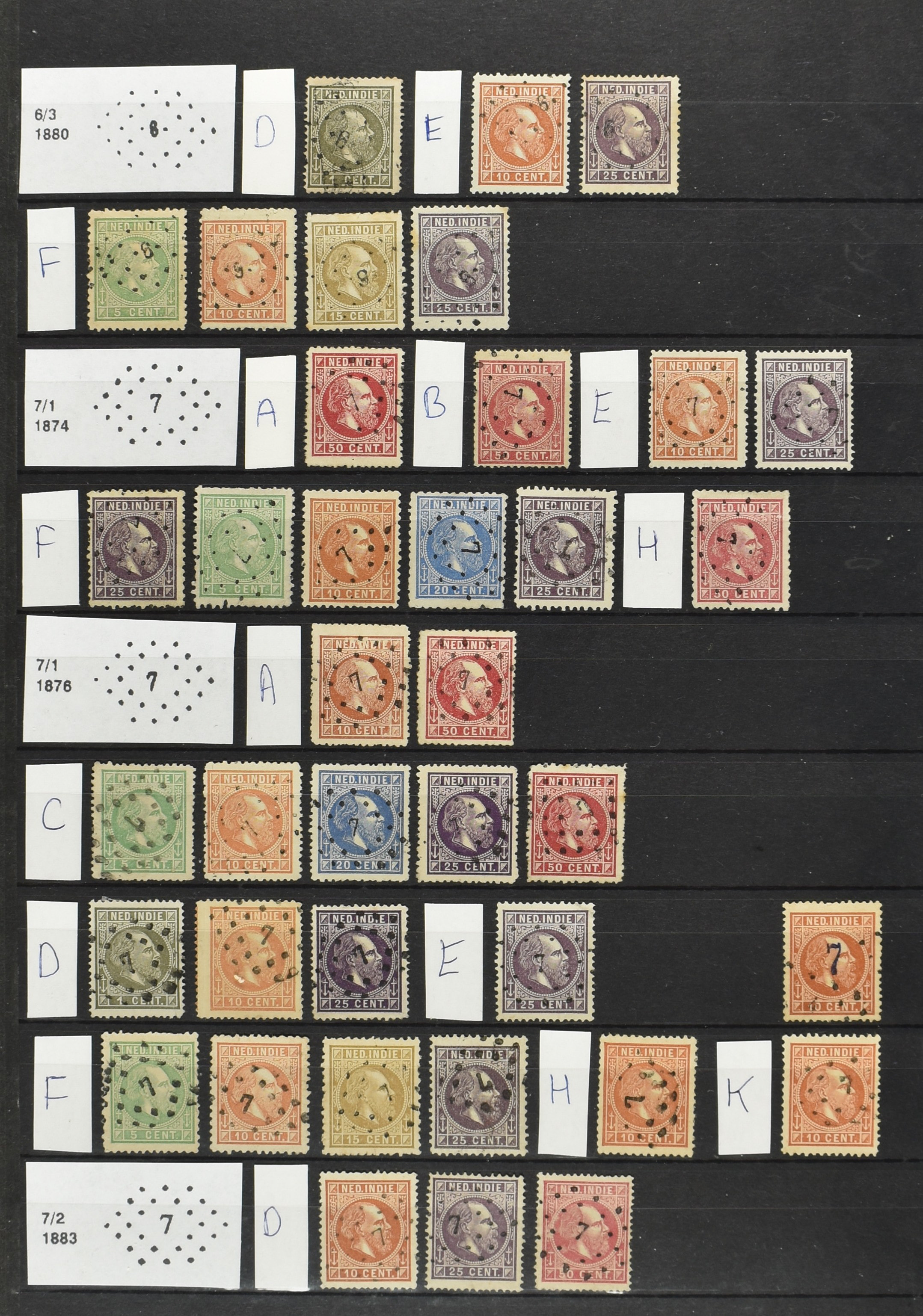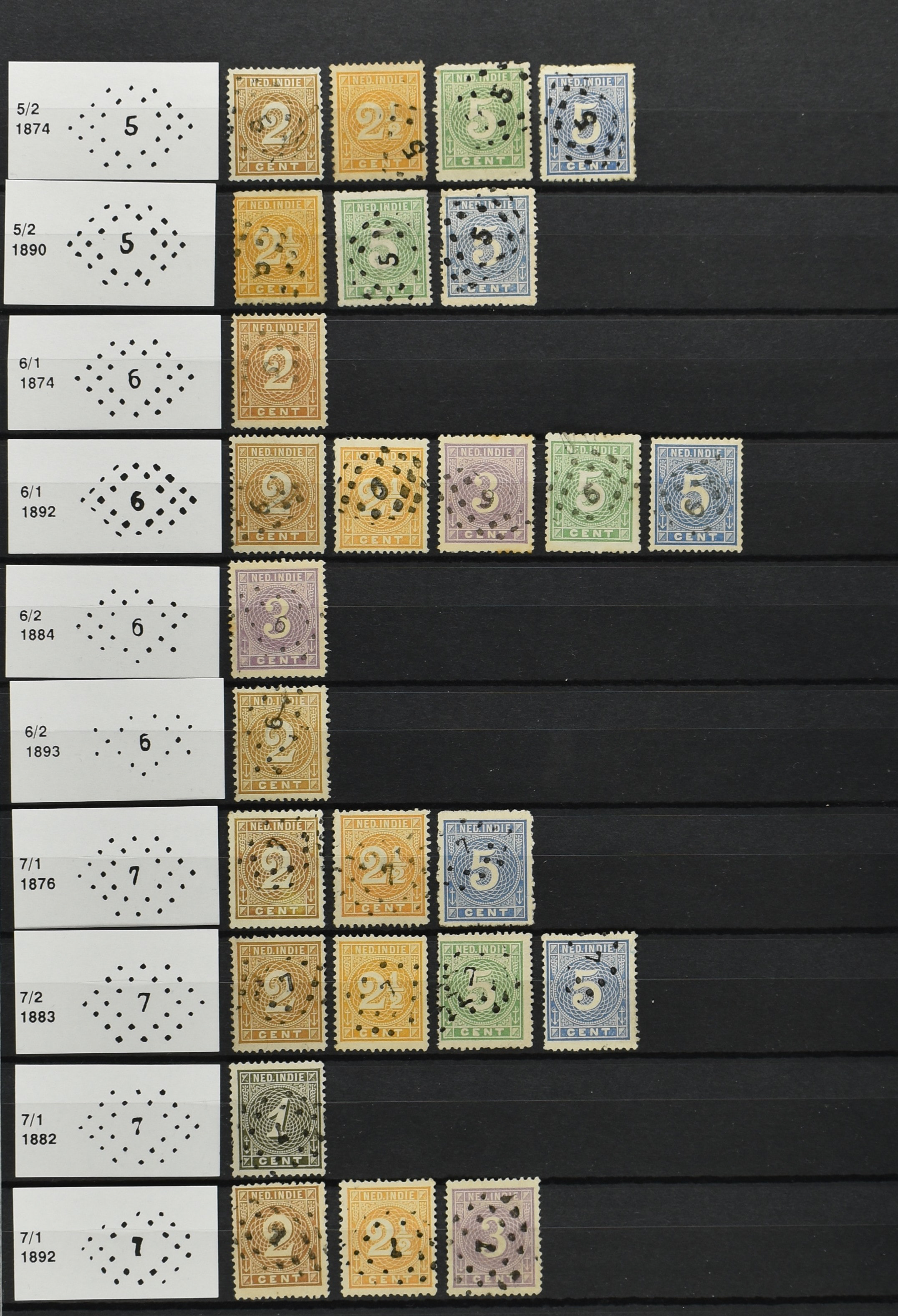 2250 imageNED.- INDIË PUNTSTEMPELS op Emissie Cijfer 1883-90, zeer uitgebreide collectie opgezet volgens Bulterman (De Postzak nr. 153, sep. 1987), per puntstempelnummer ieder type op zo veel mogelijk verschillende waarden en bovendien voor de 2 en 2½ cent ook in kamtanding 11½:12 gr.g., diverse afstempelingen in violet, het geheel in uitgezochte kwaliteit met vrijwel uitsluitend volledige afstempelingen op zegels in doorgaans prachtkwaliteit (perfecte 112 op 5 cent blauw, zegel mist hoektand), overzichtelijk op nummervolgorde en typen opgezet in 1 insteekboek. Prachtverzameling en daarmee een uitgelezen kans om topkwaliteit te kopen en op te zetten, uiteraard ook geschikt voor kwaliteitsverbetering of detailleren (Image) (Image2) (Image3) (Image4) (Image5) (Image6) (Image7) (Image8) (Image9) (Image10) (Image11) (Image12) (Image13) (Image14) (Image15) (Image16) (Image17) (Image18) (Image19) (Image20) (Image21) (All Images)