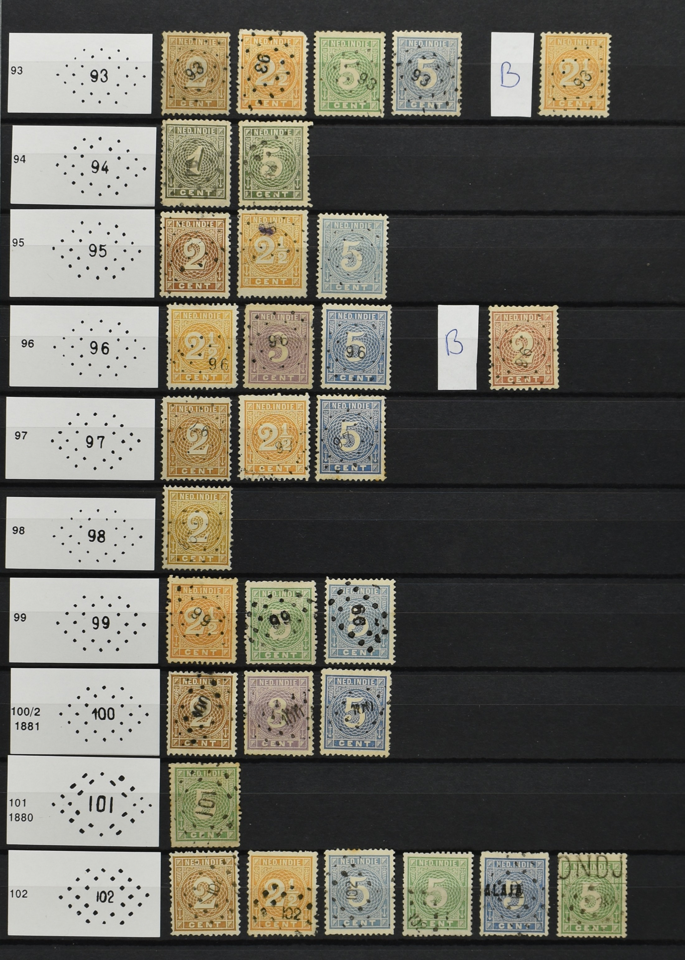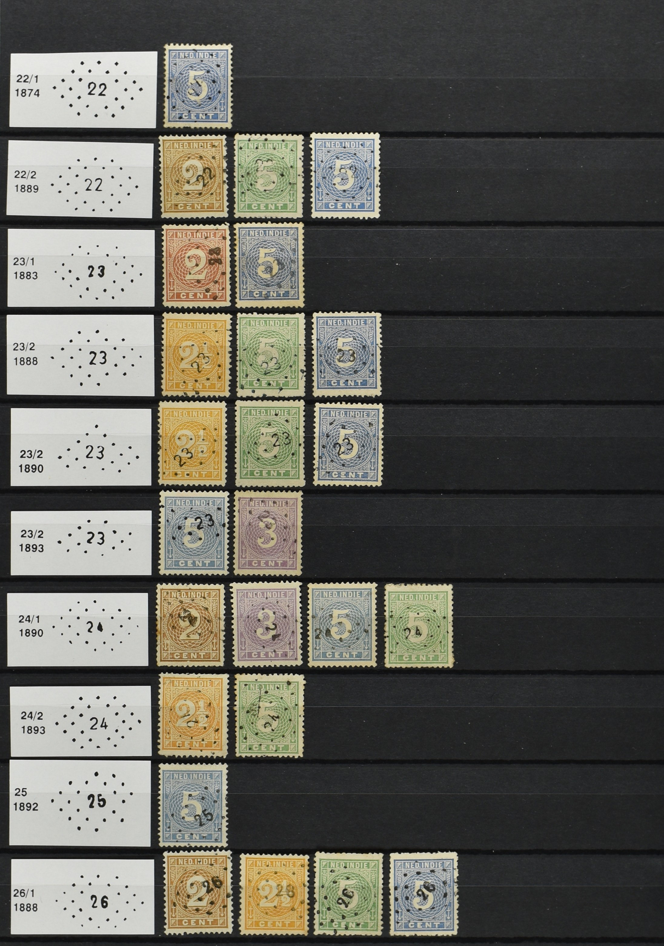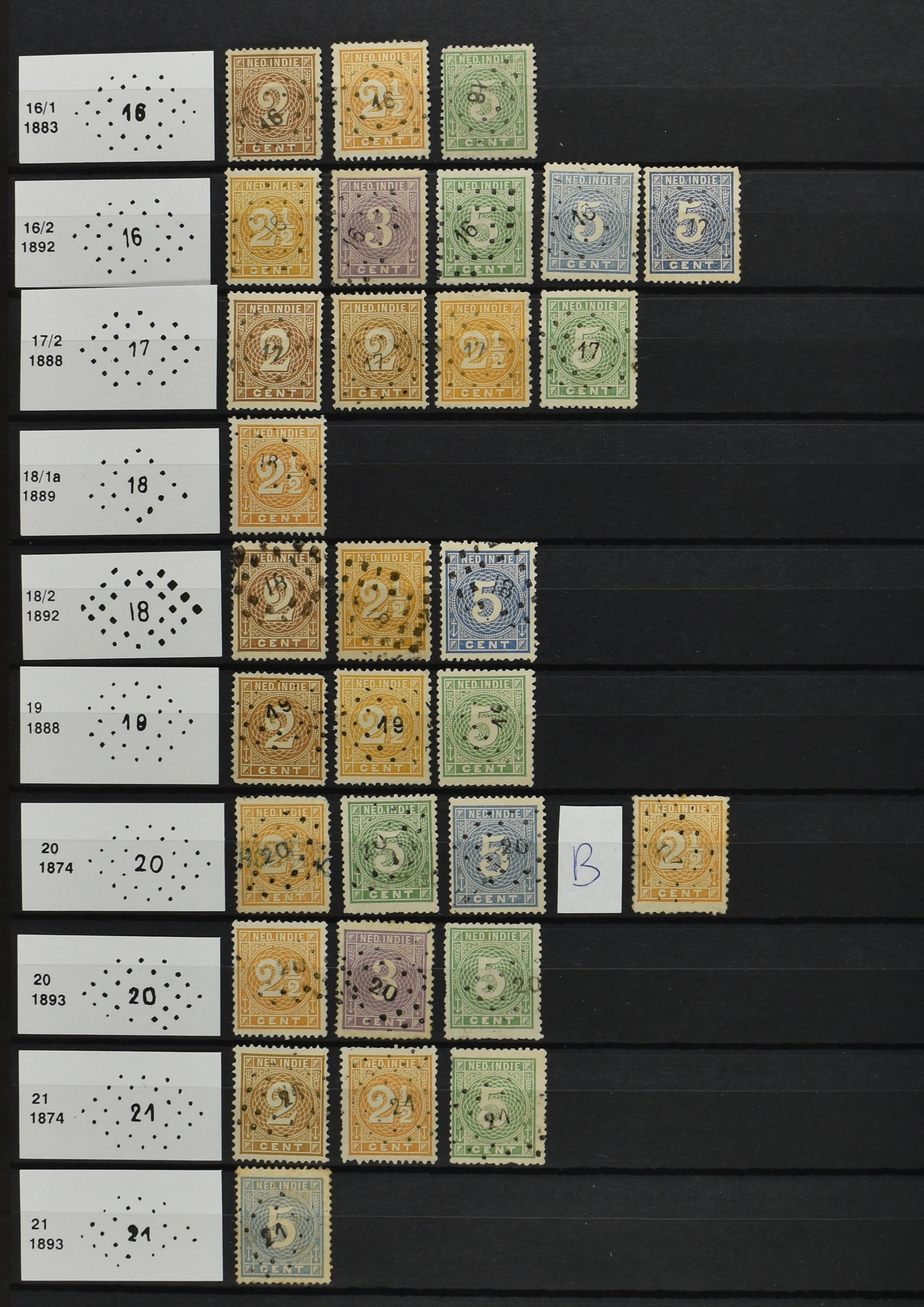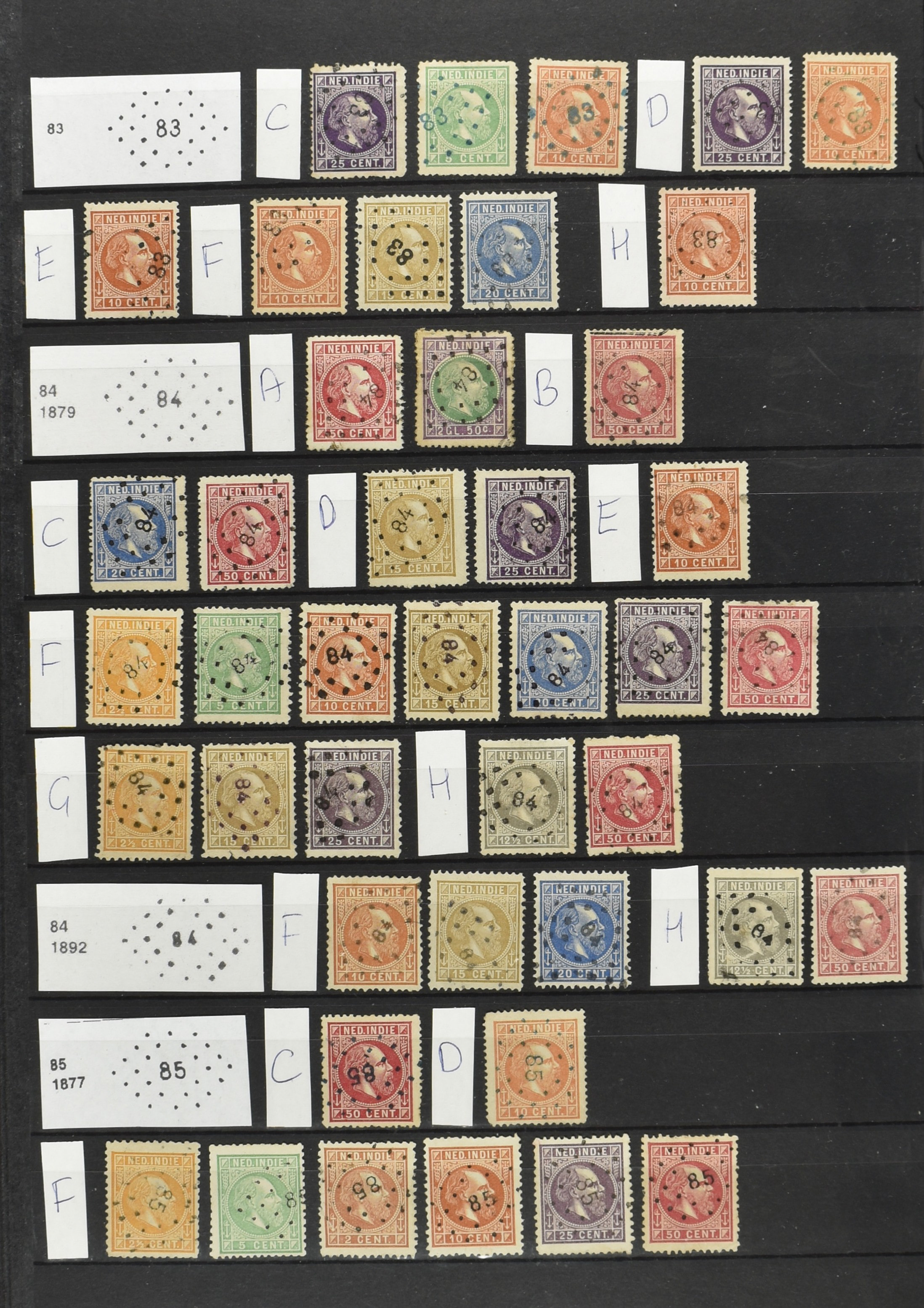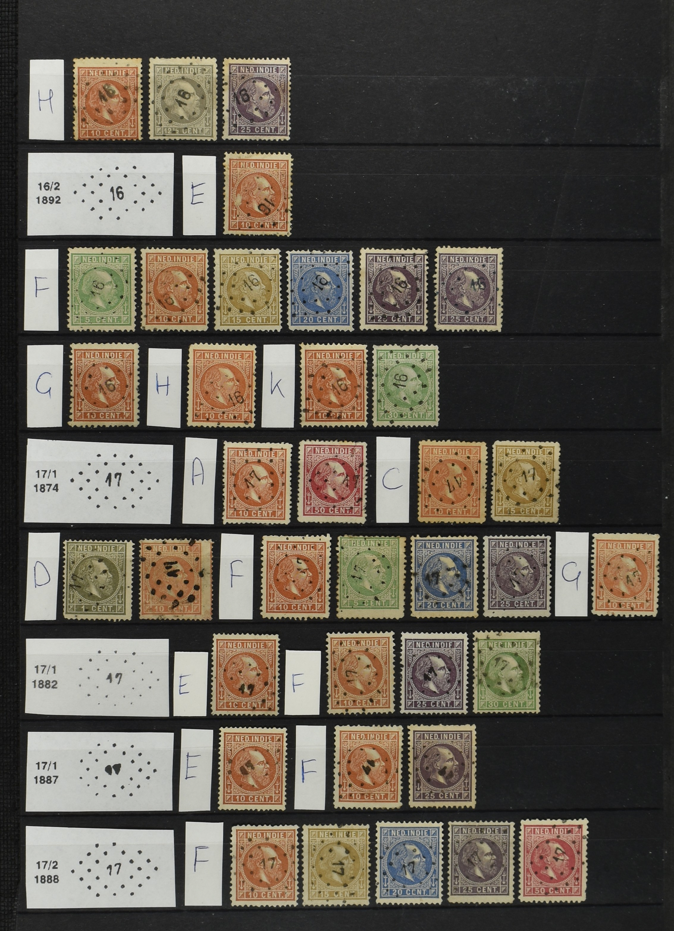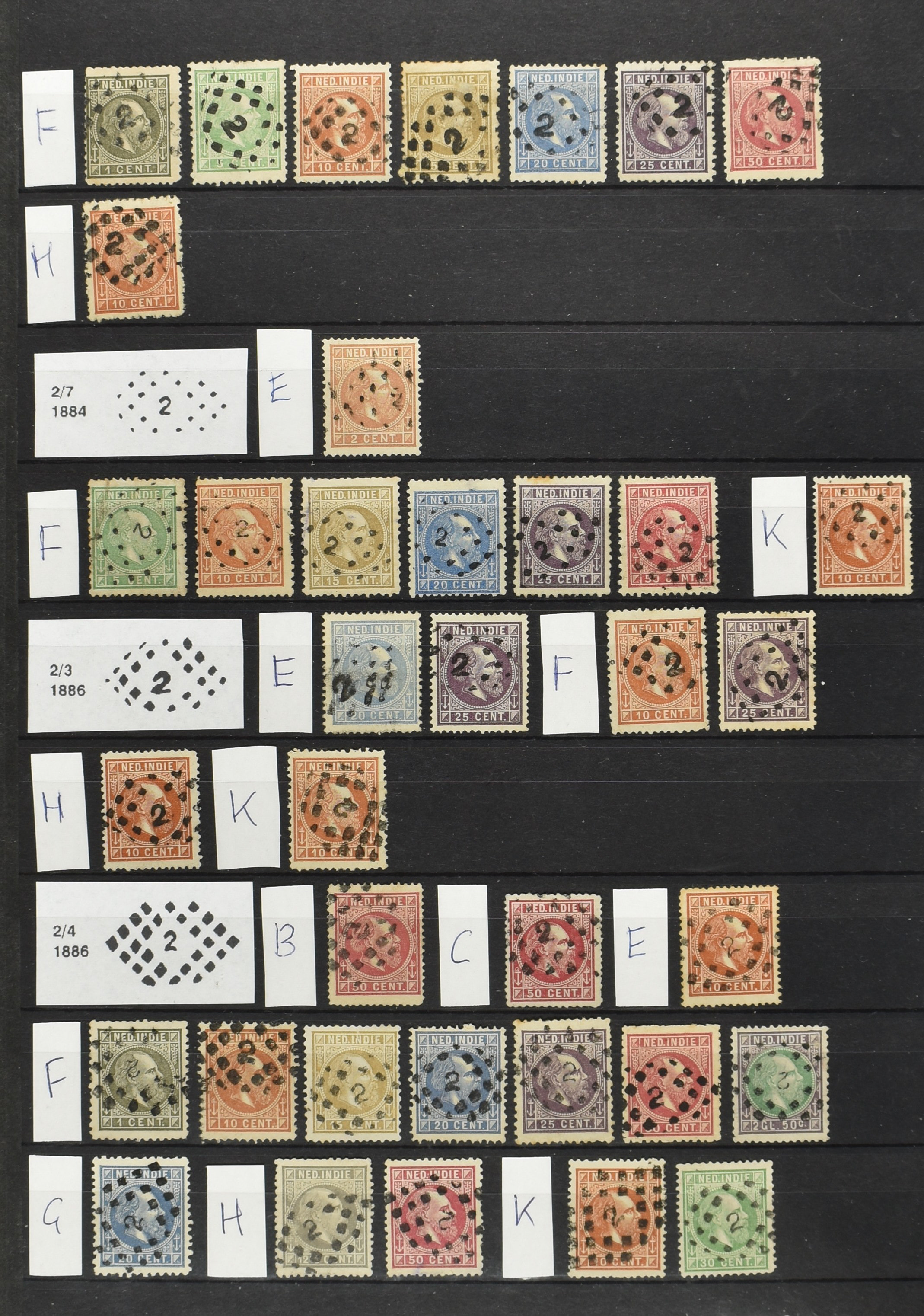 2250 imageNED.- INDIË PUNTSTEMPELS op Emissie Cijfer 1883-90, zeer uitgebreide collectie opgezet volgens Bulterman (De Postzak nr. 153, sep. 1987), per puntstempelnummer ieder type op zo veel mogelijk verschillende waarden en bovendien voor de 2 en 2½ cent ook in kamtanding 11½:12 gr.g., diverse afstempelingen in violet, het geheel in uitgezochte kwaliteit met vrijwel uitsluitend volledige afstempelingen op zegels in doorgaans prachtkwaliteit (perfecte 112 op 5 cent blauw, zegel mist hoektand), overzichtelijk op nummervolgorde en typen opgezet in 1 insteekboek. Prachtverzameling en daarmee een uitgelezen kans om topkwaliteit te kopen en op te zetten, uiteraard ook geschikt voor kwaliteitsverbetering of detailleren (Image) (Image2) (Image3) (Image4) (Image5) (Image6) (Image7) (Image8) (Image9) (Image10) (Image11) (Image12) (Image13) (Image14) (Image15) (Image16) (Image17) (Image18) (Image19) (Image20) (Image21) (All Images)