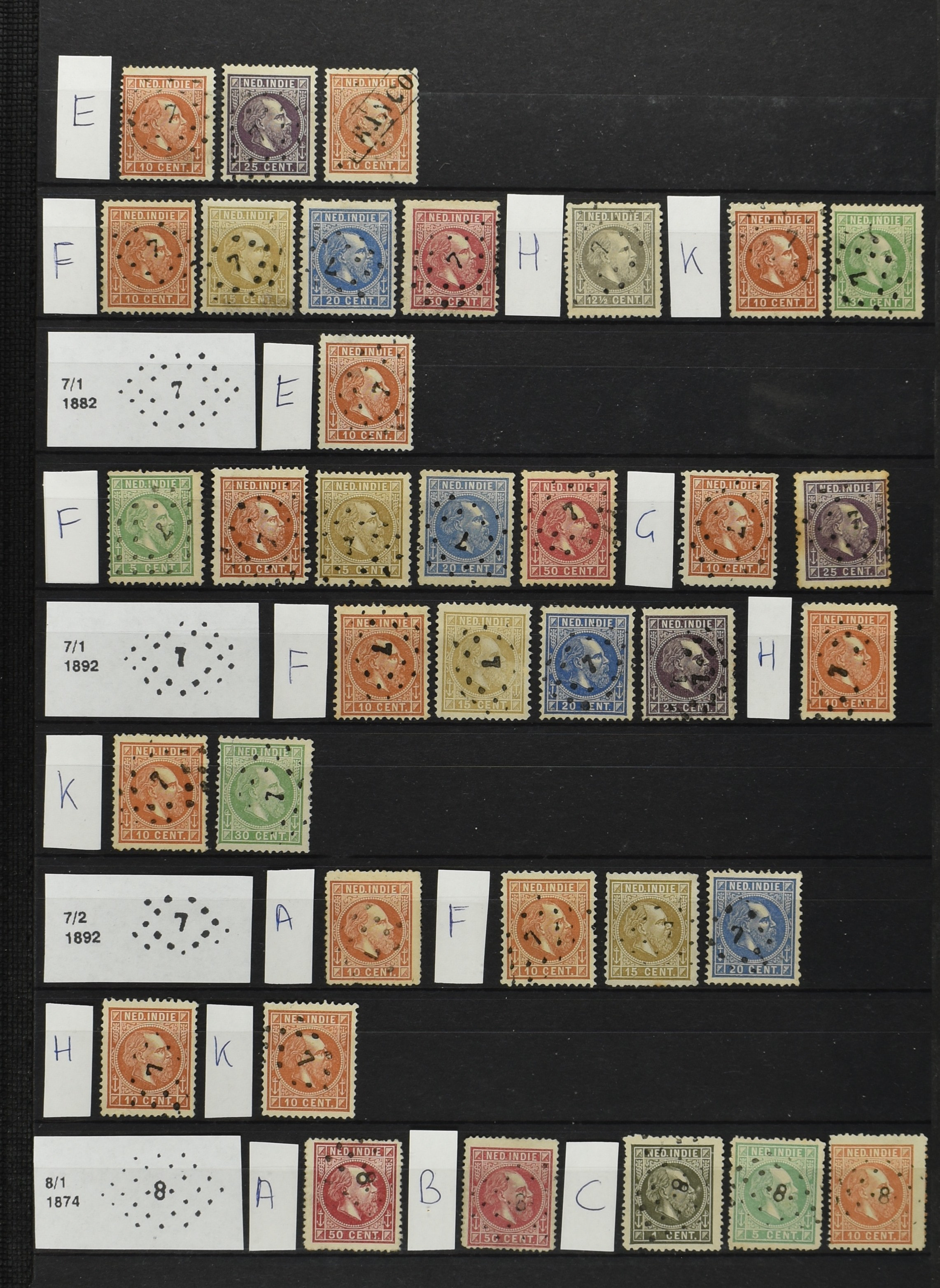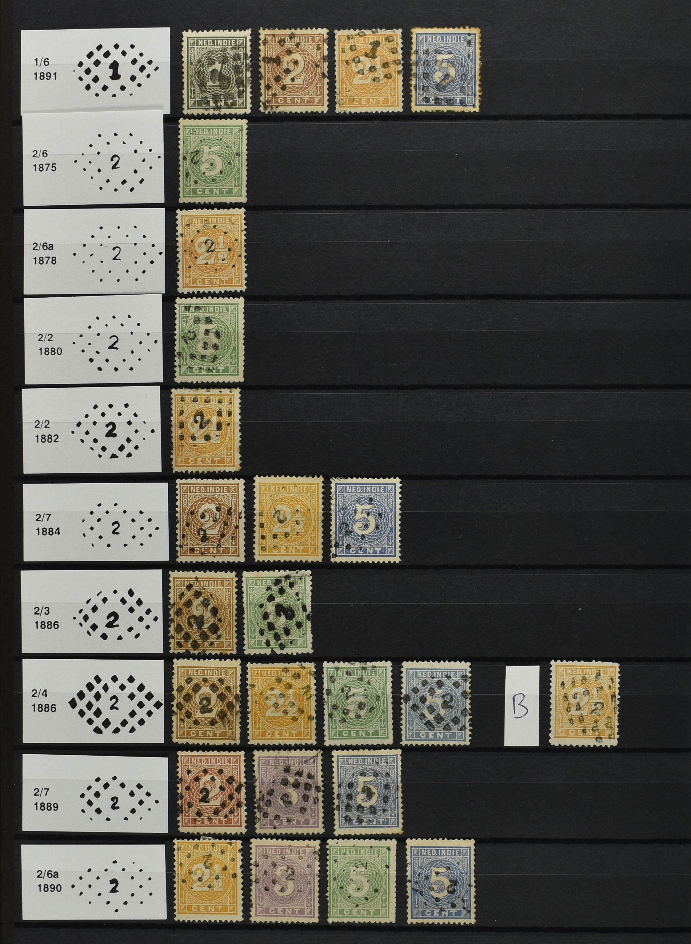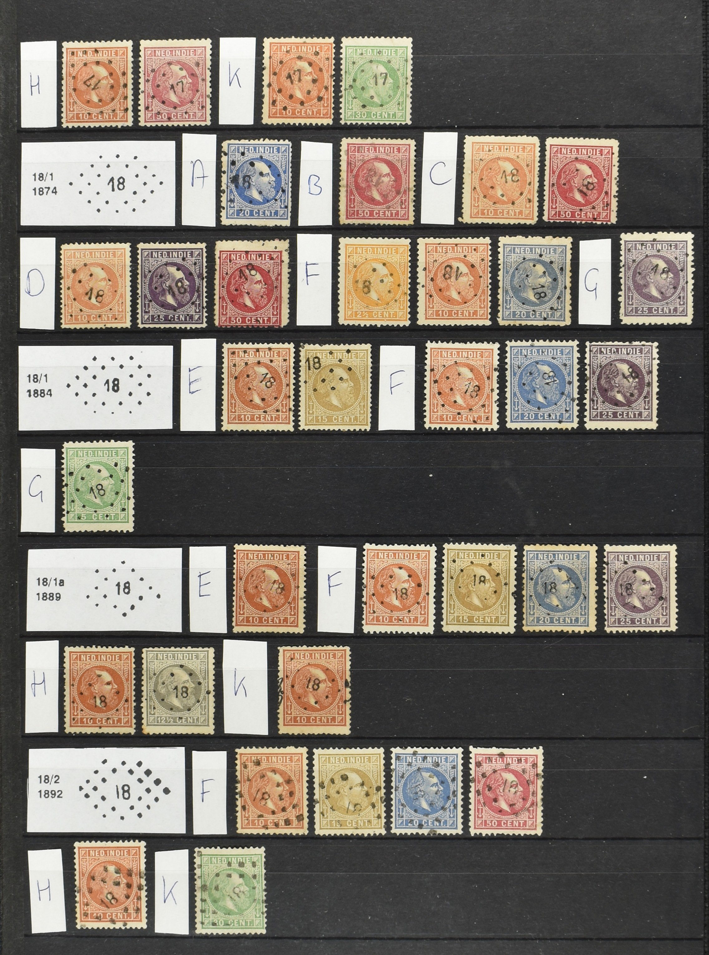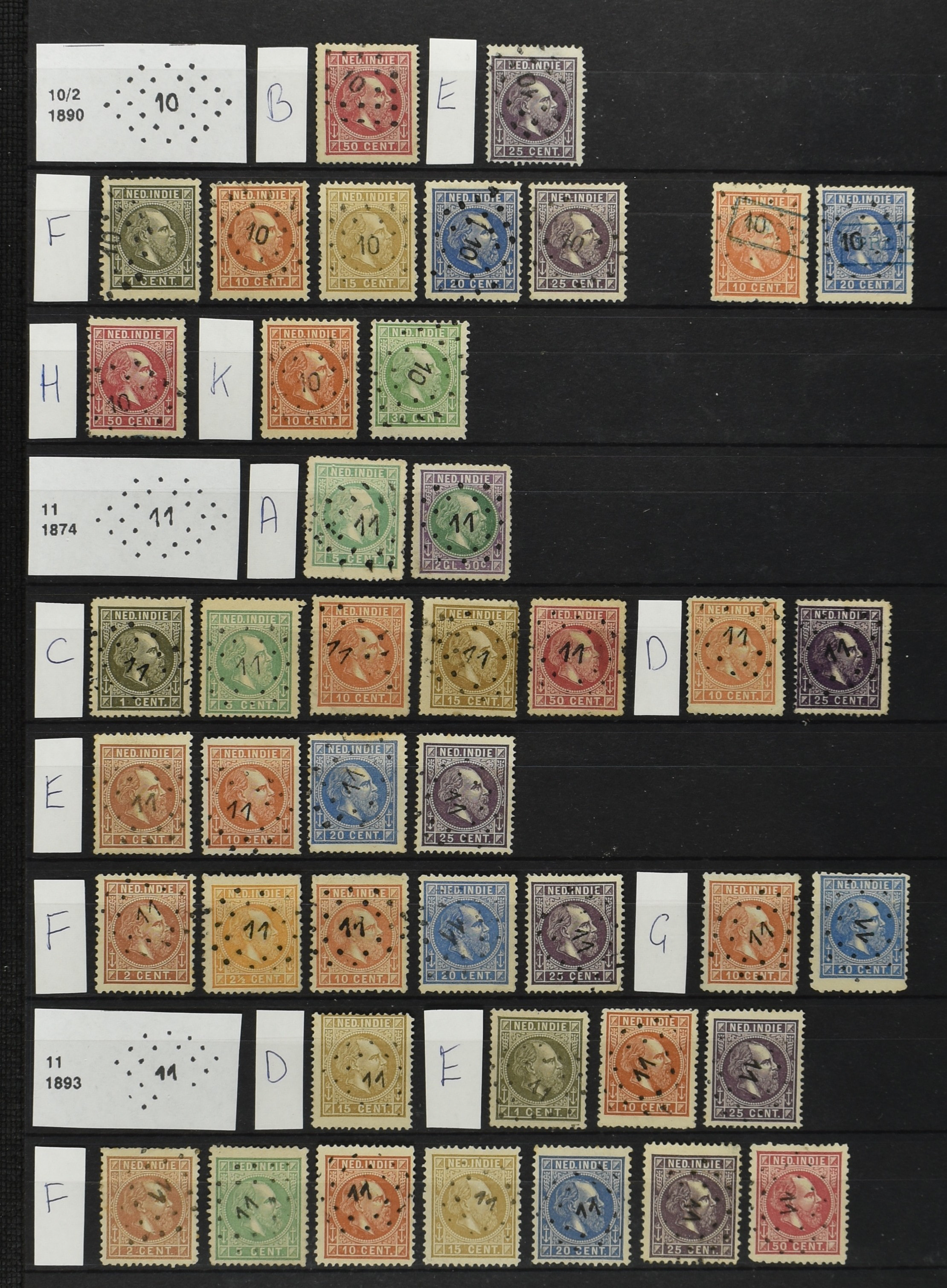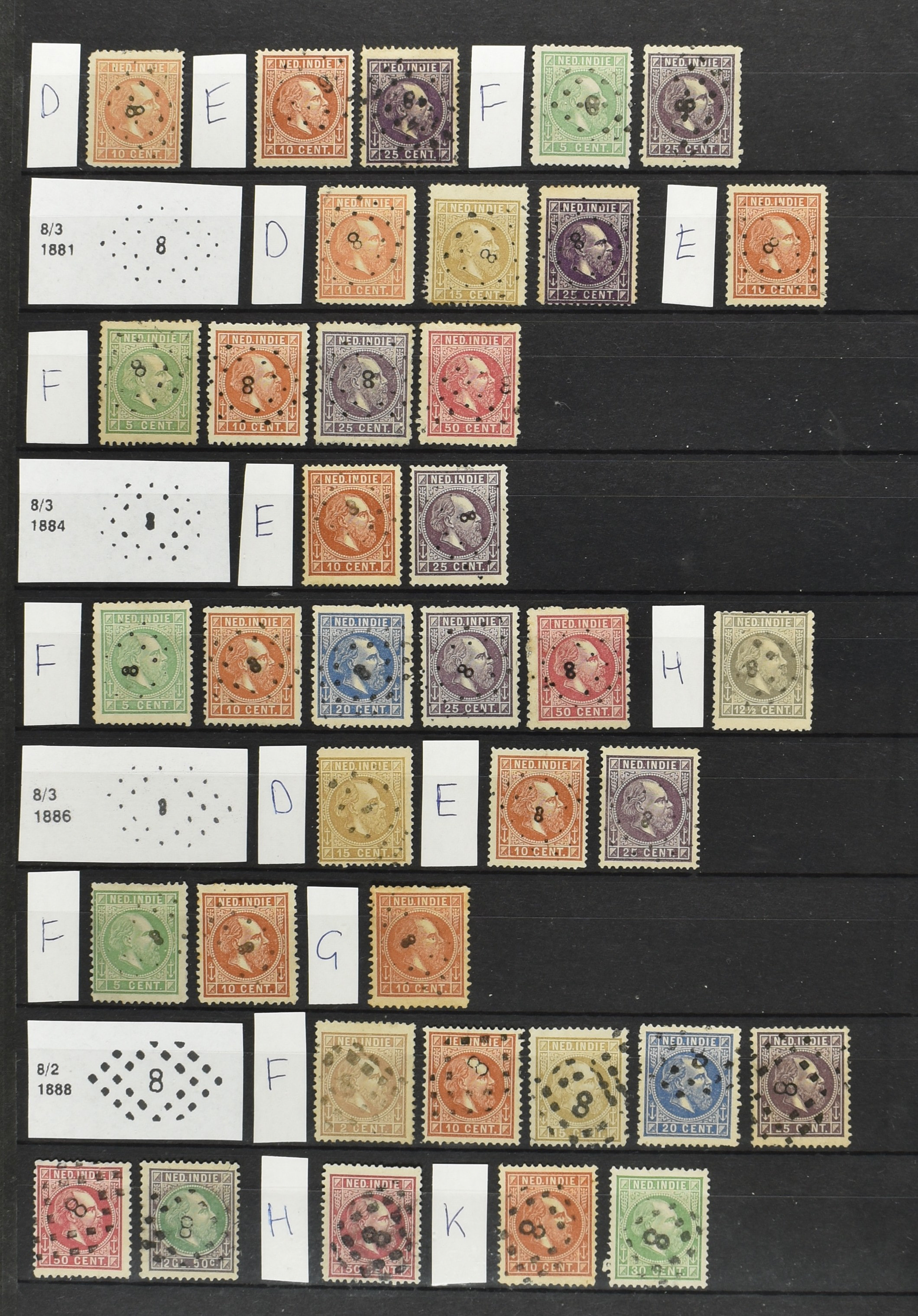 2250 imageNED.- INDIË PUNTSTEMPELS op Emissie Cijfer 1883-90, zeer uitgebreide collectie opgezet volgens Bulterman (De Postzak nr. 153, sep. 1987), per puntstempelnummer ieder type op zo veel mogelijk verschillende waarden en bovendien voor de 2 en 2½ cent ook in kamtanding 11½:12 gr.g., diverse afstempelingen in violet, het geheel in uitgezochte kwaliteit met vrijwel uitsluitend volledige afstempelingen op zegels in doorgaans prachtkwaliteit (perfecte 112 op 5 cent blauw, zegel mist hoektand), overzichtelijk op nummervolgorde en typen opgezet in 1 insteekboek. Prachtverzameling en daarmee een uitgelezen kans om topkwaliteit te kopen en op te zetten, uiteraard ook geschikt voor kwaliteitsverbetering of detailleren (Image) (Image2) (Image3) (Image4) (Image5) (Image6) (Image7) (Image8) (Image9) (Image10) (Image11) (Image12) (Image13) (Image14) (Image15) (Image16) (Image17) (Image18) (Image19) (Image20) (Image21) (All Images)