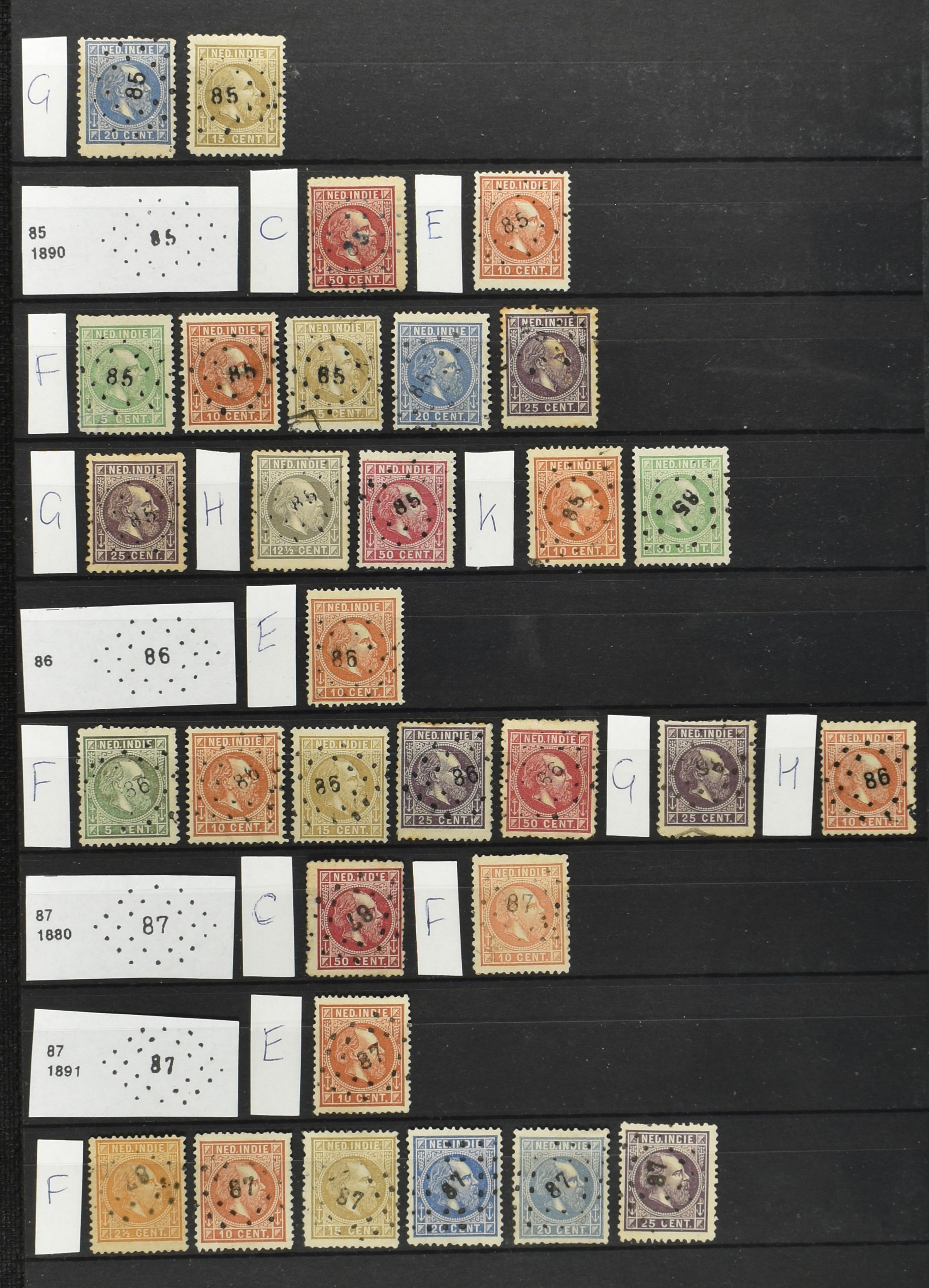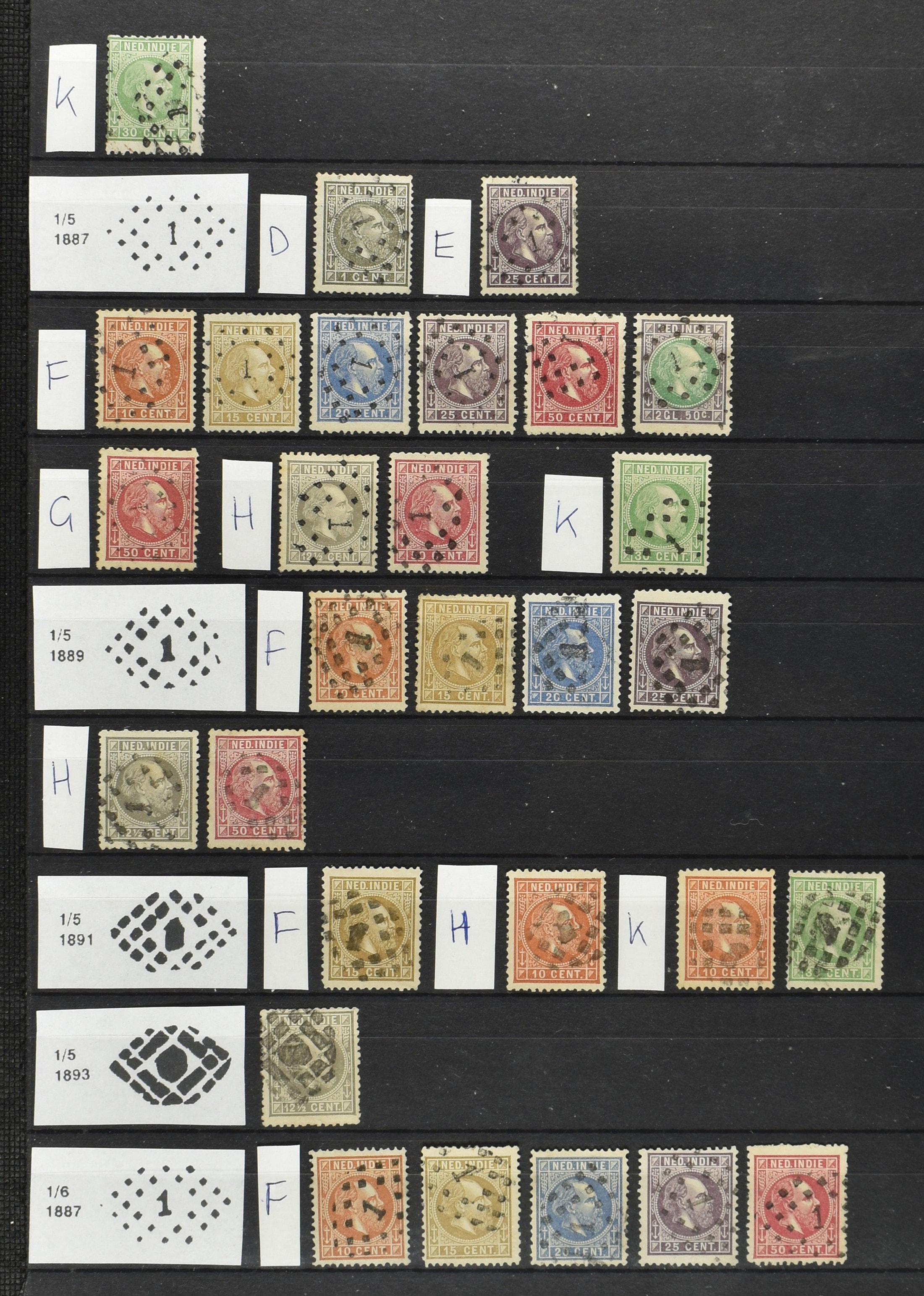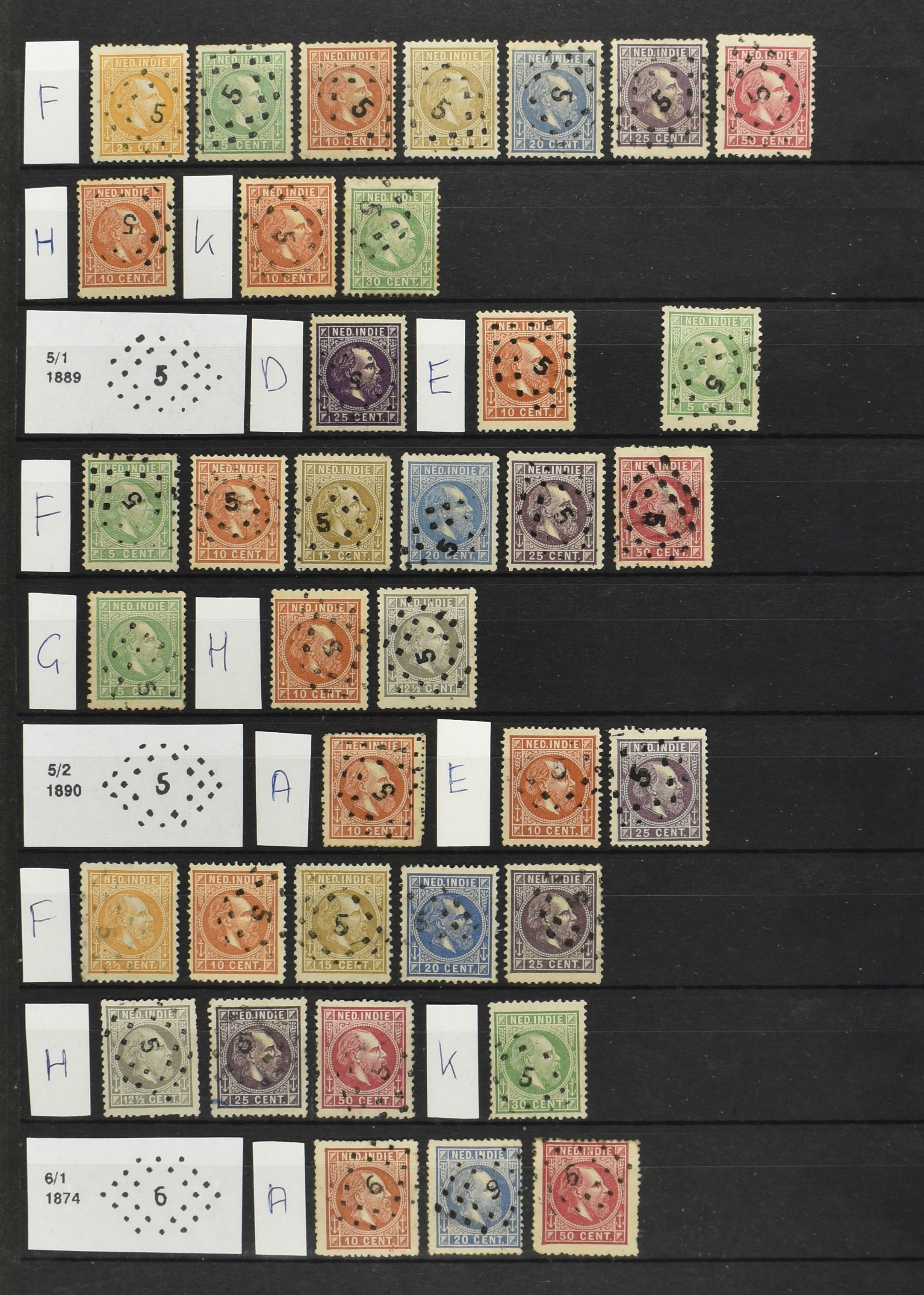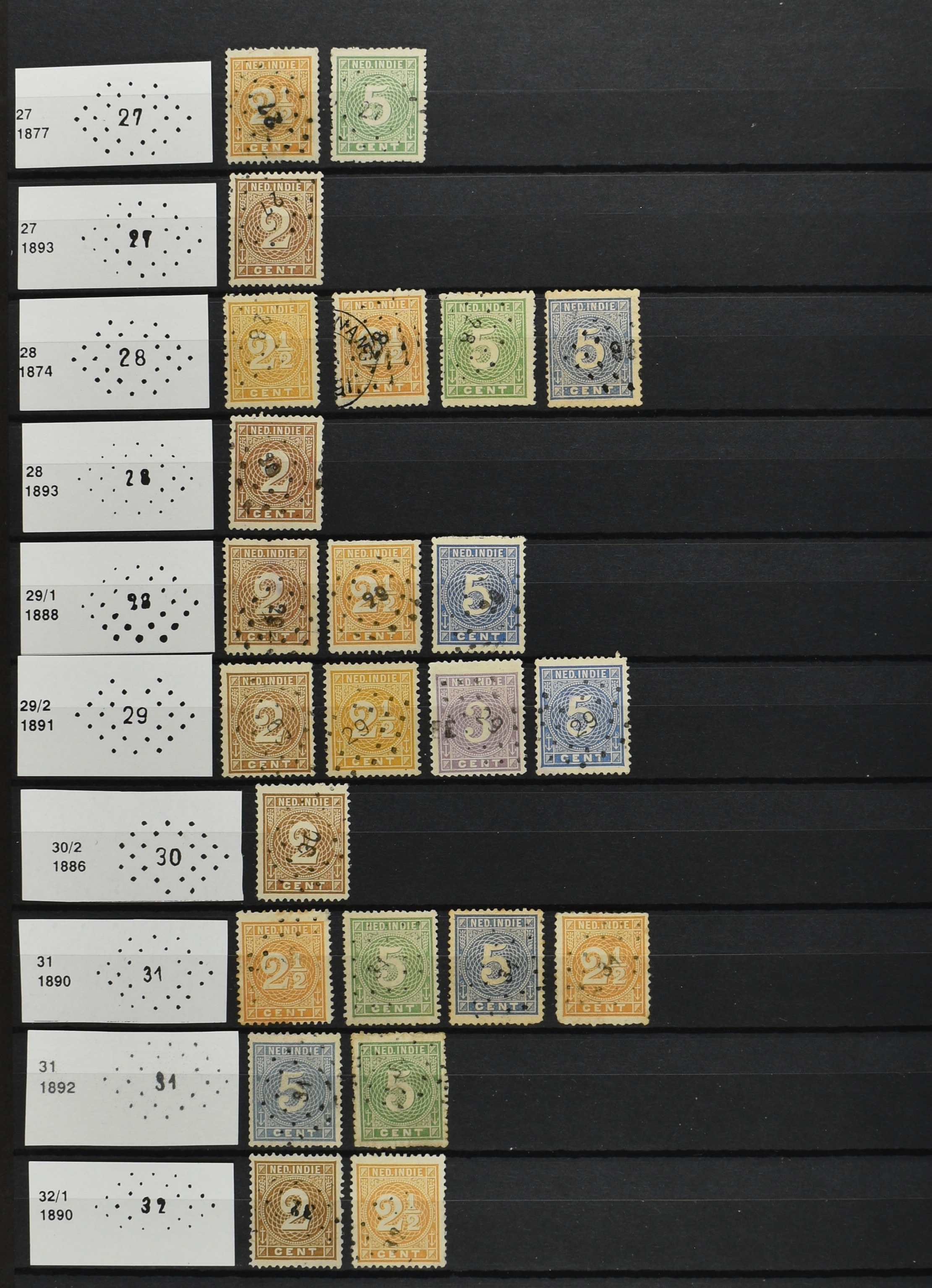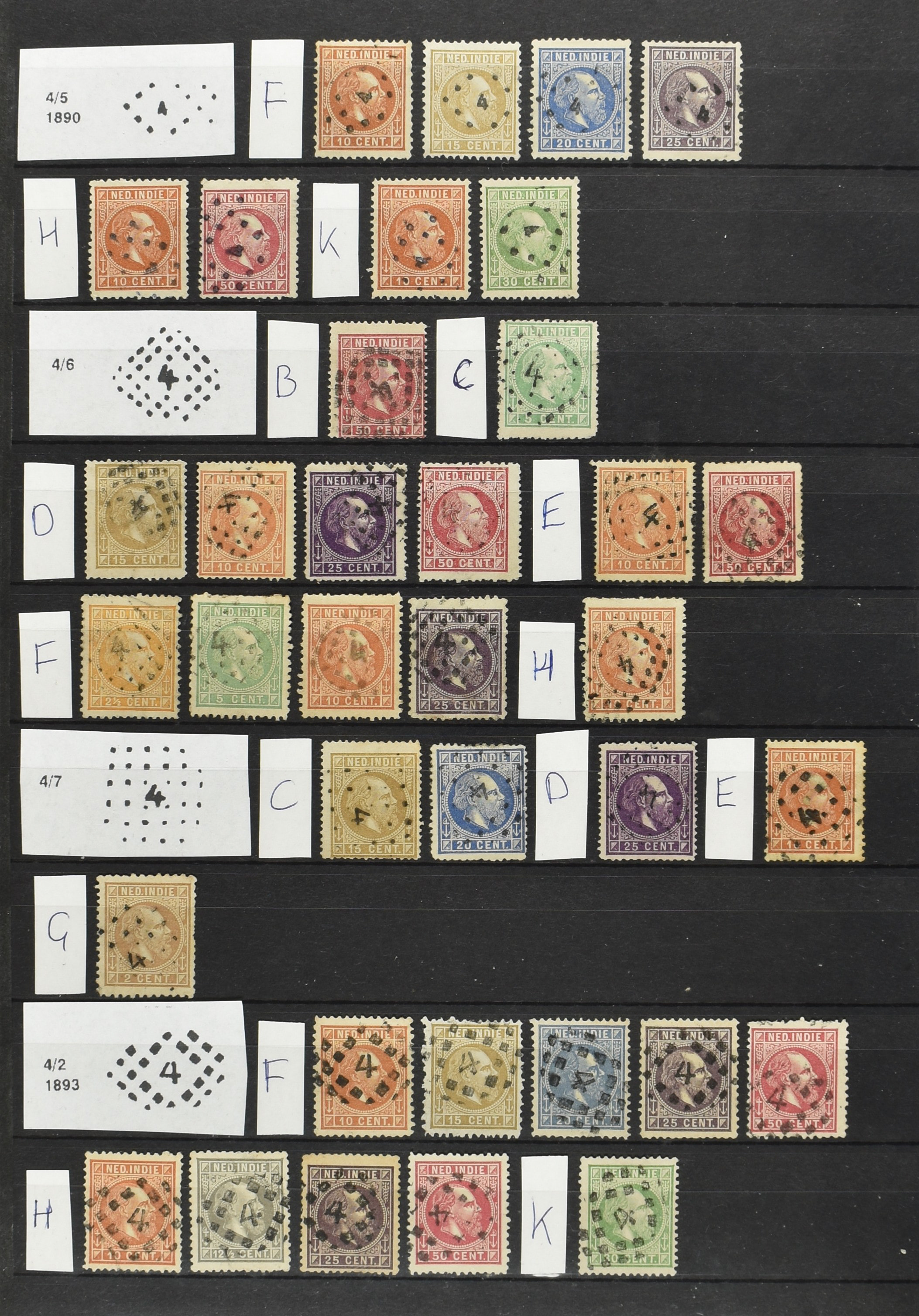 2250 imageNED.- INDIË PUNTSTEMPELS op Emissie Cijfer 1883-90, zeer uitgebreide collectie opgezet volgens Bulterman (De Postzak nr. 153, sep. 1987), per puntstempelnummer ieder type op zo veel mogelijk verschillende waarden en bovendien voor de 2 en 2½ cent ook in kamtanding 11½:12 gr.g., diverse afstempelingen in violet, het geheel in uitgezochte kwaliteit met vrijwel uitsluitend volledige afstempelingen op zegels in doorgaans prachtkwaliteit (perfecte 112 op 5 cent blauw, zegel mist hoektand), overzichtelijk op nummervolgorde en typen opgezet in 1 insteekboek. Prachtverzameling en daarmee een uitgelezen kans om topkwaliteit te kopen en op te zetten, uiteraard ook geschikt voor kwaliteitsverbetering of detailleren (Image) (Image2) (Image3) (Image4) (Image5) (Image6) (Image7) (Image8) (Image9) (Image10) (Image11) (Image12) (Image13) (Image14) (Image15) (Image16) (Image17) (Image18) (Image19) (Image20) (Image21) (All Images)