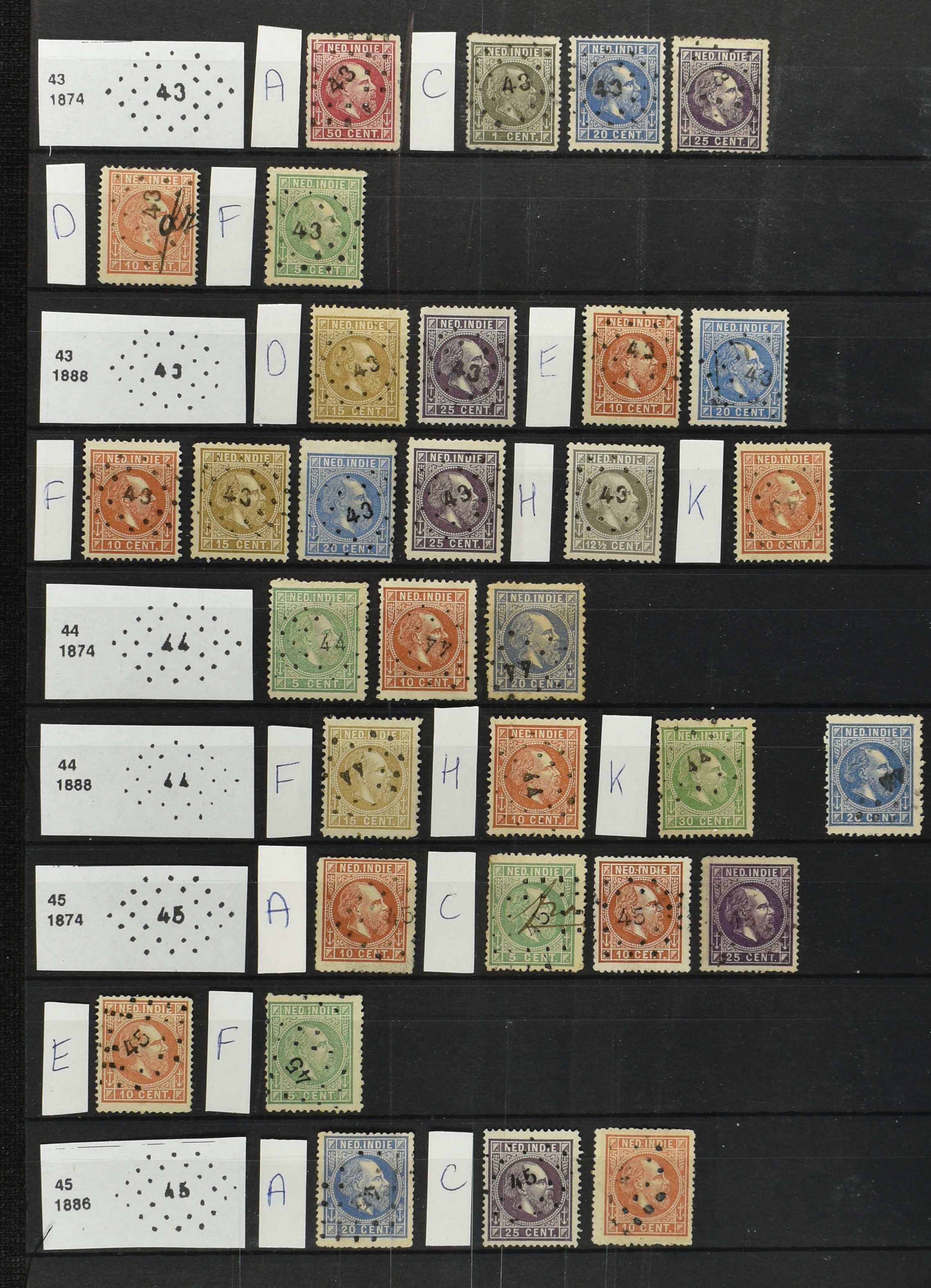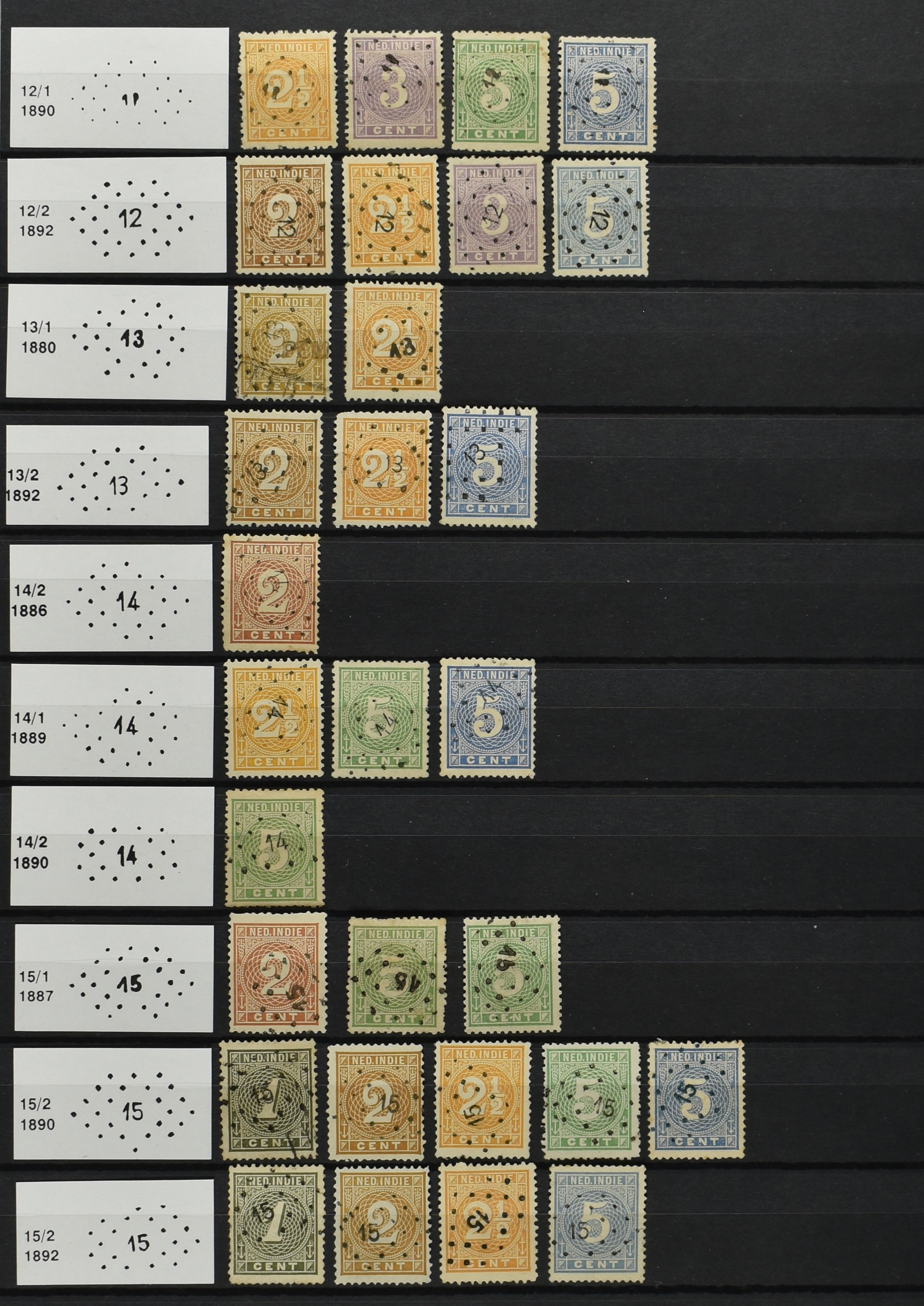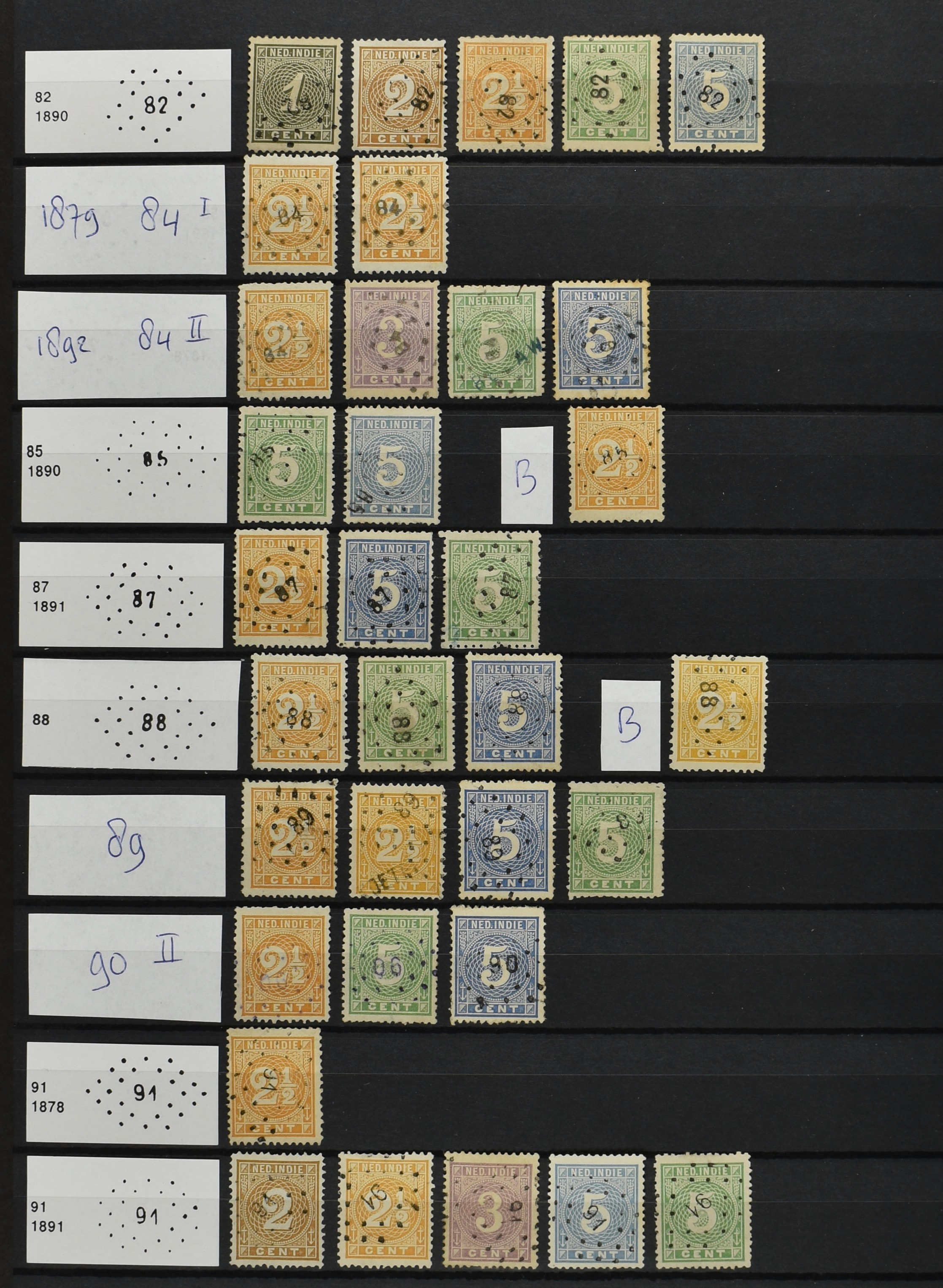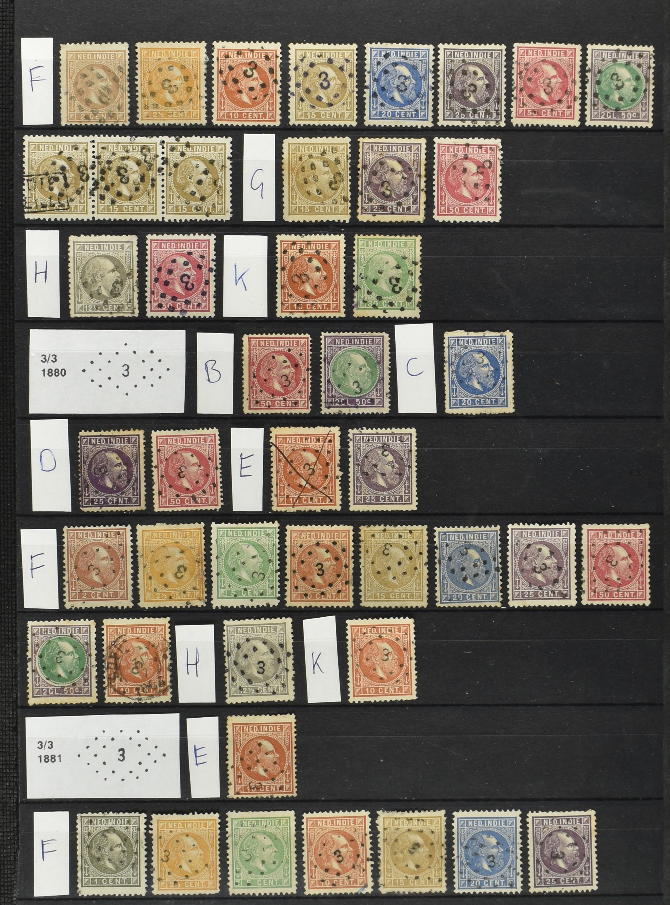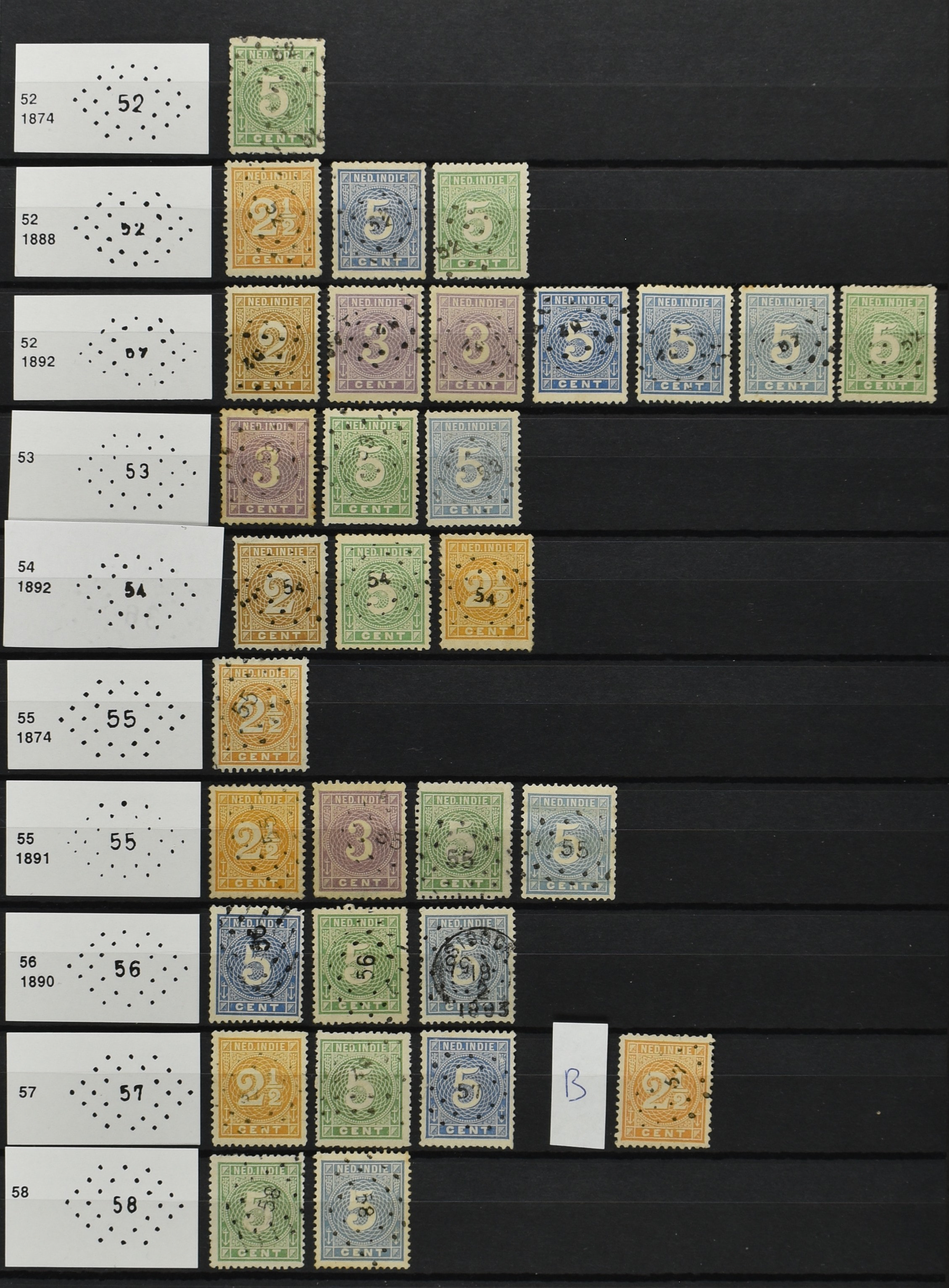 2250 imageNED.- INDIË PUNTSTEMPELS op Emissie Cijfer 1883-90, zeer uitgebreide collectie opgezet volgens Bulterman (De Postzak nr. 153, sep. 1987), per puntstempelnummer ieder type op zo veel mogelijk verschillende waarden en bovendien voor de 2 en 2½ cent ook in kamtanding 11½:12 gr.g., diverse afstempelingen in violet, het geheel in uitgezochte kwaliteit met vrijwel uitsluitend volledige afstempelingen op zegels in doorgaans prachtkwaliteit (perfecte 112 op 5 cent blauw, zegel mist hoektand), overzichtelijk op nummervolgorde en typen opgezet in 1 insteekboek. Prachtverzameling en daarmee een uitgelezen kans om topkwaliteit te kopen en op te zetten, uiteraard ook geschikt voor kwaliteitsverbetering of detailleren (Image) (Image2) (Image3) (Image4) (Image5) (Image6) (Image7) (Image8) (Image9) (Image10) (Image11) (Image12) (Image13) (Image14) (Image15) (Image16) (Image17) (Image18) (Image19) (Image20) (Image21) (All Images)