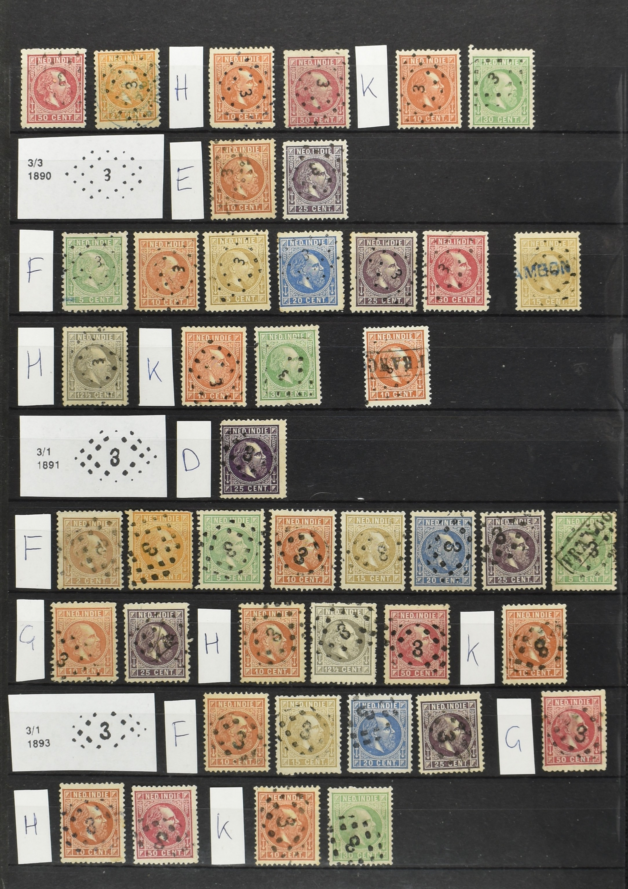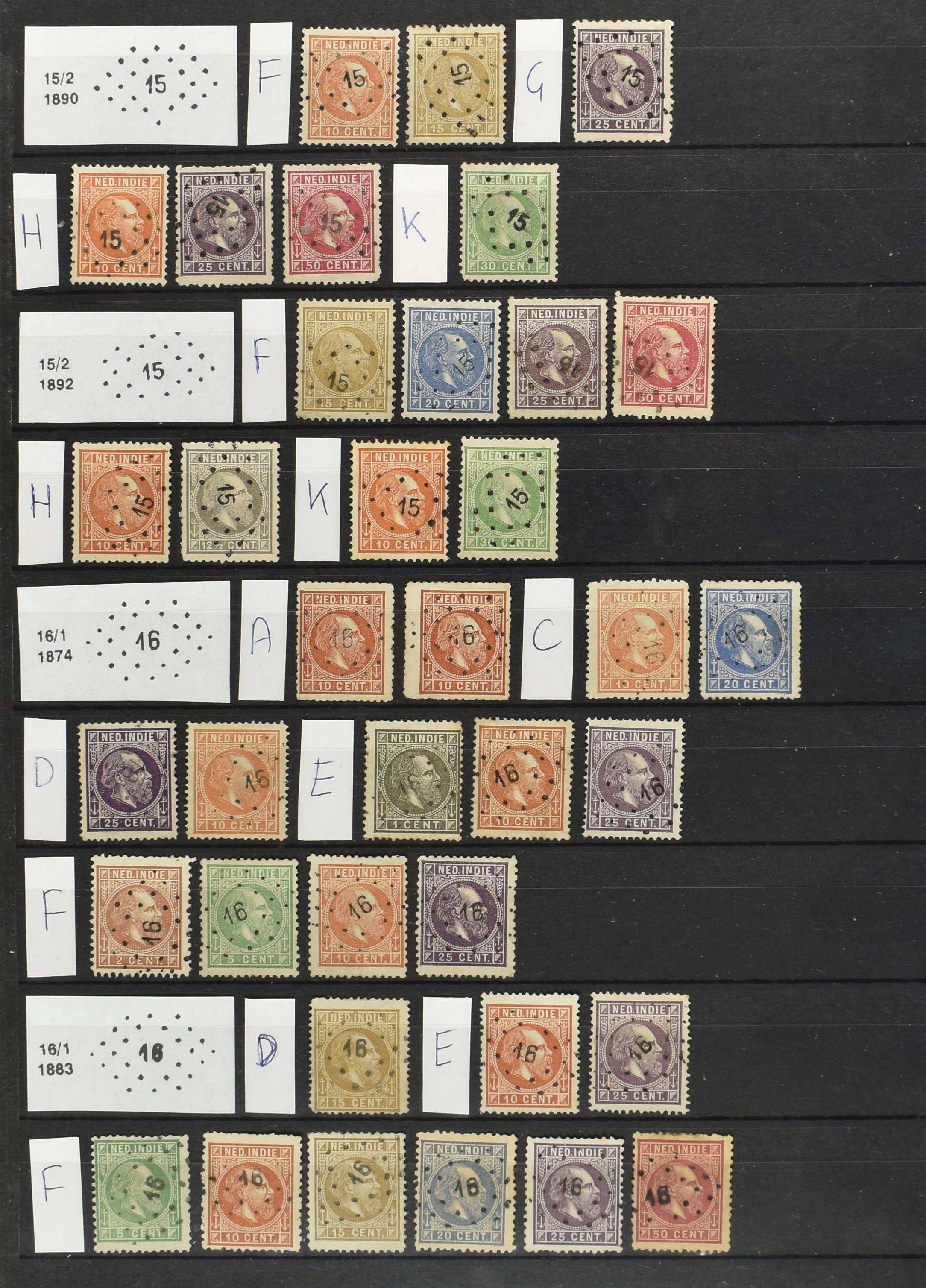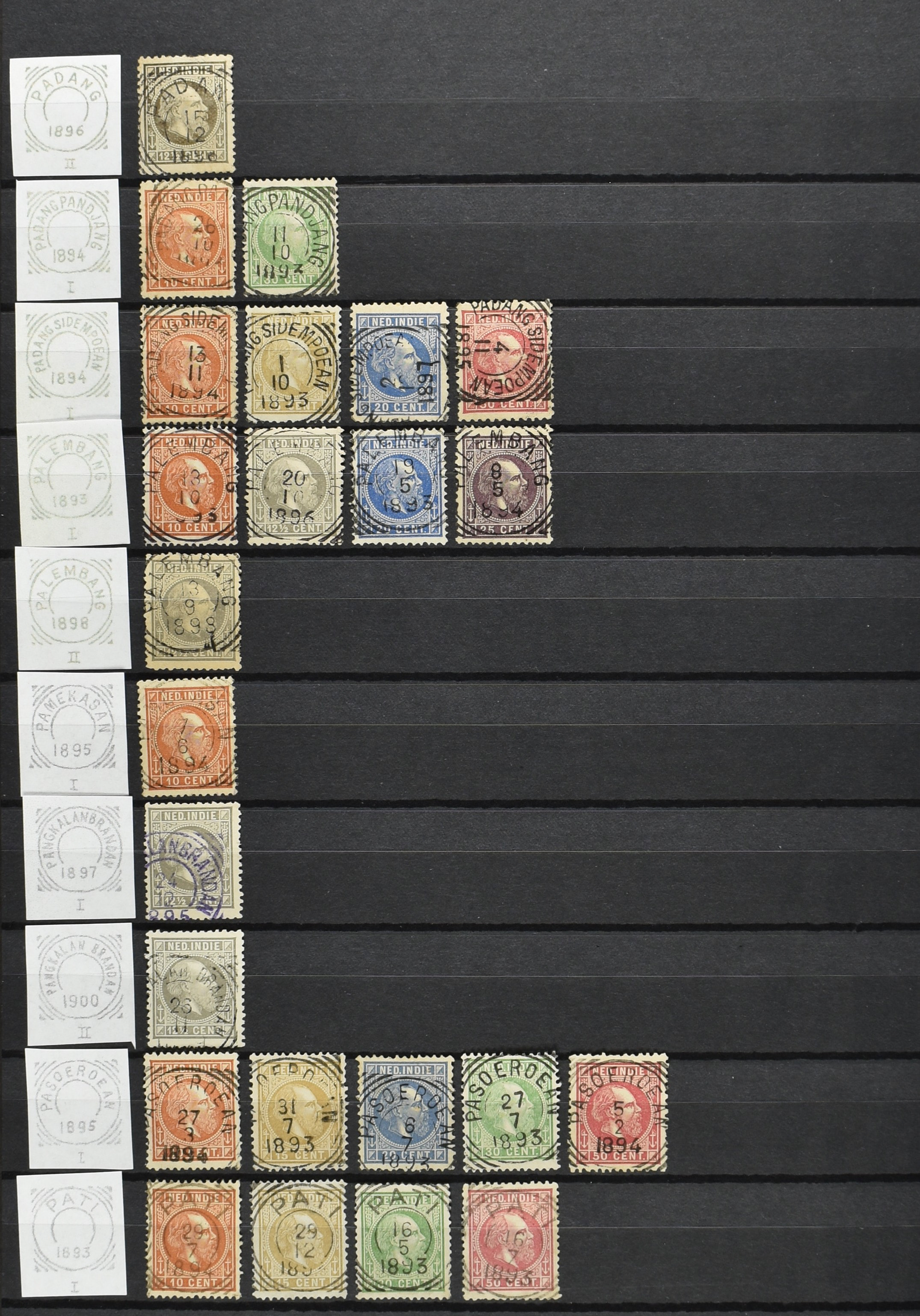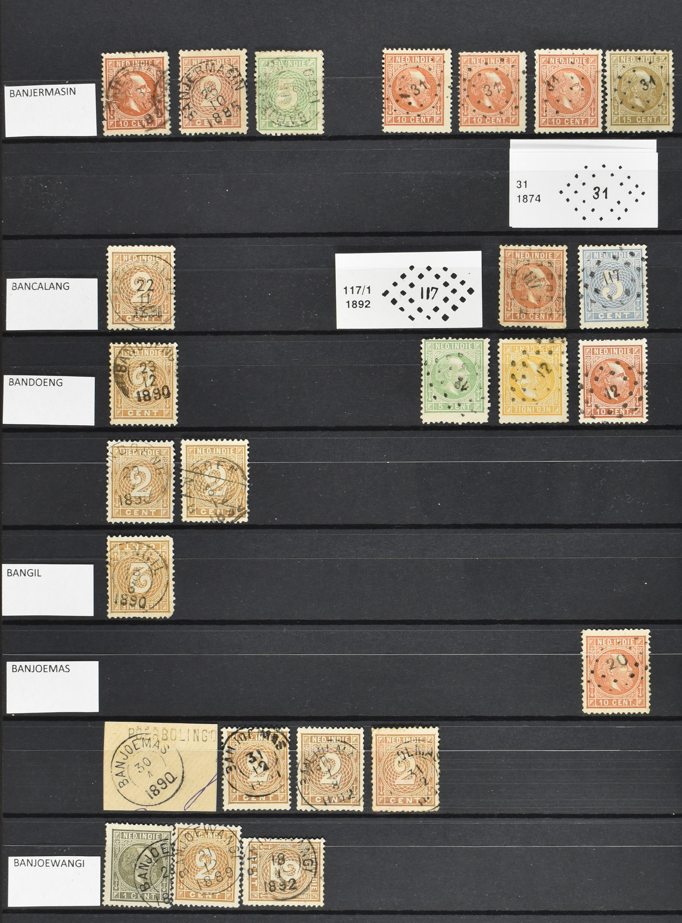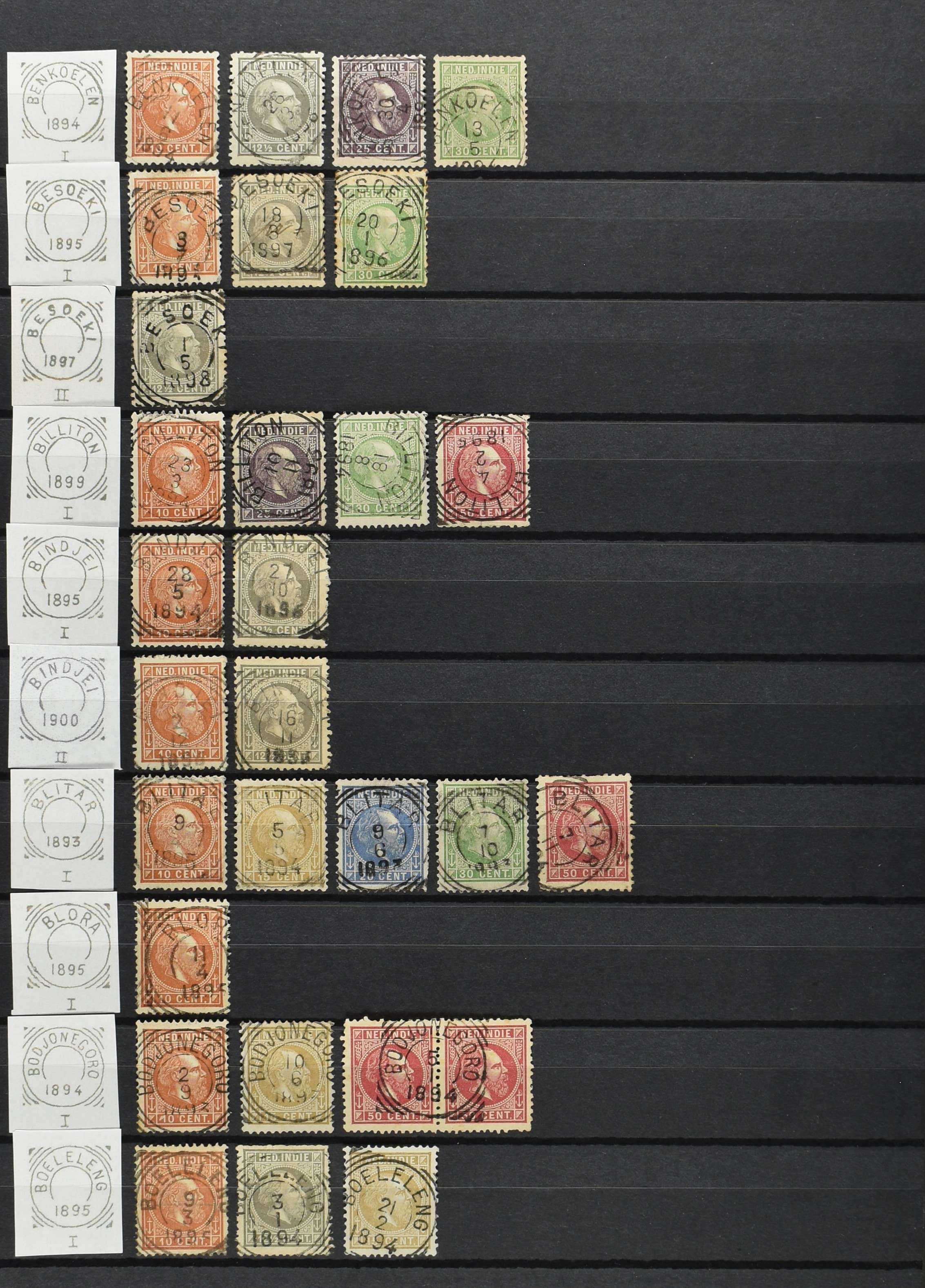 2254 imageNED.- INDIË VIERKANTSTEMPELS op Emissie Koning Willem III 1870-88, uitgebreide collectie opgezet volgens Ten Geuzendam met de diverse typen waarbij enkele blauwe, rode (Indragiri) en violette afstempelingen, Banjoewangi ook met kopstaand jaartal, per kantoor ieder type op zo veel mogelijk verschillende waarden, in uitgezochte kwaliteit met vrijwel uitsluitend volledige en veelal rechtopstaande afstempelingen op zegels in doorgaans prachtkwaliteit, overzichtelijk op alfabetische volgorde en typen opgezet in insteekboek. Wellicht overbodig te vermelden, maar het gaat om vierkantstempels en bepaalde typen die gebruikt zijn gedurende de looptijd van deze emissie, dus t/m december 1900. Alle daarna uitgegeven vierkantstempels kunnen dus niet op deze emissie voorkomen. De verzameling is een lust voor het oog, een uitgelezen kans om topkwaliteit te kopen en op te zetten, uiteraard ook geschikt voor kwaliteitsverbetering, datastudie (vbd, lbd) of detailleren (Image) (Image2) (Image3) (Image4) (Image5) (Image6) (Image7) (Image8) (Image9) (Image10) (Image11) (Image12) (Image13) (Image14) (Image15) (Image16) (All Images)