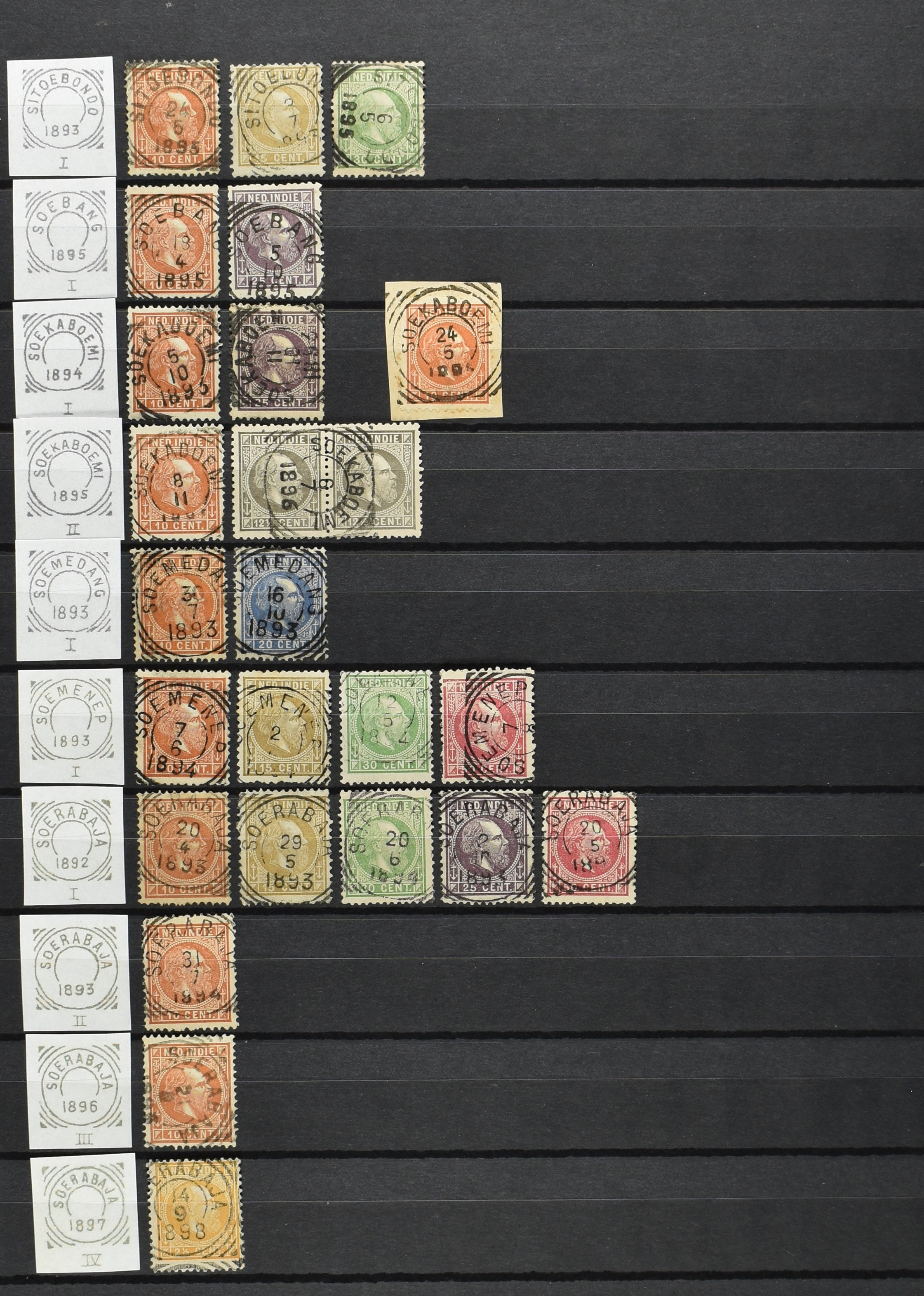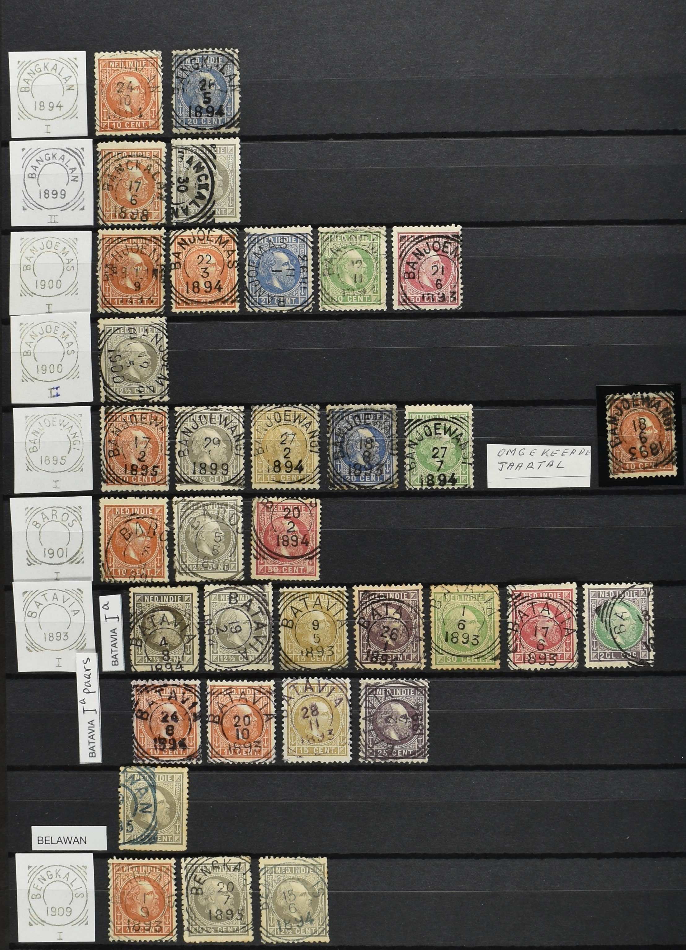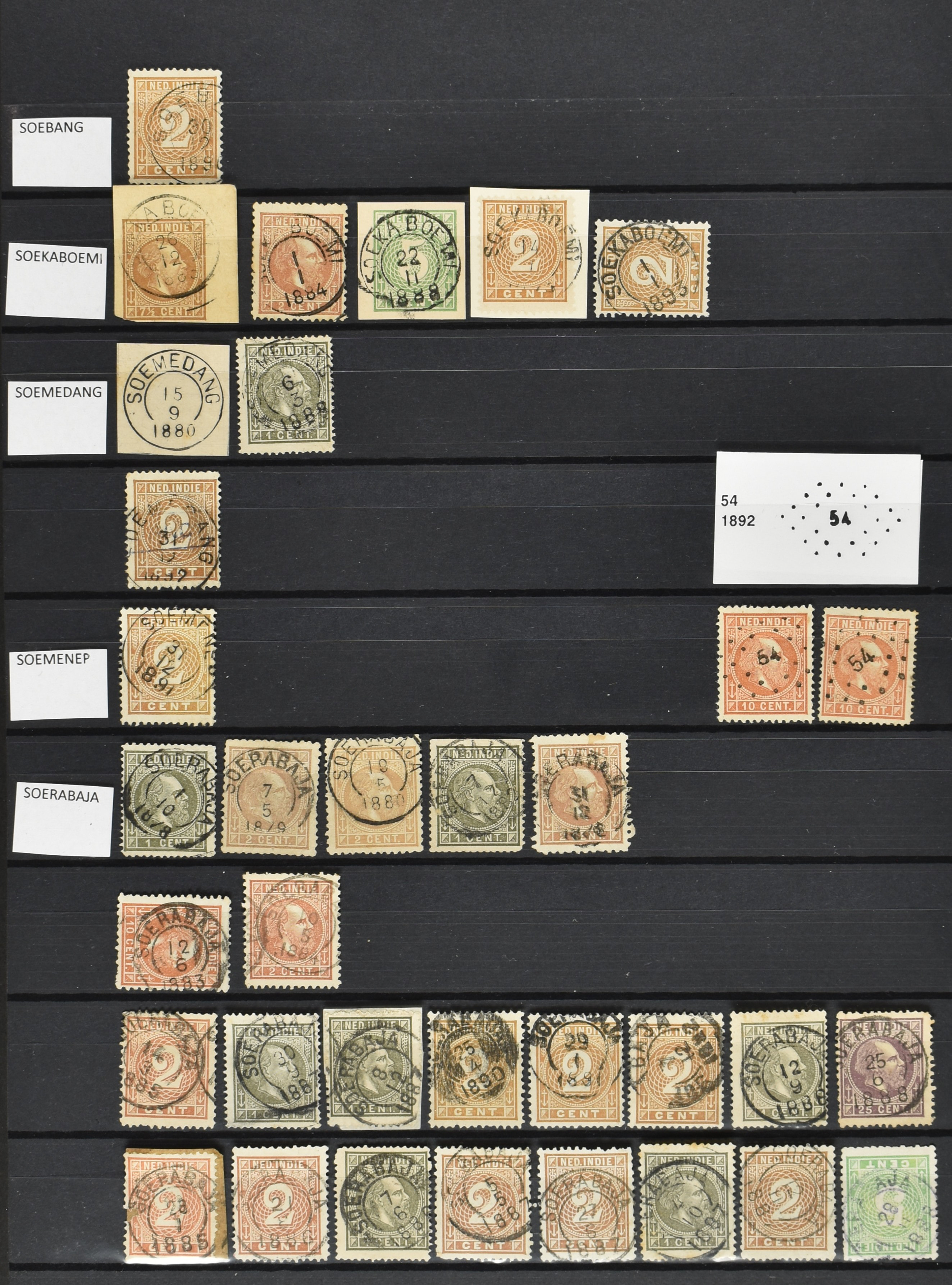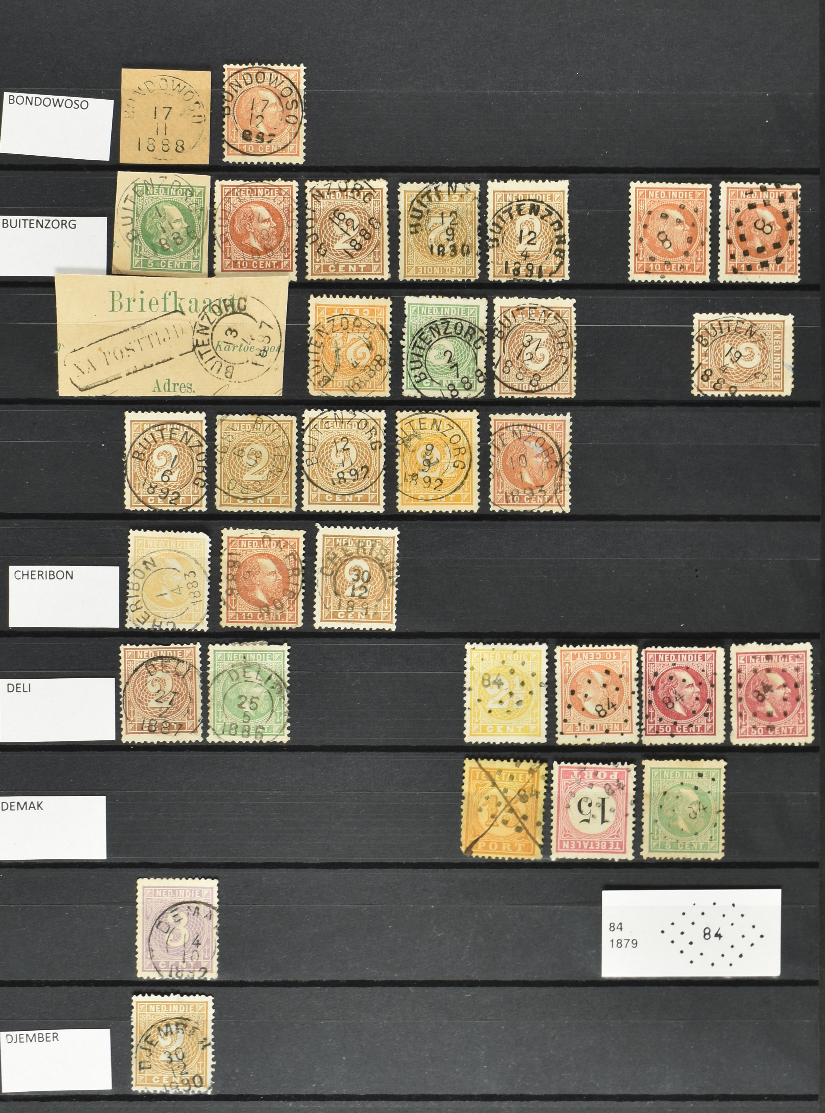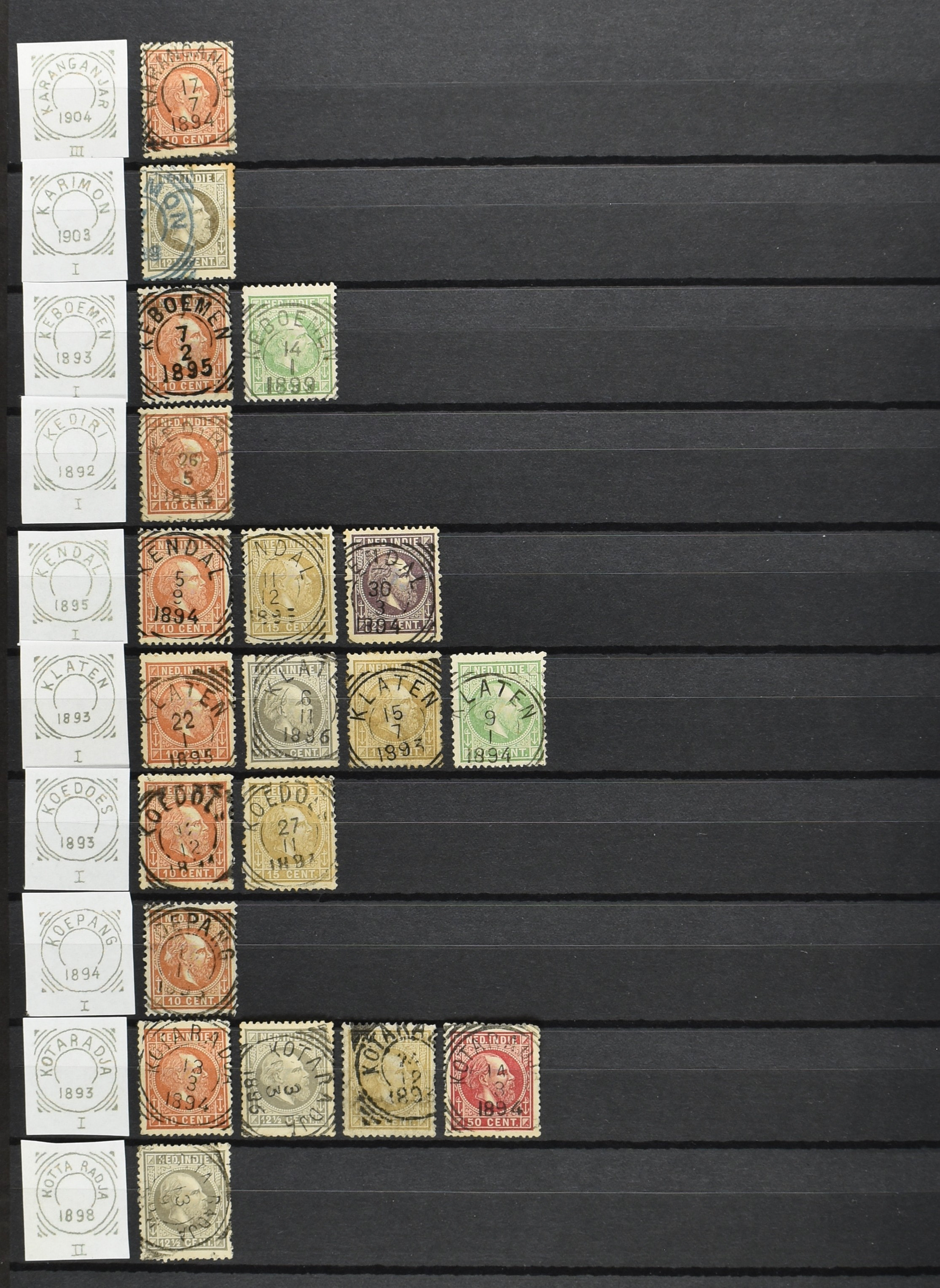 2254 imageNED.- INDIË VIERKANTSTEMPELS op Emissie Koning Willem III 1870-88, uitgebreide collectie opgezet volgens Ten Geuzendam met de diverse typen waarbij enkele blauwe, rode (Indragiri) en violette afstempelingen, Banjoewangi ook met kopstaand jaartal, per kantoor ieder type op zo veel mogelijk verschillende waarden, in uitgezochte kwaliteit met vrijwel uitsluitend volledige en veelal rechtopstaande afstempelingen op zegels in doorgaans prachtkwaliteit, overzichtelijk op alfabetische volgorde en typen opgezet in insteekboek. Wellicht overbodig te vermelden, maar het gaat om vierkantstempels en bepaalde typen die gebruikt zijn gedurende de looptijd van deze emissie, dus t/m december 1900. Alle daarna uitgegeven vierkantstempels kunnen dus niet op deze emissie voorkomen. De verzameling is een lust voor het oog, een uitgelezen kans om topkwaliteit te kopen en op te zetten, uiteraard ook geschikt voor kwaliteitsverbetering, datastudie (vbd, lbd) of detailleren (Image) (Image2) (Image3) (Image4) (Image5) (Image6) (Image7) (Image8) (Image9) (Image10) (Image11) (Image12) (Image13) (Image14) (Image15) (Image16) (All Images)