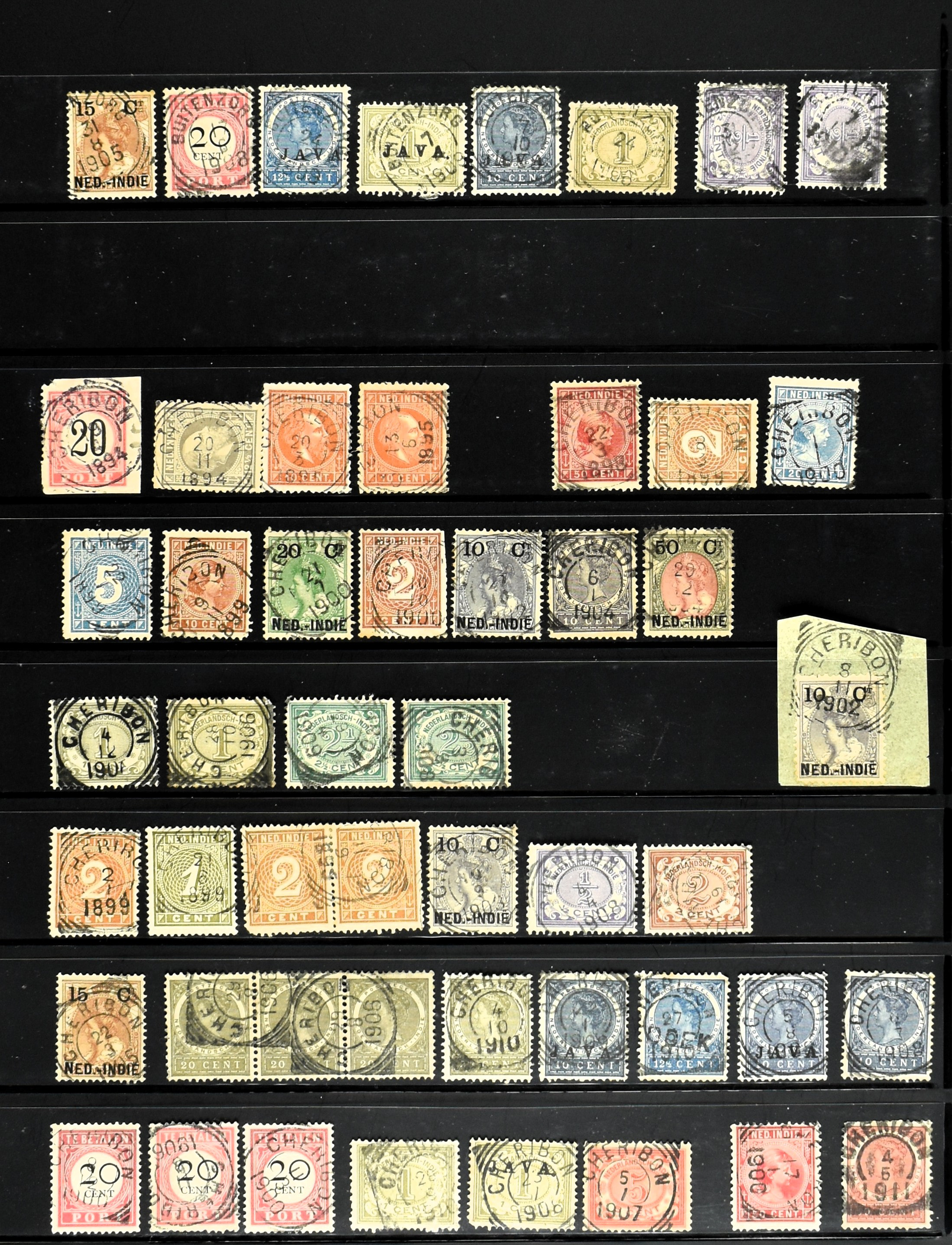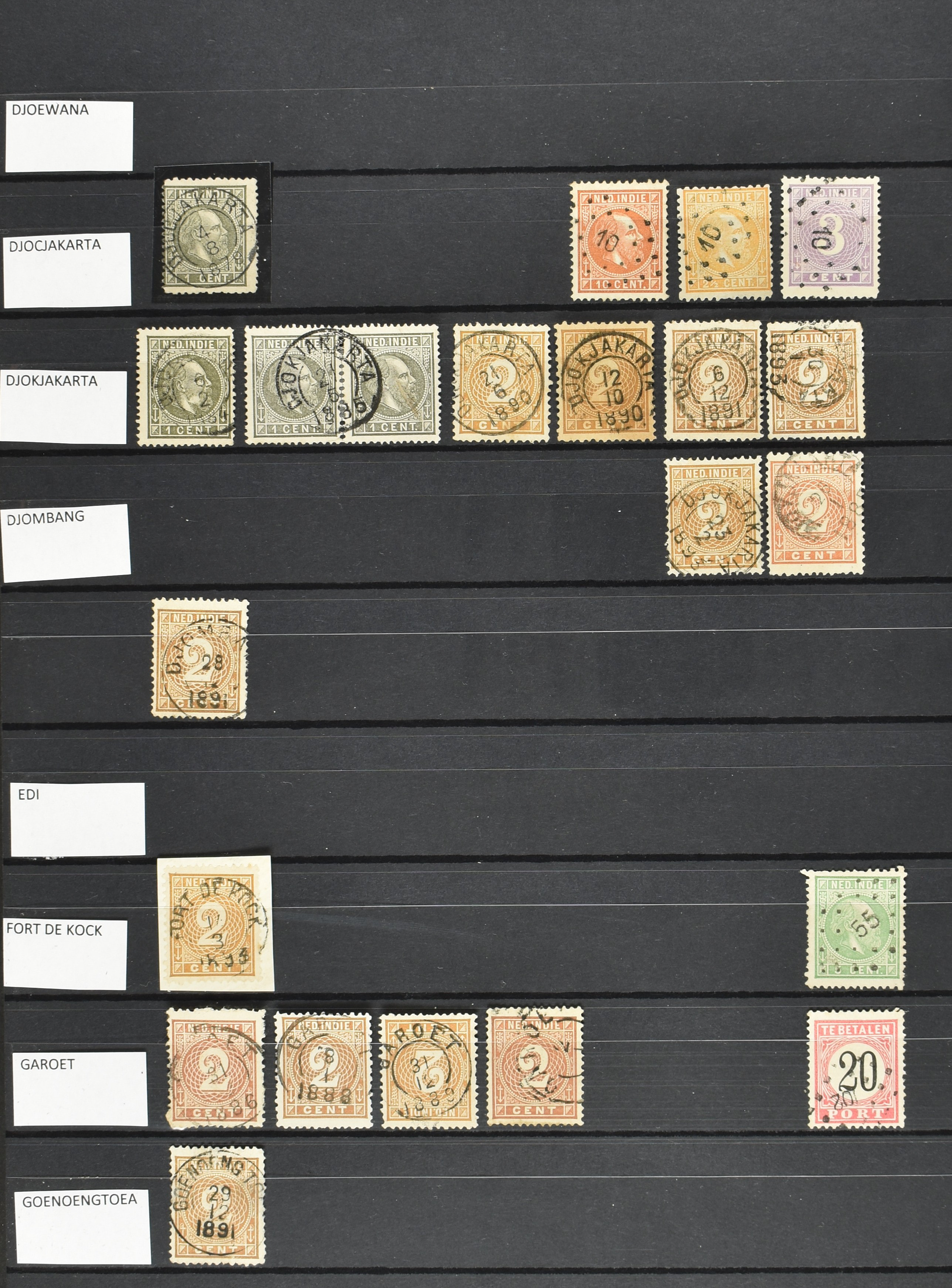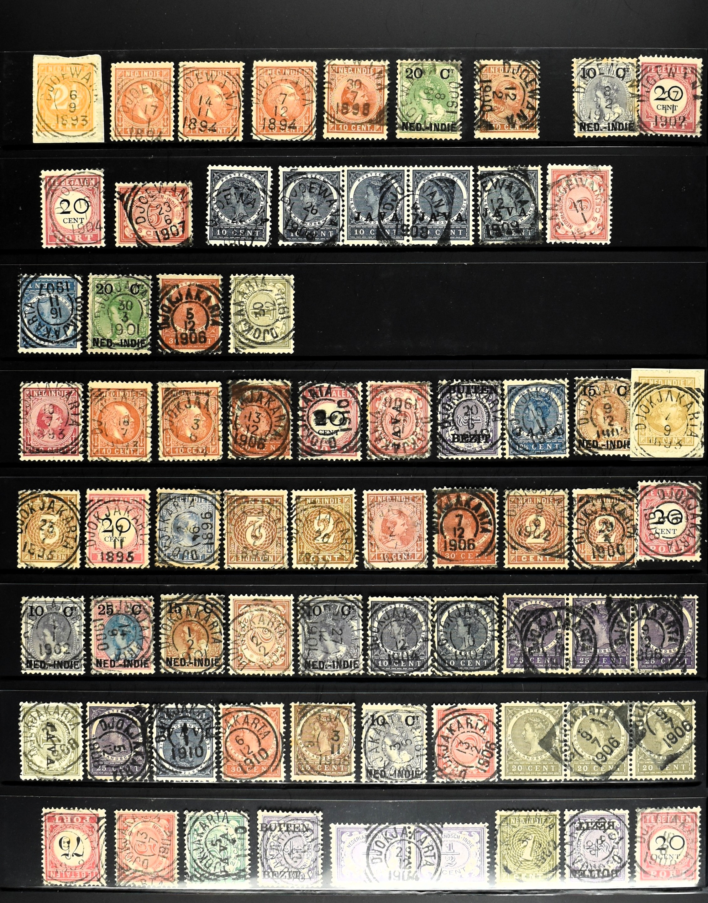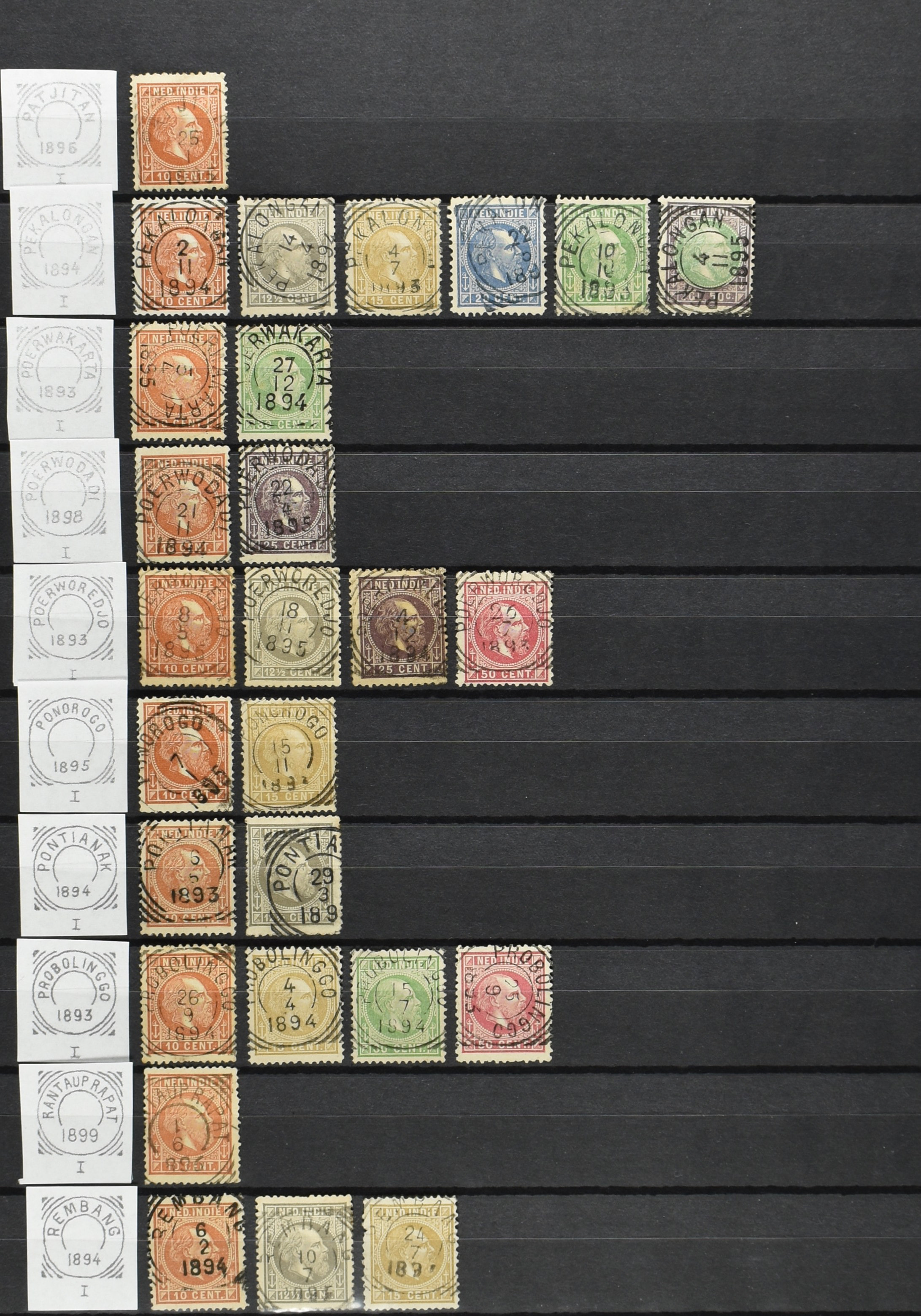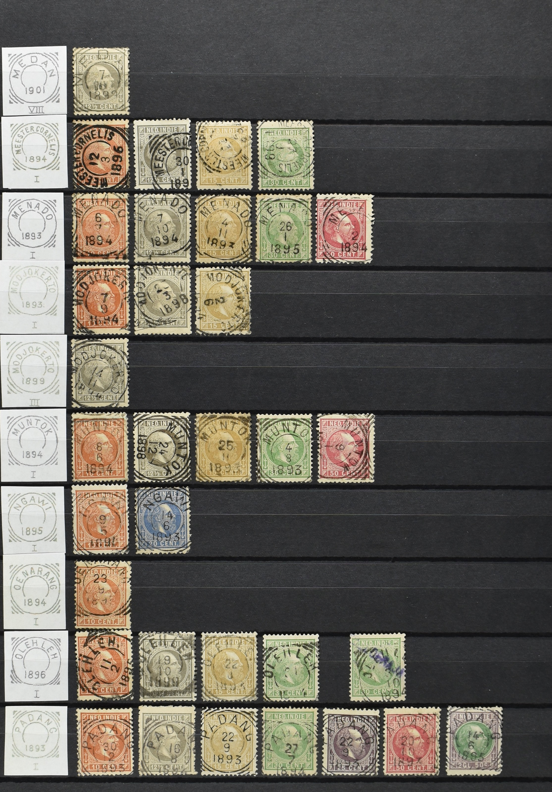 2254 imageNED.- INDIË VIERKANTSTEMPELS op Emissie Koning Willem III 1870-88, uitgebreide collectie opgezet volgens Ten Geuzendam met de diverse typen waarbij enkele blauwe, rode (Indragiri) en violette afstempelingen, Banjoewangi ook met kopstaand jaartal, per kantoor ieder type op zo veel mogelijk verschillende waarden, in uitgezochte kwaliteit met vrijwel uitsluitend volledige en veelal rechtopstaande afstempelingen op zegels in doorgaans prachtkwaliteit, overzichtelijk op alfabetische volgorde en typen opgezet in insteekboek. Wellicht overbodig te vermelden, maar het gaat om vierkantstempels en bepaalde typen die gebruikt zijn gedurende de looptijd van deze emissie, dus t/m december 1900. Alle daarna uitgegeven vierkantstempels kunnen dus niet op deze emissie voorkomen. De verzameling is een lust voor het oog, een uitgelezen kans om topkwaliteit te kopen en op te zetten, uiteraard ook geschikt voor kwaliteitsverbetering, datastudie (vbd, lbd) of detailleren (Image) (Image2) (Image3) (Image4) (Image5) (Image6) (Image7) (Image8) (Image9) (Image10) (Image11) (Image12) (Image13) (Image14) (Image15) (Image16) (All Images)