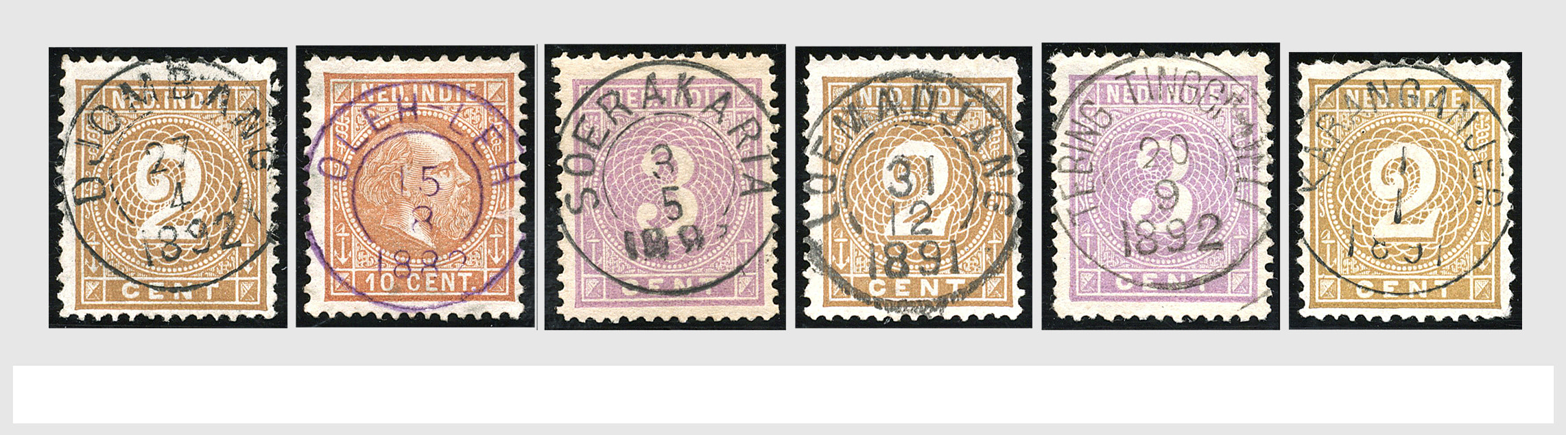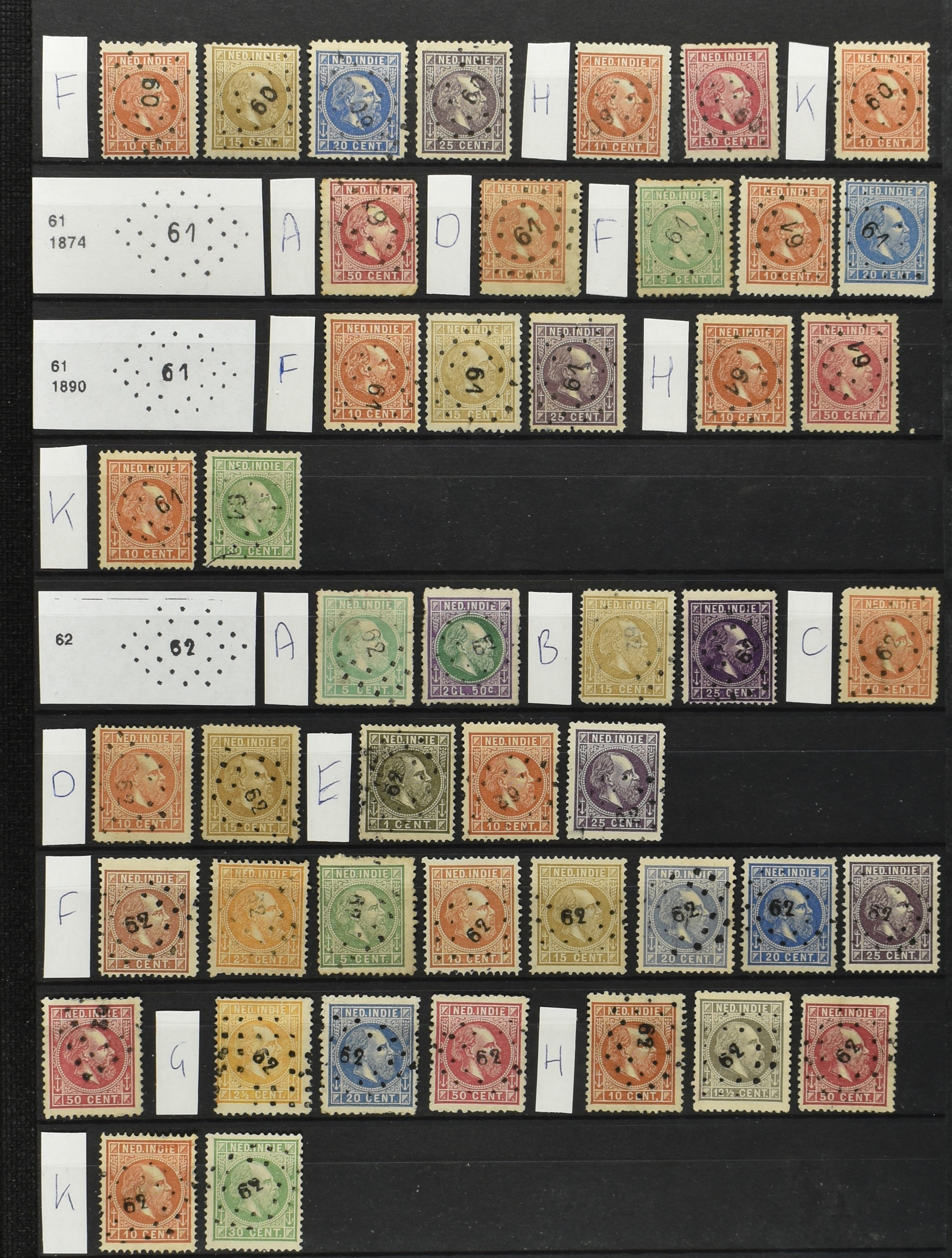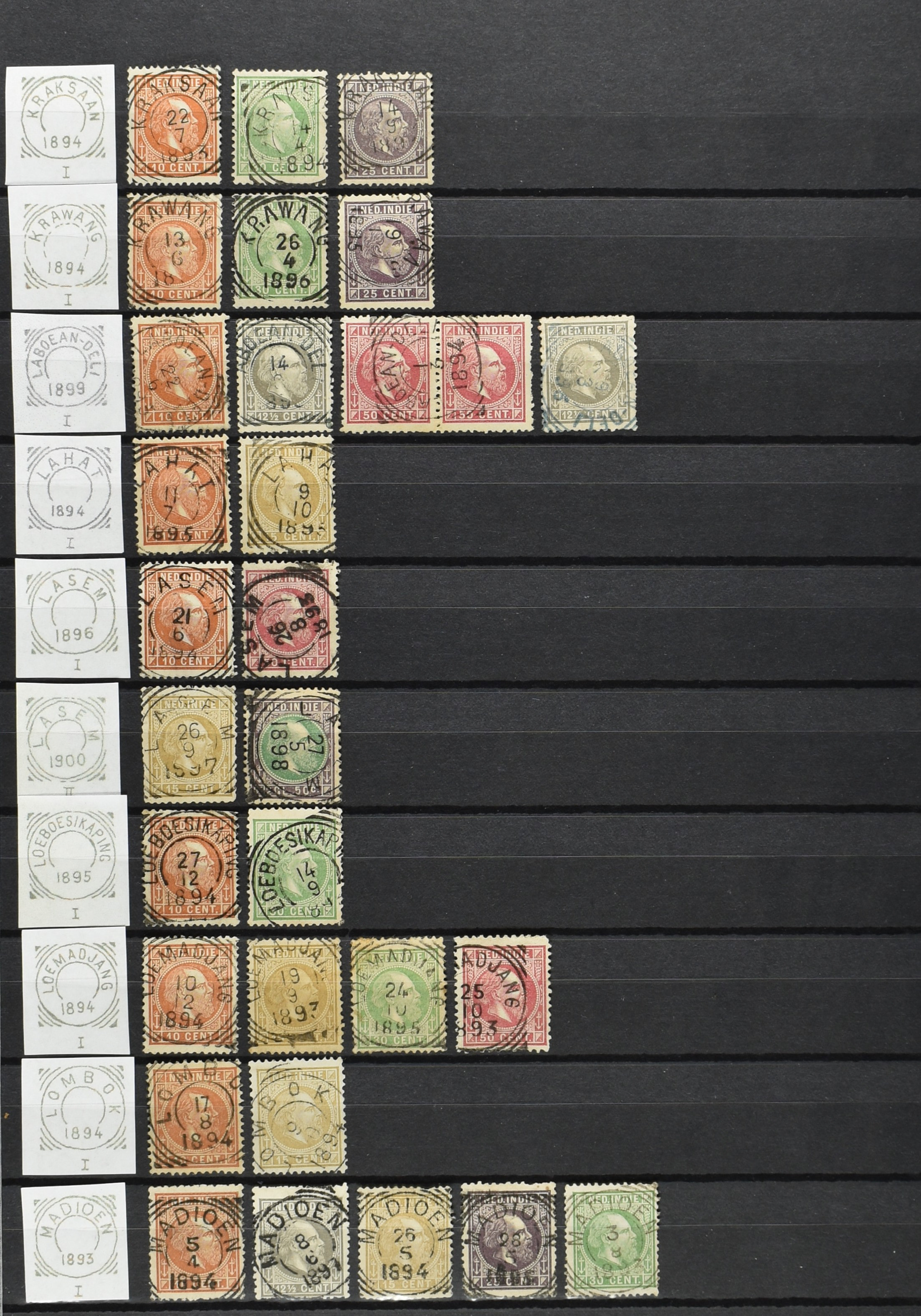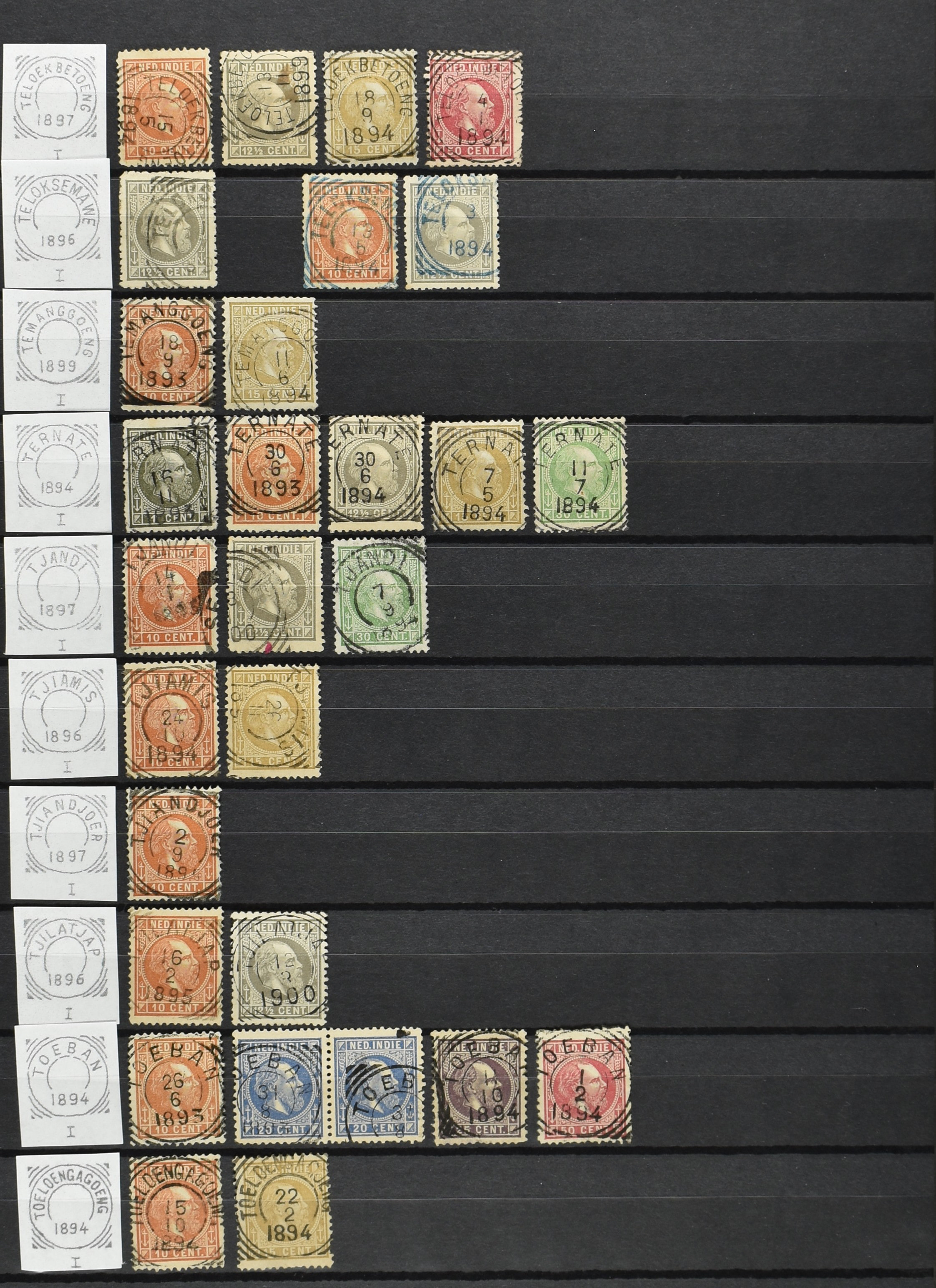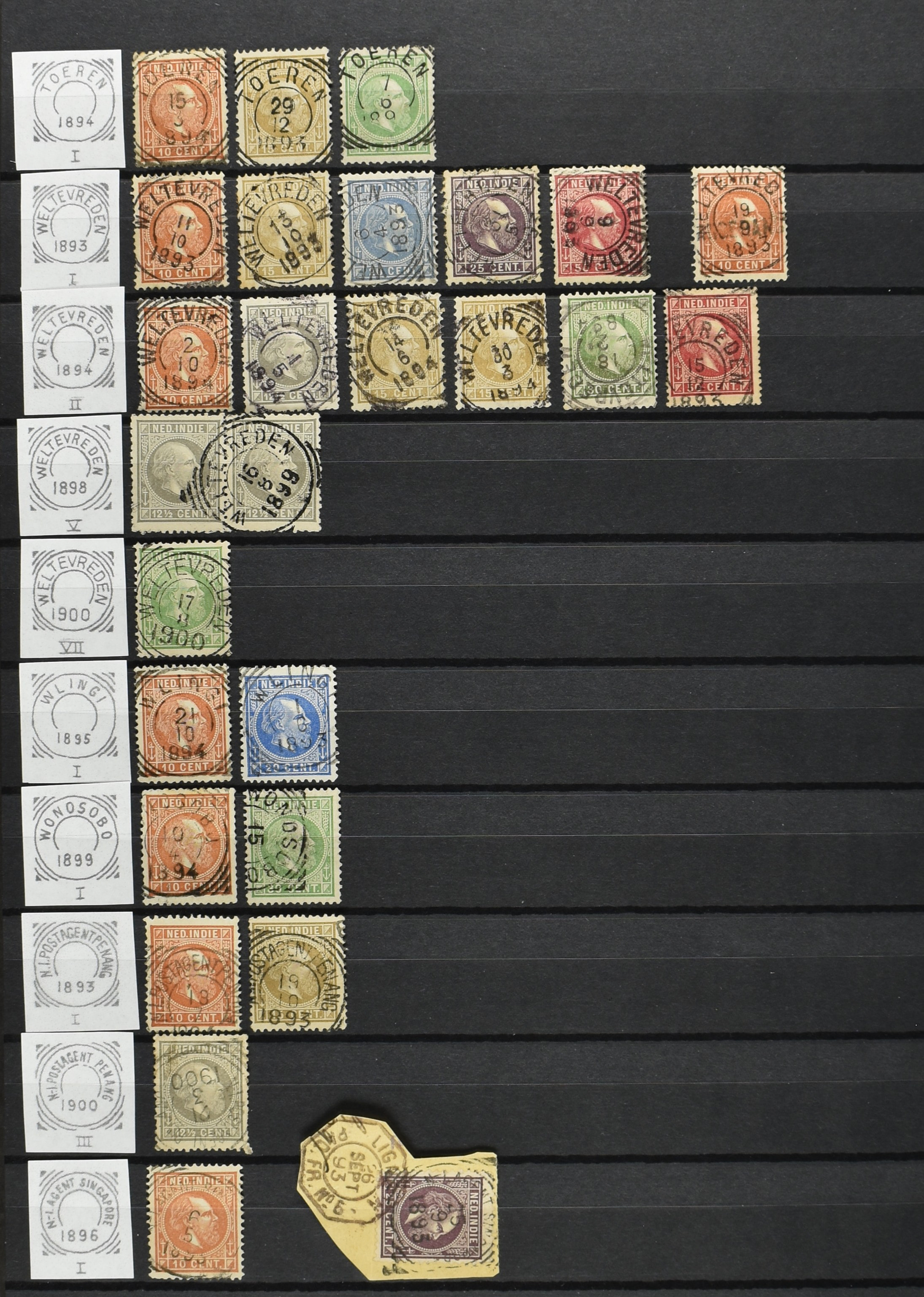 2254 imageNED.- INDIË VIERKANTSTEMPELS op Emissie Koning Willem III 1870-88, uitgebreide collectie opgezet volgens Ten Geuzendam met de diverse typen waarbij enkele blauwe, rode (Indragiri) en violette afstempelingen, Banjoewangi ook met kopstaand jaartal, per kantoor ieder type op zo veel mogelijk verschillende waarden, in uitgezochte kwaliteit met vrijwel uitsluitend volledige en veelal rechtopstaande afstempelingen op zegels in doorgaans prachtkwaliteit, overzichtelijk op alfabetische volgorde en typen opgezet in insteekboek. Wellicht overbodig te vermelden, maar het gaat om vierkantstempels en bepaalde typen die gebruikt zijn gedurende de looptijd van deze emissie, dus t/m december 1900. Alle daarna uitgegeven vierkantstempels kunnen dus niet op deze emissie voorkomen. De verzameling is een lust voor het oog, een uitgelezen kans om topkwaliteit te kopen en op te zetten, uiteraard ook geschikt voor kwaliteitsverbetering, datastudie (vbd, lbd) of detailleren (Image) (Image2) (Image3) (Image4) (Image5) (Image6) (Image7) (Image8) (Image9) (Image10) (Image11) (Image12) (Image13) (Image14) (Image15) (Image16) (All Images)