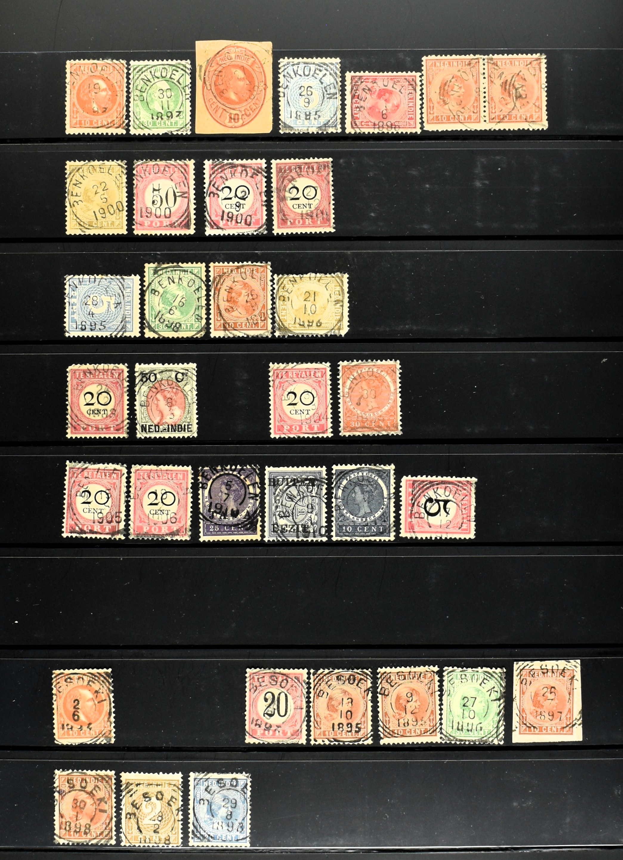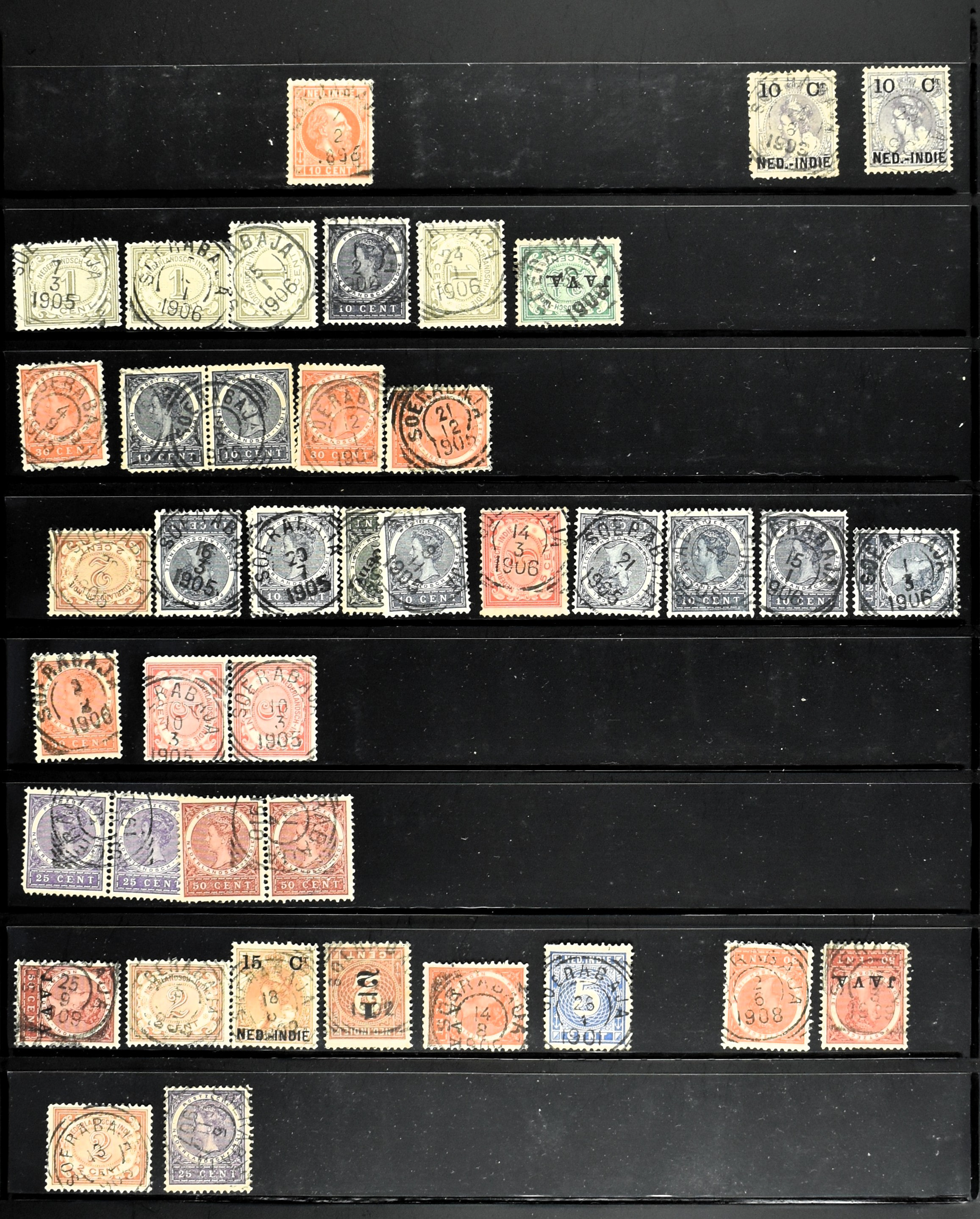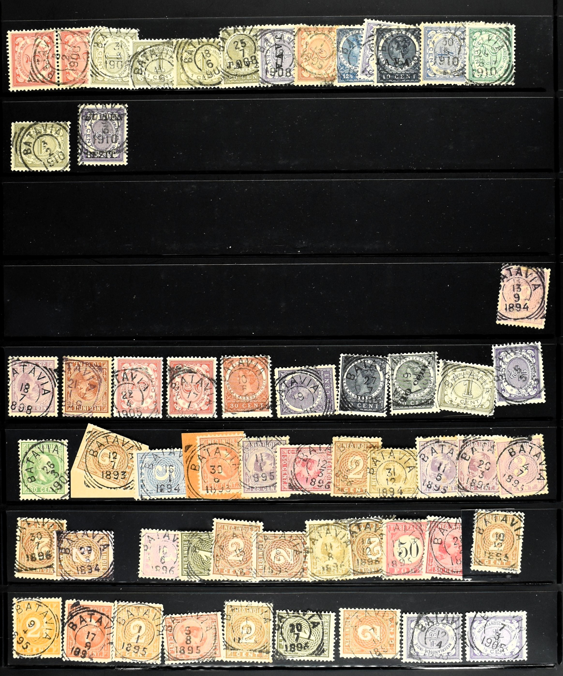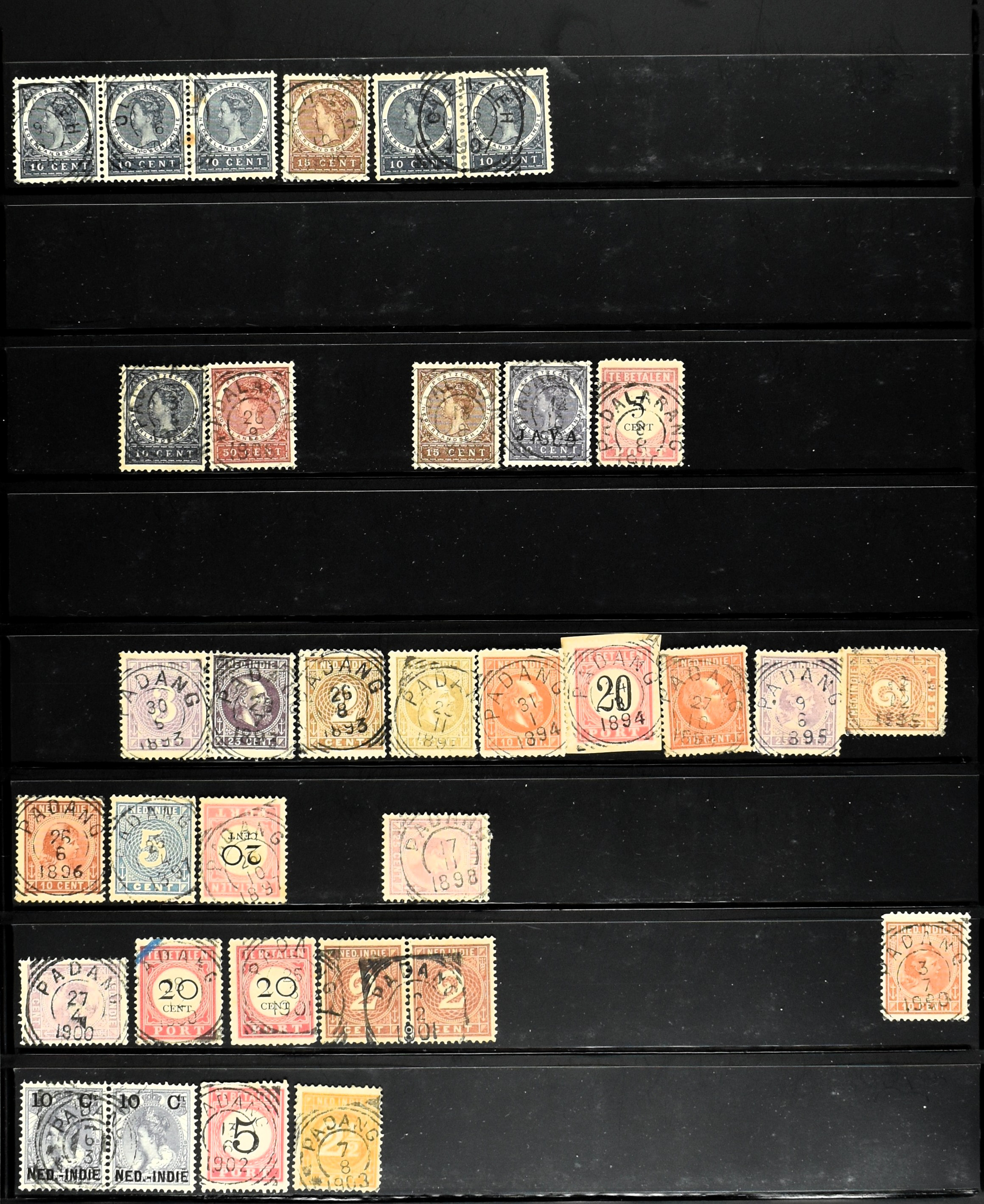 2254 imageNED.- INDIË VIERKANTSTEMPELS op Emissie Koning Willem III 1870-88, uitgebreide collectie opgezet volgens Ten Geuzendam met de diverse typen waarbij enkele blauwe, rode (Indragiri) en violette afstempelingen, Banjoewangi ook met kopstaand jaartal, per kantoor ieder type op zo veel mogelijk verschillende waarden, in uitgezochte kwaliteit met vrijwel uitsluitend volledige en veelal rechtopstaande afstempelingen op zegels in doorgaans prachtkwaliteit, overzichtelijk op alfabetische volgorde en typen opgezet in insteekboek. Wellicht overbodig te vermelden, maar het gaat om vierkantstempels en bepaalde typen die gebruikt zijn gedurende de looptijd van deze emissie, dus t/m december 1900. Alle daarna uitgegeven vierkantstempels kunnen dus niet op deze emissie voorkomen. De verzameling is een lust voor het oog, een uitgelezen kans om topkwaliteit te kopen en op te zetten, uiteraard ook geschikt voor kwaliteitsverbetering, datastudie (vbd, lbd) of detailleren (Image) (Image2) (Image3) (Image4) (Image5) (Image6) (Image7) (Image8) (Image9) (Image10) (Image11) (Image12) (Image13) (Image14) (Image15) (Image16) (All Images)