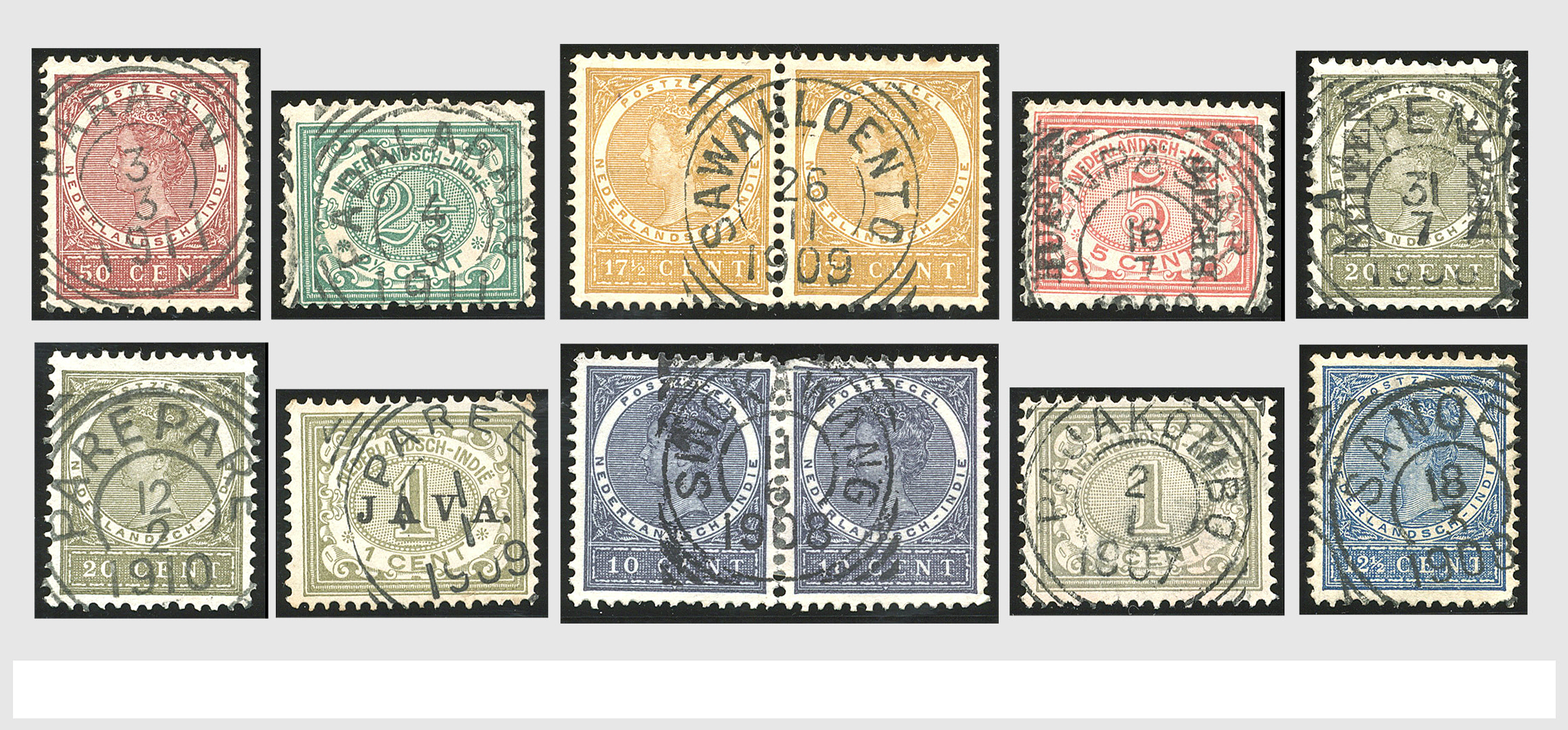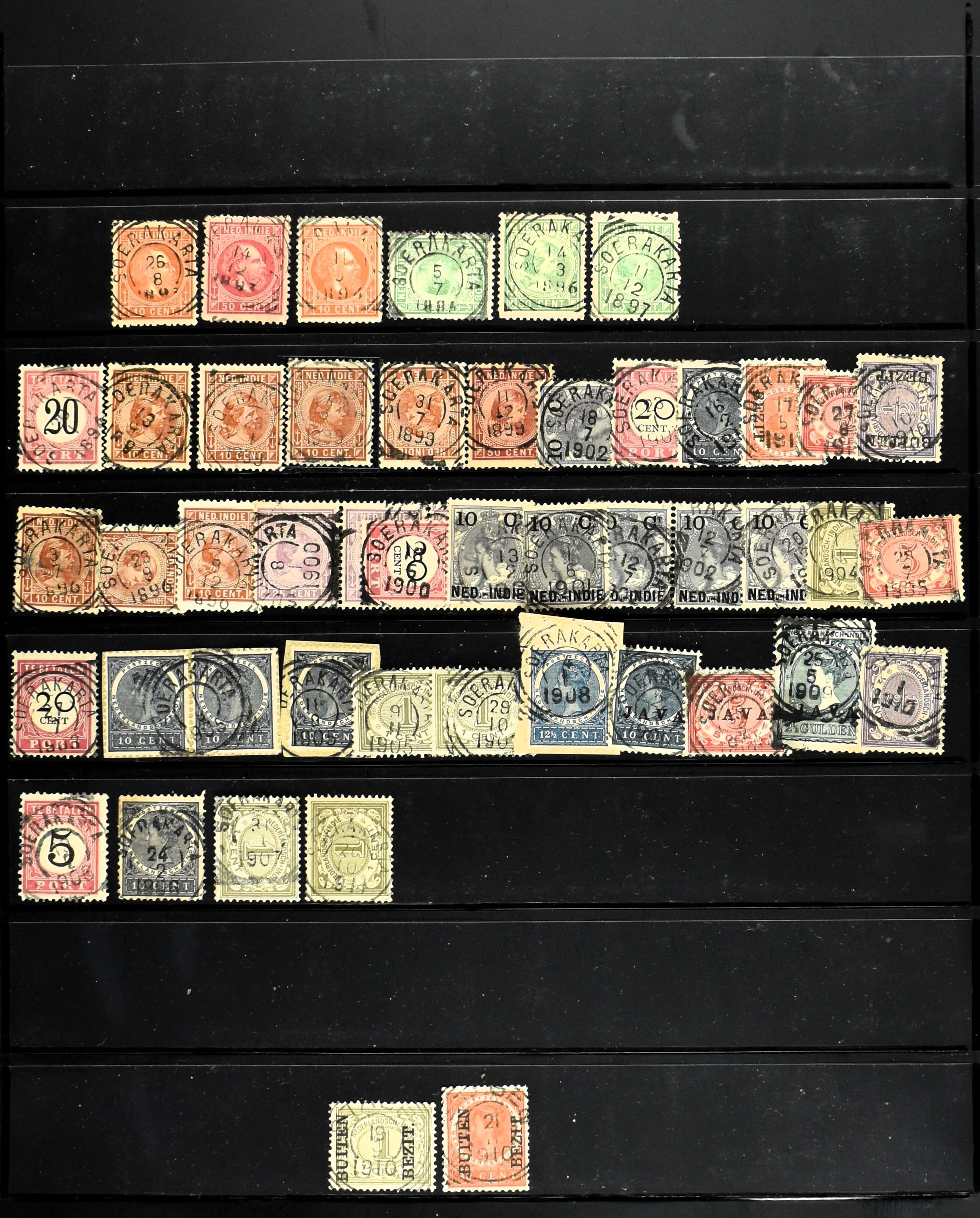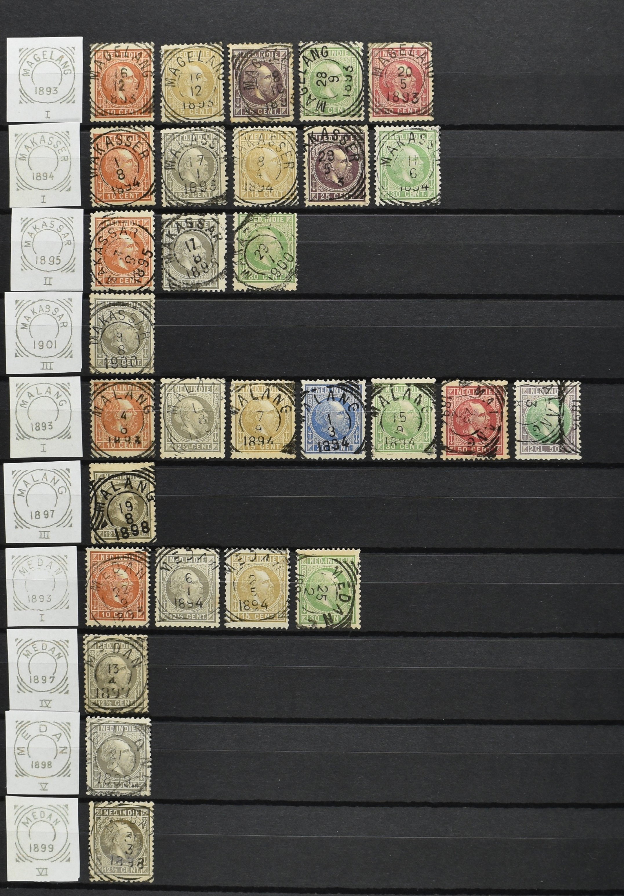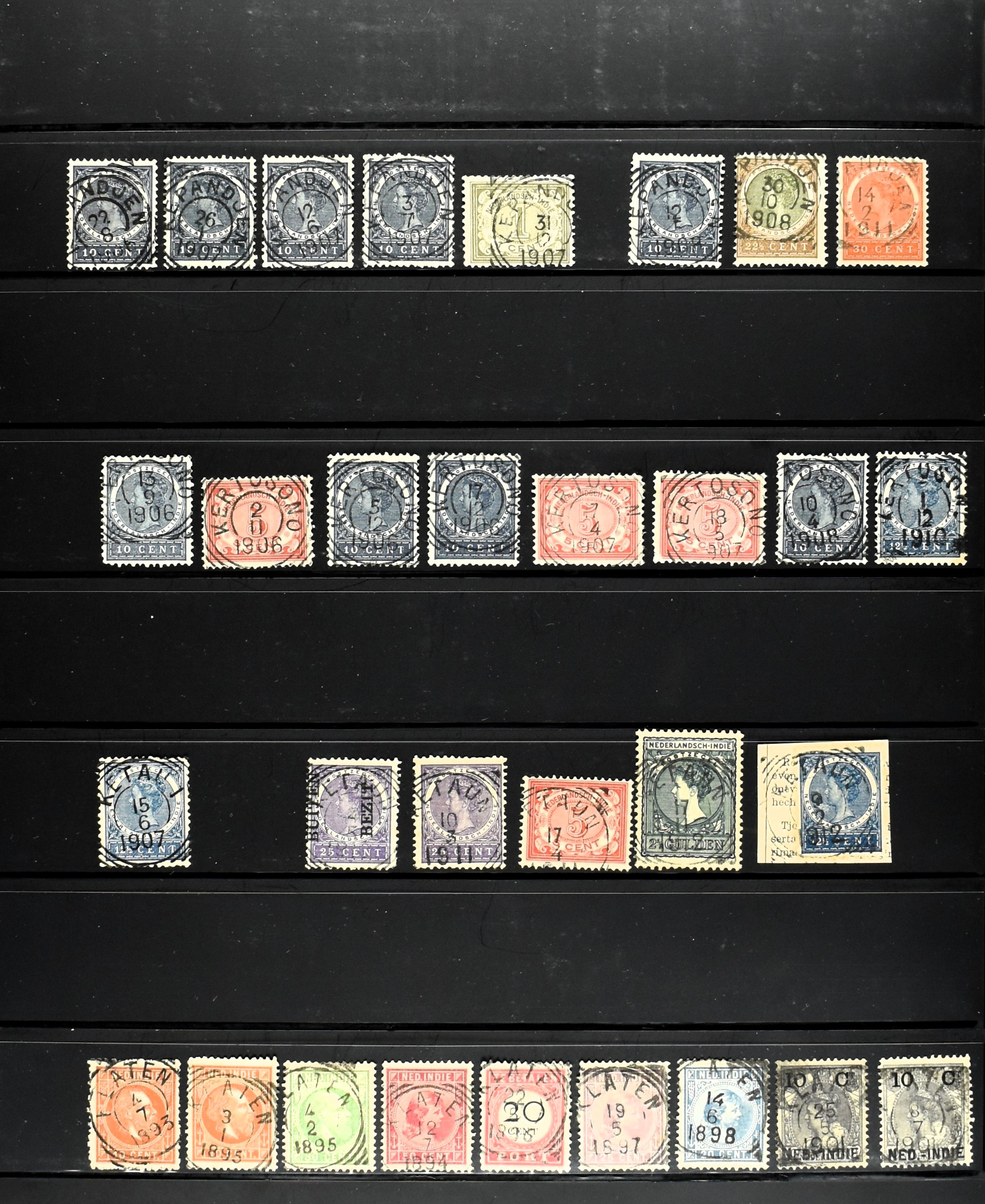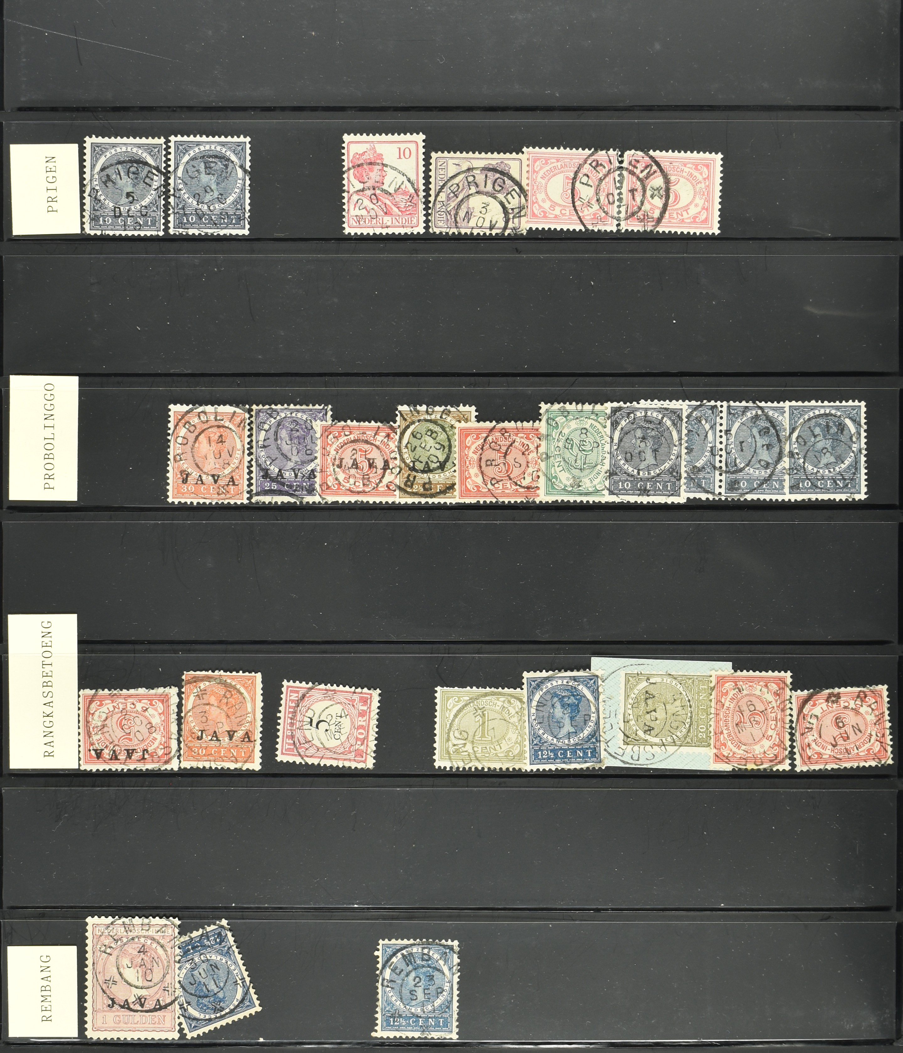 2254 imageNED.- INDIË VIERKANTSTEMPELS op Emissie Koning Willem III 1870-88, uitgebreide collectie opgezet volgens Ten Geuzendam met de diverse typen waarbij enkele blauwe, rode (Indragiri) en violette afstempelingen, Banjoewangi ook met kopstaand jaartal, per kantoor ieder type op zo veel mogelijk verschillende waarden, in uitgezochte kwaliteit met vrijwel uitsluitend volledige en veelal rechtopstaande afstempelingen op zegels in doorgaans prachtkwaliteit, overzichtelijk op alfabetische volgorde en typen opgezet in insteekboek. Wellicht overbodig te vermelden, maar het gaat om vierkantstempels en bepaalde typen die gebruikt zijn gedurende de looptijd van deze emissie, dus t/m december 1900. Alle daarna uitgegeven vierkantstempels kunnen dus niet op deze emissie voorkomen. De verzameling is een lust voor het oog, een uitgelezen kans om topkwaliteit te kopen en op te zetten, uiteraard ook geschikt voor kwaliteitsverbetering, datastudie (vbd, lbd) of detailleren (Image) (Image2) (Image3) (Image4) (Image5) (Image6) (Image7) (Image8) (Image9) (Image10) (Image11) (Image12) (Image13) (Image14) (Image15) (Image16) (All Images)