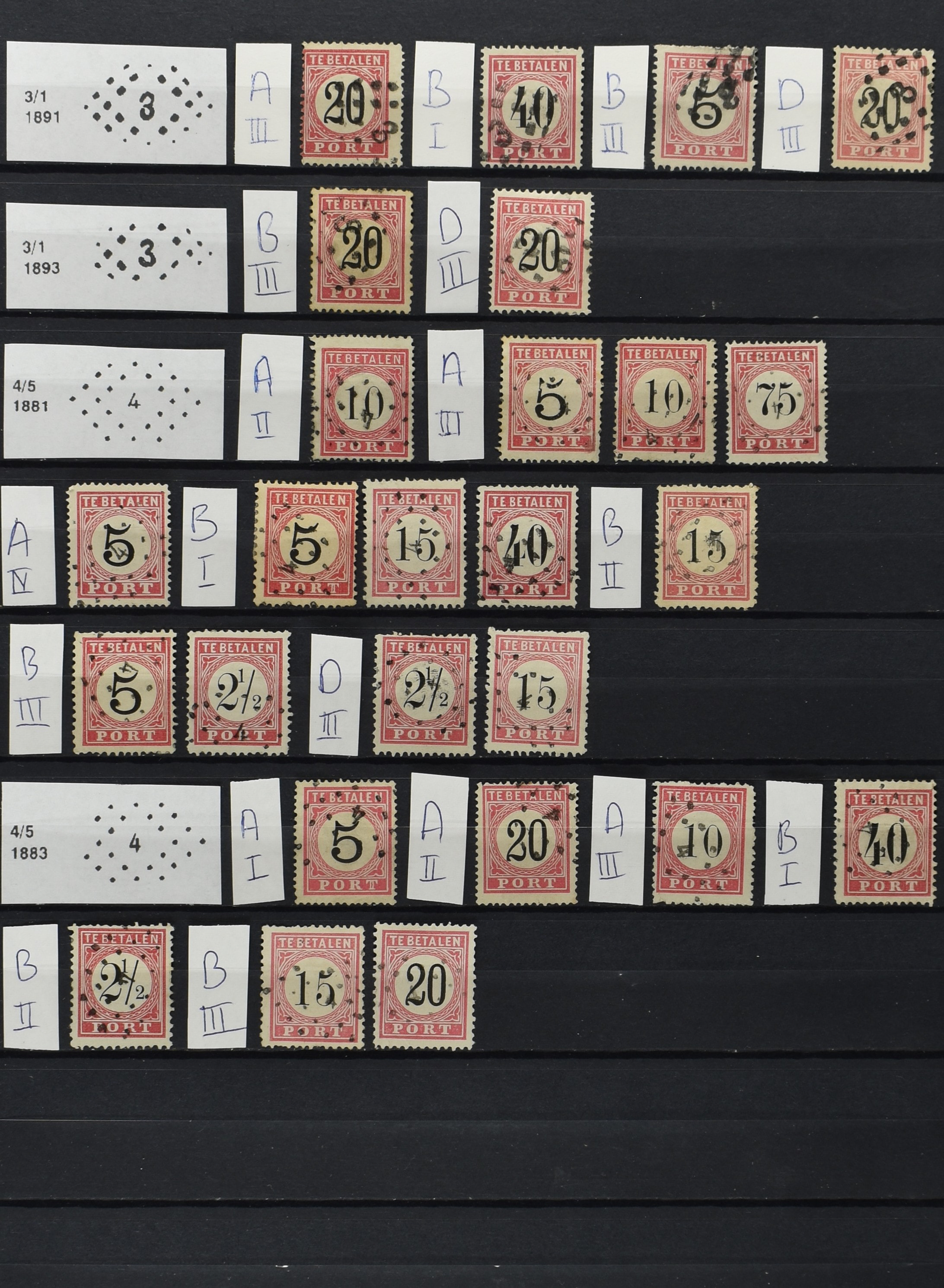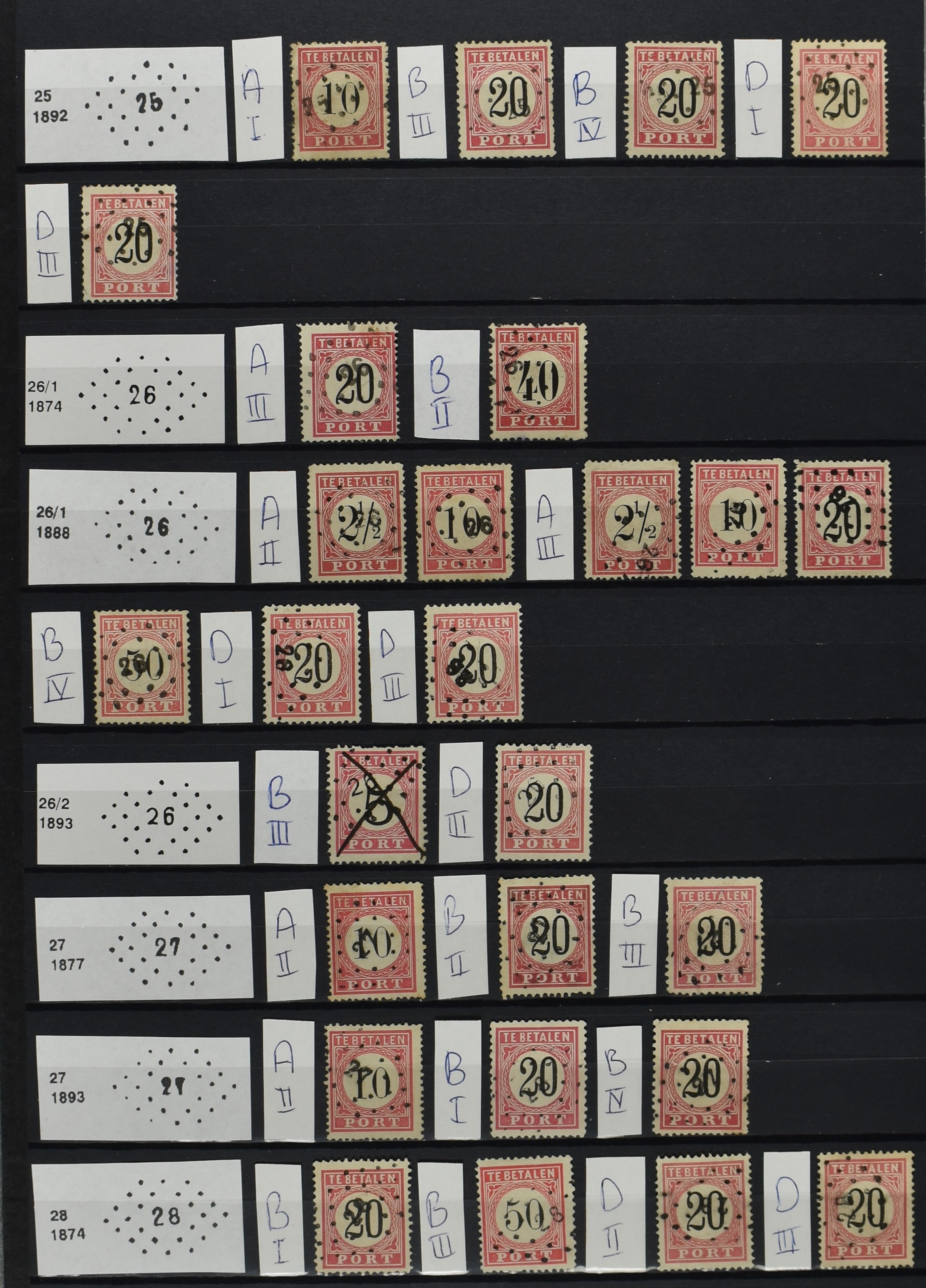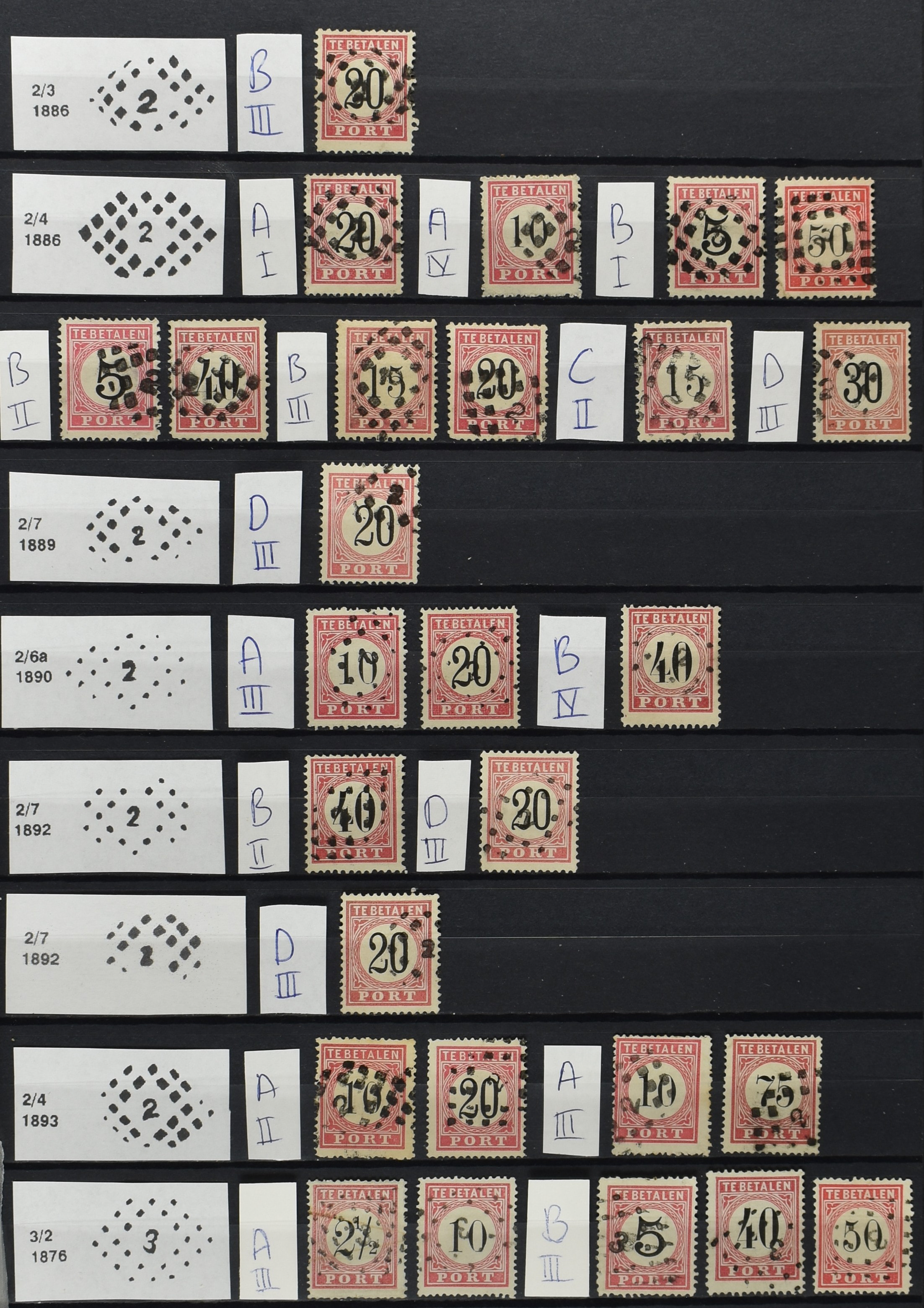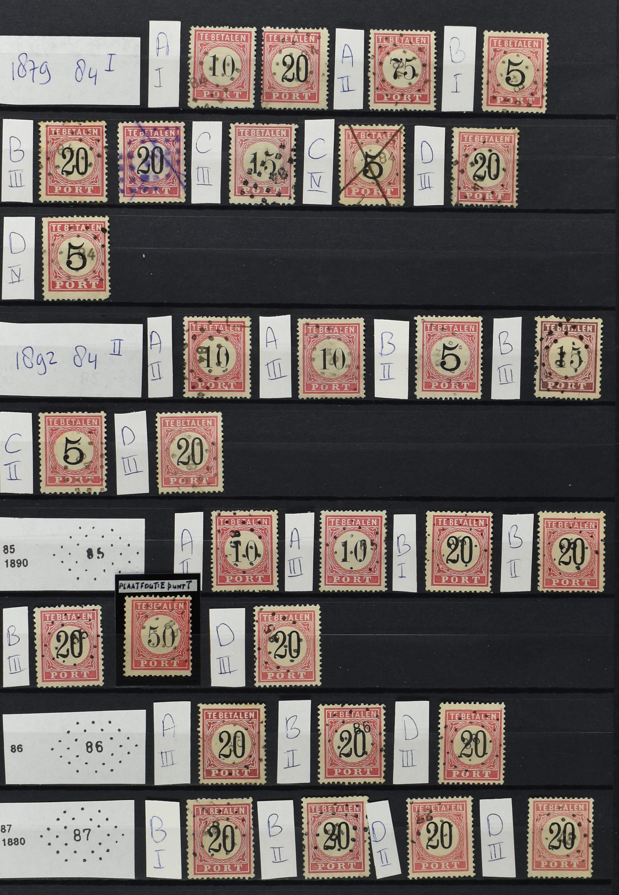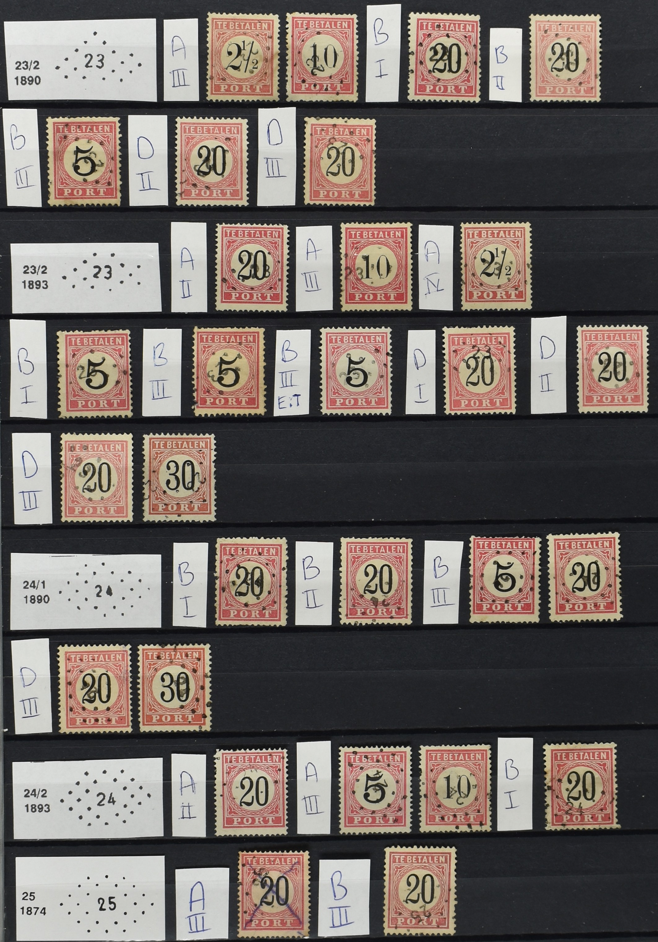 2252 imageNED.- INDIË PUNTSTEMPELS op Tweede Emissie Port 1882-88, zeer uitgebreide collectie opgezet volgens Bulterman (De Postzak nr. 153, sep. 1987), per puntstempelnummer ieder type op zo veel mogelijk verschillende waarden en bovendien in de verschillende typen en tandingen, tevens enkele plaatfouten, 40 en 105 ook in blauw, en 84, 105 en 115 ook in violet. Diverse zegels hebben ook een met de pen getrokken kruis en/of geschreven 'nietig' (= het port kon niet worden geïnd). Het geheel is in uitgezochte kwaliteit met vrijwel uitsluitend volledige afstempelingen op zegels in doorgaans prachtkwaliteit. De verzameling is overzichtelijk op nummervolgorde opgezet in 1 insteekboek. Door ons is een dergelijk uitgebreide puntstempelverzameling op deze portemissie nog niet eerder aangeboden! (Image) (Image2) (Image3) (Image4) (Image5) (Image6) (Image7) (Image8) (Image9) (Image10) (Image11) (Image12) (Image13) (Image14) (Image15) (Image16) (Image17) (Image18) (Image19) (Image20) (Image21) (Image22) (Image23) (Image24) (Image25) (Image26) (Image27) (Image28) (Image29) (Image30) (Image31) (Image32) (Image33) (Image34) (Image35) (Image36) (Image37) (Image38) (Image39) (Image40) (Image41) (All Images)