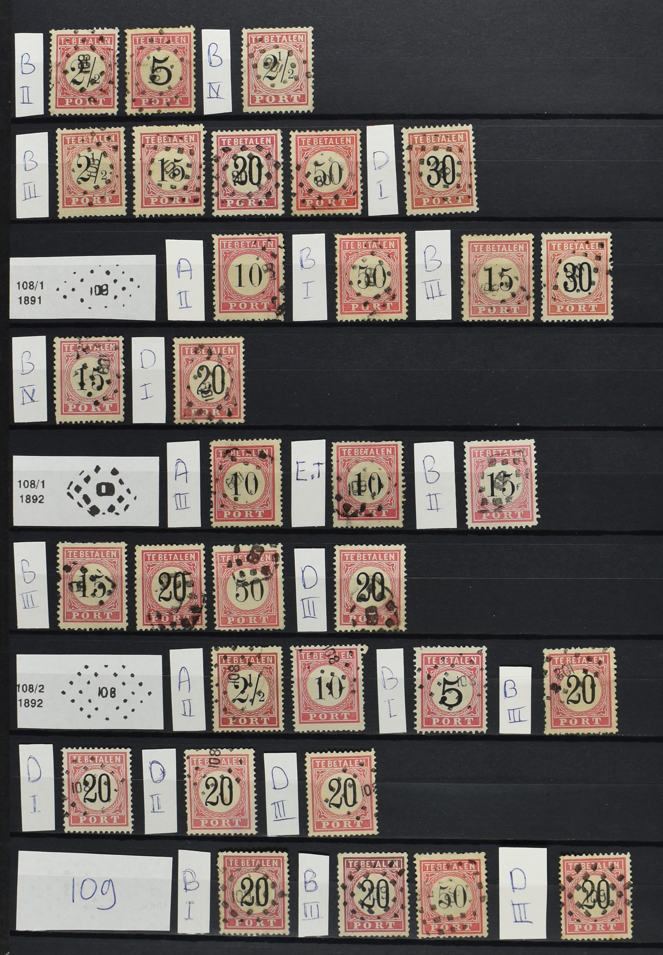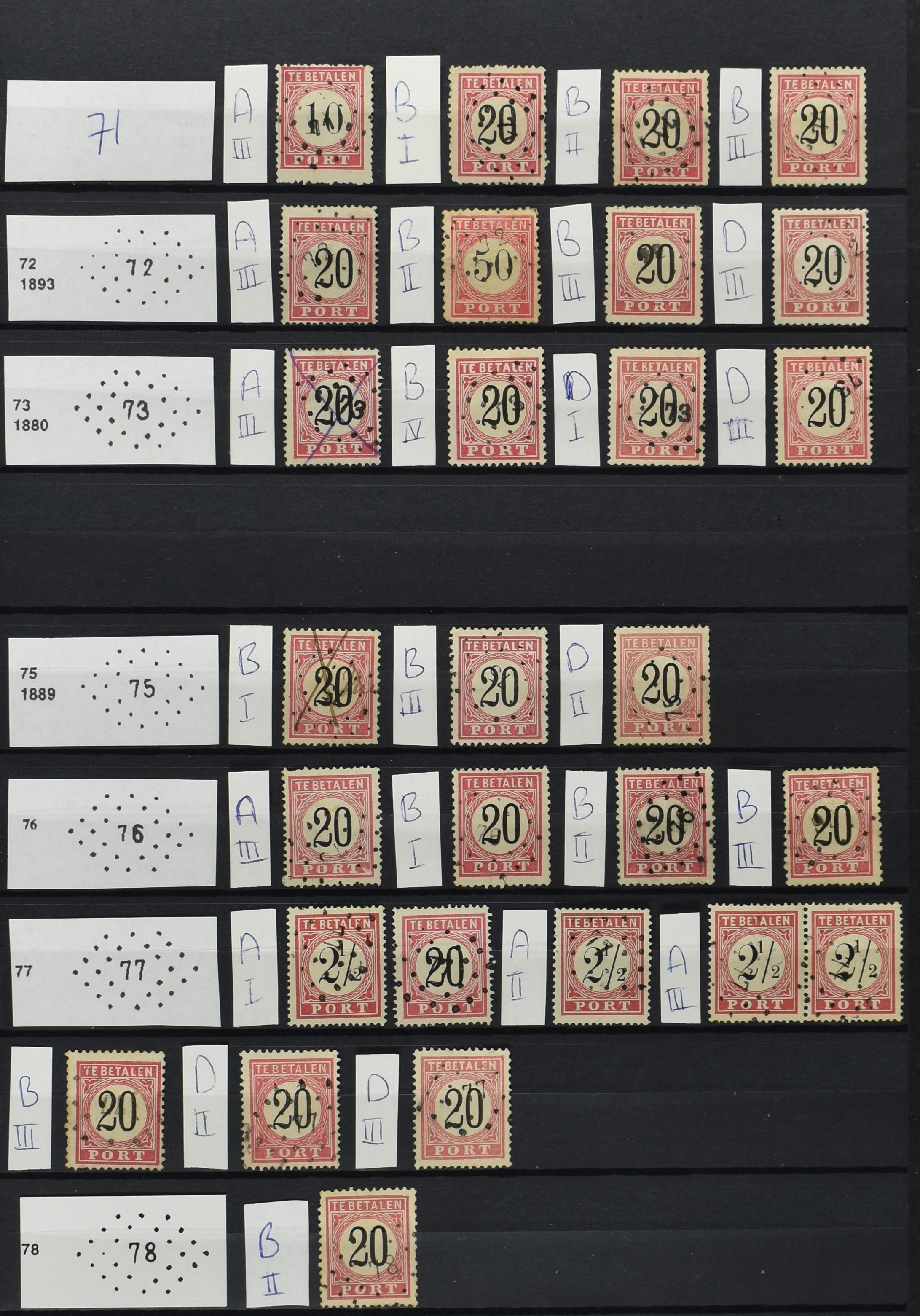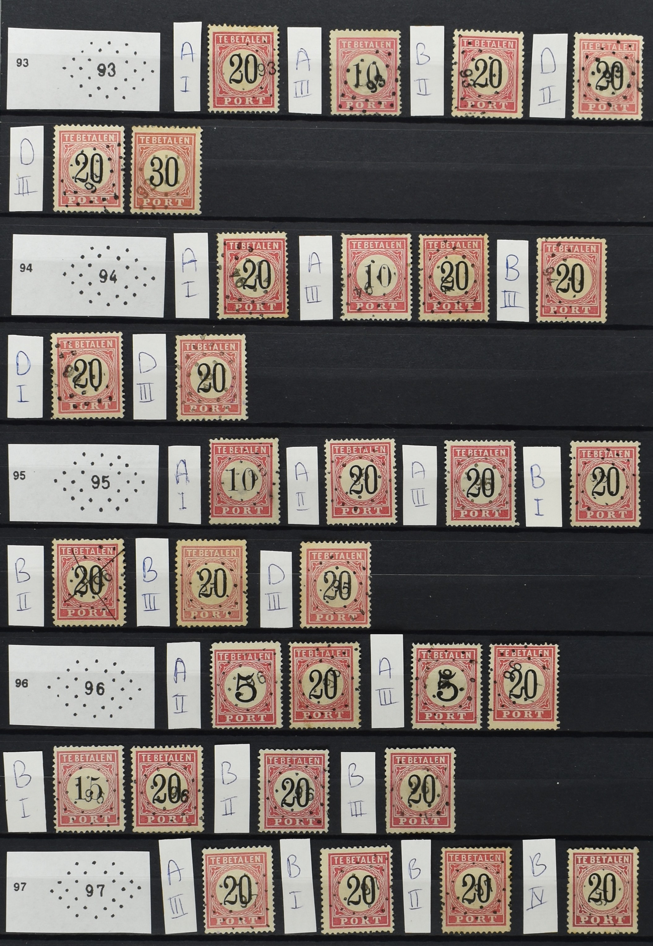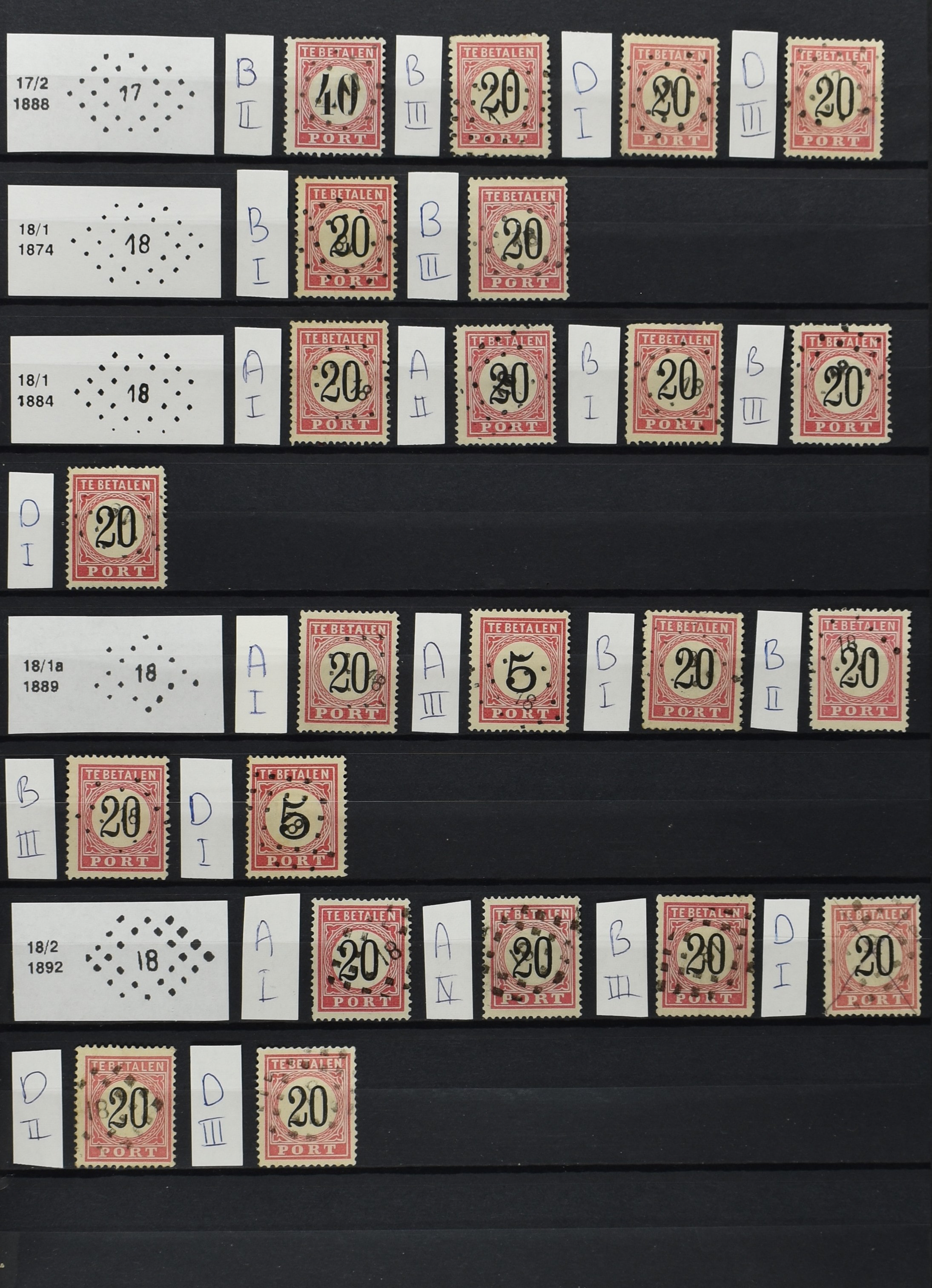 2252 imageNED.- INDIË PUNTSTEMPELS op Tweede Emissie Port 1882-88, zeer uitgebreide collectie opgezet volgens Bulterman (De Postzak nr. 153, sep. 1987), per puntstempelnummer ieder type op zo veel mogelijk verschillende waarden en bovendien in de verschillende typen en tandingen, tevens enkele plaatfouten, 40 en 105 ook in blauw, en 84, 105 en 115 ook in violet. Diverse zegels hebben ook een met de pen getrokken kruis en/of geschreven 'nietig' (= het port kon niet worden geïnd). Het geheel is in uitgezochte kwaliteit met vrijwel uitsluitend volledige afstempelingen op zegels in doorgaans prachtkwaliteit. De verzameling is overzichtelijk op nummervolgorde opgezet in 1 insteekboek. Door ons is een dergelijk uitgebreide puntstempelverzameling op deze portemissie nog niet eerder aangeboden! (Image) (Image2) (Image3) (Image4) (Image5) (Image6) (Image7) (Image8) (Image9) (Image10) (Image11) (Image12) (Image13) (Image14) (Image15) (Image16) (Image17) (Image18) (Image19) (Image20) (Image21) (Image22) (Image23) (Image24) (Image25) (Image26) (Image27) (Image28) (Image29) (Image30) (Image31) (Image32) (Image33) (Image34) (Image35) (Image36) (Image37) (Image38) (Image39) (Image40) (Image41) (All Images)