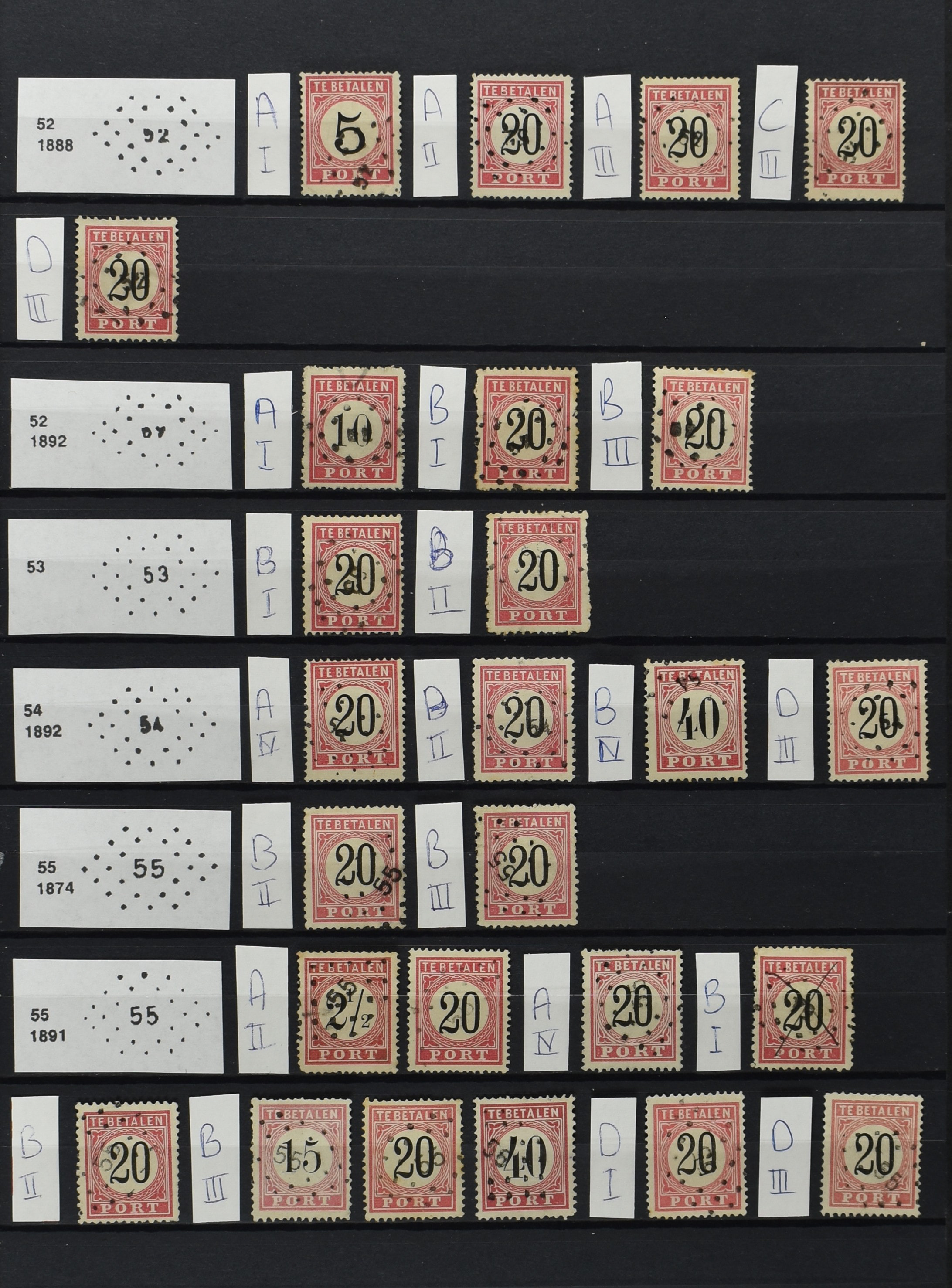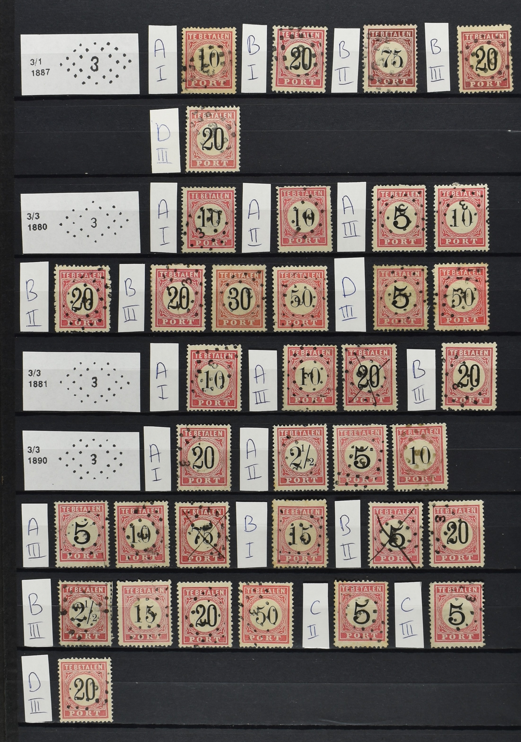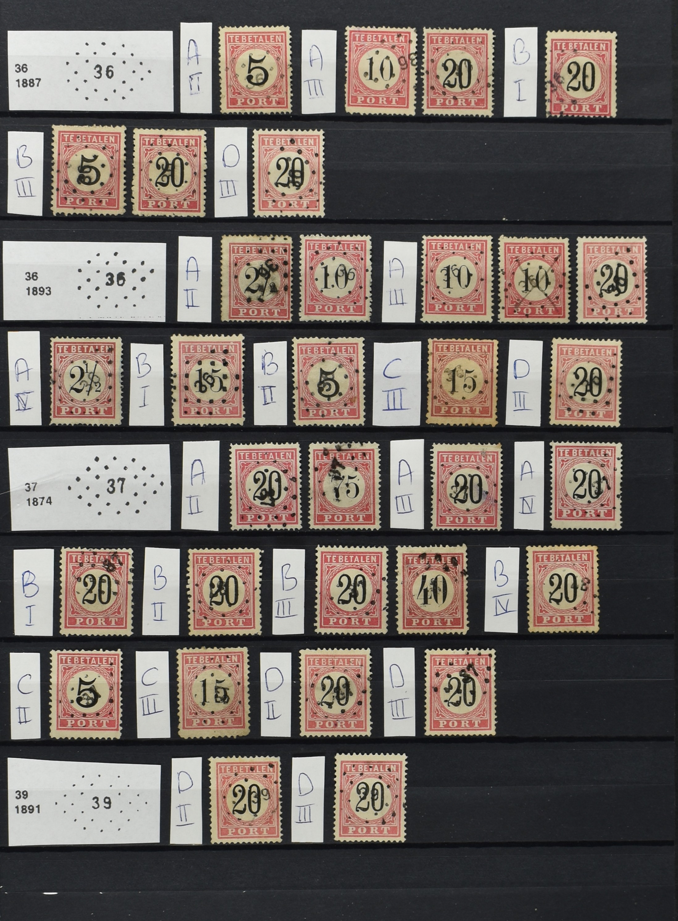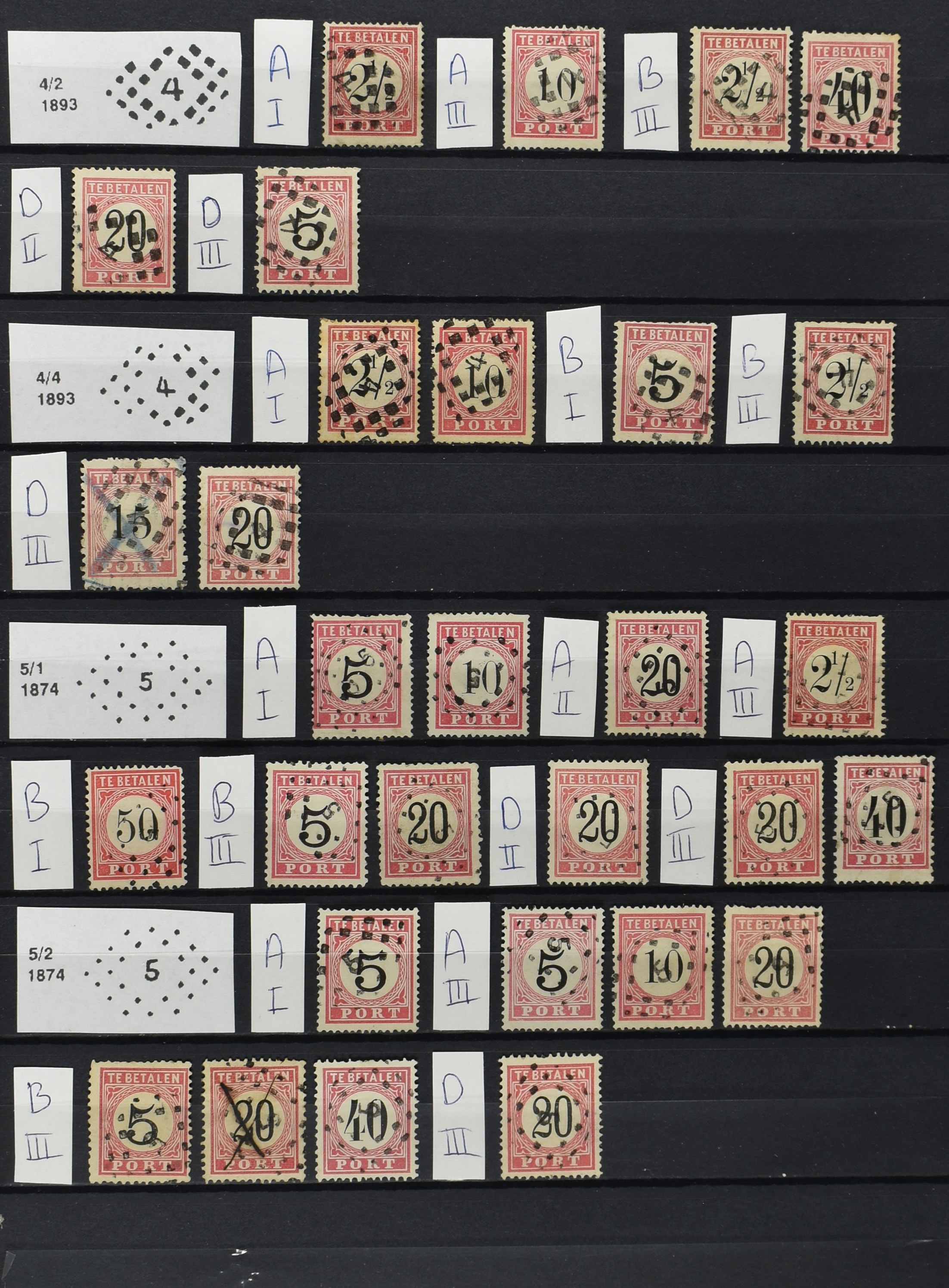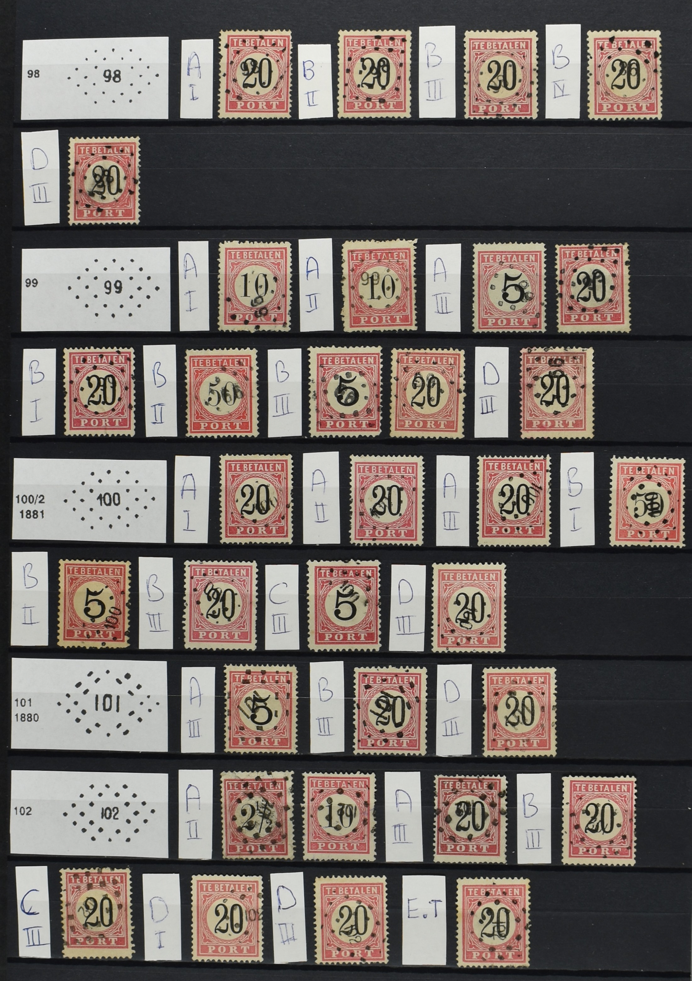 2252 imageNED.- INDIË PUNTSTEMPELS op Tweede Emissie Port 1882-88, zeer uitgebreide collectie opgezet volgens Bulterman (De Postzak nr. 153, sep. 1987), per puntstempelnummer ieder type op zo veel mogelijk verschillende waarden en bovendien in de verschillende typen en tandingen, tevens enkele plaatfouten, 40 en 105 ook in blauw, en 84, 105 en 115 ook in violet. Diverse zegels hebben ook een met de pen getrokken kruis en/of geschreven 'nietig' (= het port kon niet worden geïnd). Het geheel is in uitgezochte kwaliteit met vrijwel uitsluitend volledige afstempelingen op zegels in doorgaans prachtkwaliteit. De verzameling is overzichtelijk op nummervolgorde opgezet in 1 insteekboek. Door ons is een dergelijk uitgebreide puntstempelverzameling op deze portemissie nog niet eerder aangeboden! (Image) (Image2) (Image3) (Image4) (Image5) (Image6) (Image7) (Image8) (Image9) (Image10) (Image11) (Image12) (Image13) (Image14) (Image15) (Image16) (Image17) (Image18) (Image19) (Image20) (Image21) (Image22) (Image23) (Image24) (Image25) (Image26) (Image27) (Image28) (Image29) (Image30) (Image31) (Image32) (Image33) (Image34) (Image35) (Image36) (Image37) (Image38) (Image39) (Image40) (Image41) (All Images)