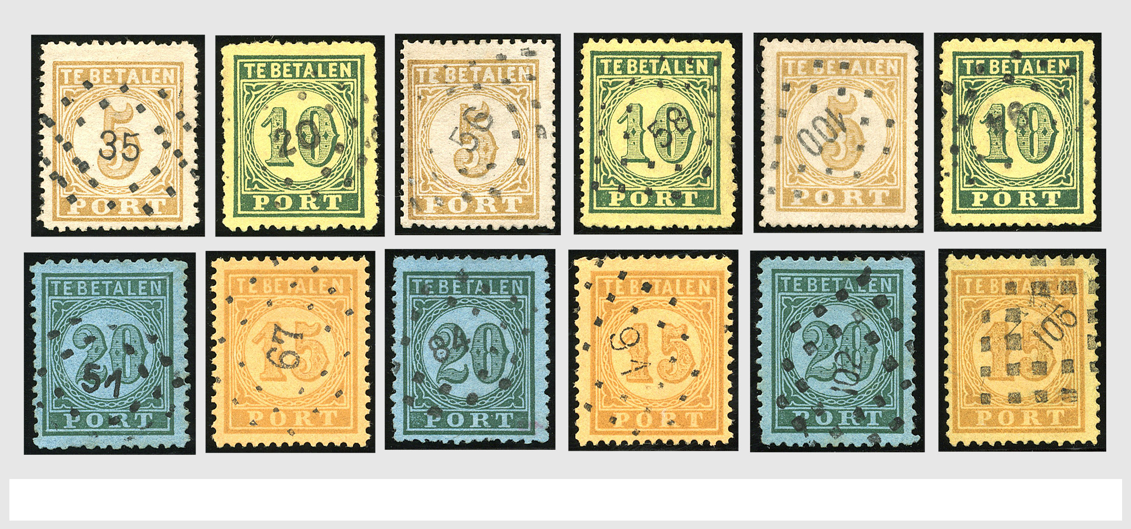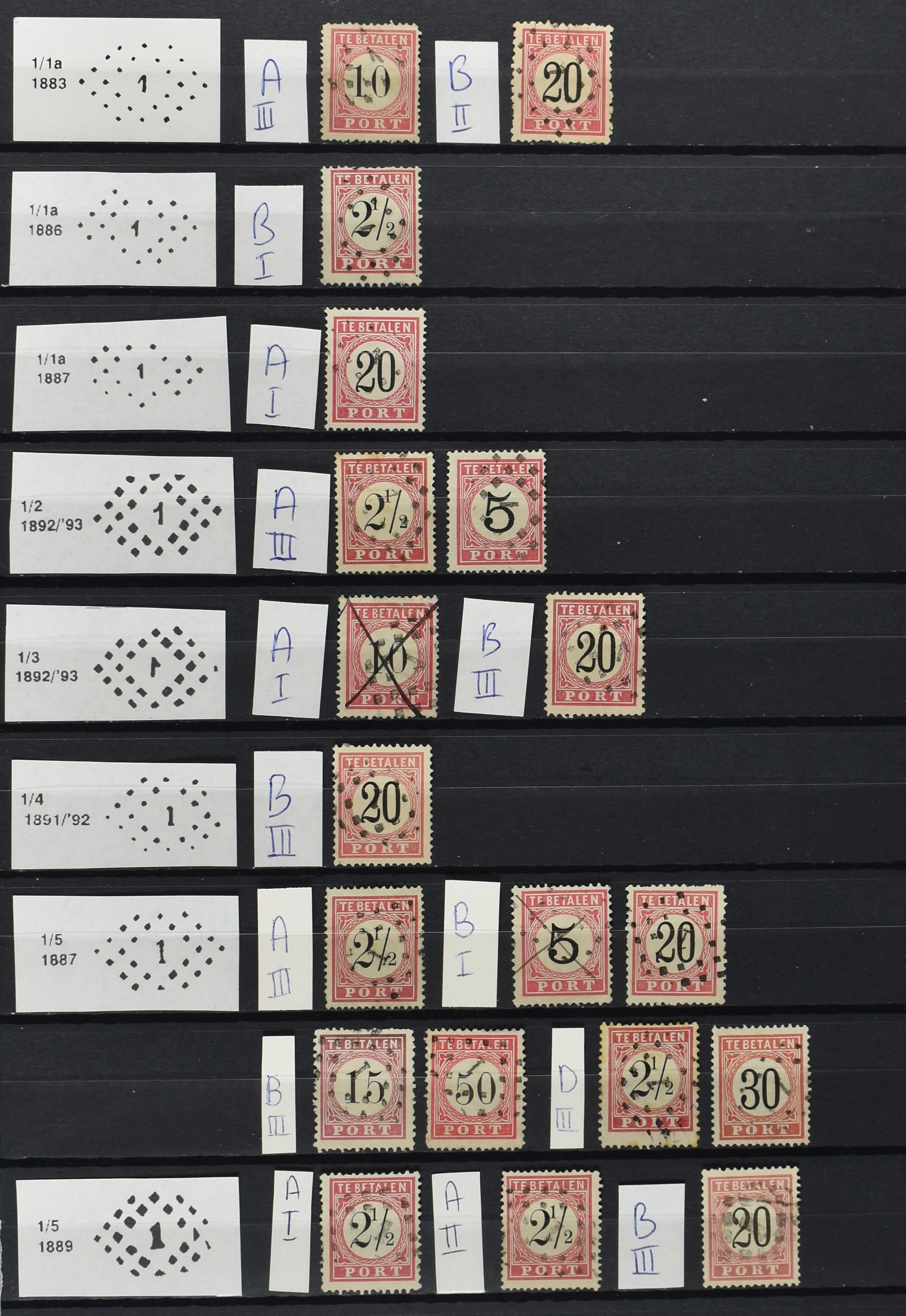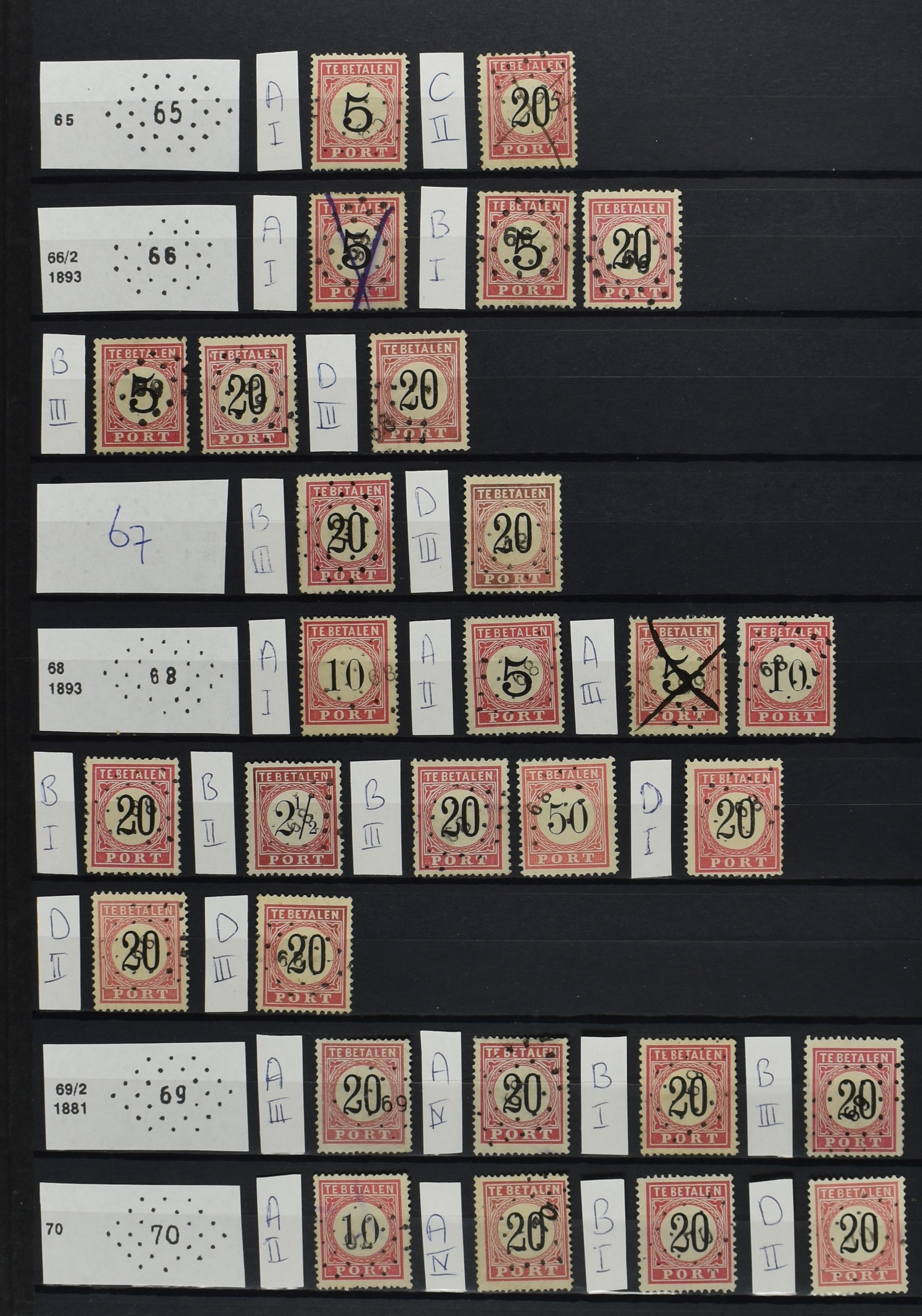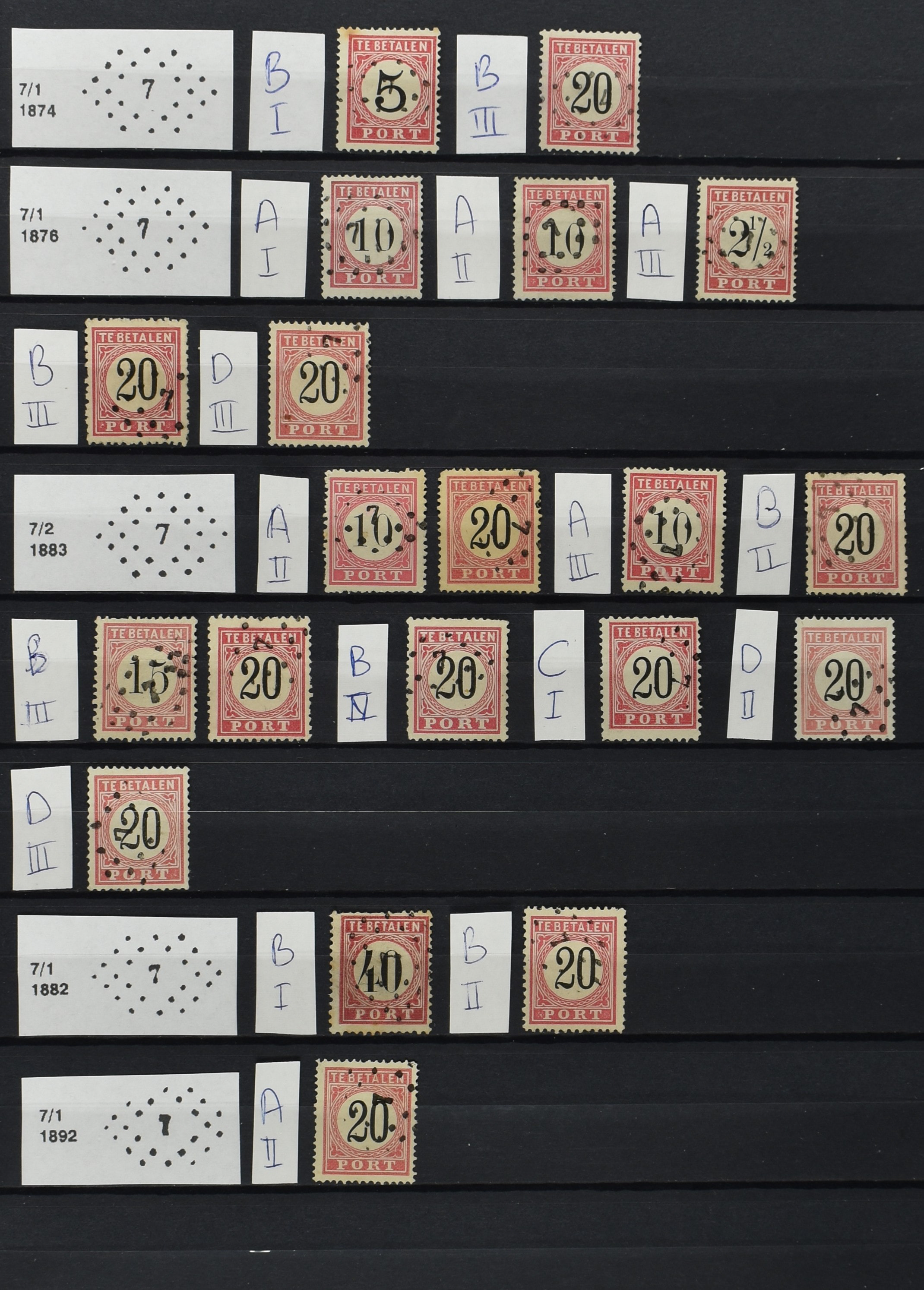 2252 imageNED.- INDIË PUNTSTEMPELS op Tweede Emissie Port 1882-88, zeer uitgebreide collectie opgezet volgens Bulterman (De Postzak nr. 153, sep. 1987), per puntstempelnummer ieder type op zo veel mogelijk verschillende waarden en bovendien in de verschillende typen en tandingen, tevens enkele plaatfouten, 40 en 105 ook in blauw, en 84, 105 en 115 ook in violet. Diverse zegels hebben ook een met de pen getrokken kruis en/of geschreven 'nietig' (= het port kon niet worden geïnd). Het geheel is in uitgezochte kwaliteit met vrijwel uitsluitend volledige afstempelingen op zegels in doorgaans prachtkwaliteit. De verzameling is overzichtelijk op nummervolgorde opgezet in 1 insteekboek. Door ons is een dergelijk uitgebreide puntstempelverzameling op deze portemissie nog niet eerder aangeboden! (Image) (Image2) (Image3) (Image4) (Image5) (Image6) (Image7) (Image8) (Image9) (Image10) (Image11) (Image12) (Image13) (Image14) (Image15) (Image16) (Image17) (Image18) (Image19) (Image20) (Image21) (Image22) (Image23) (Image24) (Image25) (Image26) (Image27) (Image28) (Image29) (Image30) (Image31) (Image32) (Image33) (Image34) (Image35) (Image36) (Image37) (Image38) (Image39) (Image40) (Image41) (All Images)