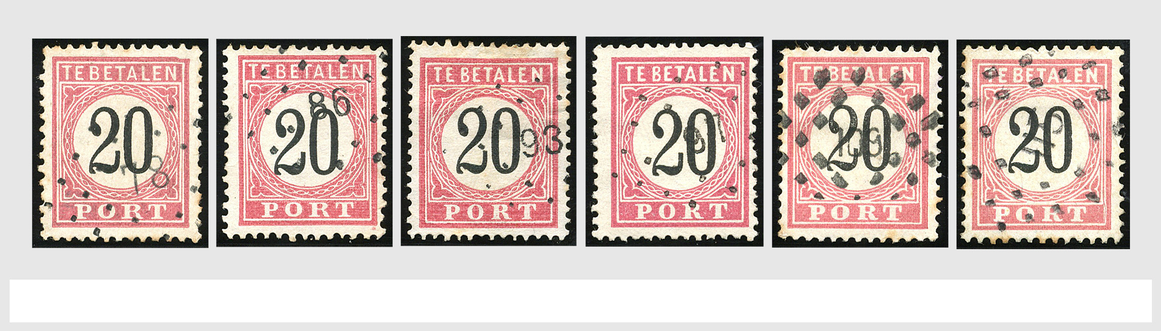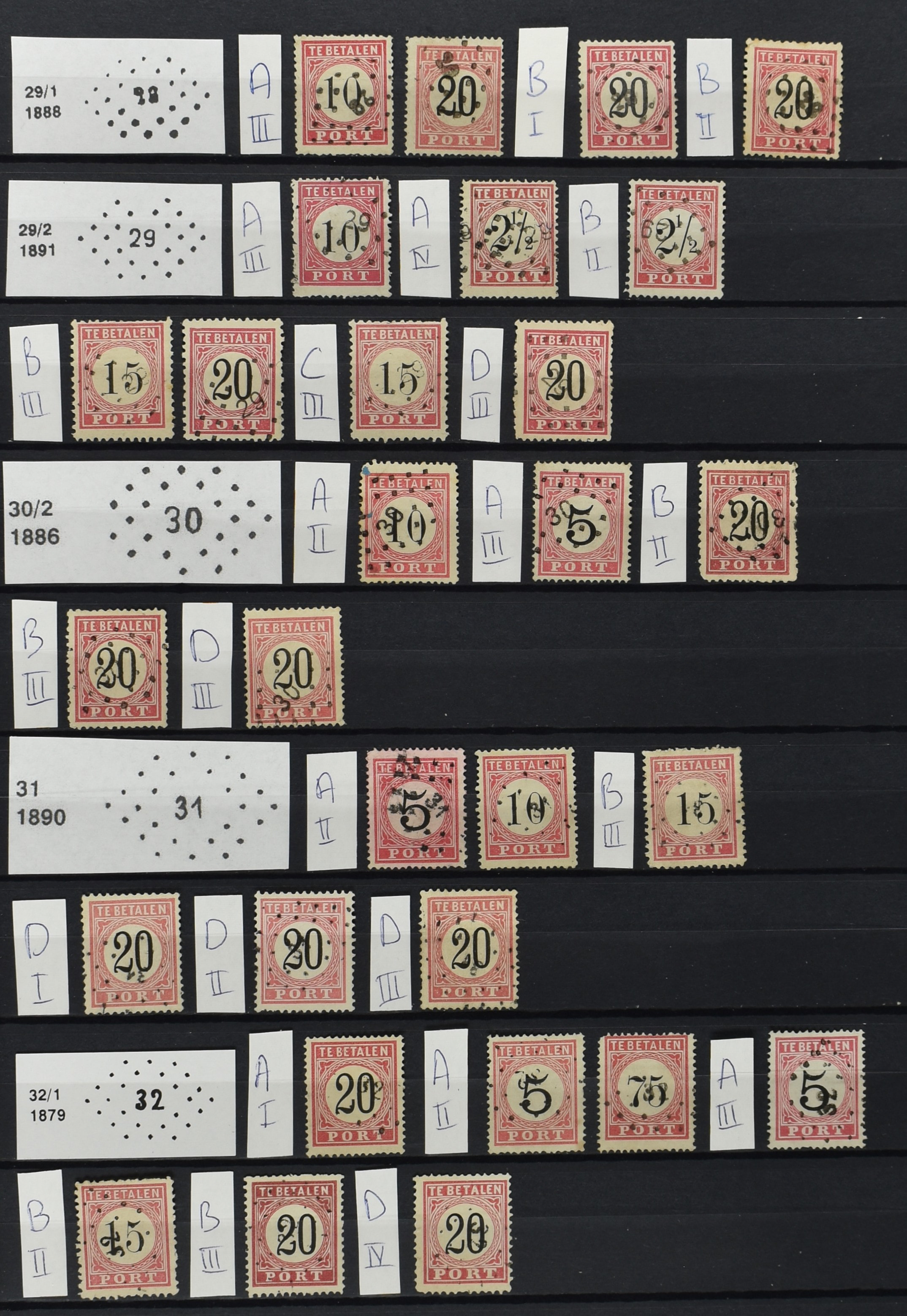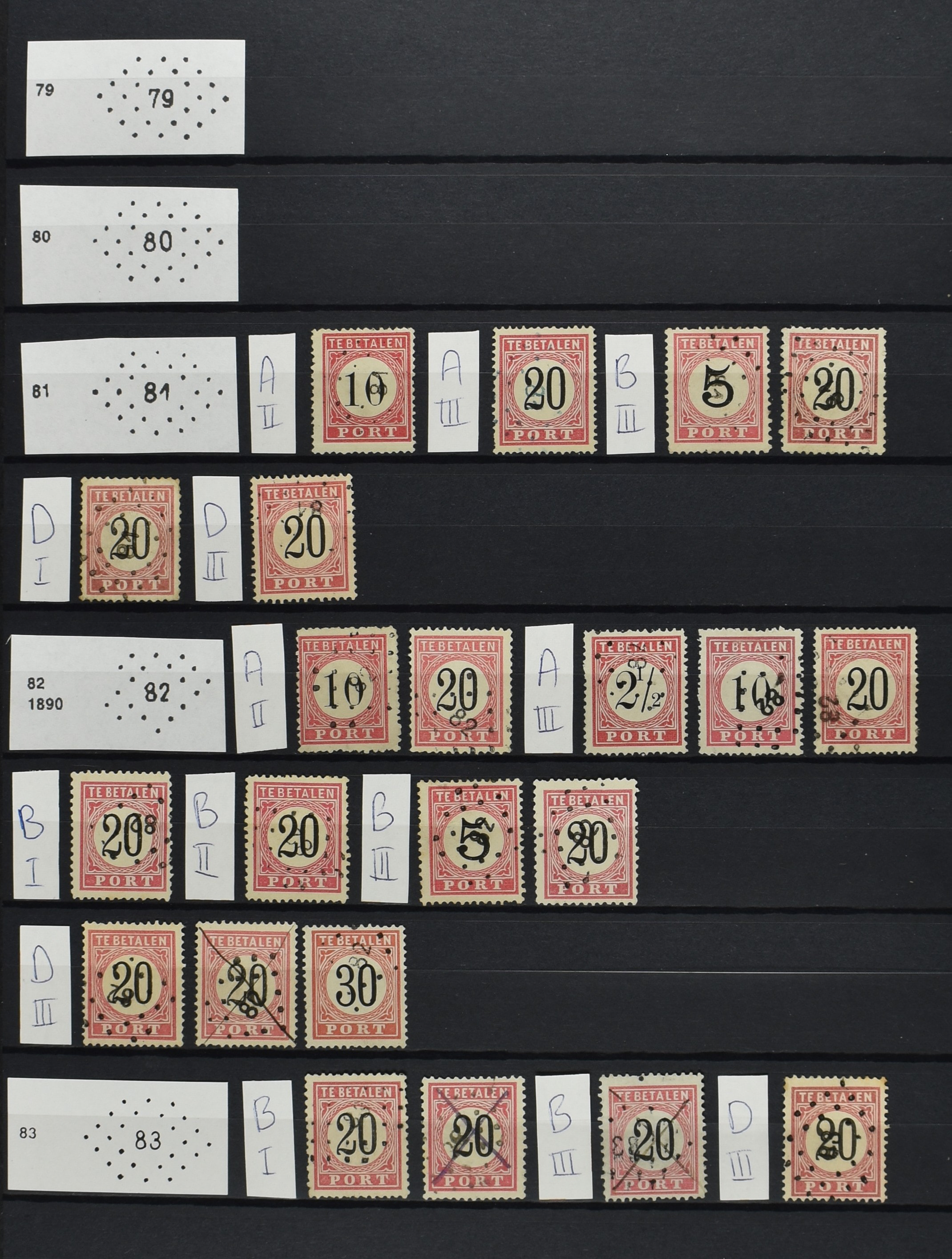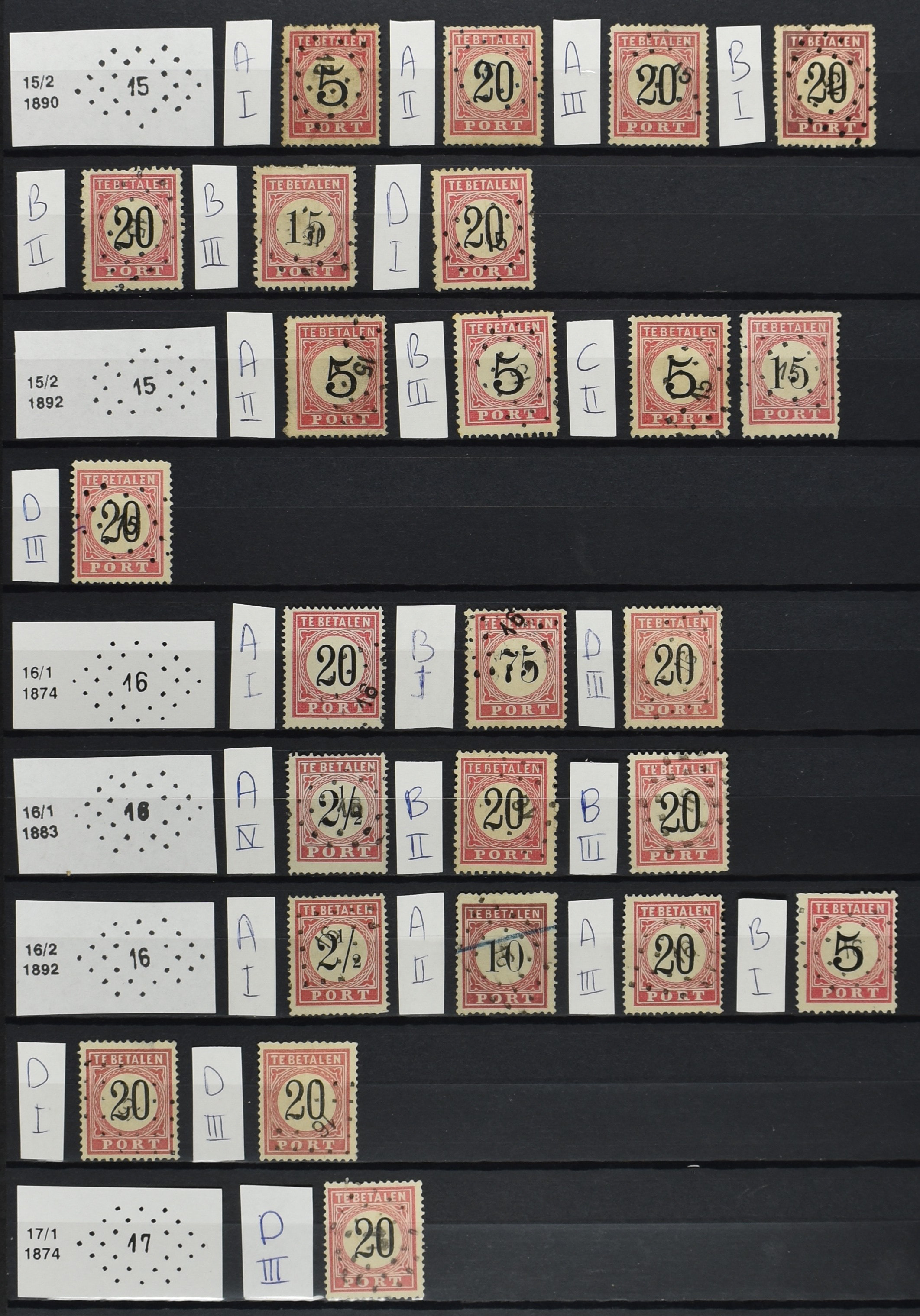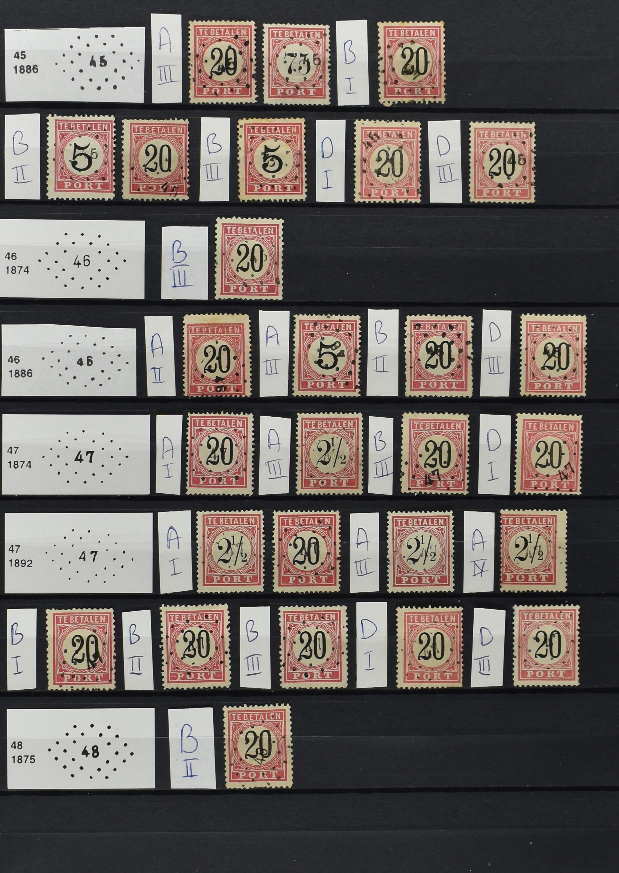 2252 imageNED.- INDIË PUNTSTEMPELS op Tweede Emissie Port 1882-88, zeer uitgebreide collectie opgezet volgens Bulterman (De Postzak nr. 153, sep. 1987), per puntstempelnummer ieder type op zo veel mogelijk verschillende waarden en bovendien in de verschillende typen en tandingen, tevens enkele plaatfouten, 40 en 105 ook in blauw, en 84, 105 en 115 ook in violet. Diverse zegels hebben ook een met de pen getrokken kruis en/of geschreven 'nietig' (= het port kon niet worden geïnd). Het geheel is in uitgezochte kwaliteit met vrijwel uitsluitend volledige afstempelingen op zegels in doorgaans prachtkwaliteit. De verzameling is overzichtelijk op nummervolgorde opgezet in 1 insteekboek. Door ons is een dergelijk uitgebreide puntstempelverzameling op deze portemissie nog niet eerder aangeboden! (Image) (Image2) (Image3) (Image4) (Image5) (Image6) (Image7) (Image8) (Image9) (Image10) (Image11) (Image12) (Image13) (Image14) (Image15) (Image16) (Image17) (Image18) (Image19) (Image20) (Image21) (Image22) (Image23) (Image24) (Image25) (Image26) (Image27) (Image28) (Image29) (Image30) (Image31) (Image32) (Image33) (Image34) (Image35) (Image36) (Image37) (Image38) (Image39) (Image40) (Image41) (All Images)