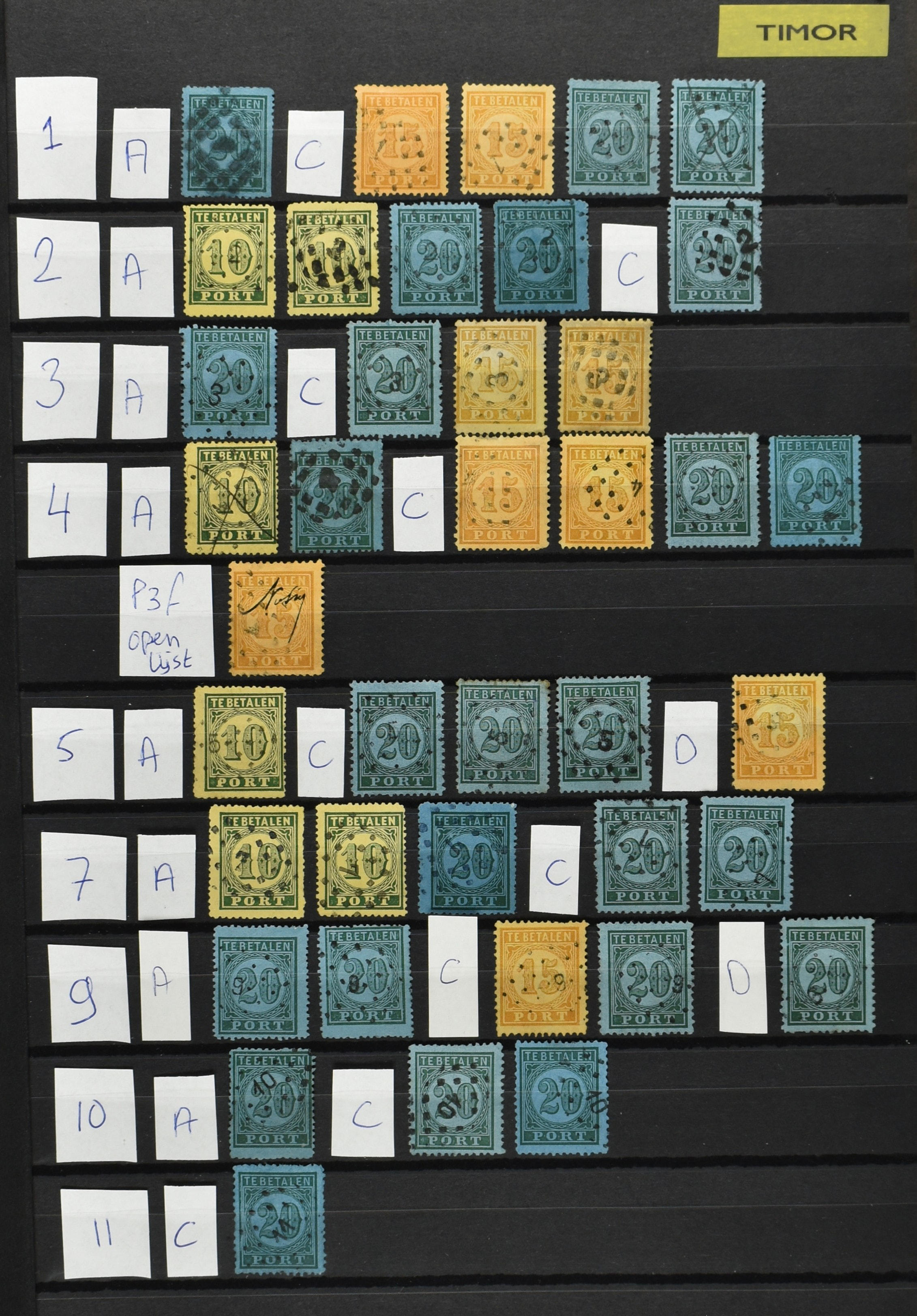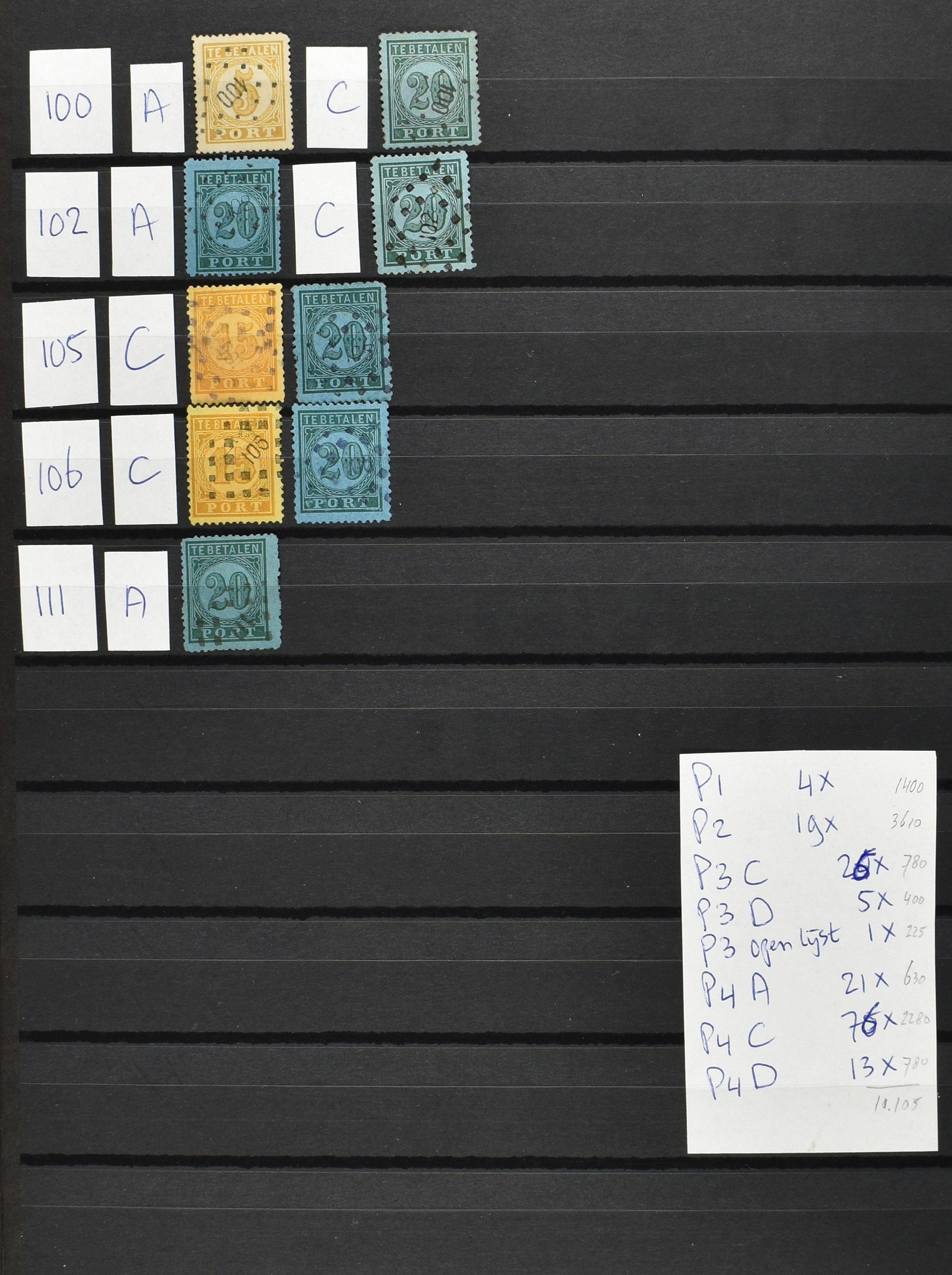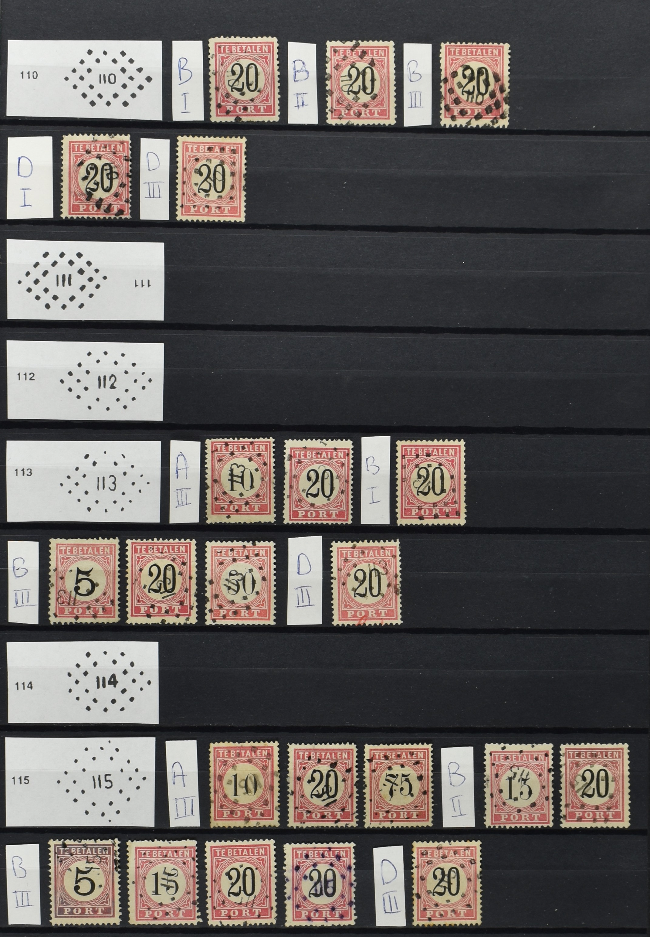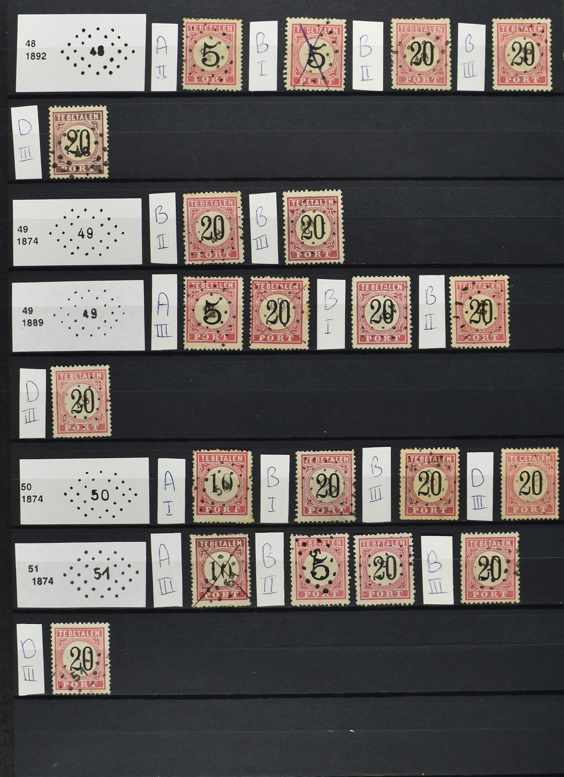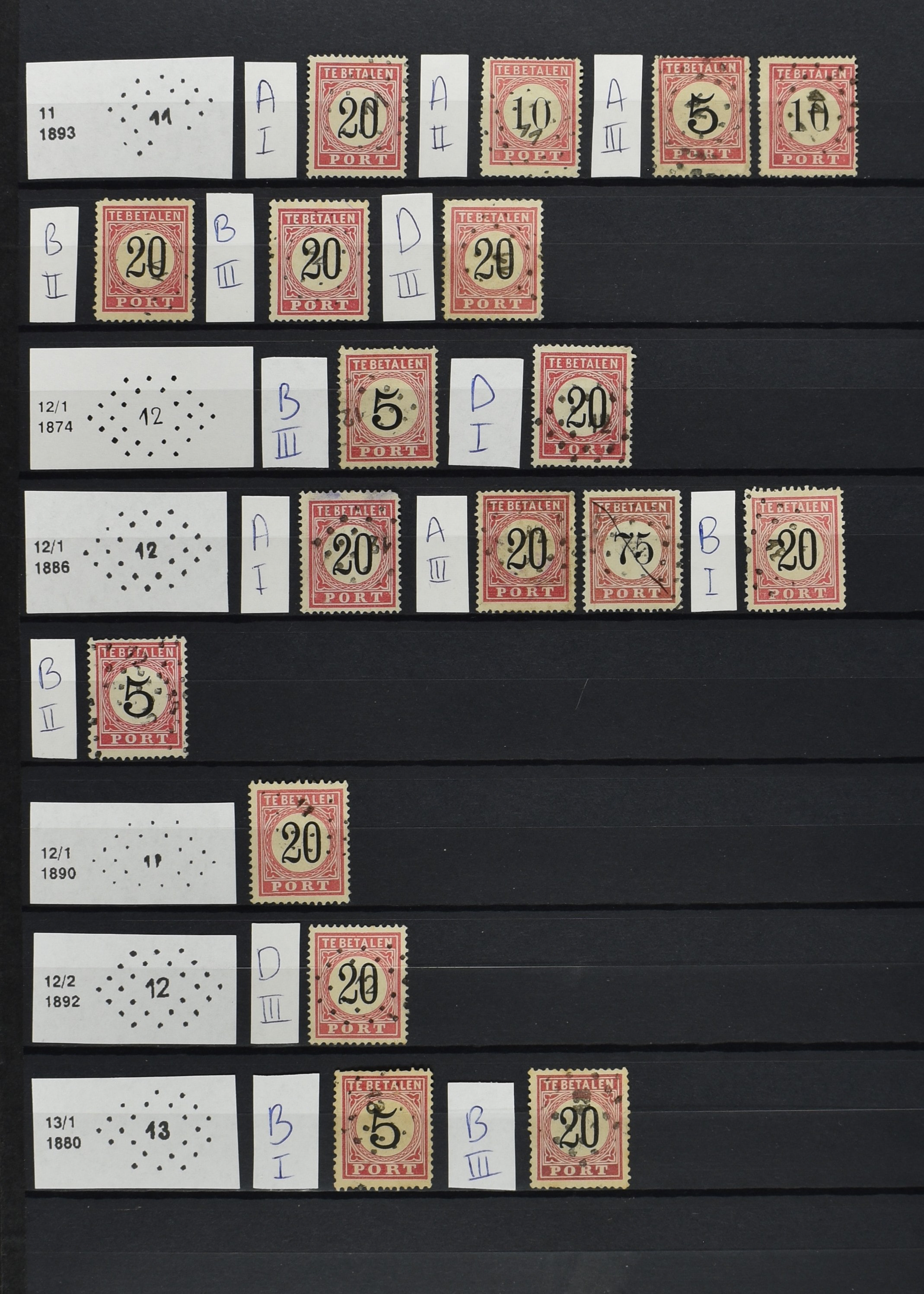 2251 imageNED.- INDIË PUNTSTEMPELS op Eerste Emissie Port 1874-75, zeer uitgebreide collectie opgezet per puntstempelnummer tussen de nummers 1 t/m 111 op zo veel mogelijk verschillende waarden en bovendien in de verschillende tandingen, 7 ook in blauw en 106 ook in violet, het geheel in uitgezochte kwaliteit met vrijwel uitsluitend volledige afstempelingen op zegels in doorgaans prachtkwaliteit. Enkele zegels hebben ook een met de pen getrokken kruis of geschreven 'nietig' (= het port kon niet worden geïnd). Volgens opgave van de inzender telt de verzameling 4x P1, 19x P2, 26x P3C, 5x P3D, 1x P3f = open lijst, 21x P4A, 76x P4C en 13x P4D met een totale cat. waarde van ruim € 10.000. Daarbij is de puntstempelwaarde dus niet meegerekend. De verzameling is overzichtelijk op nummervolgorde opgezet in 1 insteekboek. Prachtverzameling! (Image) (Image2) (Image3) (Image4) (Image5) (Image6) (Image7) (Image8) (Image9) (Image10) (All Images)