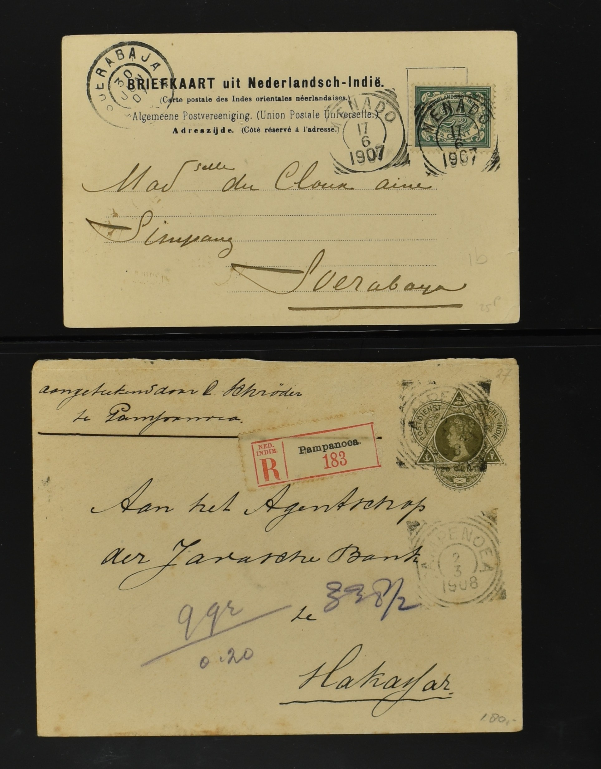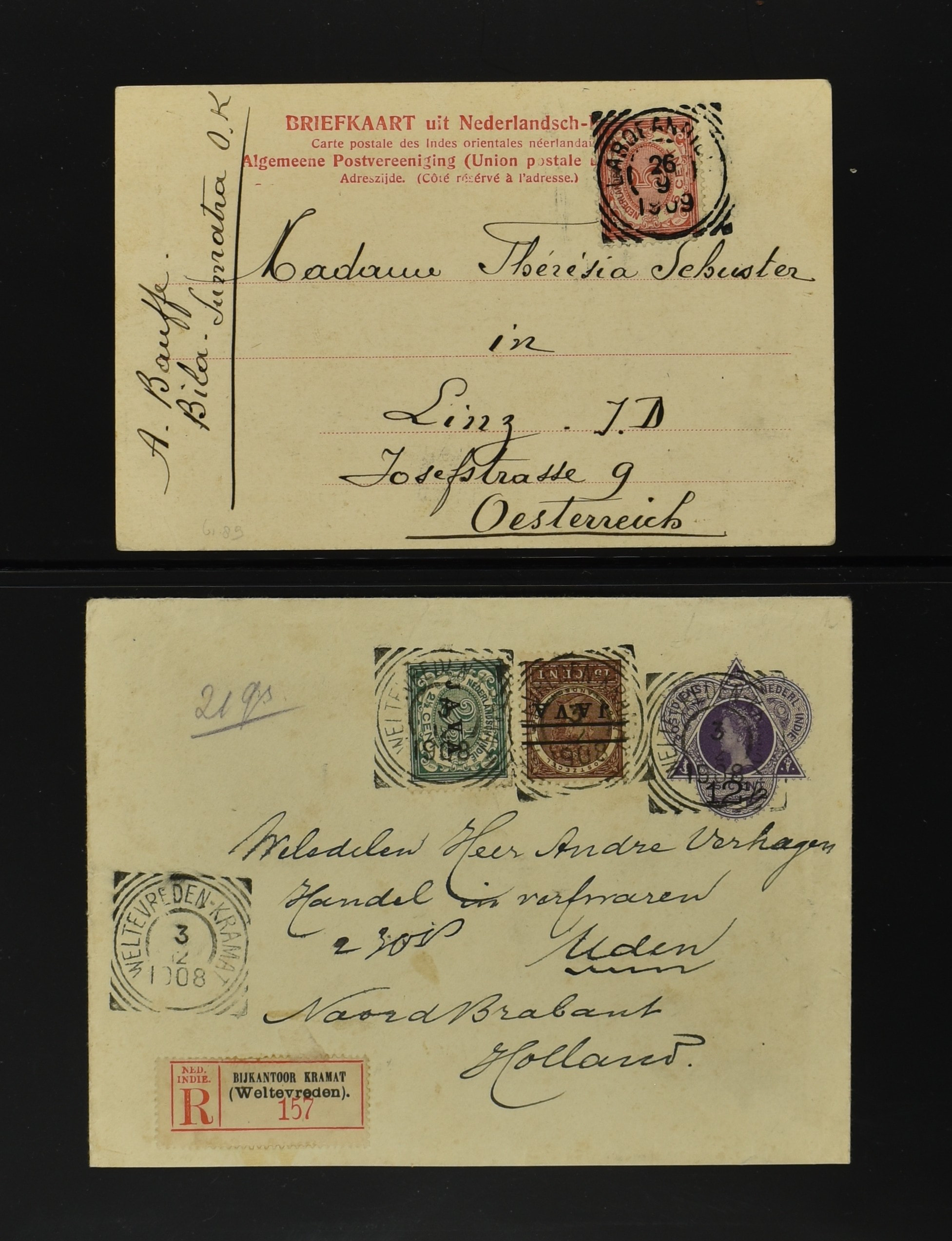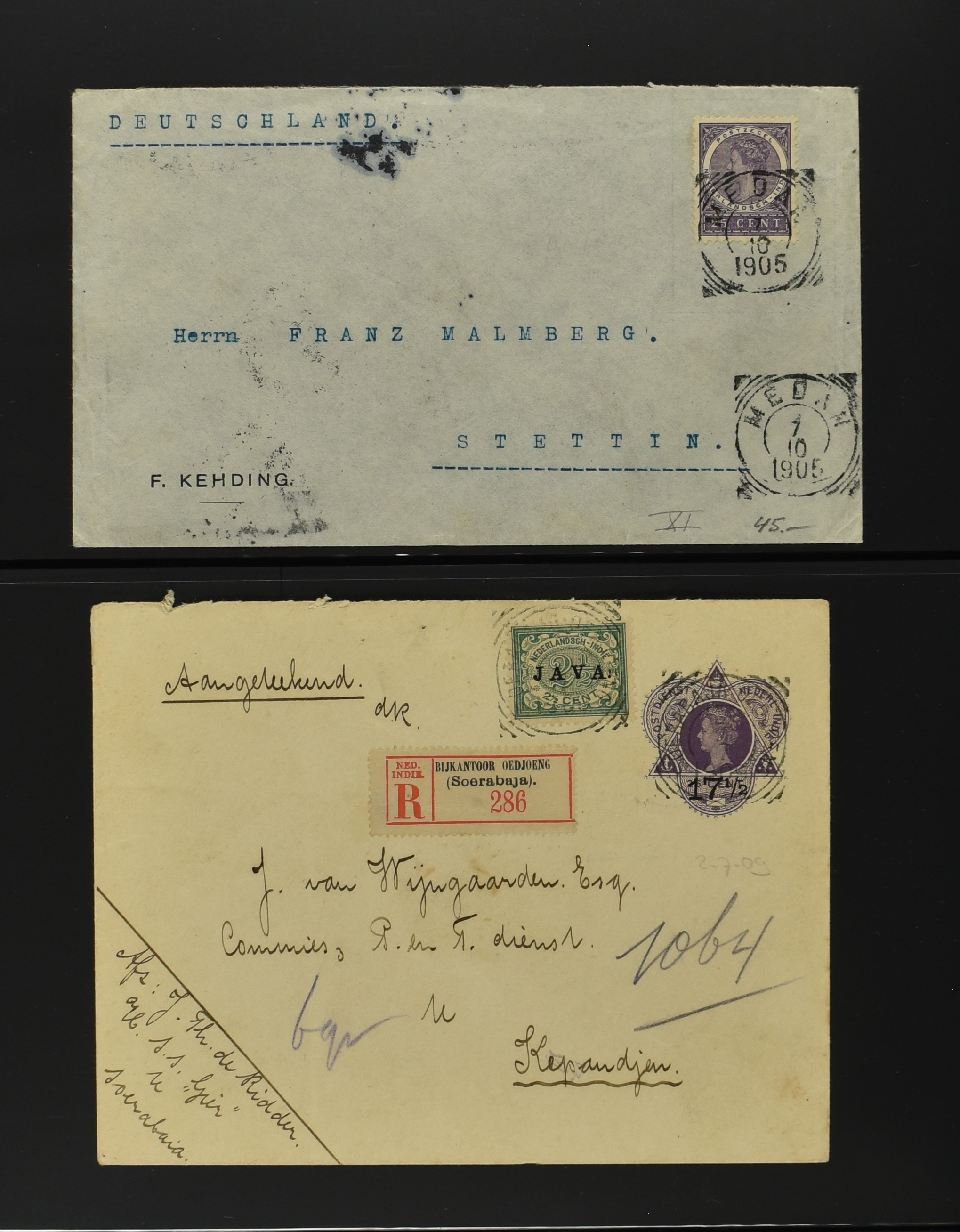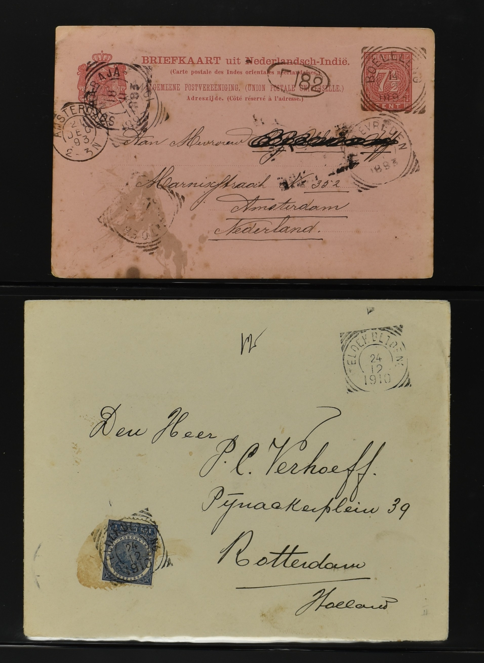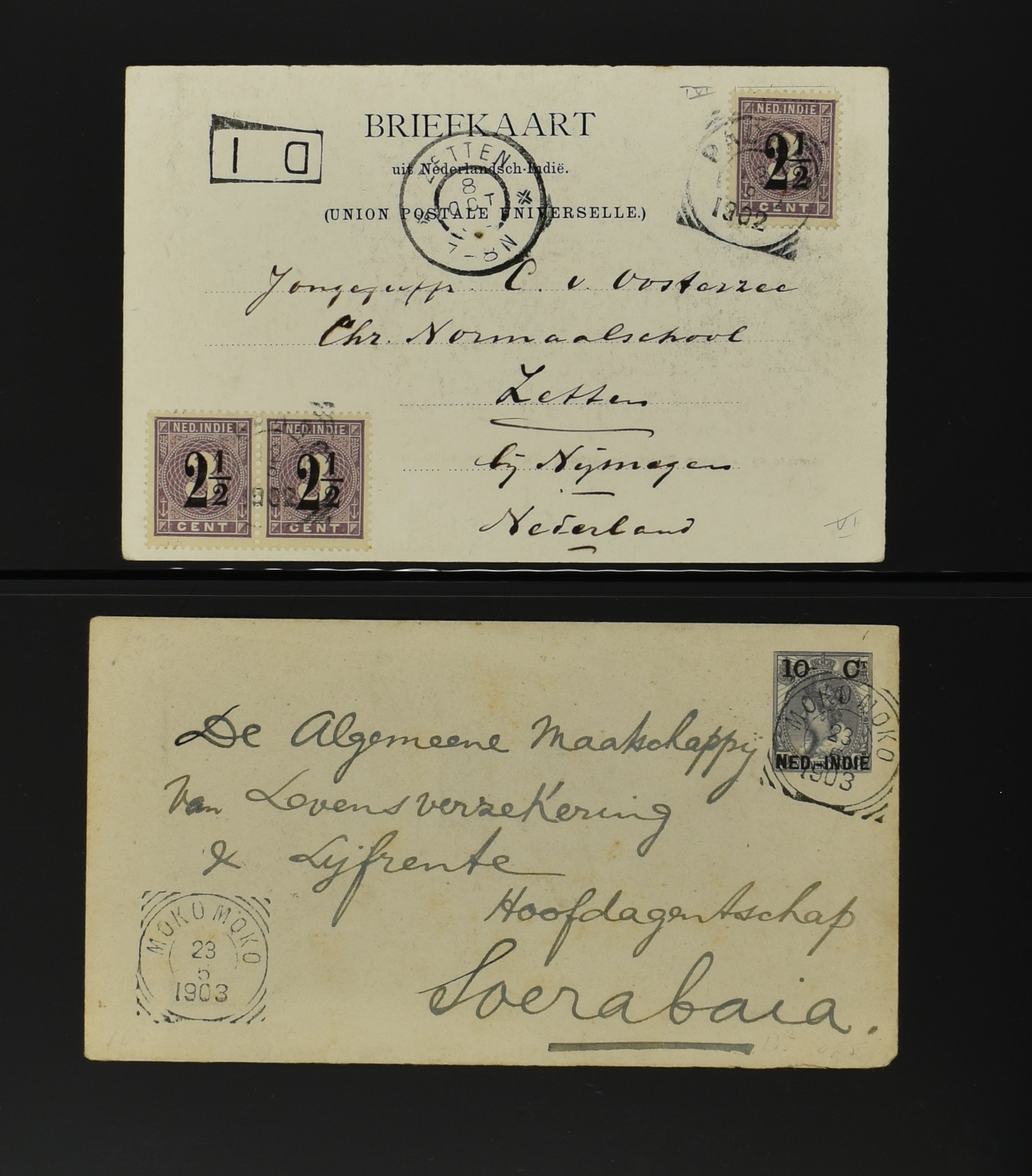 2256 imageNED.- INDIË POSTHISTORIE VIERKANTSTEMPELS, 89 poststukken waarvan 17 aangetekend, van diverse kantoren w.o. schaarse en zeldzame zoals Bajoenglentjir, Indragiri, Mokomoko. Laboeanbilik, Lhoseumawe, Loeboepakam, Lombok (op bk. met interessante tekst), Pampenoea (R-brief), Paree, Poeloeraija (blauw), Sanoer (vz.), Selatpandjang, Semarang-Karangtoeri (op R-brief), Soerabaja-Oedjoeng (o.a. op R-brief), Stagen, Tapan (6-7-1903 als veldpost), Weltevreden-Kramat etc. in Davo-ringband (Image) (Image2) (Image3) (Image4) (Image5) (Image6) (Image7) (Image8) (Image9) (Image10) (Image11) (Image12) (Image13) (Image14) (Image15) (Image16) (Image17) (Image18) (Image19) (Image20) (Image21) (Image22) (Image23) (Image24) (Image25) (Image26) (Image27) (Image28) (Image29) (Image30) (Image31) (Image32) (Image33) (Image34) (Image35) (Image36) (Image37) (Image38) (Image39) (Image40) (Image41) (Image42) (Image43) (Image44) (Image45) (Image46) (All Images)