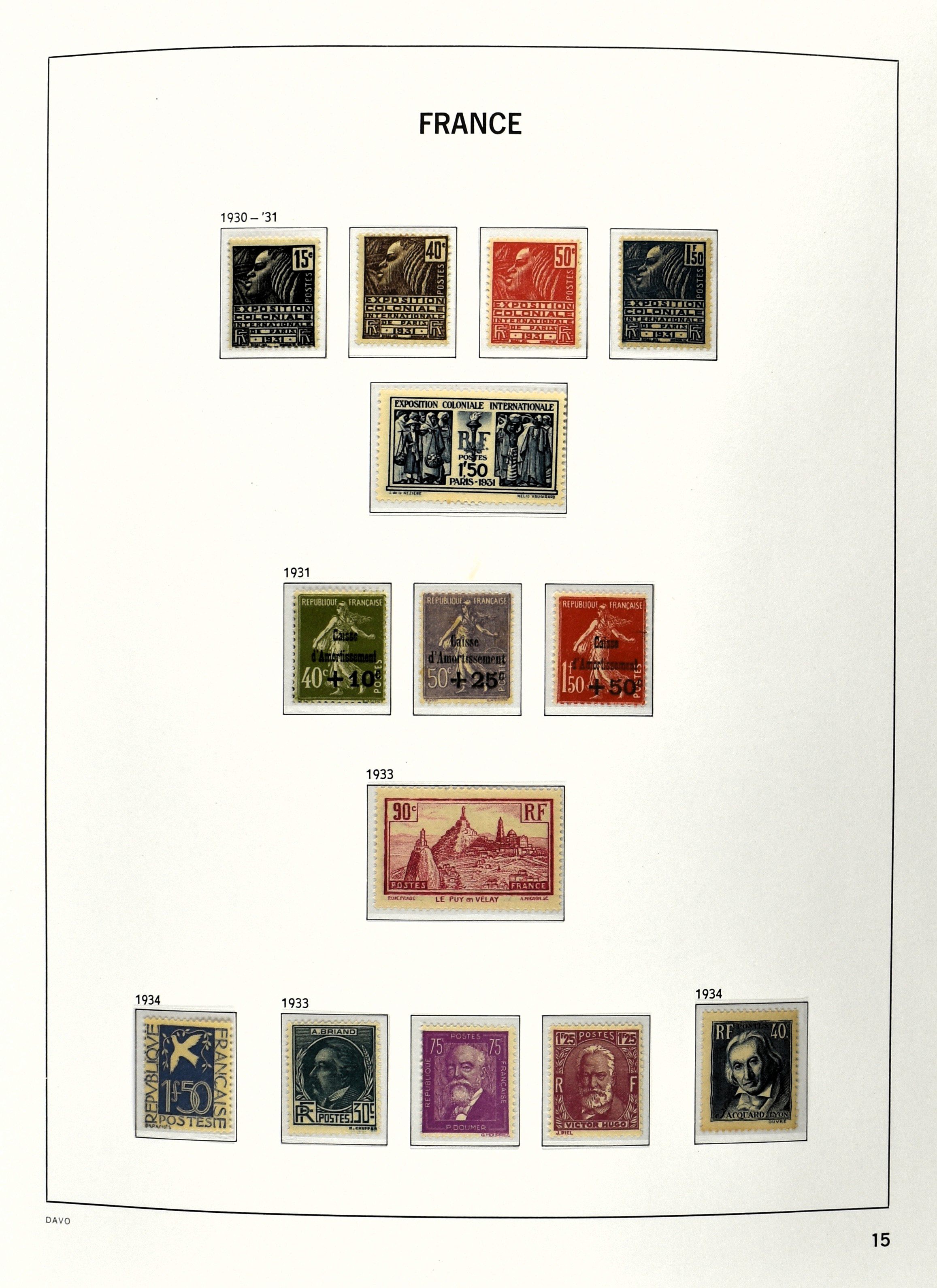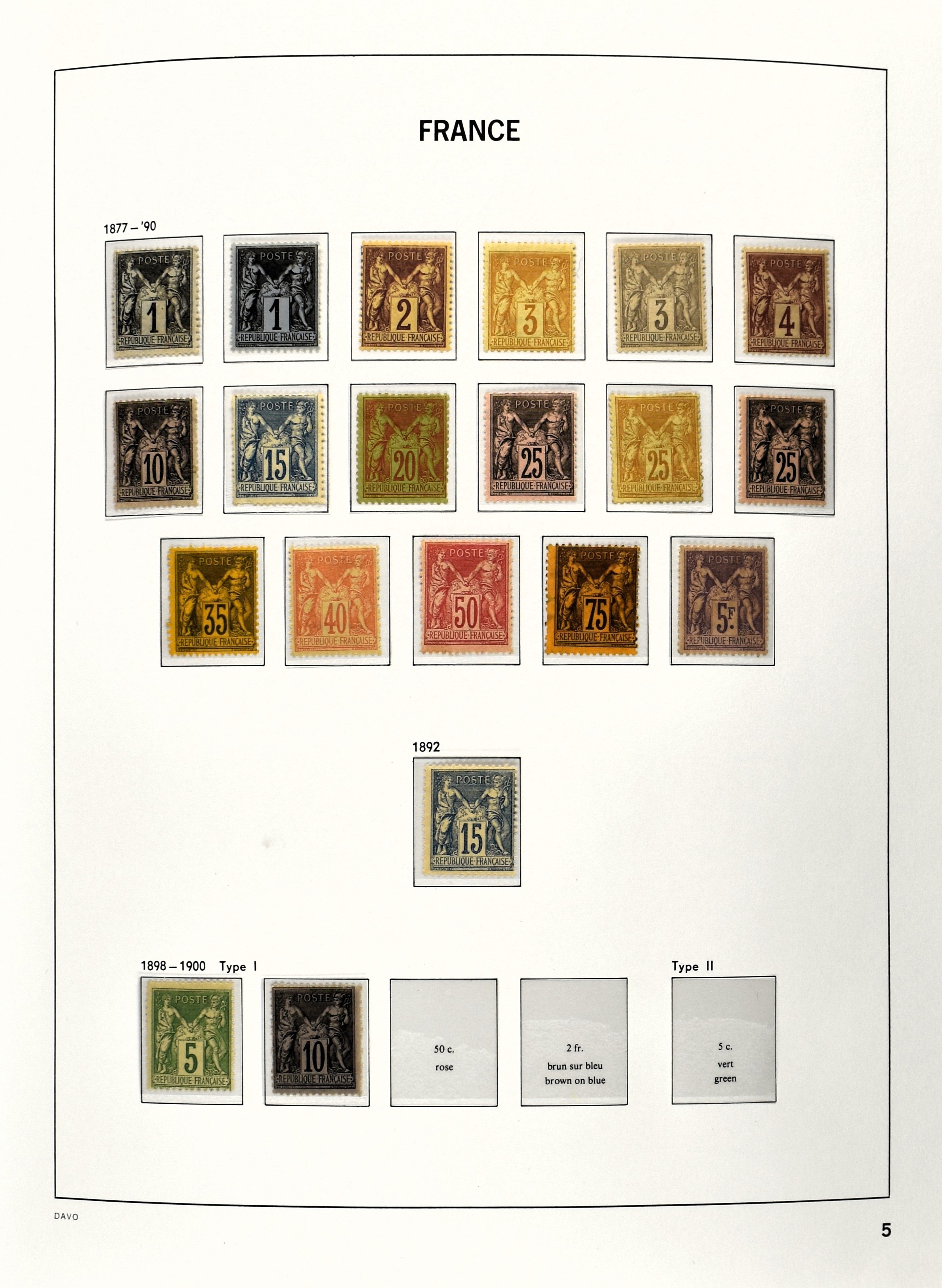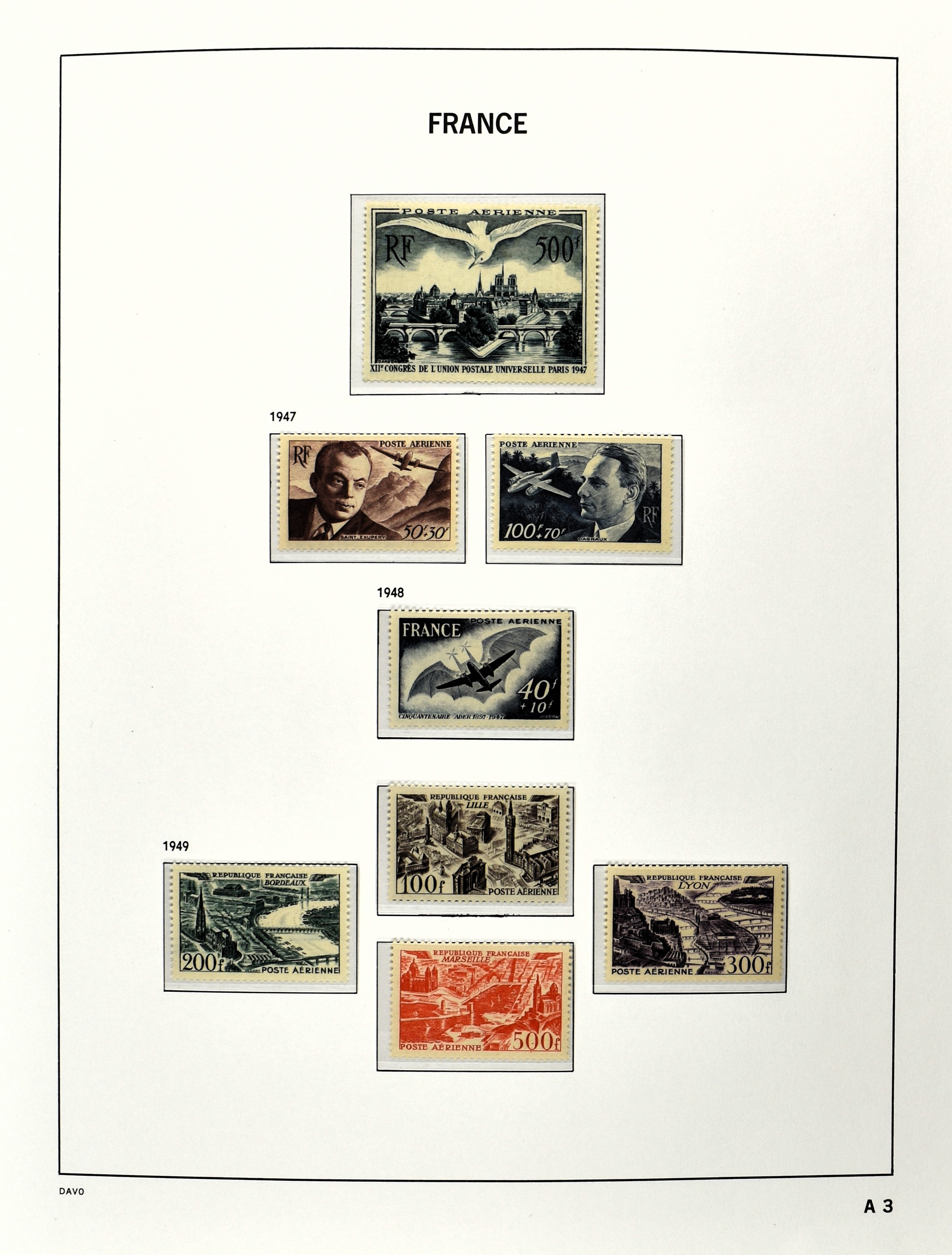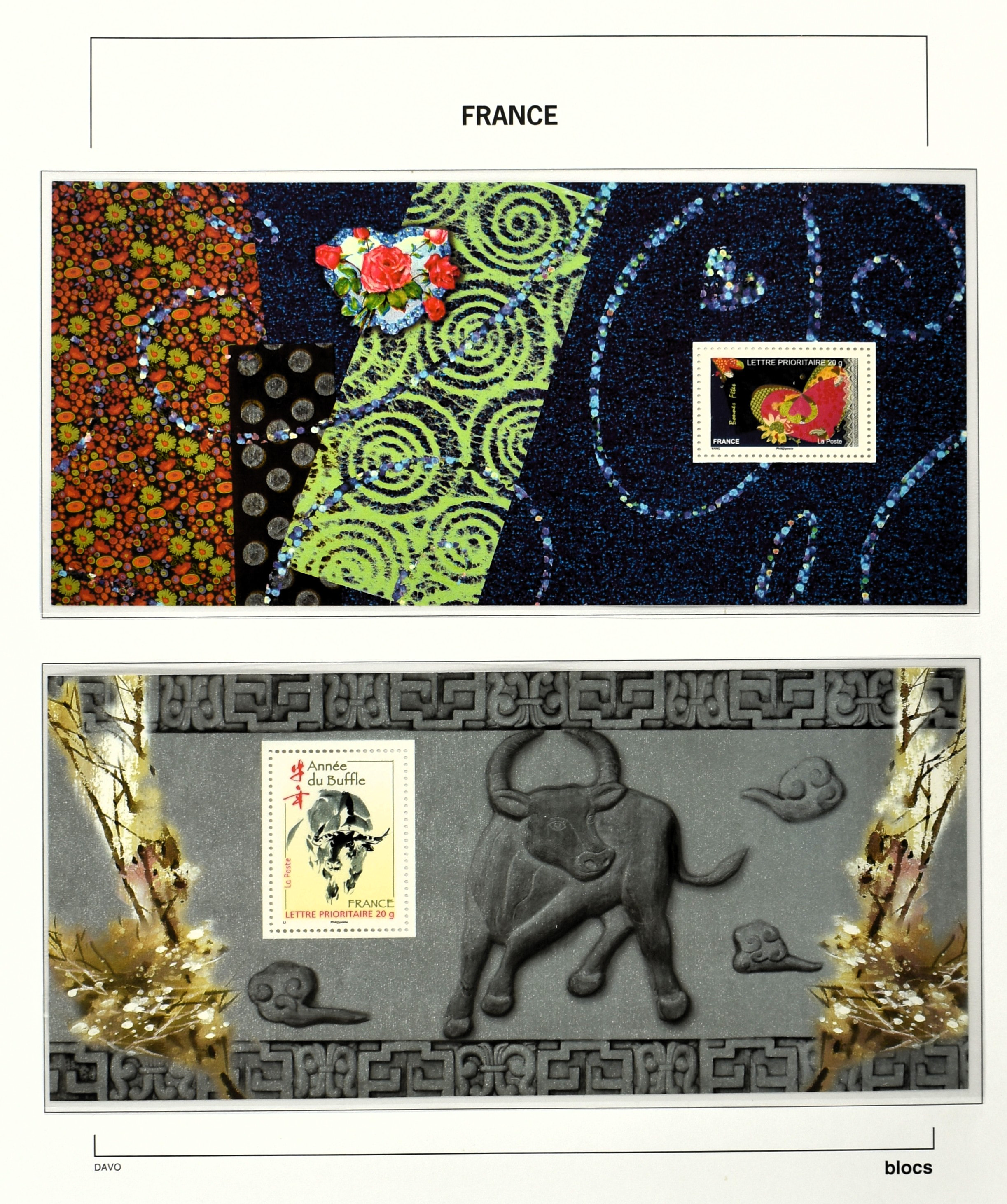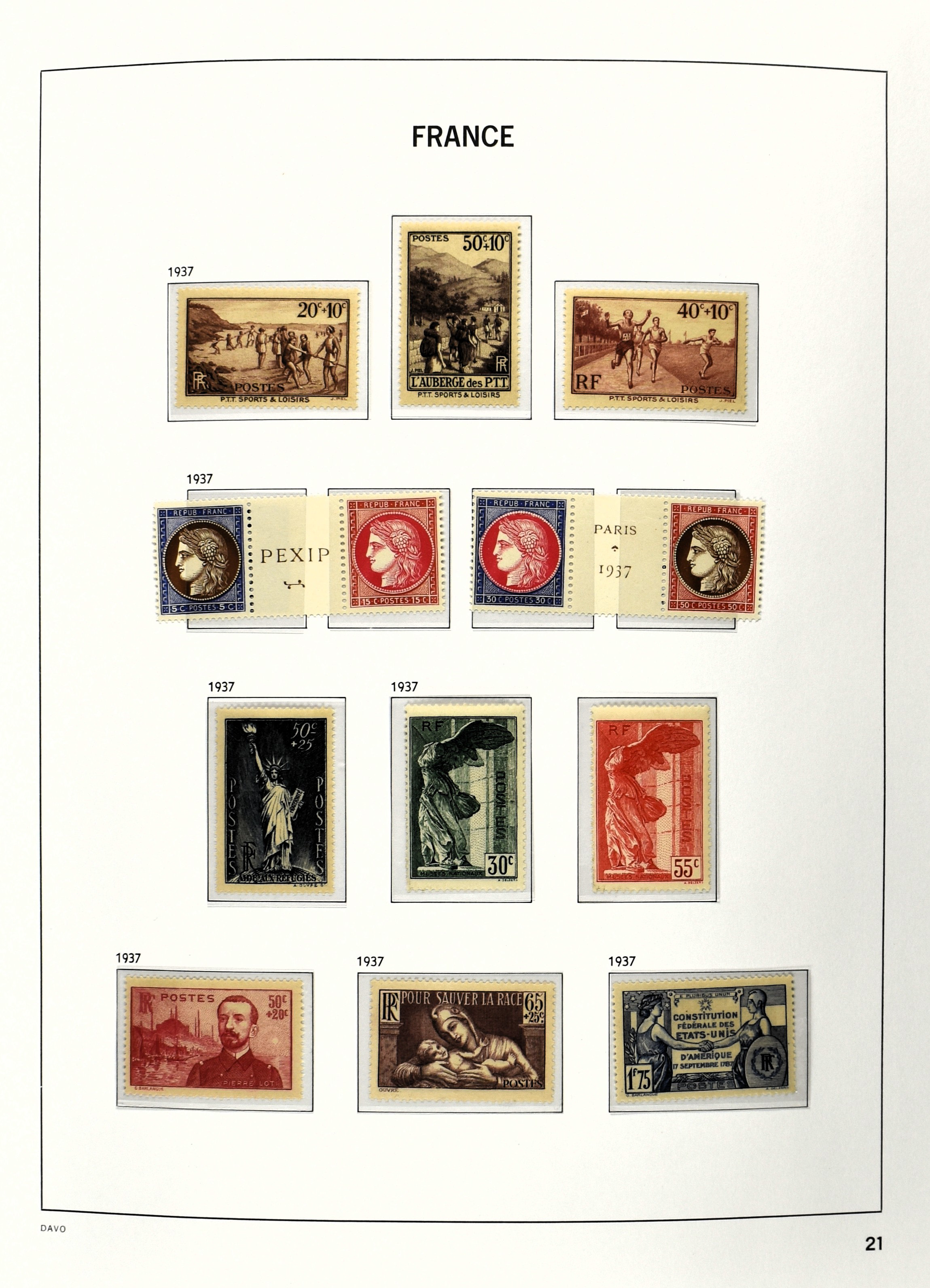 FRANCE 1877-2009, */** collection in 5 Davo albums with several good numbers and sets a.o.: Yv 249/51, 252, 253/55, 256, block 3, A29, A30/33 and several more, the modern part including, blocks, m/s, s/s and face value (Image) (Image2)