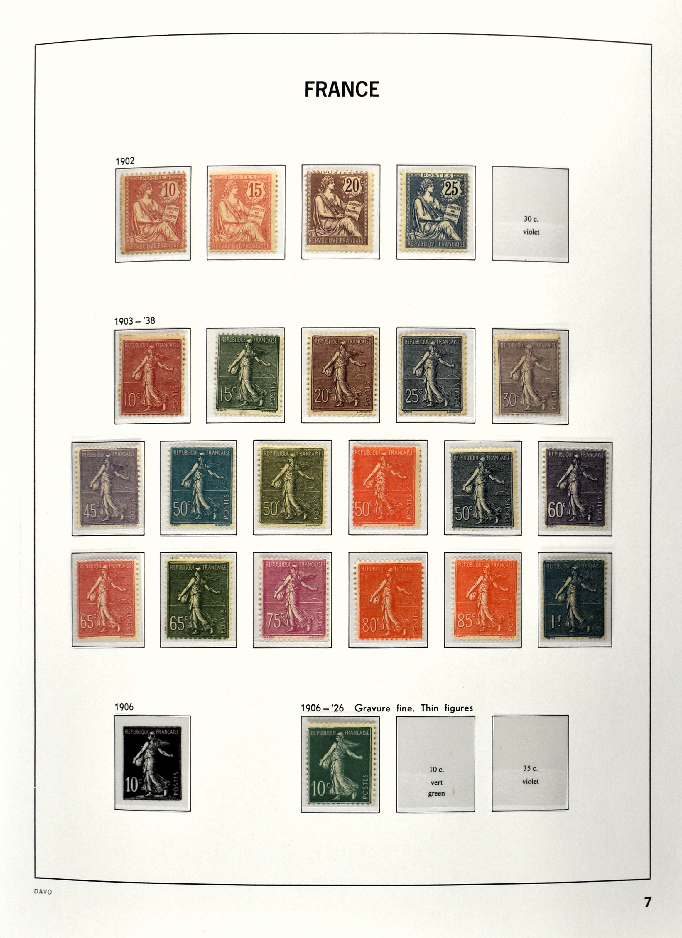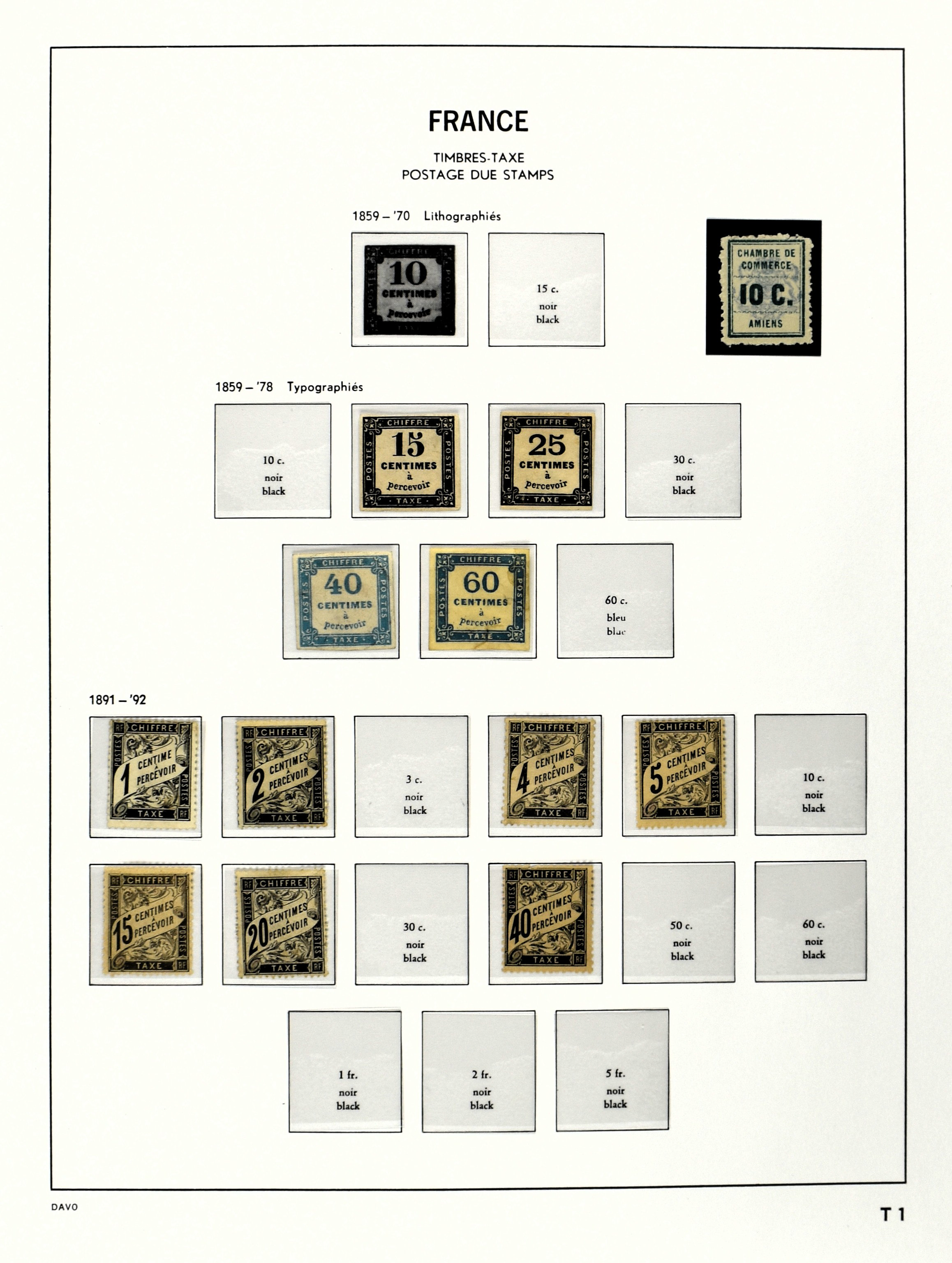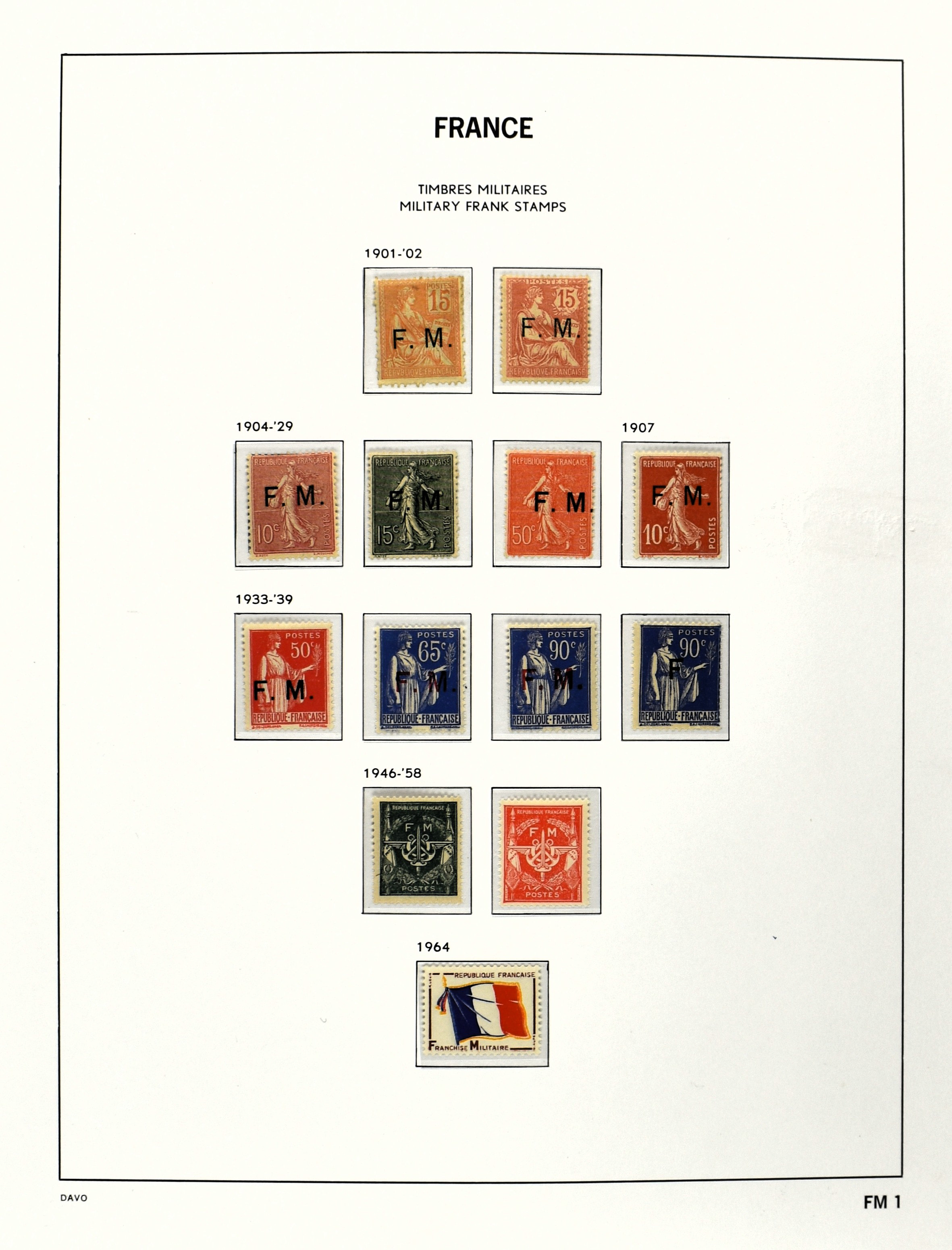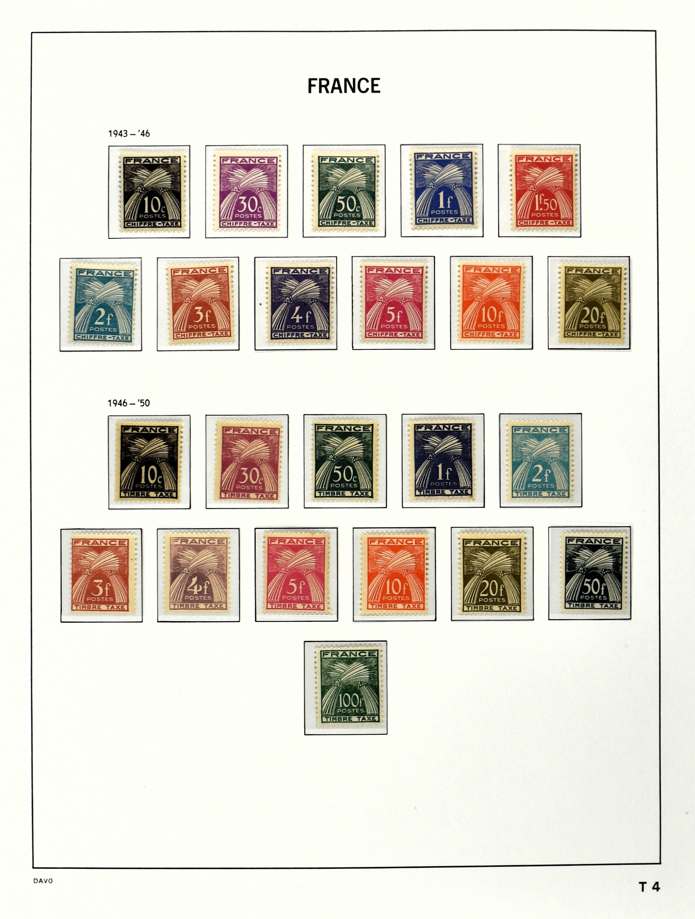 FRANCE 1870-2012, (*)/*/** collection in 4 Davo albums with a lot of good numbers and sets f.i.: Yv. 128/35, 144/52, 181/83, 220/21, 240/42, 321, block 1 and 3, a nice section back of the book with Postage Due, Service and Precancels, in