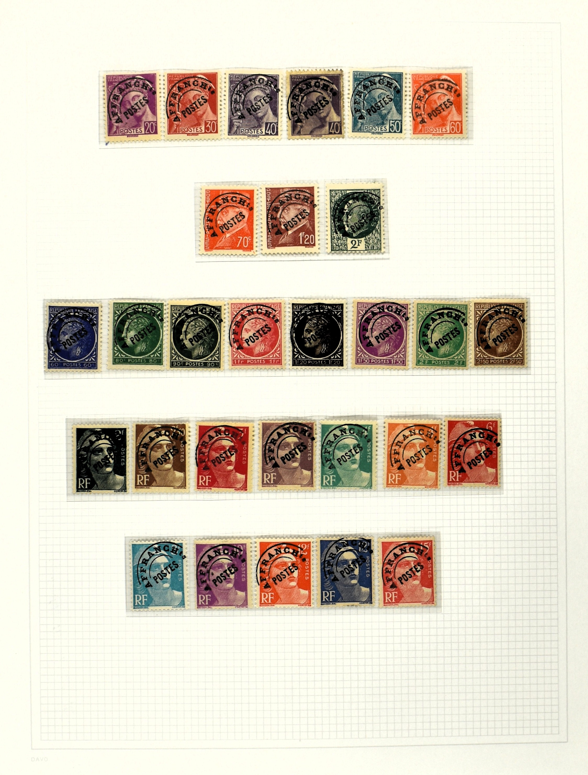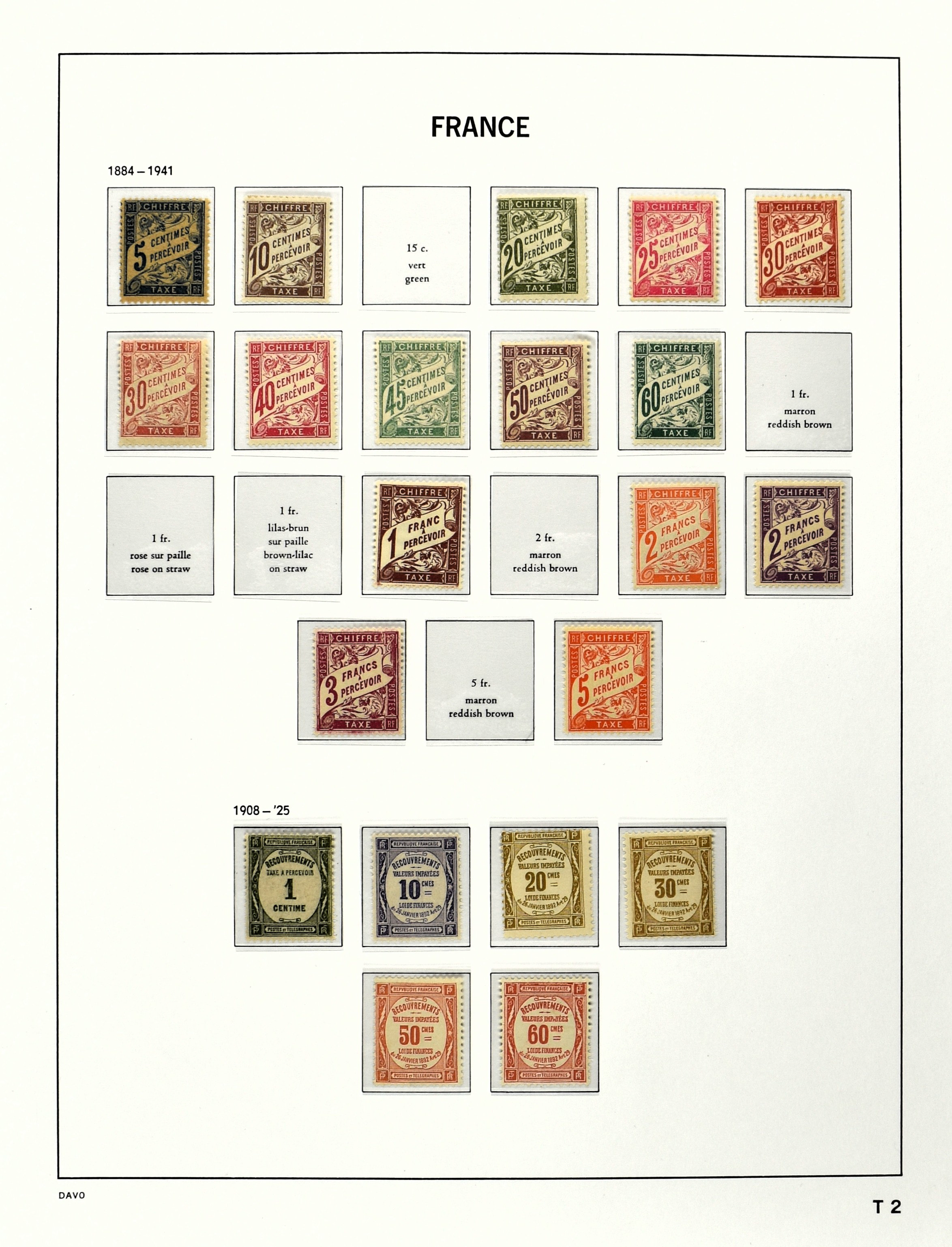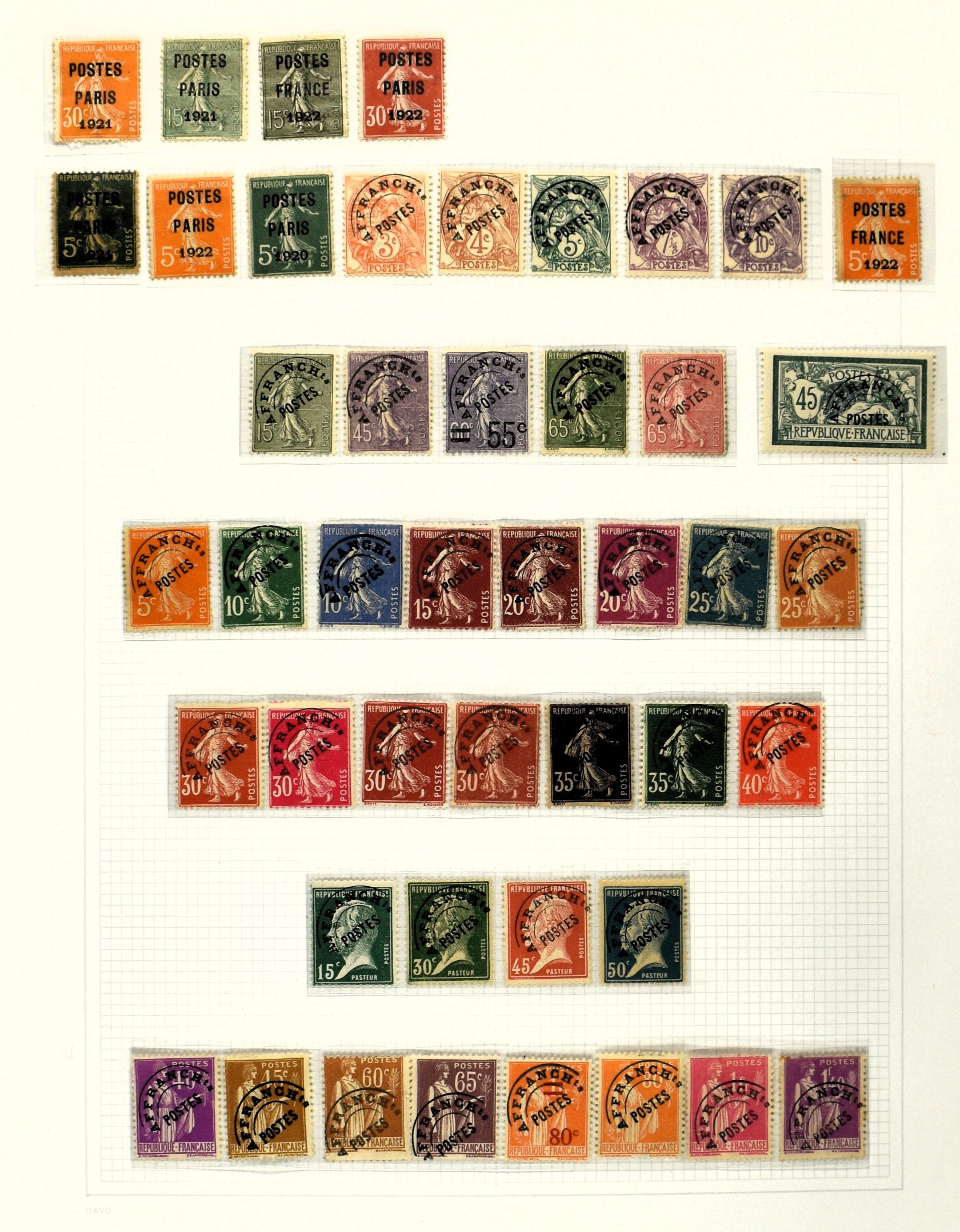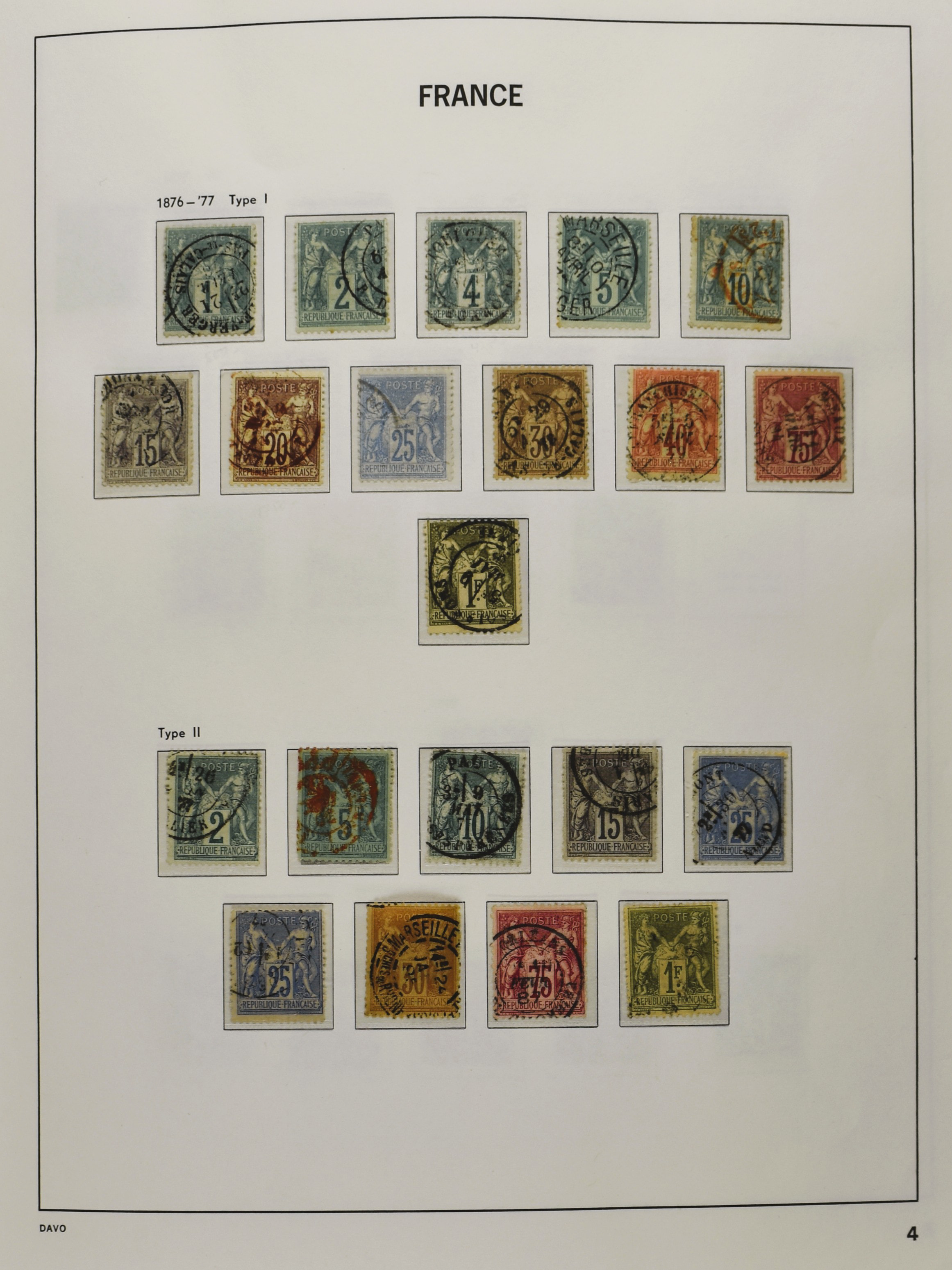 FRANCE 1870-2012, (*)/*/** collection in 4 Davo albums with a lot of good numbers and sets f.i.: Yv. 128/35, 144/52, 181/83, 220/21, 240/42, 321, block 1 and 3, a nice section back of the book with Postage Due, Service and Precancels, in