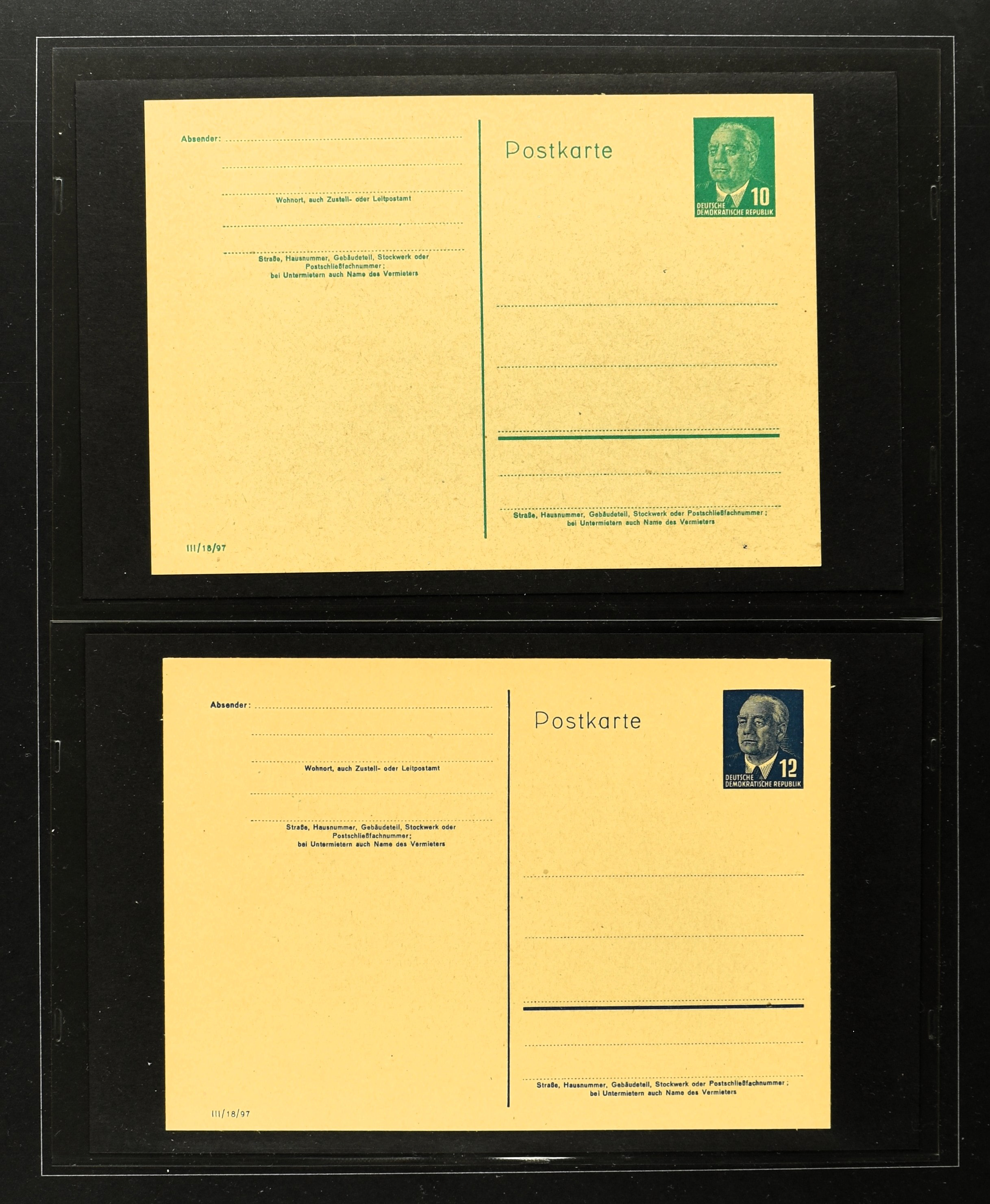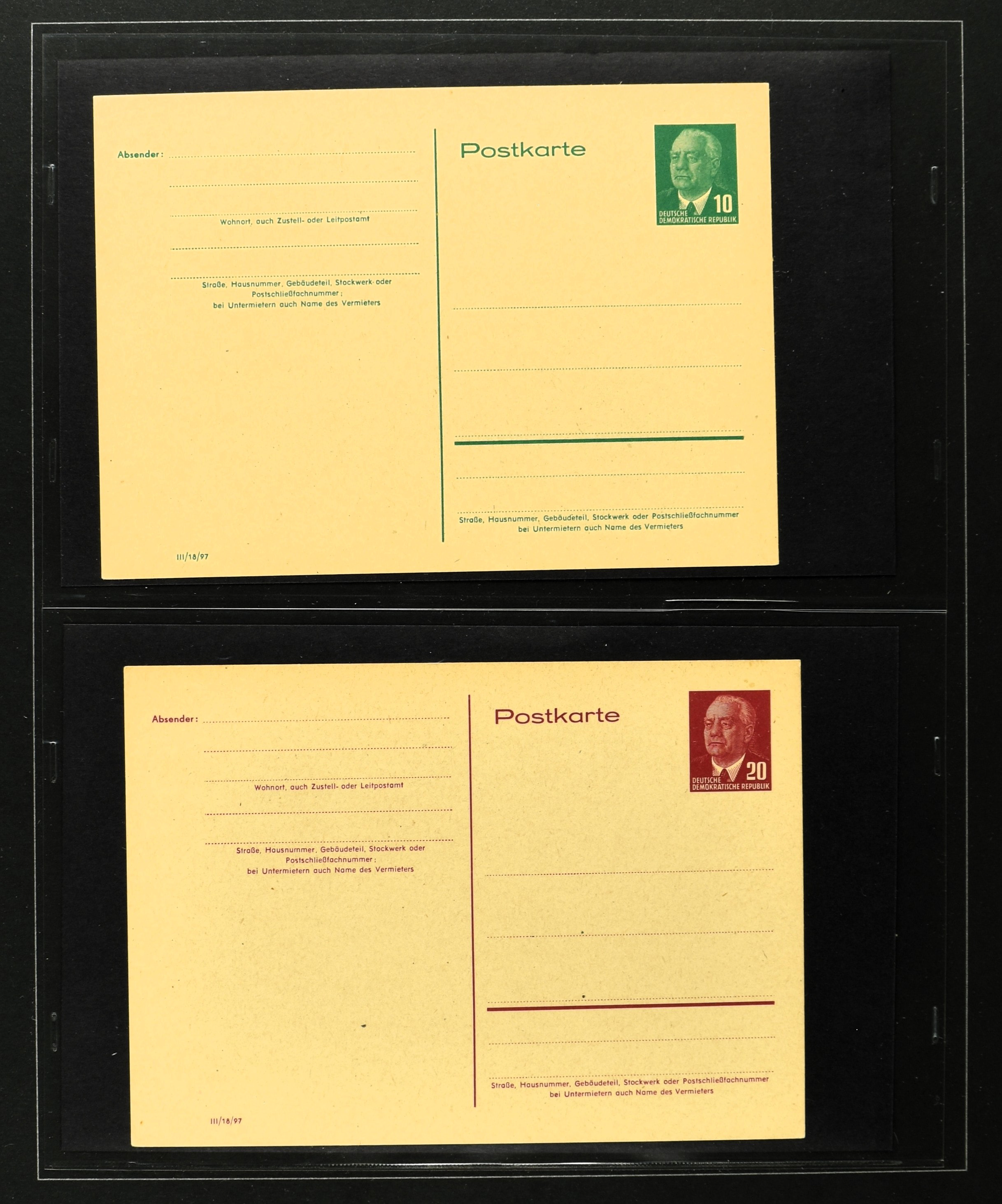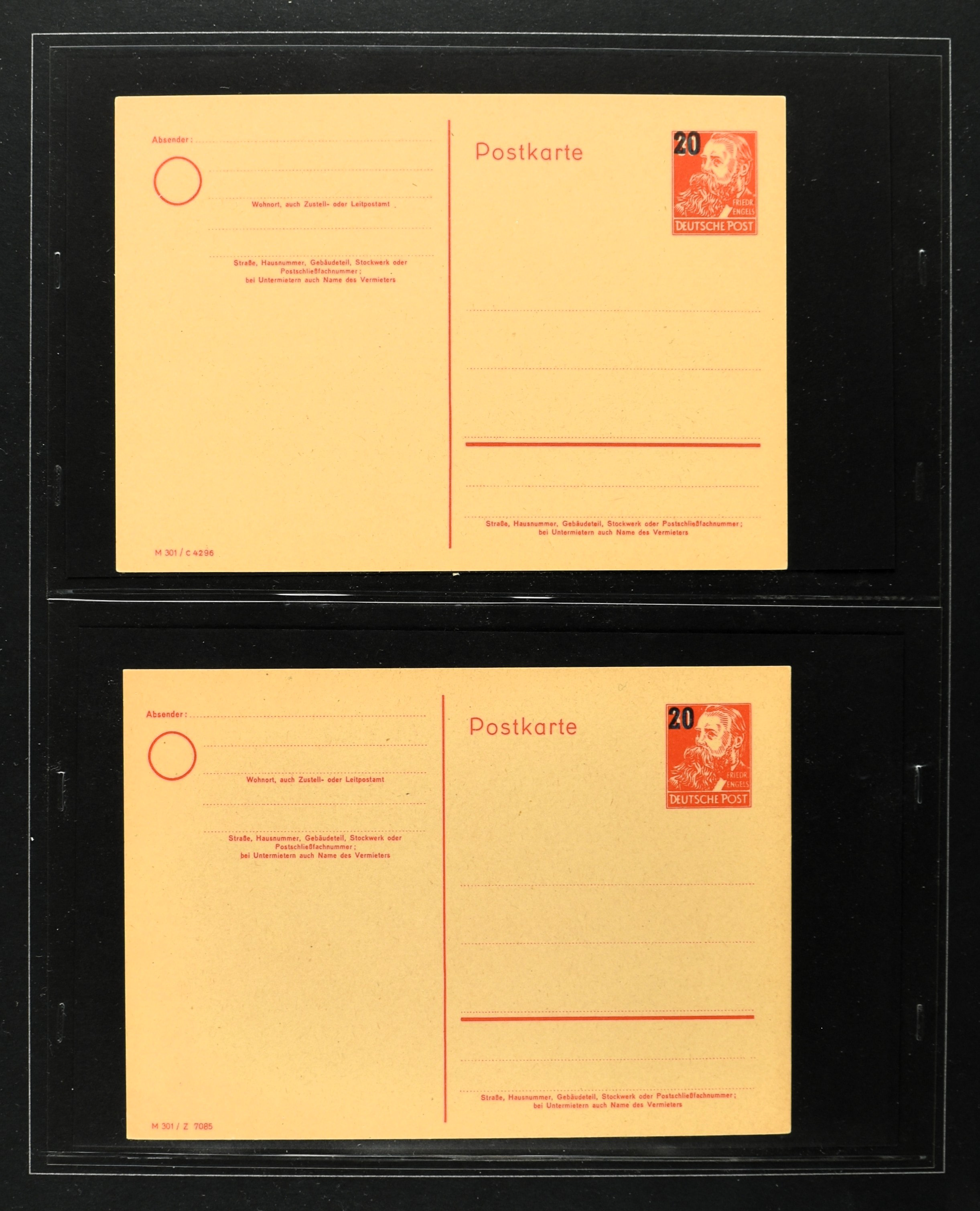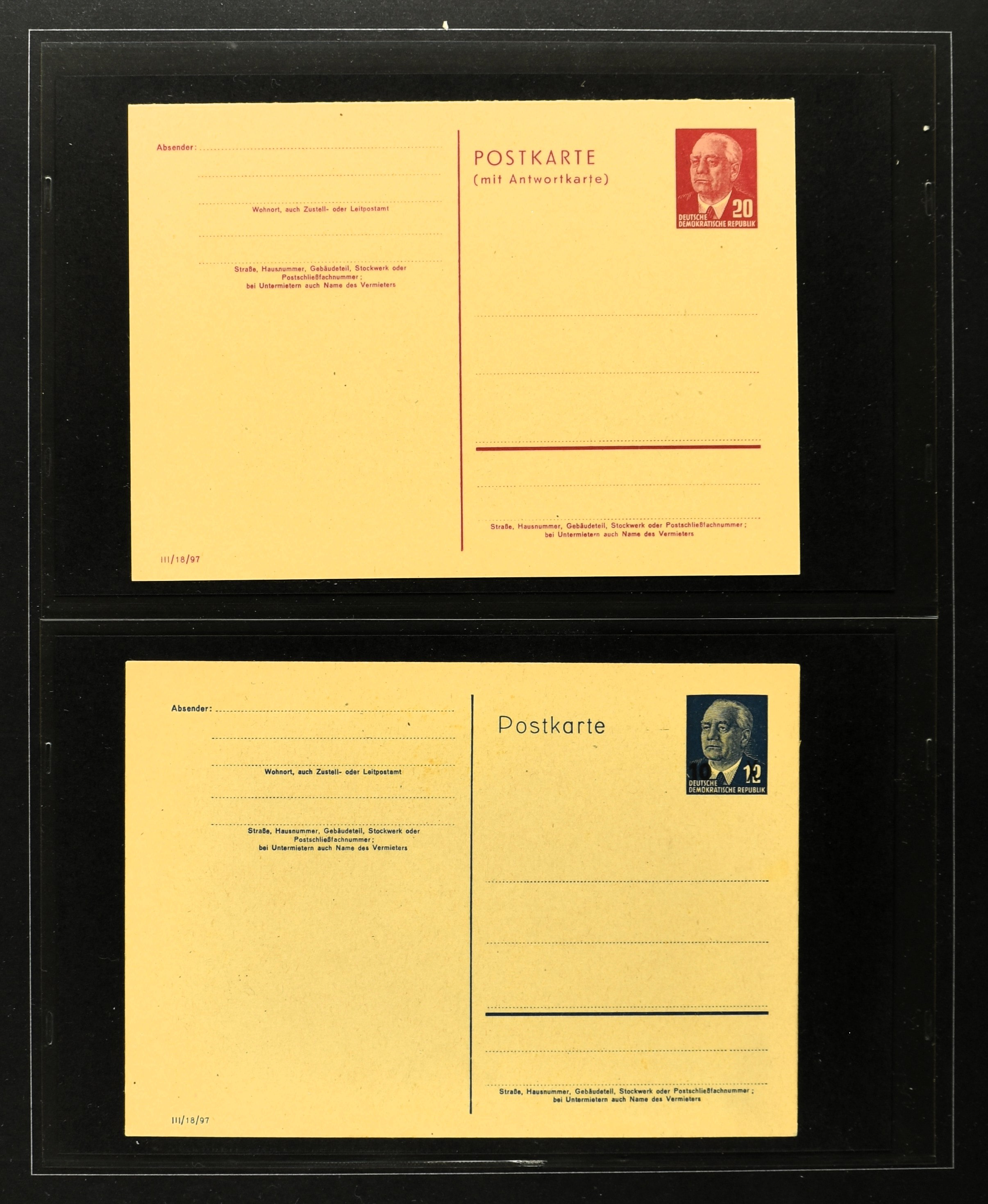 2369 imageGERMANY, DDR, 1950-1990, collection postal stationary with 170 different cards (often used and unused) in 2 albums with better items i.e.: P44a, 51-01, 51-02A used, 60, 70II etc. Catalogue value according the vendor €2500+ (Image) (Image2) (Image3) (Image4) (Image5) (Image6) (Image7) (Image8) (Image9) (Image10) (Image11) (Image12) (Image13) (Image14) (Image15) (All Images)