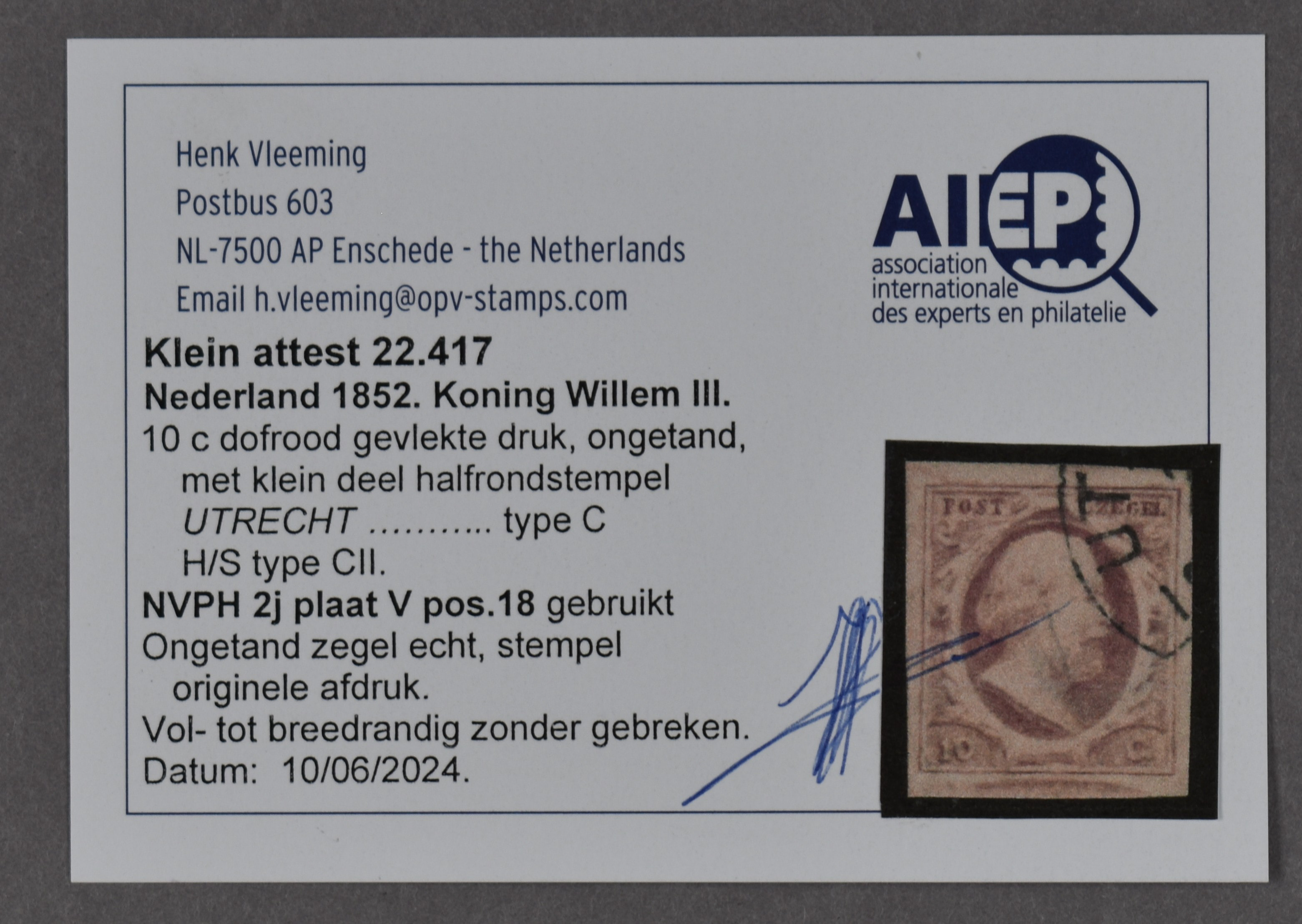 2j-Pl.V-18, breed gerand prachtex. Klein attest Vleeming (2024) (Image) (Image2)