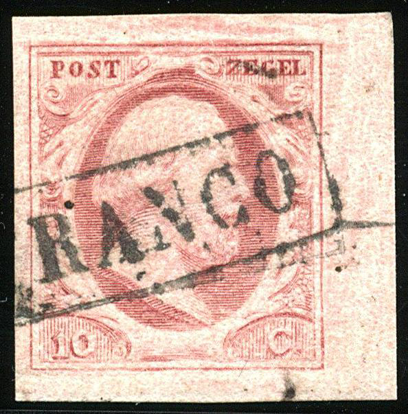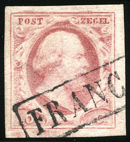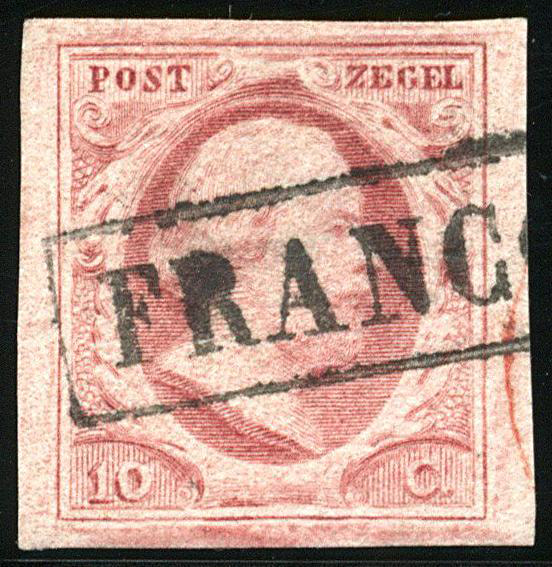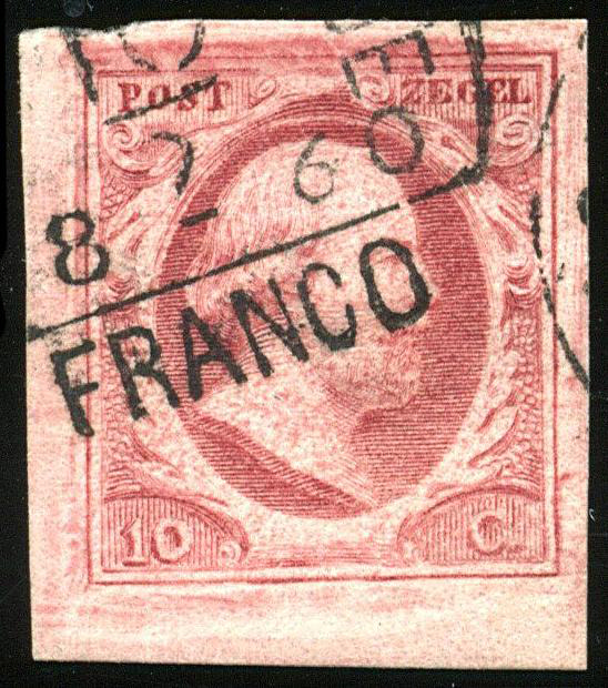 2i-Pl.V-75, breed tot zeer breed gerand pracht hoekstuk met watermerklijn, afgestempeld met het op deze plaat schaarse Franco (Image)