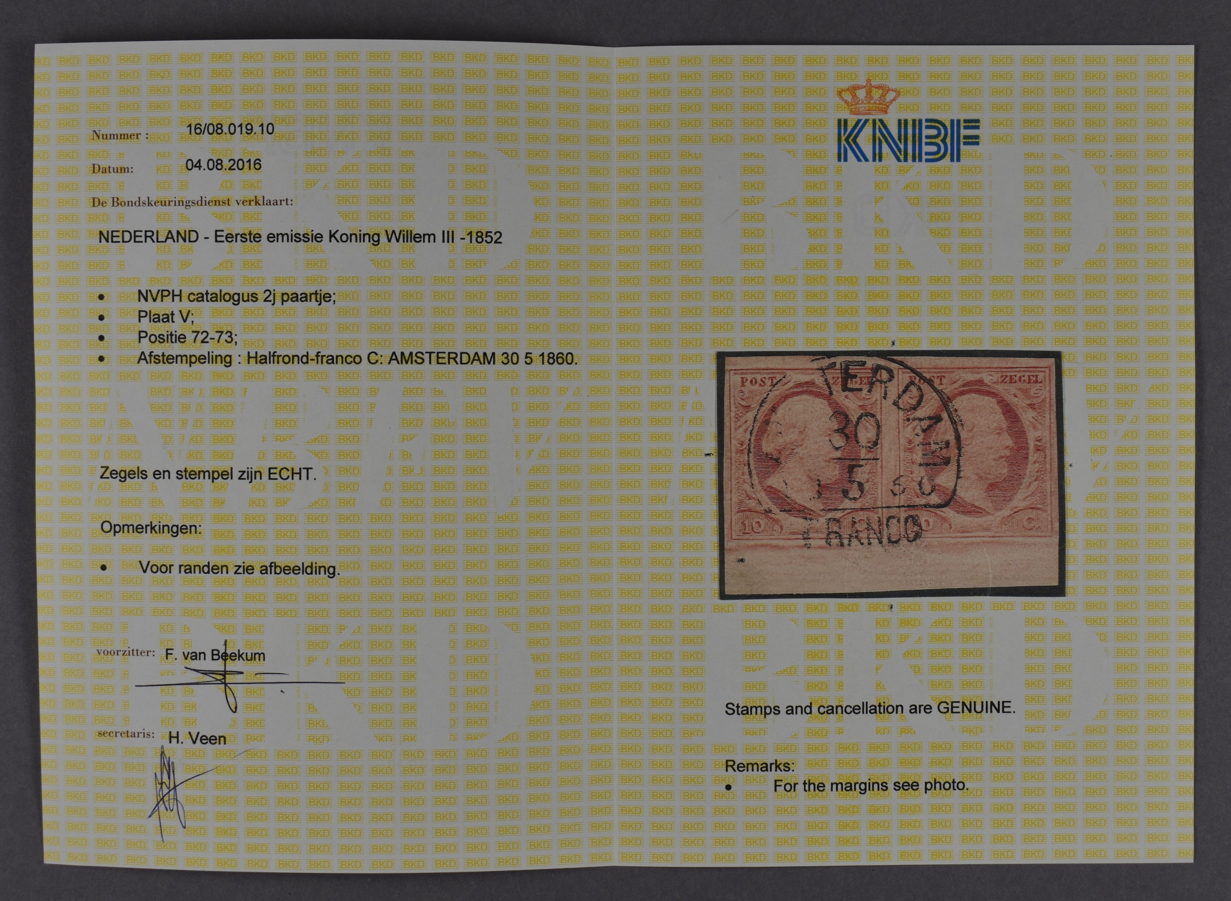 2j-Pl.V-72/73, pracht randpaar met watermerklijn, afgest. Amsterdam C. Cert. KNBF (2016) (Image) (Image2)