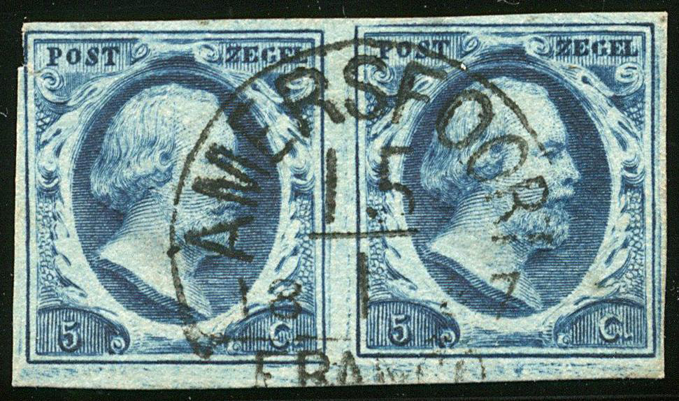 AMERSFOORT C type I (de H/S 125) op 5 cent nr. 1i-Pl.III-13/14. Linker bovenhoek wat ingeknipt, overigens mooi paar met centrale afst. (Image)