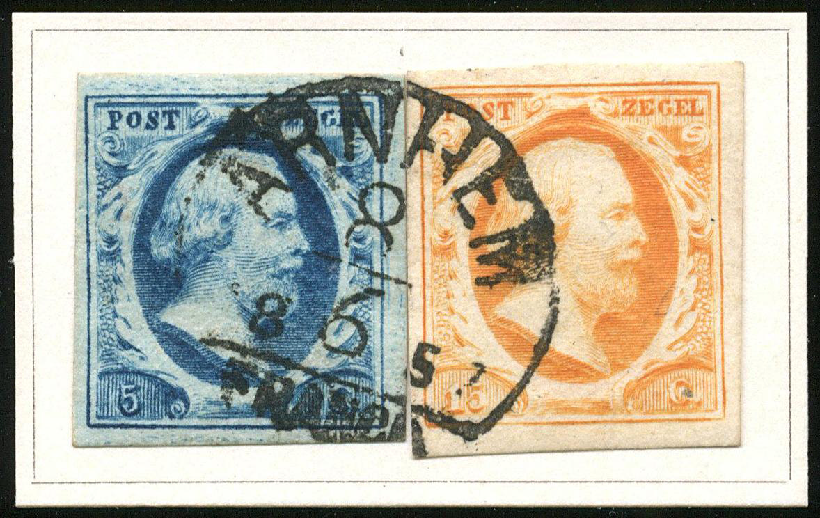 ARNHEM C type I (de H/S 50, 300) op 5 cent en 15 cent. Twee prachtex. weer samengevoegd op knipsel met centrale afst. (Image)