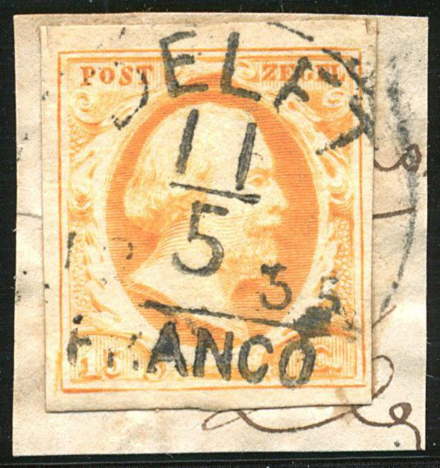 DELFSHAVEN B (de H/S RR) op 15 cent nr. 3b, pos. 21. Smal tot vol gerande zegel met duidelijke afst. van 21-2-1857. Zeldzaam! (Image)