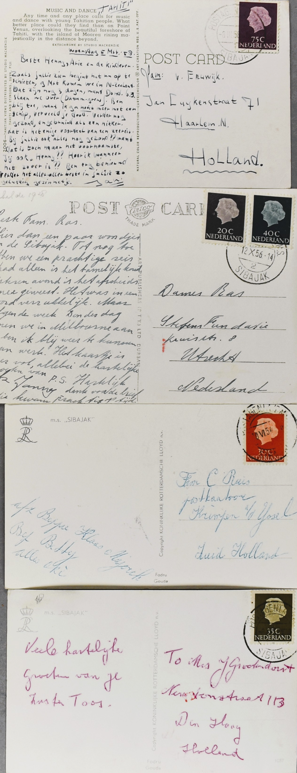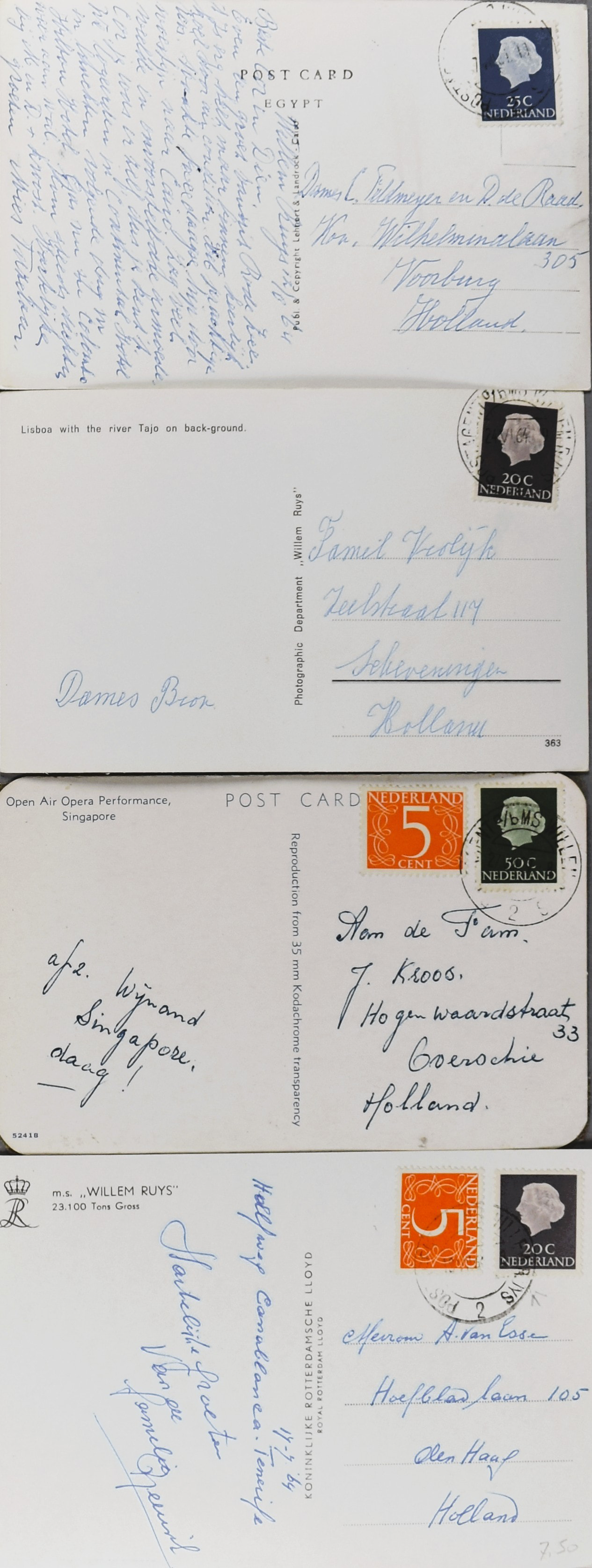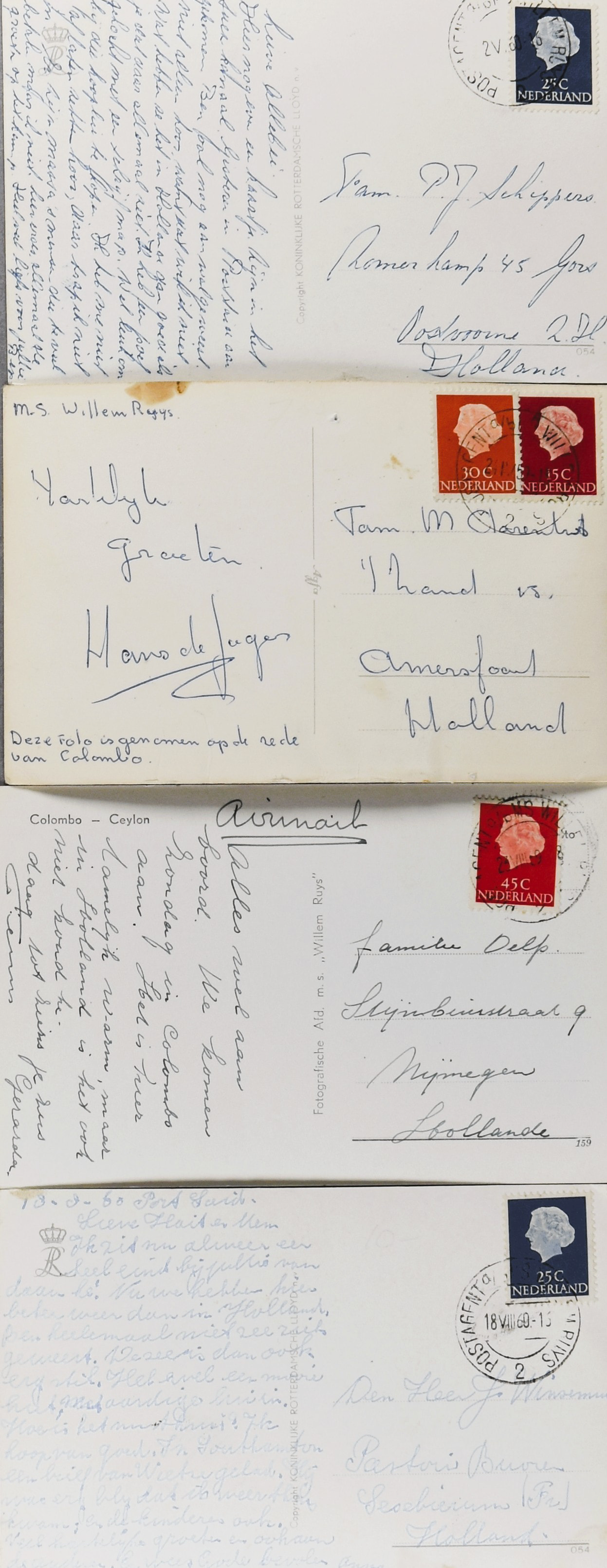 52 imageSCHEEPSPOST NEDERLAND. Ca. 340 poststukken/prentbriefkaarten van hoofdzakelijk de Rotterdamsche Lloyd met een grote verscheidenheid aan stempels van postagenten aan boord, in de portiersloge, post van militairen, tevens stempels postagent a/b van o.a. Sibajak, Waterman, Willem Ruys, ook ongebruikte (foto)prentbriefkaarten van schepen, RL-enveloppen, postbladen, (prent)briefkaarten, etc. gesorteerd in doos. Spannend voor de liefhebber van scheepspost! (Image) (Image2) (Image3) (Image4) (Image5) (Image6) (Image7) (Image8) (Image9) (Image10) (Image11) (Image12) (Image13) (Image14) (Image15) (All Images)