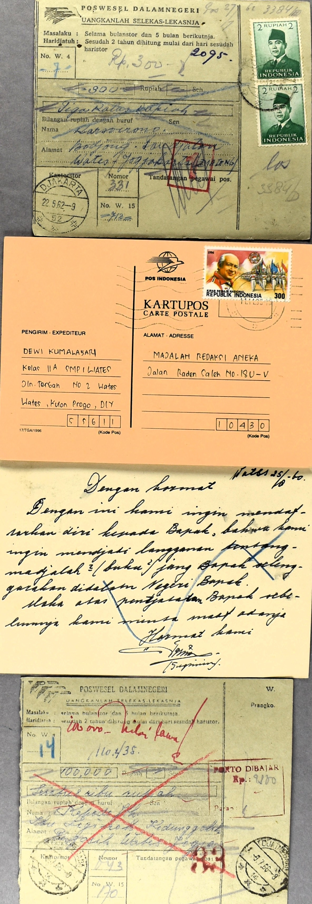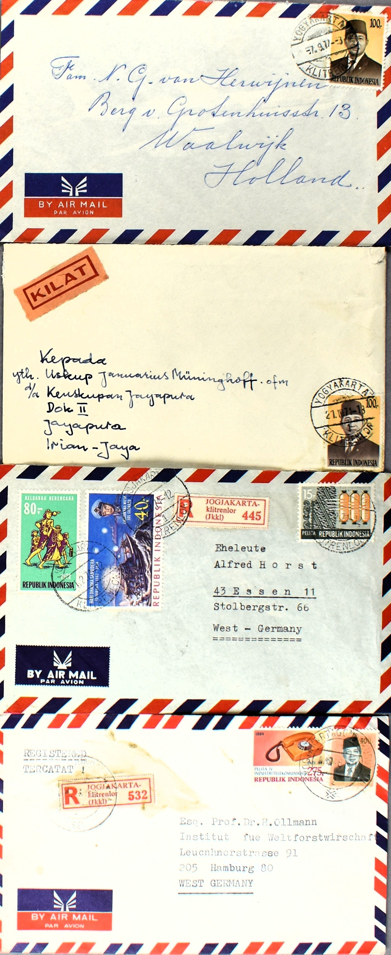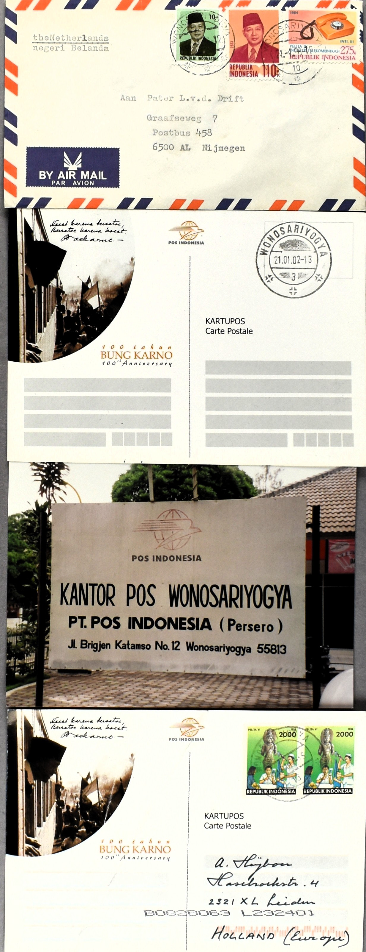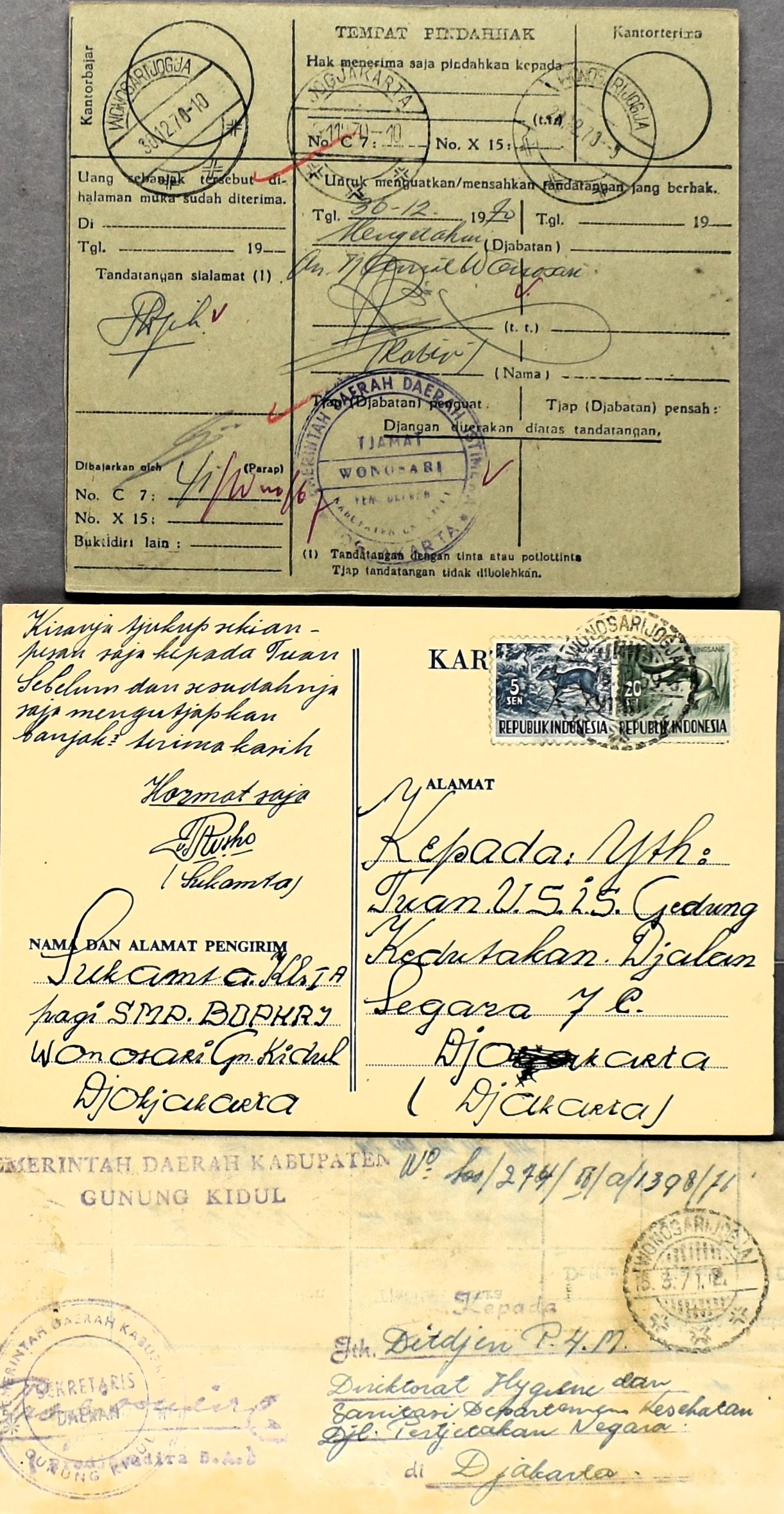 55 imageNED.- INDIË DJOKJAKARTA, ca. 325 poststukken uit de Nederlands-Indische periode w.o. Djokjakarta-Station, Djokjakarta-Gondolajoe, spoorwegpostkantoren waarin Djokja, diverse gelegenheids- en propagandastempels, wat haltestempels, mooie frankeringen, zegels op insteekkaartjes etc. en tevens ca. 300 poststukken uit Indonesië vanaf 1950 met veel postwissels, kantoren uit het ressort Yogyakarta, brief naar president Soeharto, etc. (Image) (Image2) (Image3) (Image4) (Image5) (Image6) (Image7) (Image8) (Image9) (Image10) (Image11) (Image12) (Image13) (Image14) (All Images)