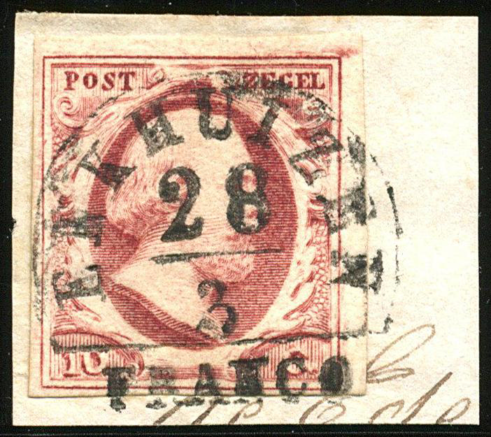ENKHUIZEN A (de H/S 75) op 10 cent nr. 2g-Pl.IV-49. Smal tot normaal gerande zegel op briefstukje met ideale afst. (Image)