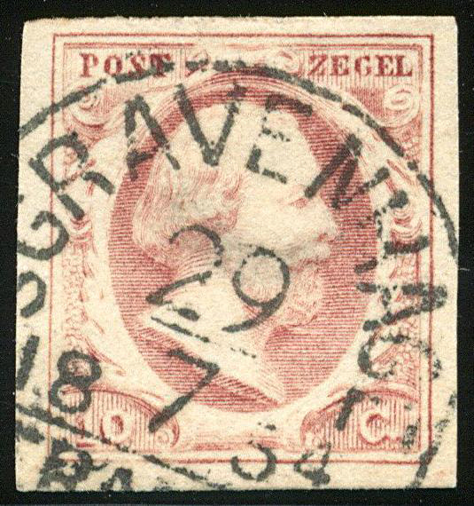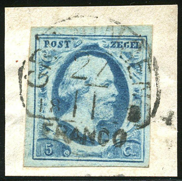 'sGRAVENHAGE C type I (de H/S 50) op 5 cent nr. 1j-Pl.III-30. Vol tot zeer breed gerand pracht hoekstuk met volledige afst. Mogelijk een van de tot nu toe mooist bekend geworden afdrukken, omdat deze niet is afgebeeld in de H/S (Image)