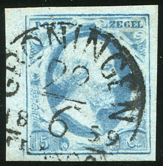 GRONINGEN C type I (de H/S 50) op 5 cent nr. 1k-Pl.III-86. Vol tot breed gerand pracht randstuk met de ons mooist bekende afst. (lijkt veel op type II, de plaats van de 59 t.o.v. de N lijkt echter te duiden op type I) (Image)