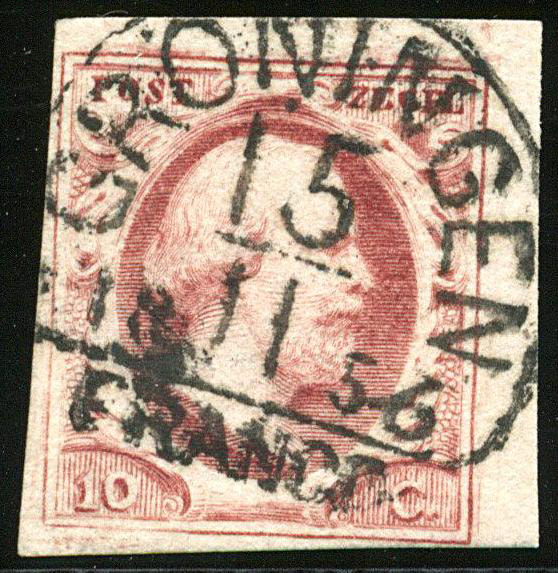 GRONINGEN C type III (de H/S 50) op 10 cent. Links onder net even aangesneden, overigens zeer breed gerande zegel met ideale afst. (Image)