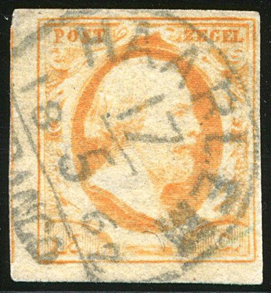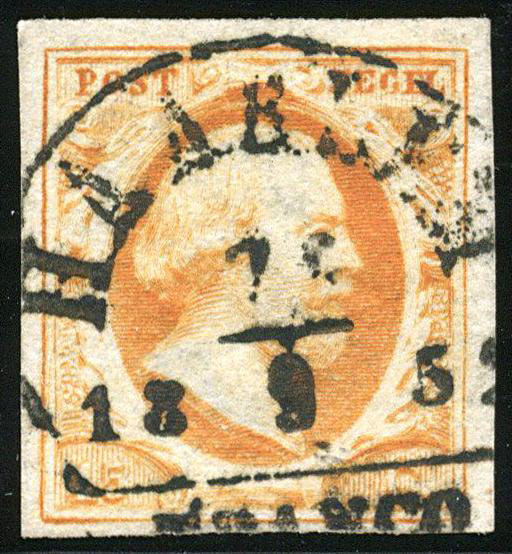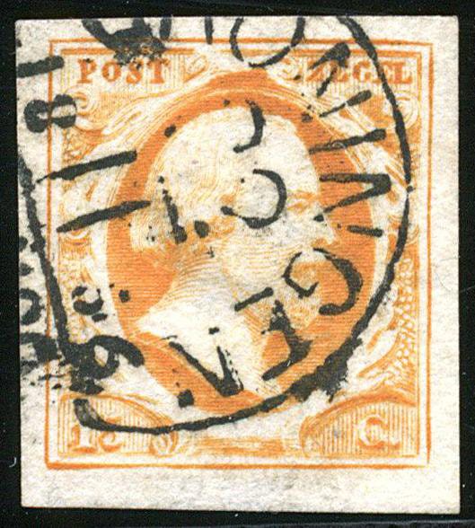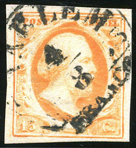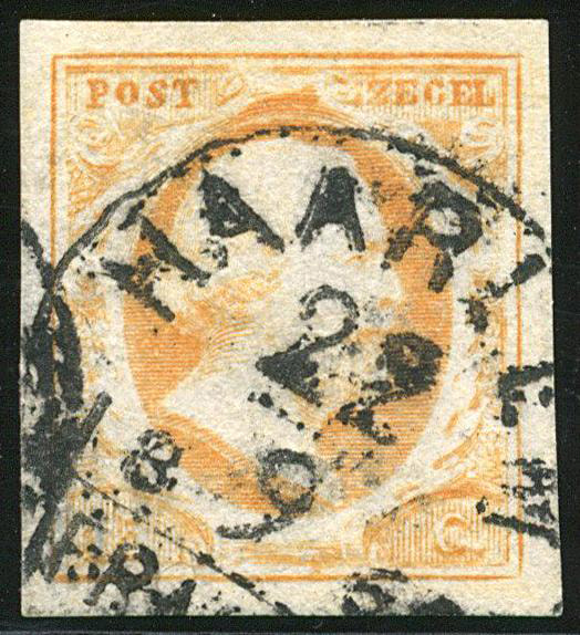 HAARLEM C type VI (de H/S 500) op 15 cent nr. 3c, pos. 18. Breed gerande prachtzegel met iets gevlekte, nagenoeg ideale afst. (Image)