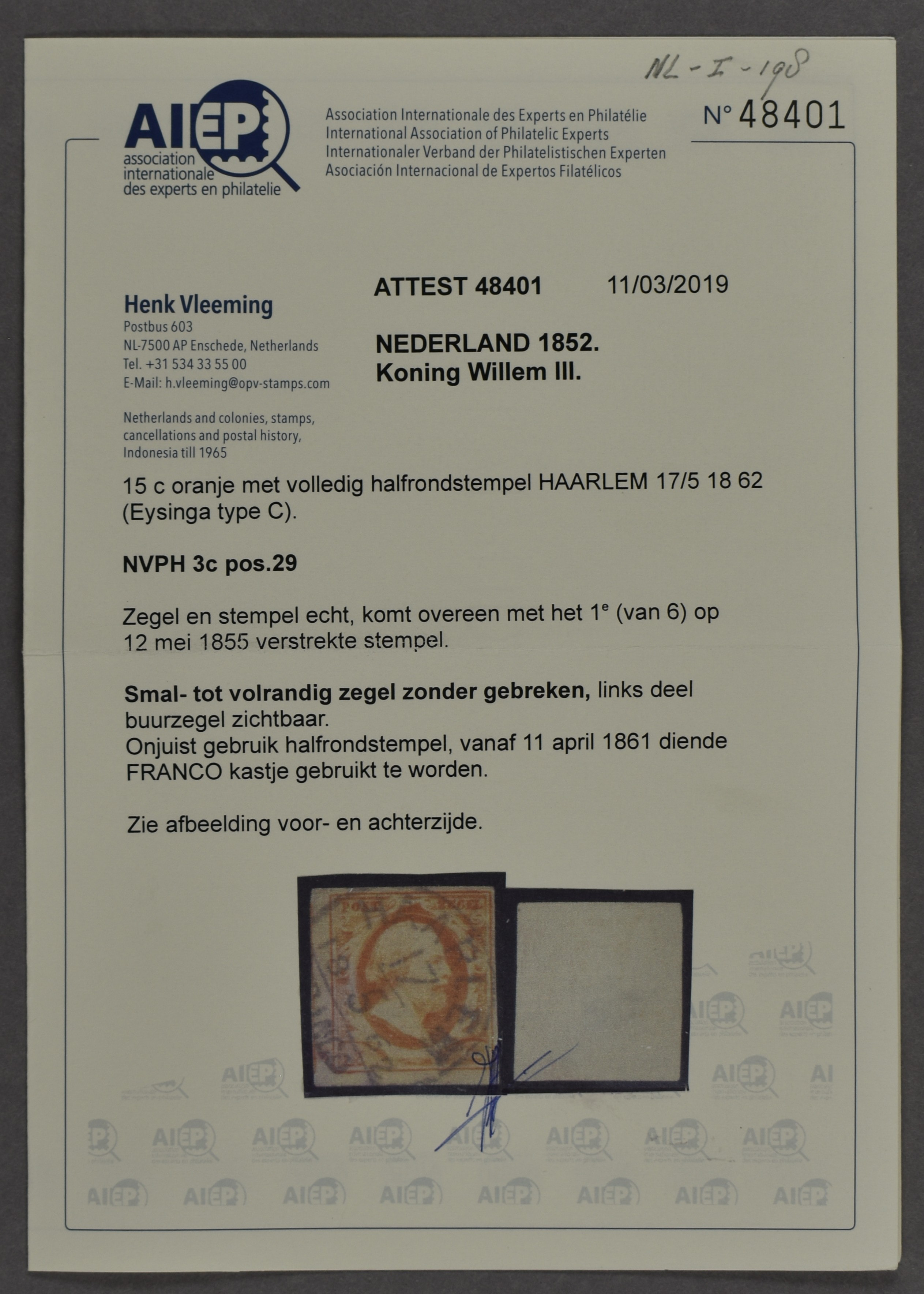 HAARLEM C type VII (de H/S 500) op 15 cent nr. 3c, pos. 29. Smal tot breed gerande zegel met volledige, tevens de ons mooist bekende afst. van 17-5-1862, een late datum met karakteristiek lage cijfer 2 van 62. Afgebeeld in de H/S