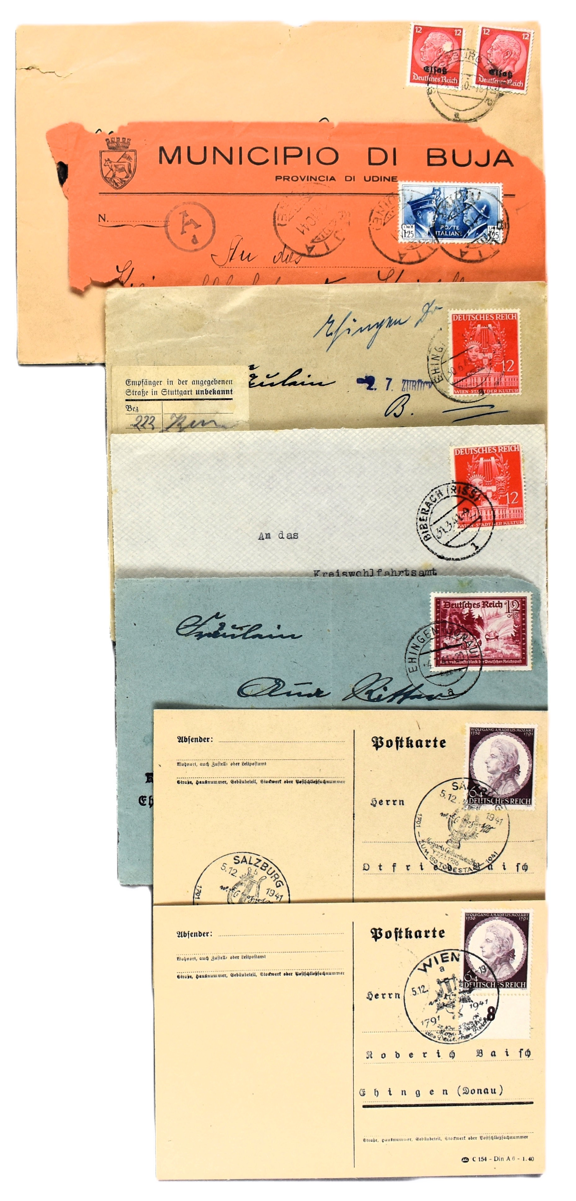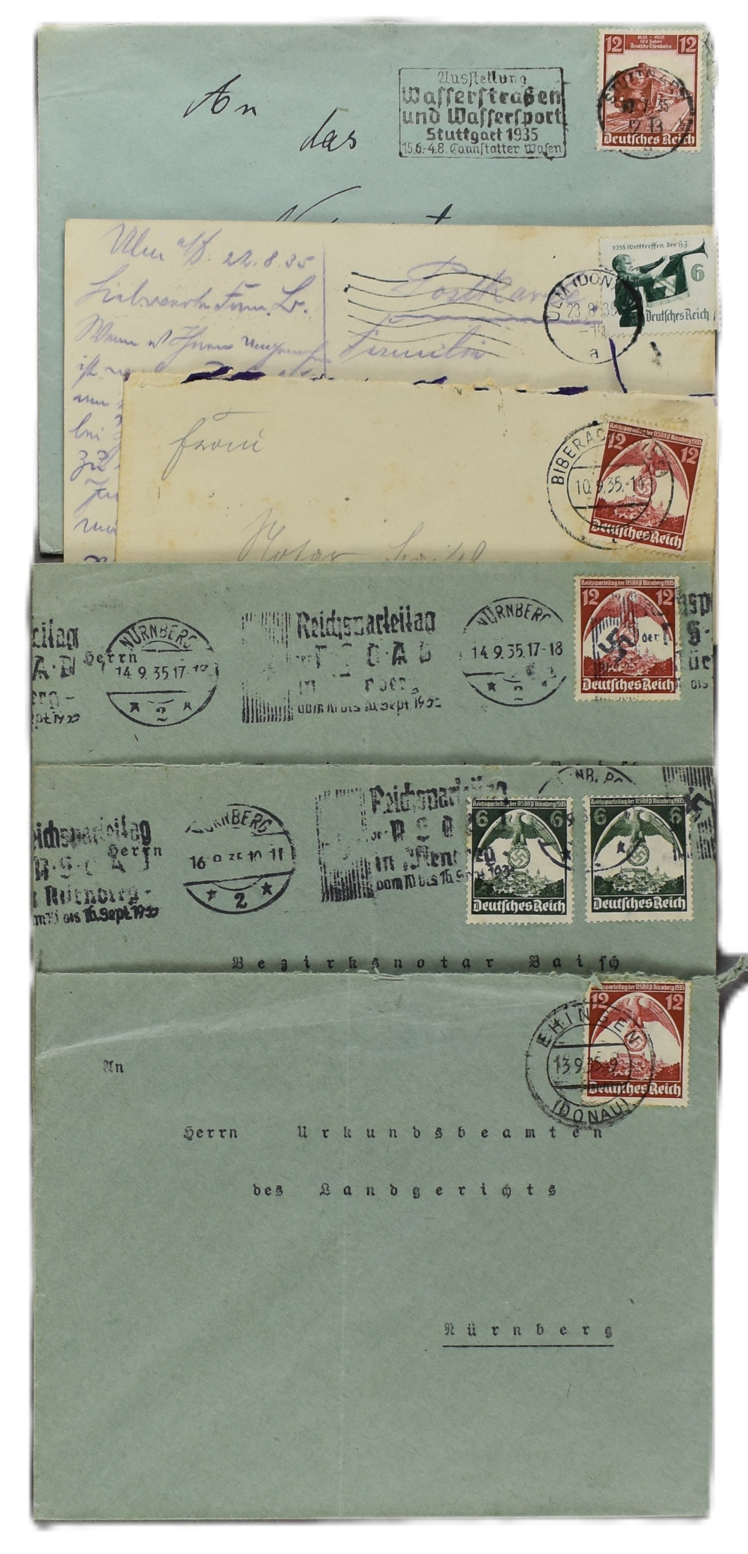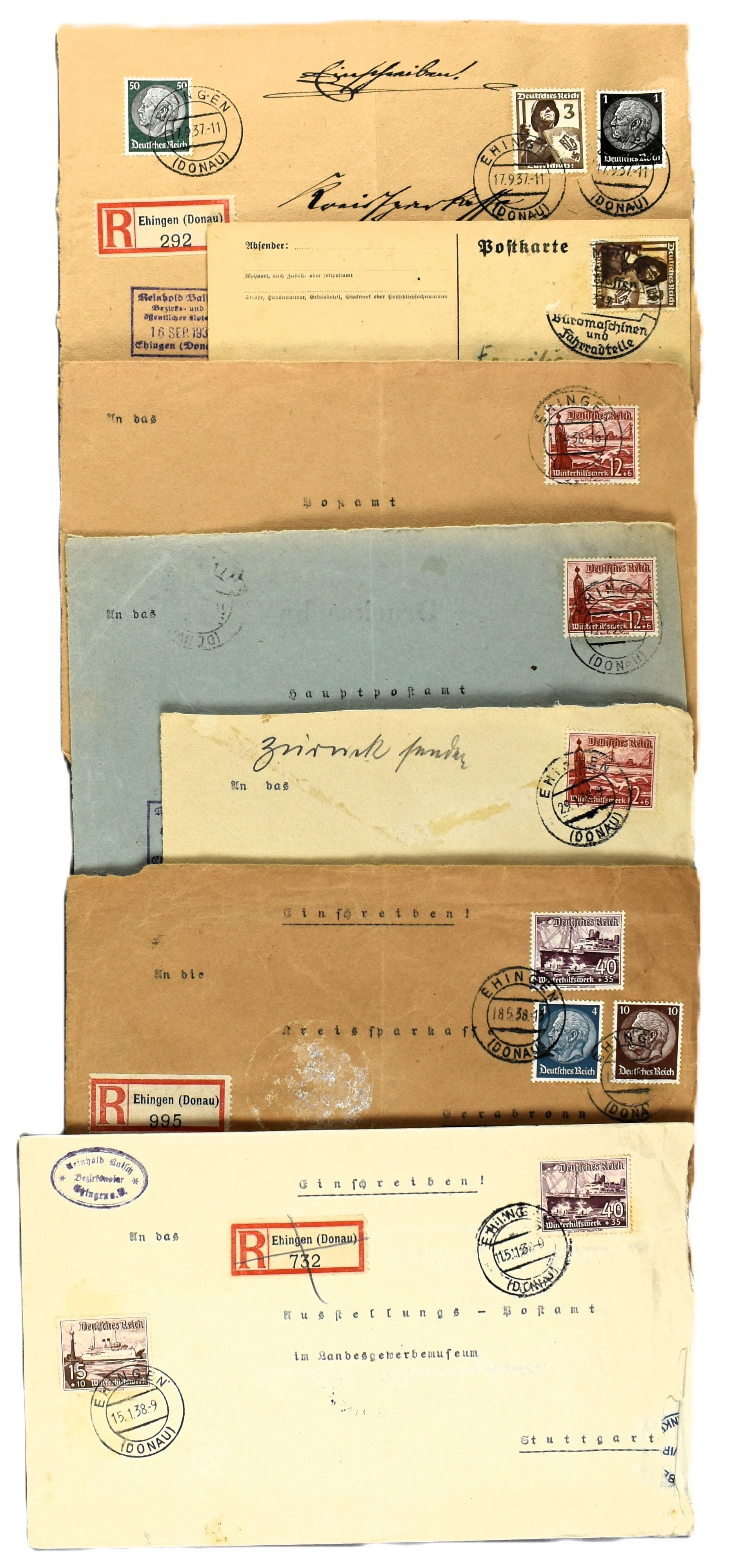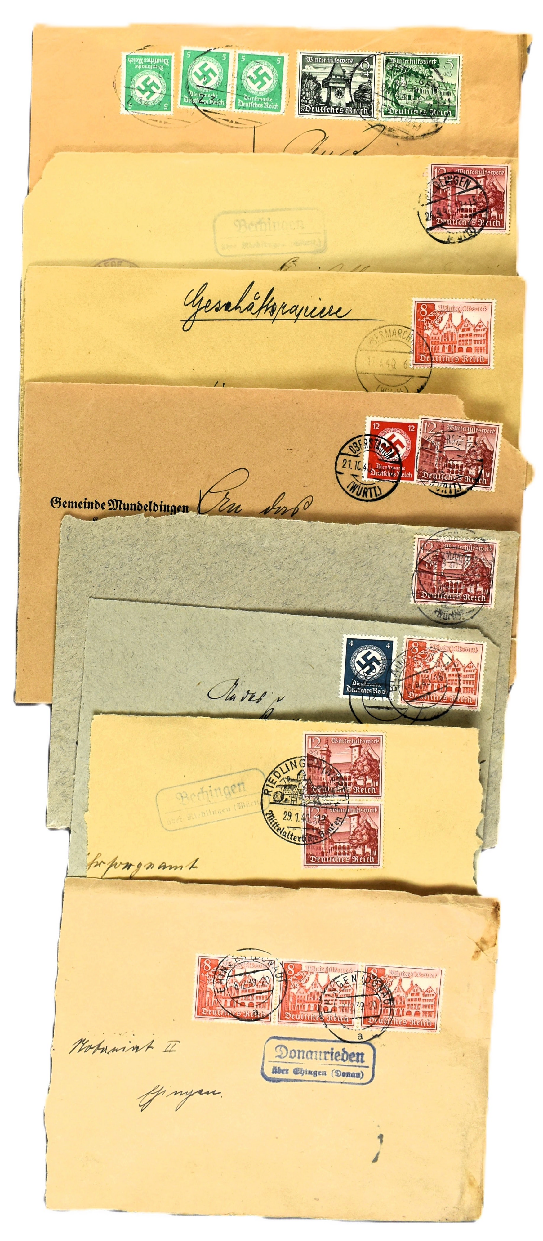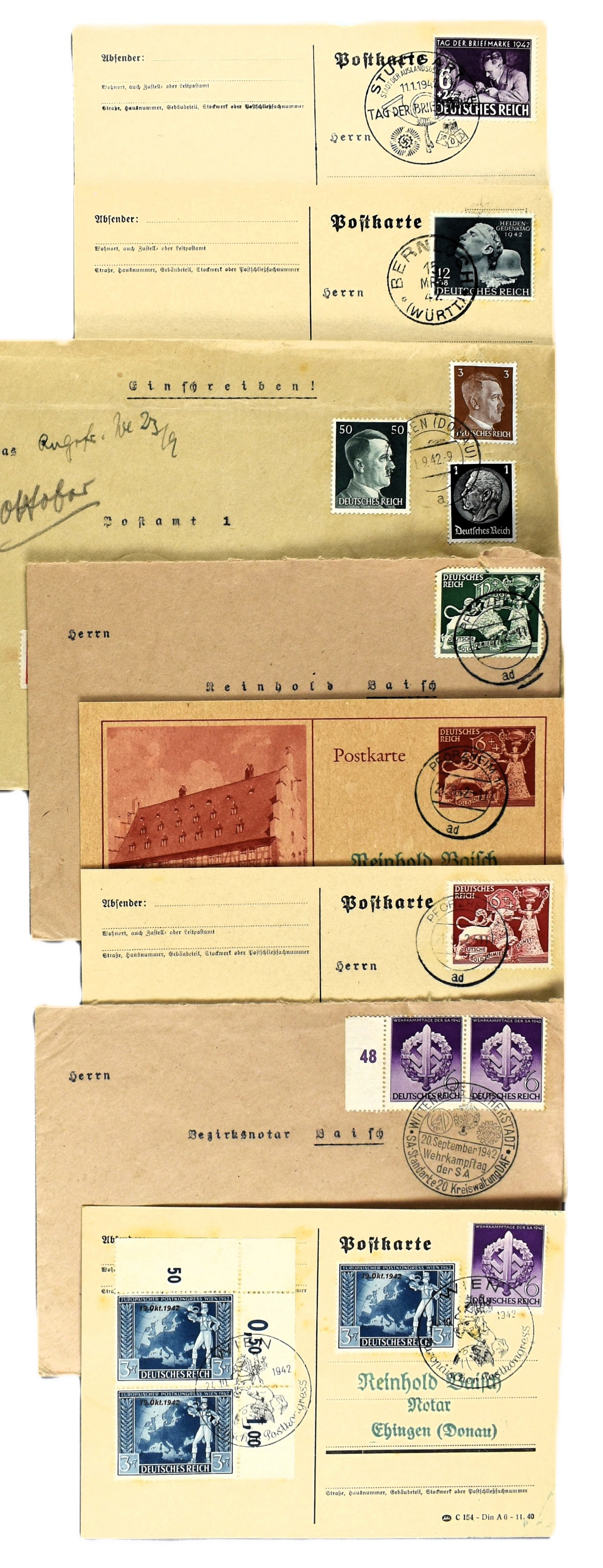 1920-1949, a few hundred covers and cards with several nice frankings and cancellations, many from the "Third Reich" and some not common mixed frankings. (Image)