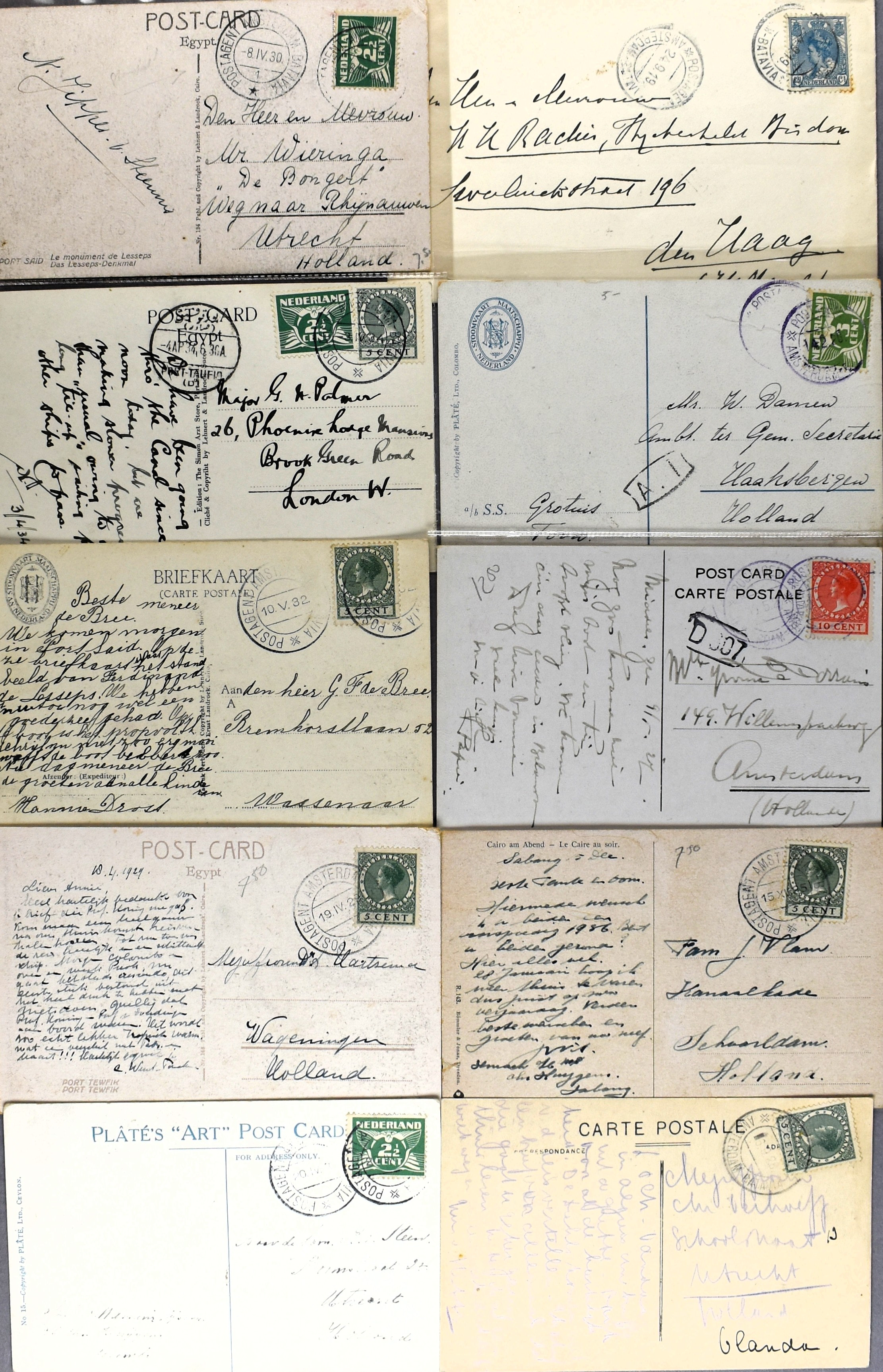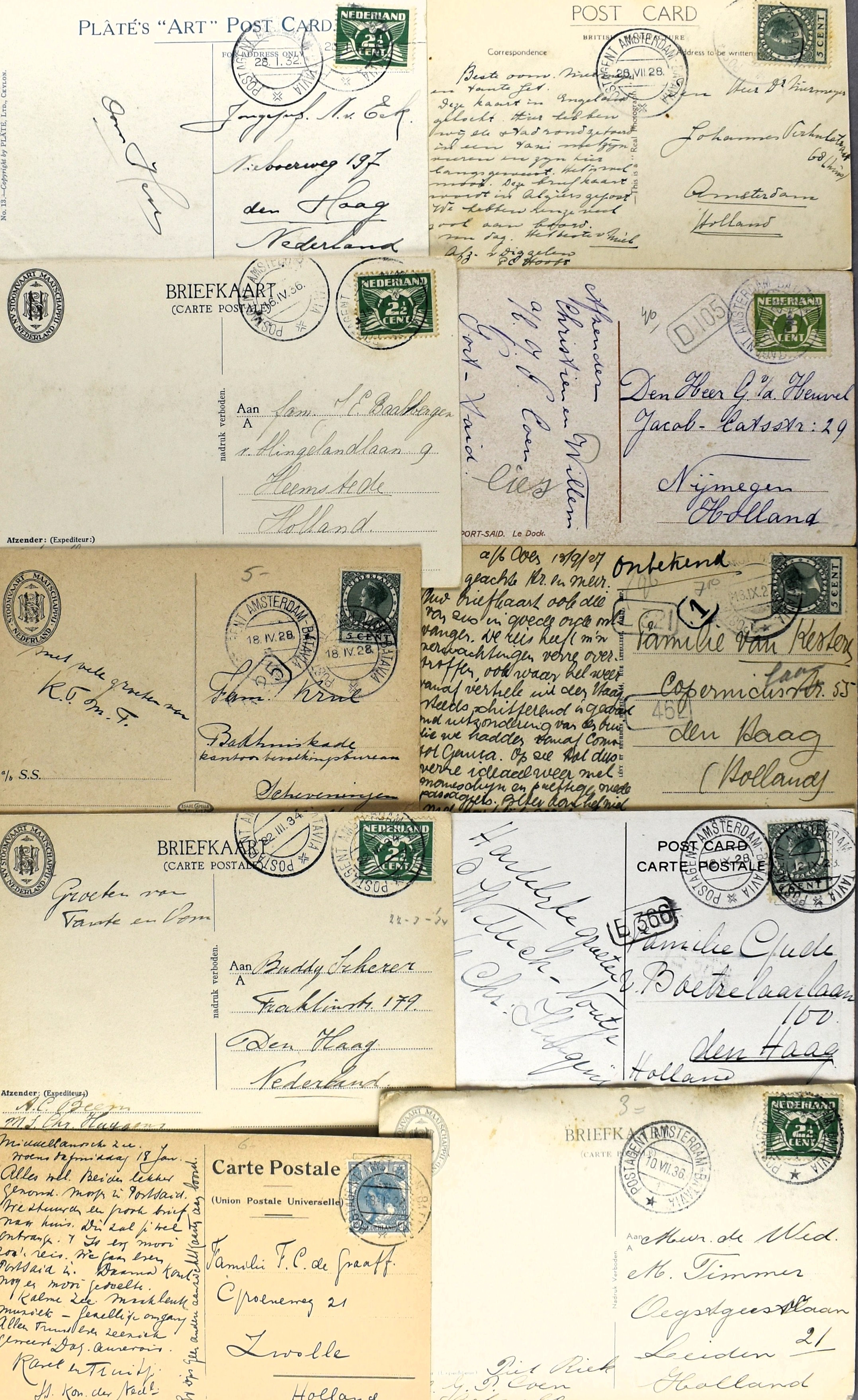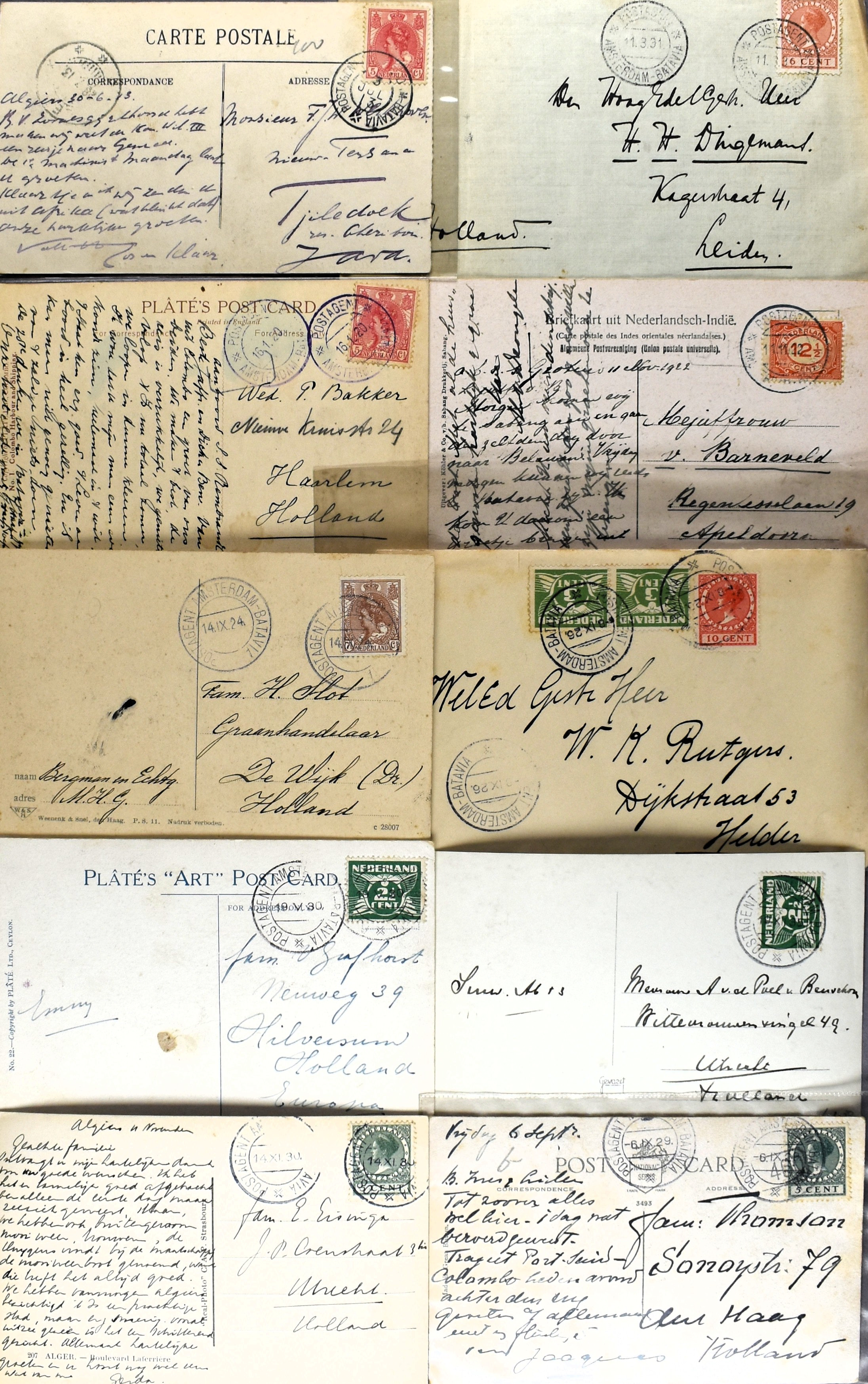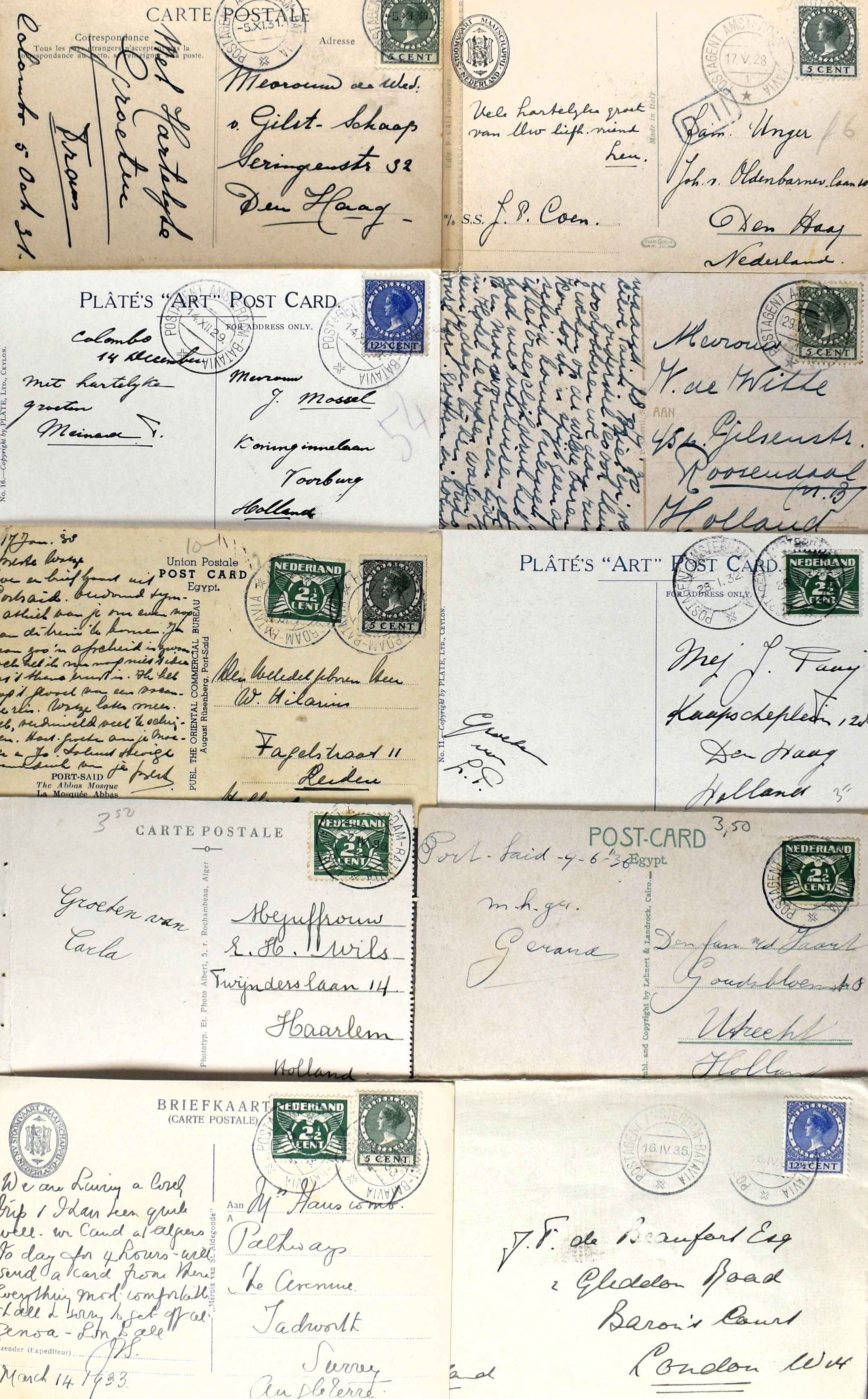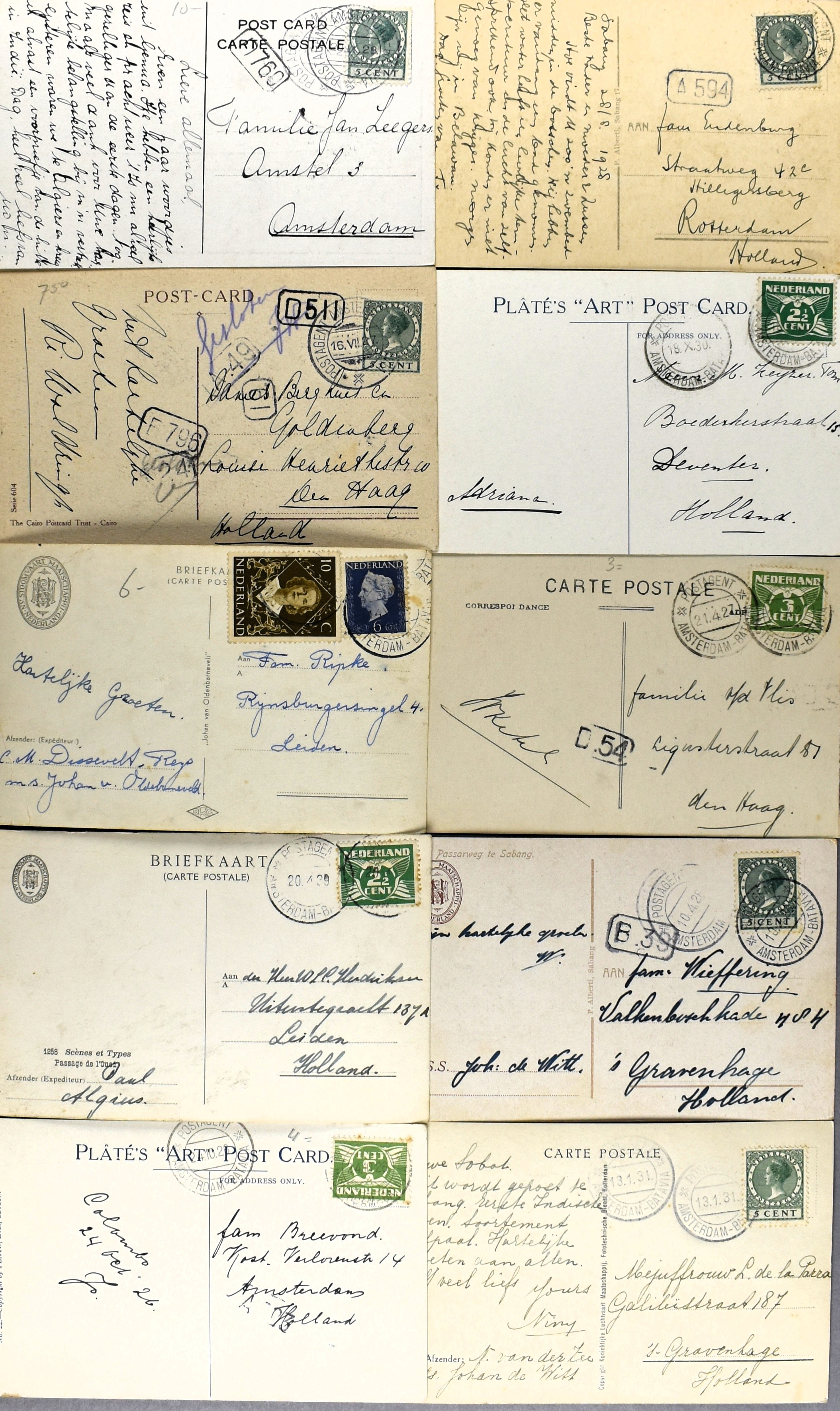 SCHEEPSPOST NEDERLAND. Ca. 525 poststukken/prentbriefkaarten van hoofdzakelijk de Stoomvaart Maatschappij 'Nederland' met een grote verscheidenheid aan stempels van postagenten aan boord, in de portiersloge, Singapore/Batavia (1915),