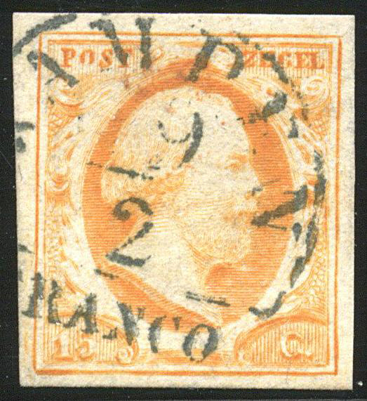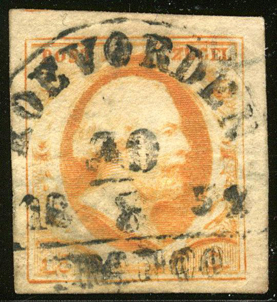 KOEVORDEN B (de H/S 700) op 15 cent. Vol tot zeer breed gerande, iets minder frisse zegel met vrijwel volledige afst. van 30-8-1852 (Image)