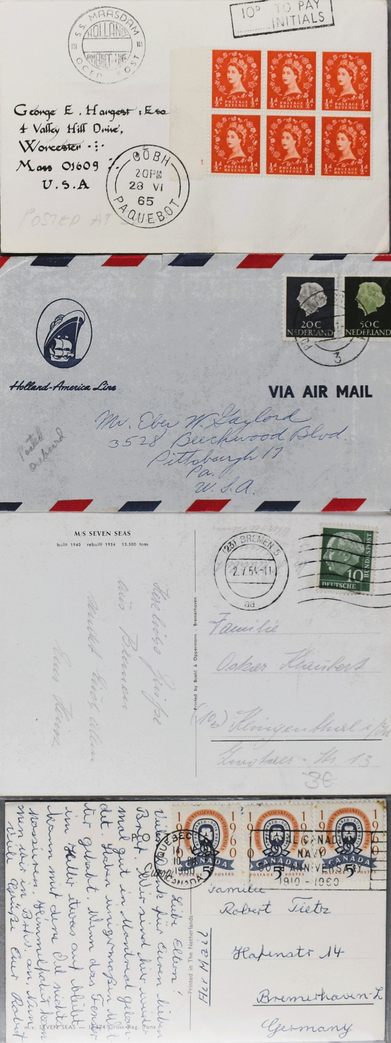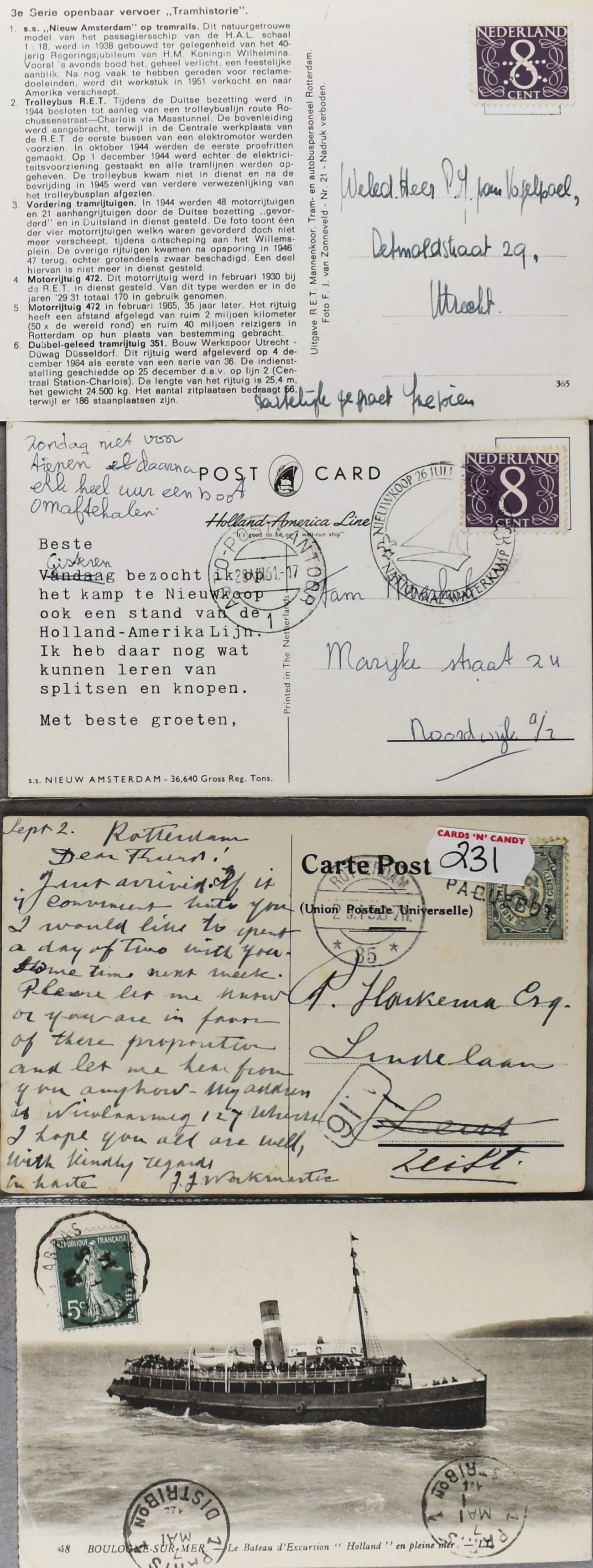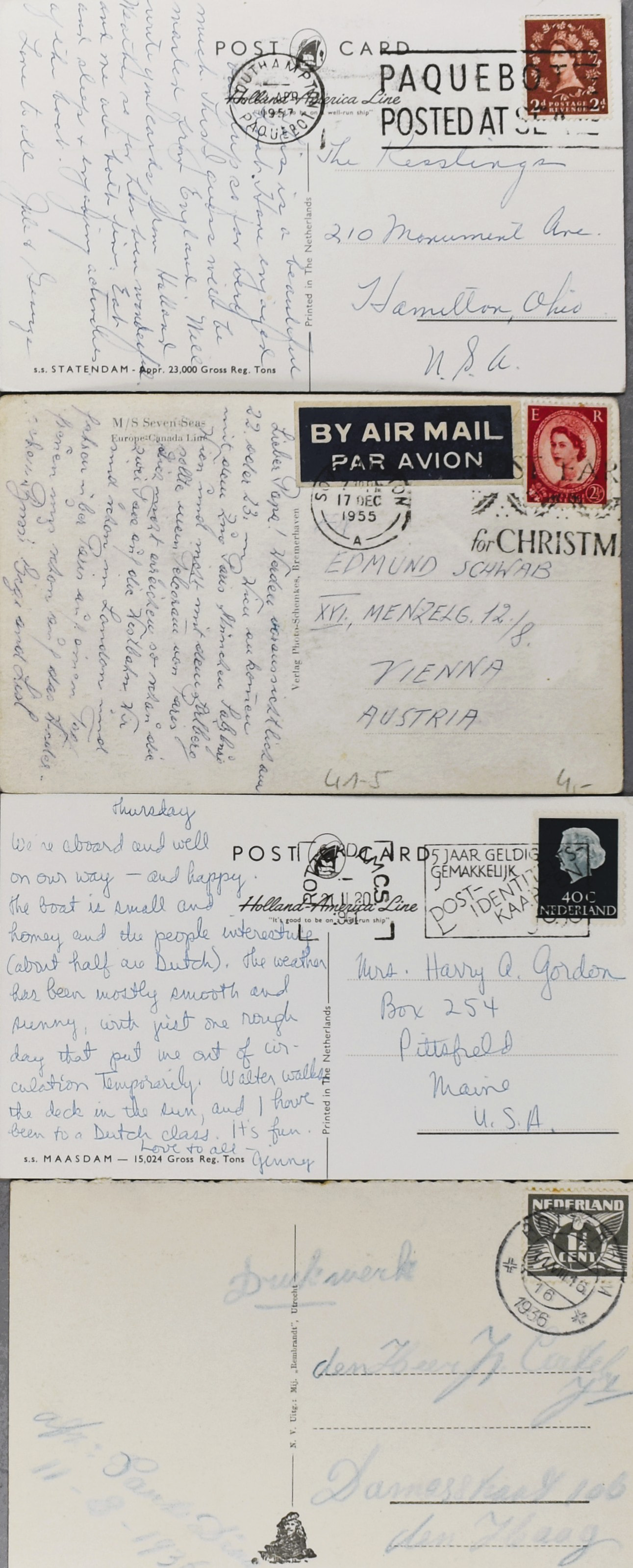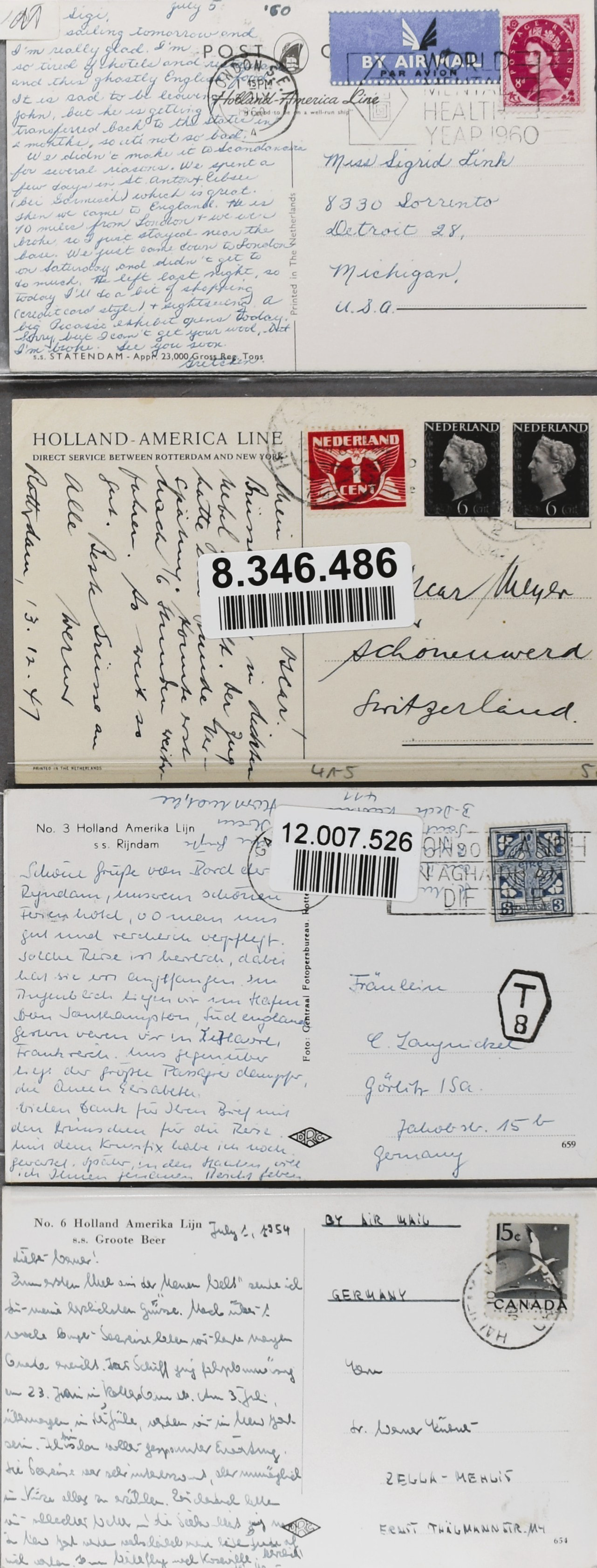 82 imageSCHEEPSPOST NEDERLAND. Ca. 600 poststukken/veel prentbriefkaarten uit allerlei landen met gevarieerde frankeringen en bestemmingen (o.a. USA naar Hollandia-Binnen, 1961) van hoofdzakelijk de Holland-Amerika Lijn (HAL, NASM), met een grote verscheidenheid aan stempels van postagenten aan boord zoals van de Groote Beer, Maasdam, Noordam, Nieuw Amsterdam, Rotterdam, Rijndam, Statendam etc., scheepsstempels als s.s. Maasdam/Ocean Post van de vele schepen (in blauw, violet, zwart), HAL-enveloppen, postbladen, (prent)briefkaarten, etc. Tevens Paquebot-stempels, perfins, censuur, roodfrankeringen, HAL-labels (sluitzegels), etc. etc. Prachtkavel voor de liefhebber van scheepspost! (Image) (Image2) (Image3) (Image4) (Image5) (Image6) (Image7) (Image8) (Image9) (Image10) (Image11) (Image12) (Image13) (All Images)