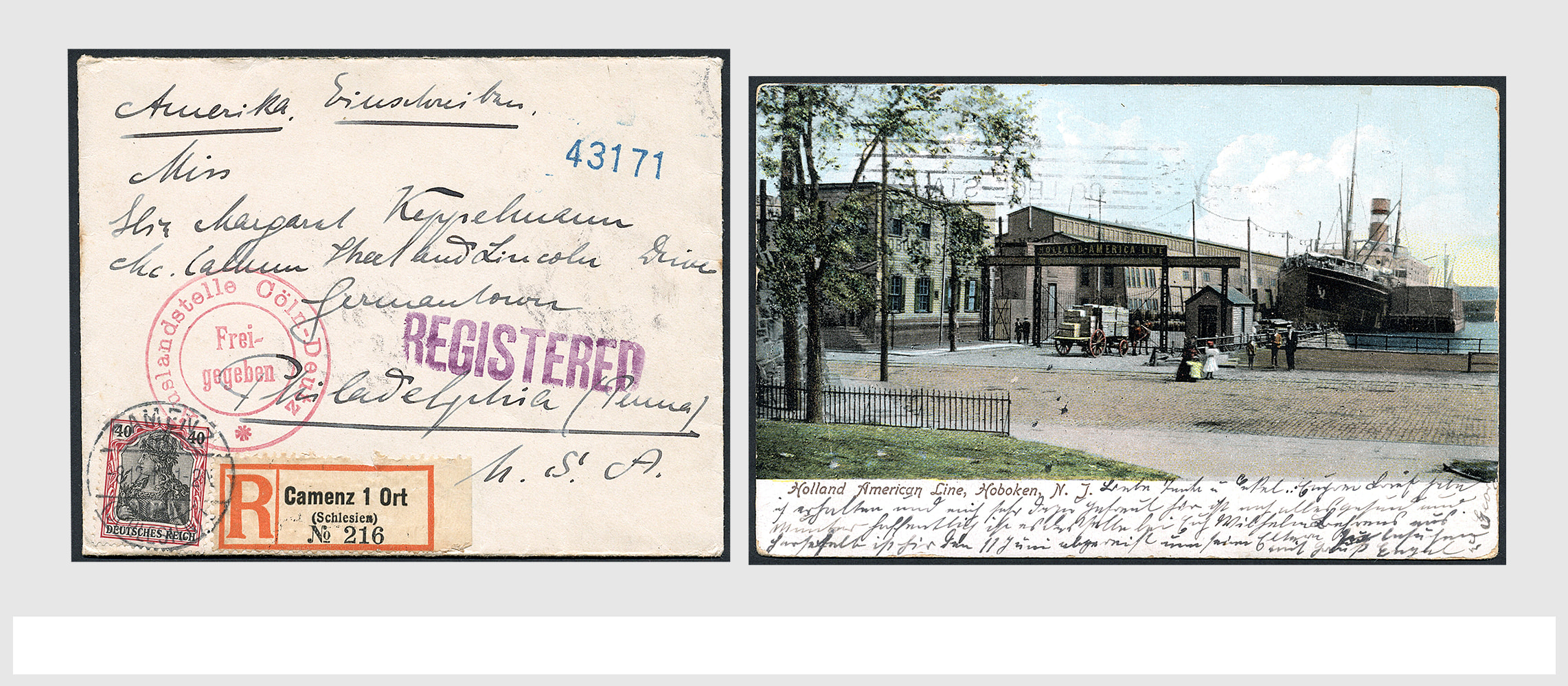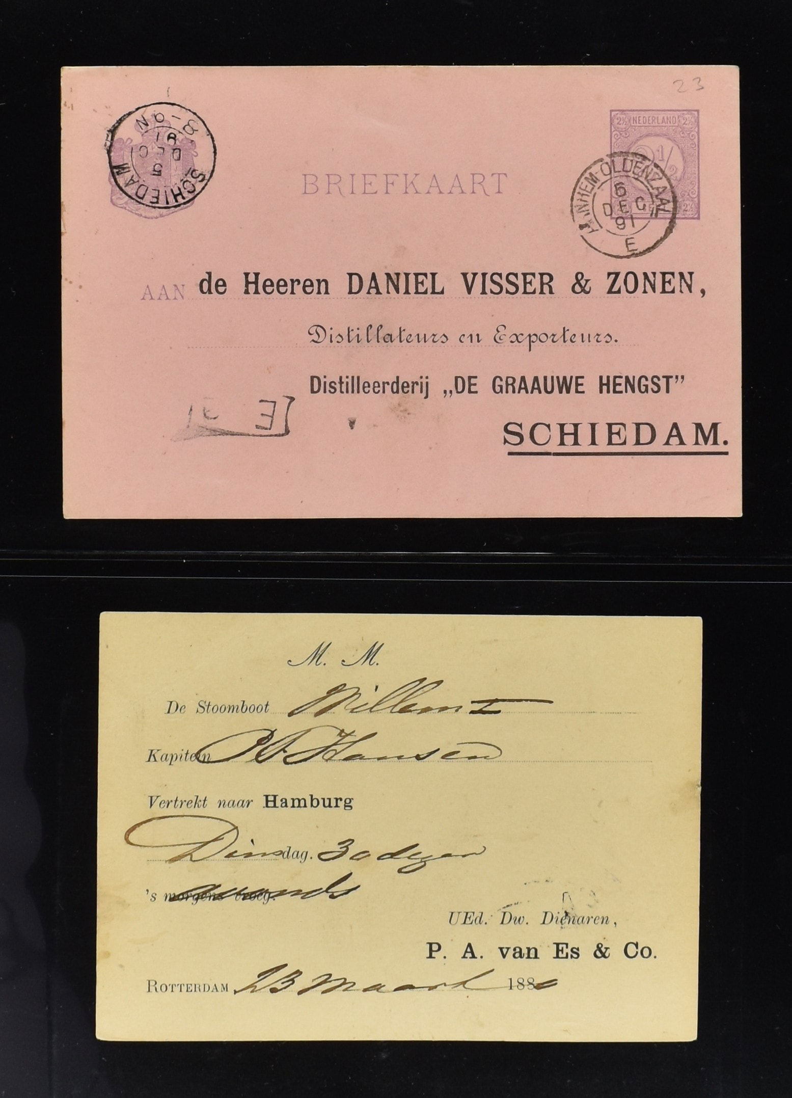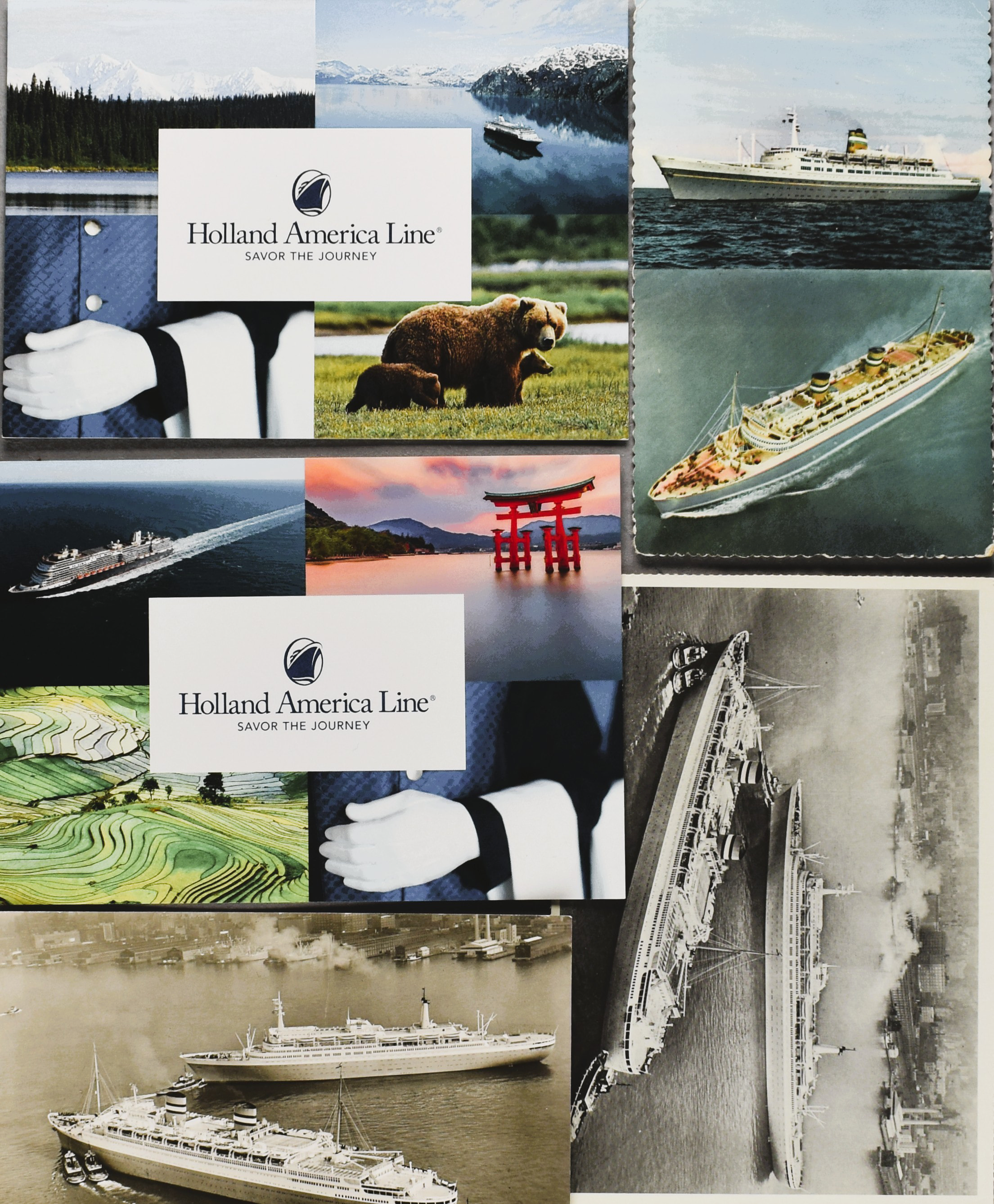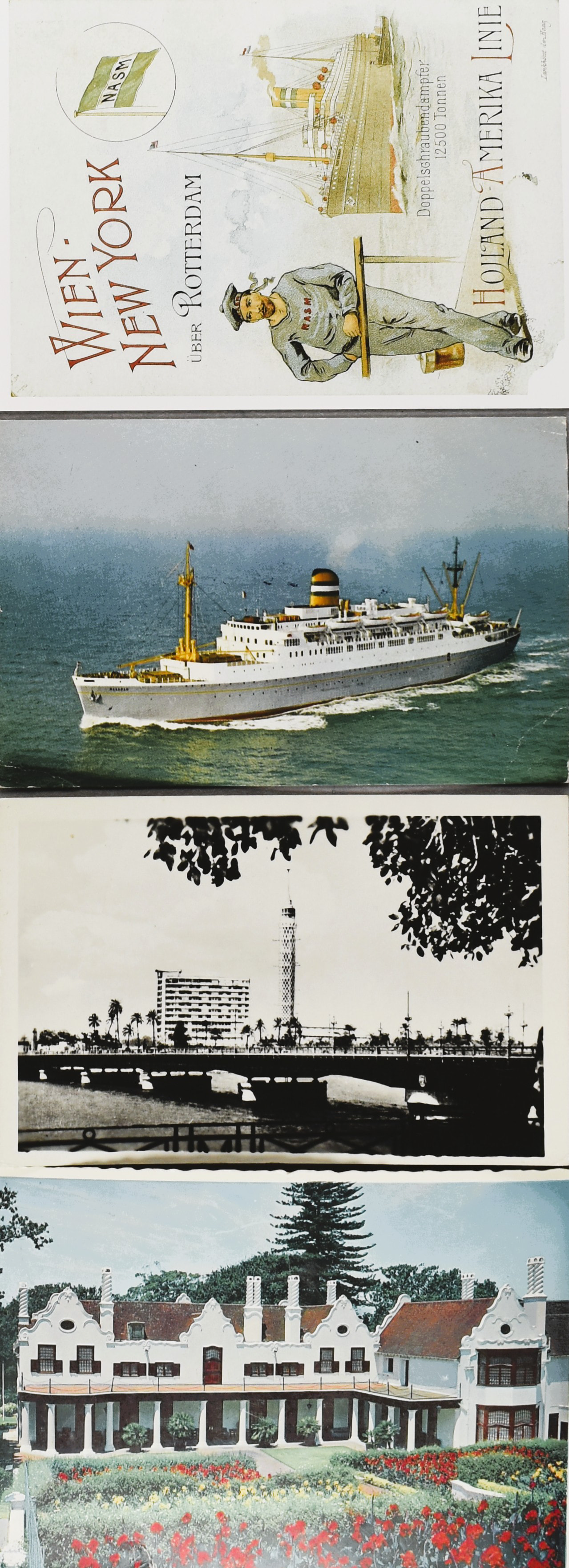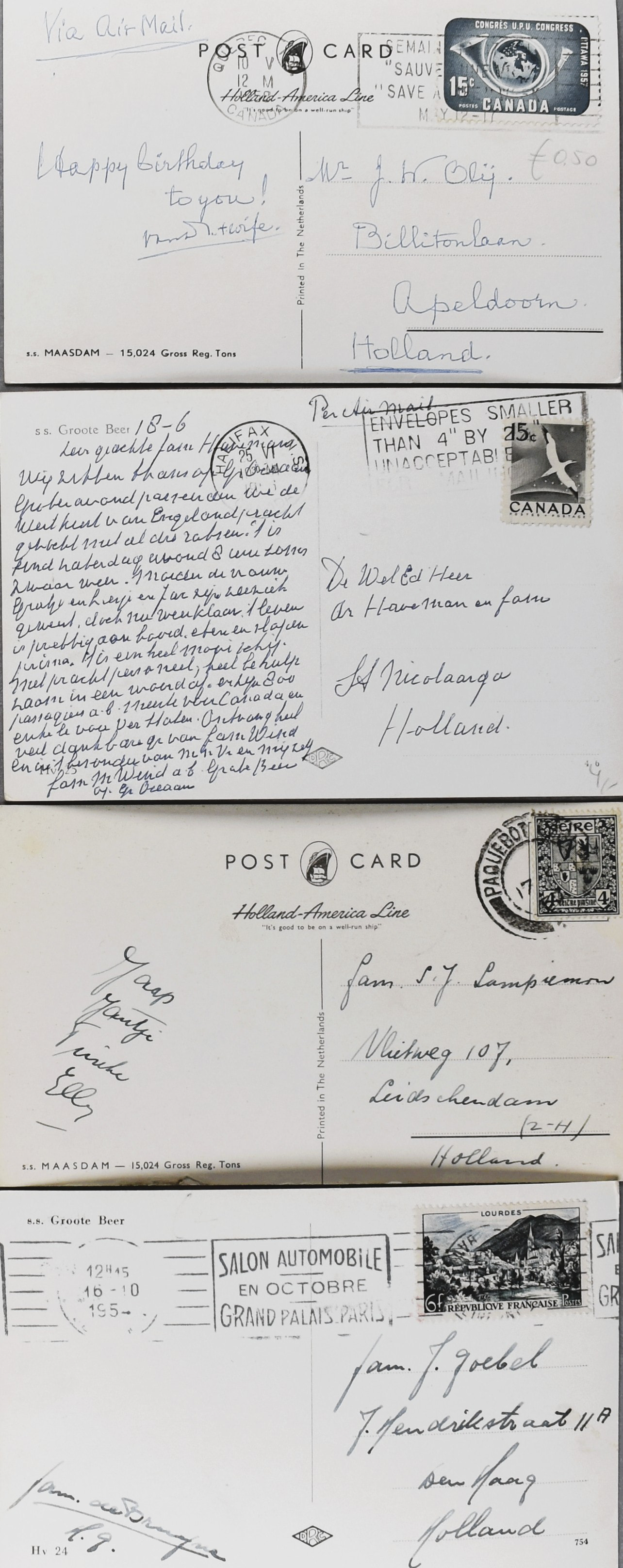82 imageSCHEEPSPOST NEDERLAND. Ca. 600 poststukken/veel prentbriefkaarten uit allerlei landen met gevarieerde frankeringen en bestemmingen (o.a. USA naar Hollandia-Binnen, 1961) van hoofdzakelijk de Holland-Amerika Lijn (HAL, NASM), met een grote verscheidenheid aan stempels van postagenten aan boord zoals van de Groote Beer, Maasdam, Noordam, Nieuw Amsterdam, Rotterdam, Rijndam, Statendam etc., scheepsstempels als s.s. Maasdam/Ocean Post van de vele schepen (in blauw, violet, zwart), HAL-enveloppen, postbladen, (prent)briefkaarten, etc. Tevens Paquebot-stempels, perfins, censuur, roodfrankeringen, HAL-labels (sluitzegels), etc. etc. Prachtkavel voor de liefhebber van scheepspost! (Image) (Image2) (Image3) (Image4) (Image5) (Image6) (Image7) (Image8) (Image9) (Image10) (Image11) (Image12) (Image13) (All Images)