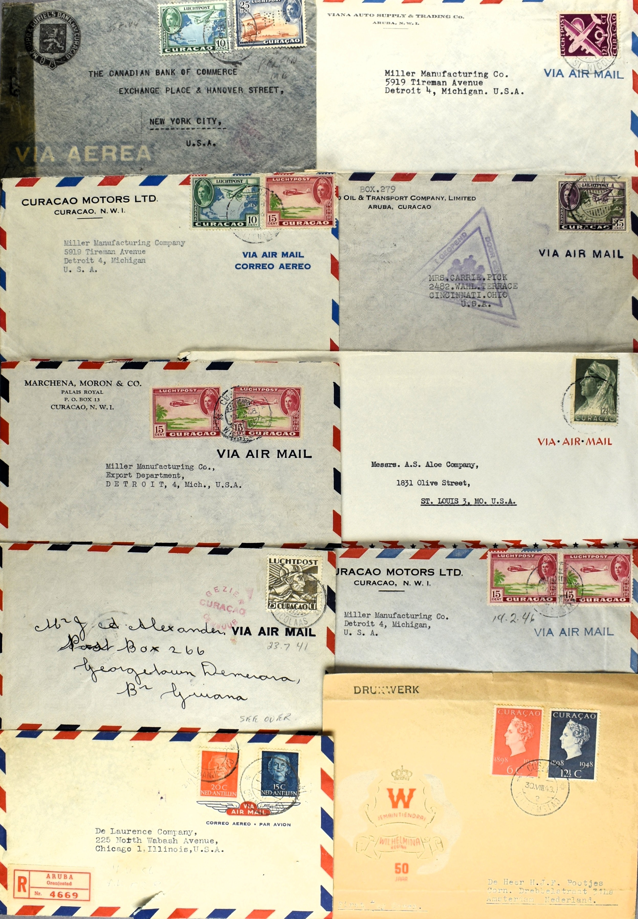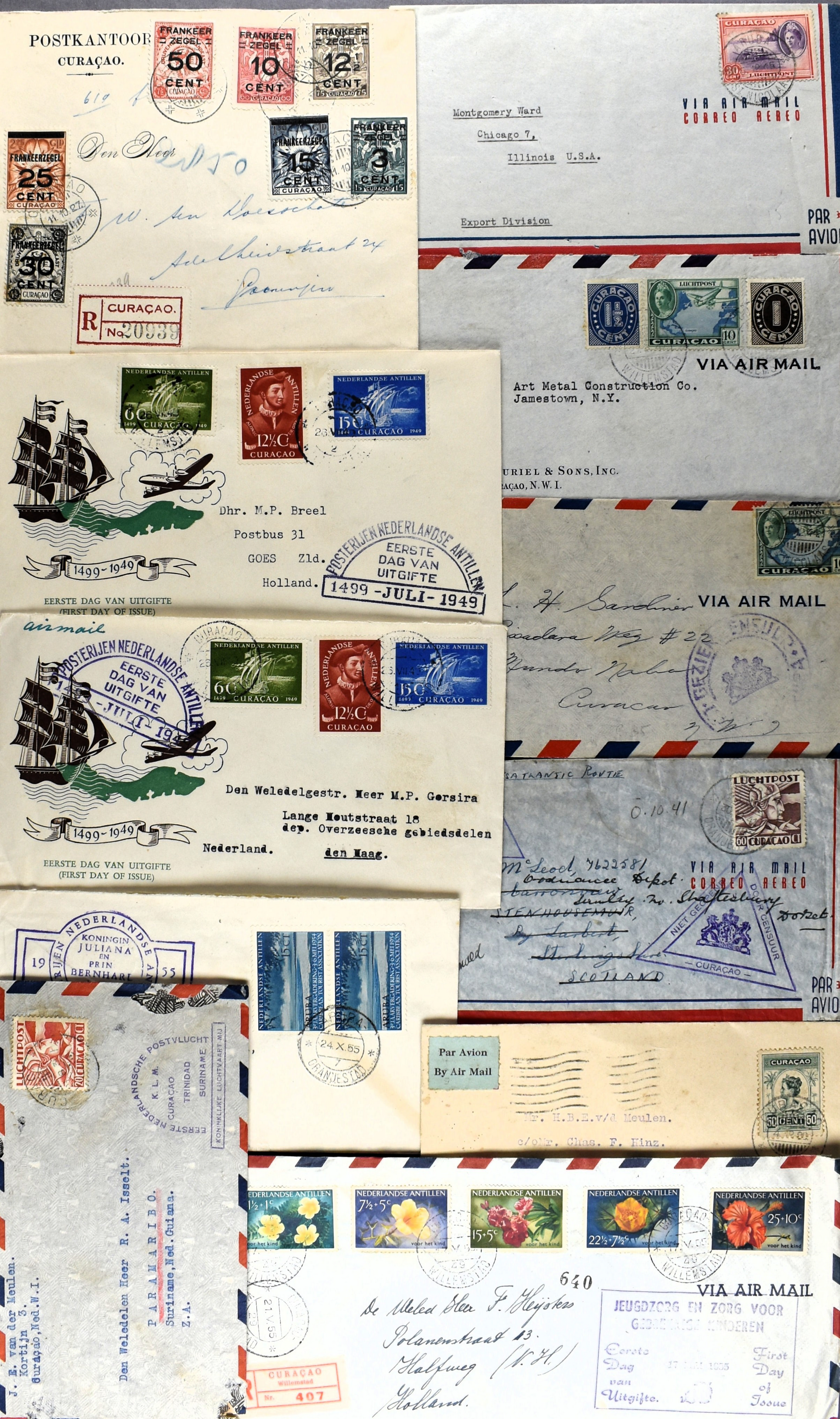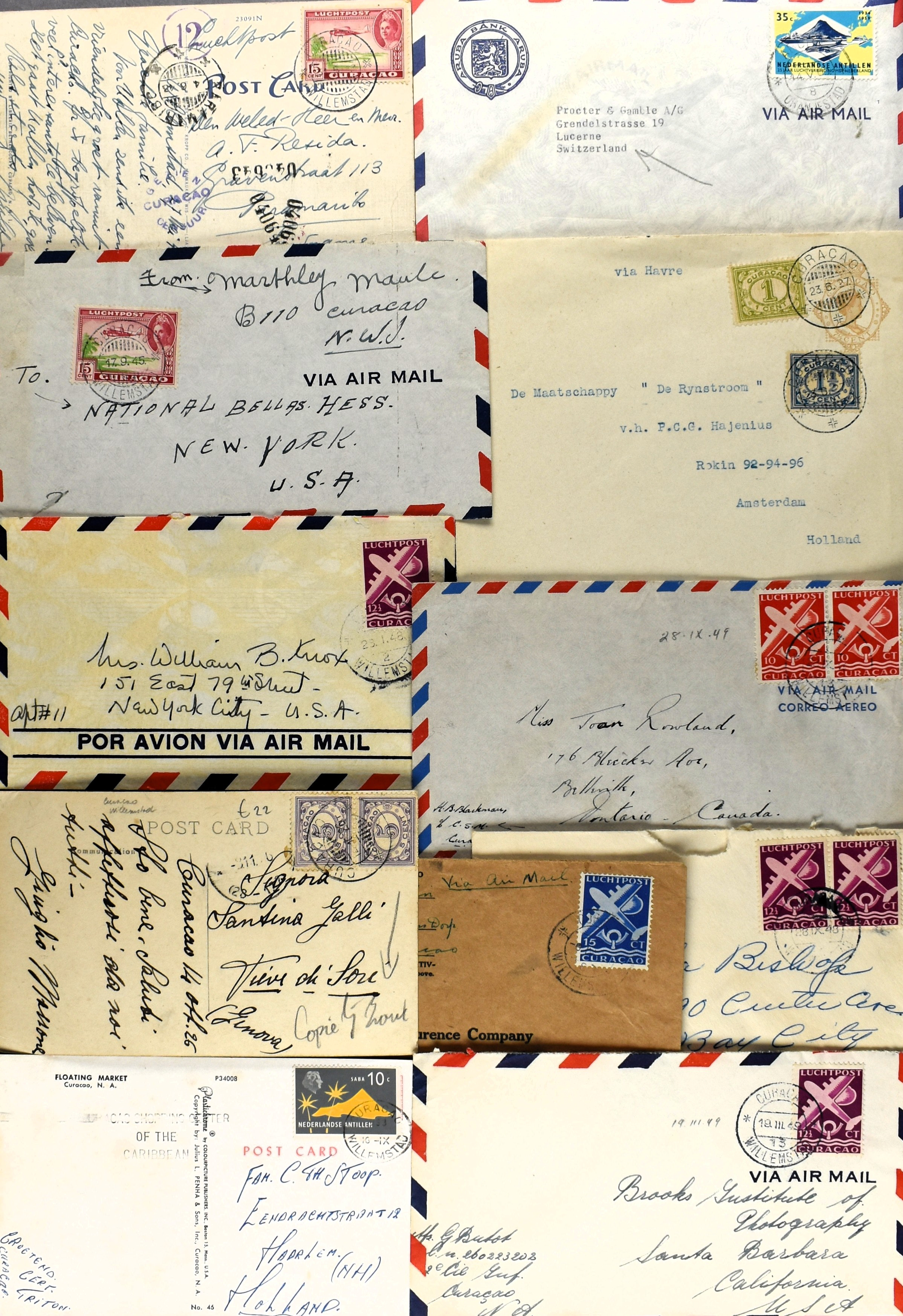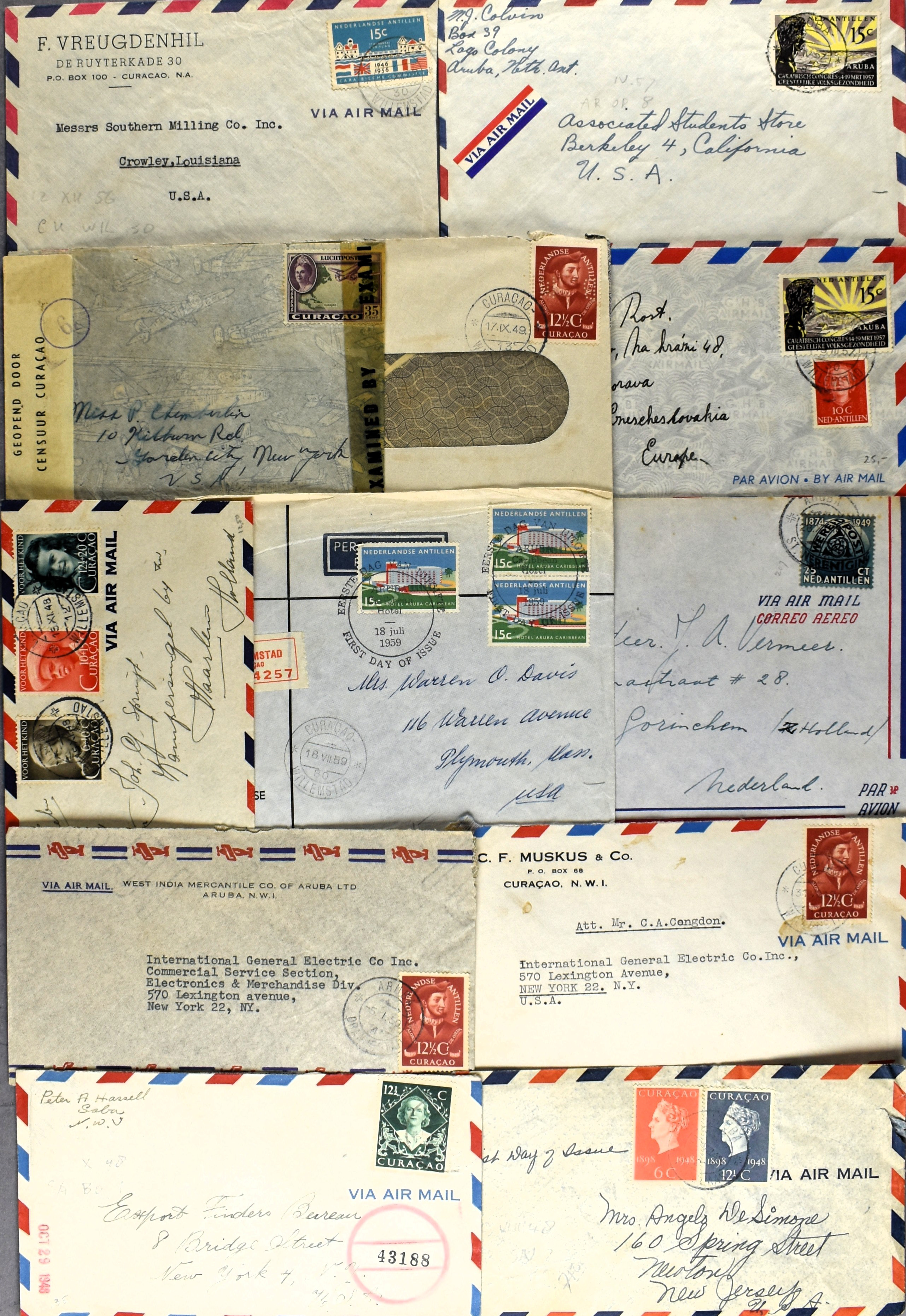 86 imageCURAÇAO & NED. ANTILLEN POSTHISTORIE, partij poststukken w.o. (enkel)frankeringen, aardige variëteit aan poststempels w.o. zeldzame Dokterstuin, roodfrankeringen en machinaal, FDC's, luchtpost en speciale vluchten, aangetekend, censuur stempels en stroken, bestemmingen, etc. (Image) (Image2) (Image3) (Image4) (Image5) (Image6) (Image7) (Image8) (Image9) (Image10) (Image11) (All Images)