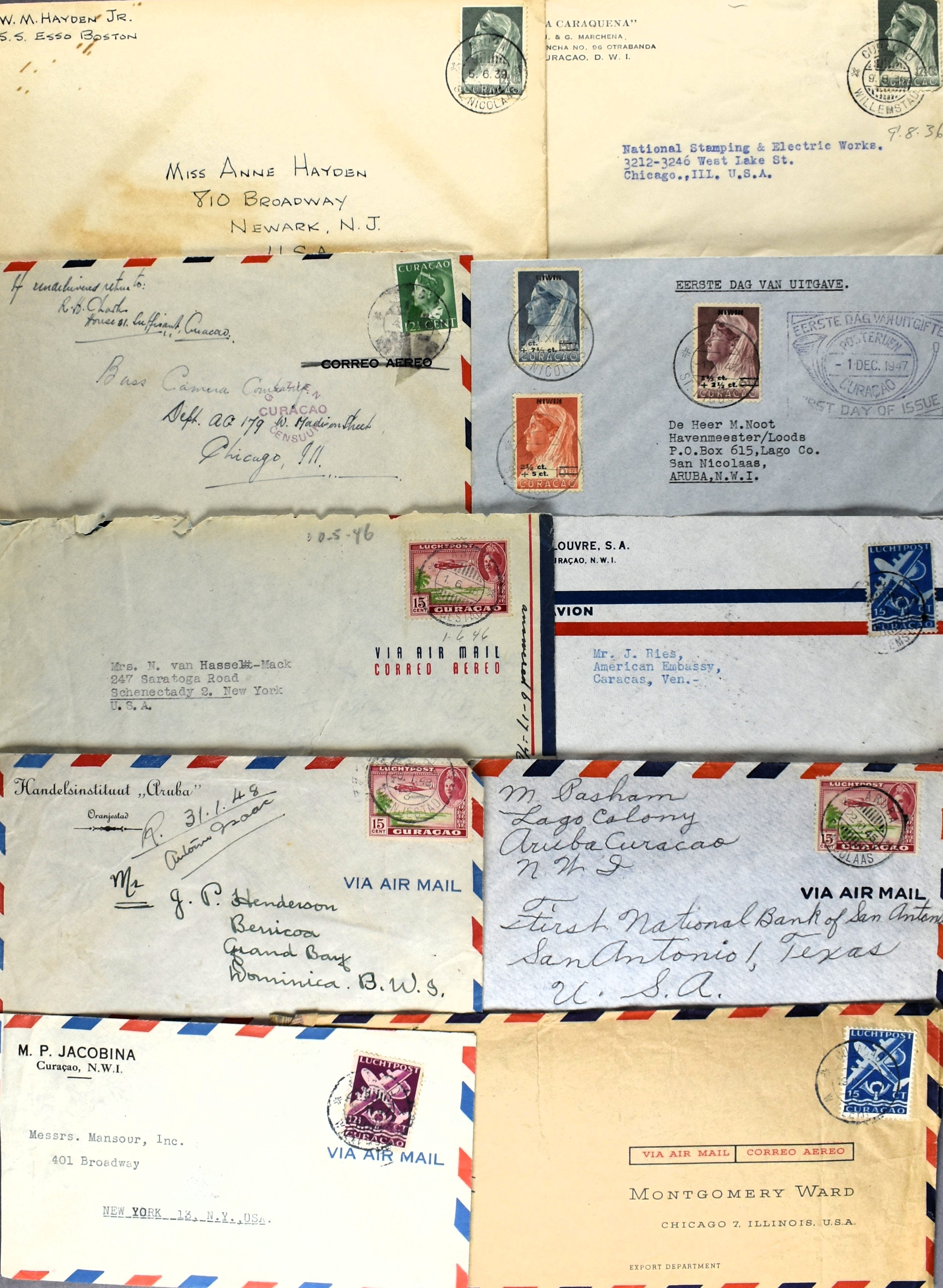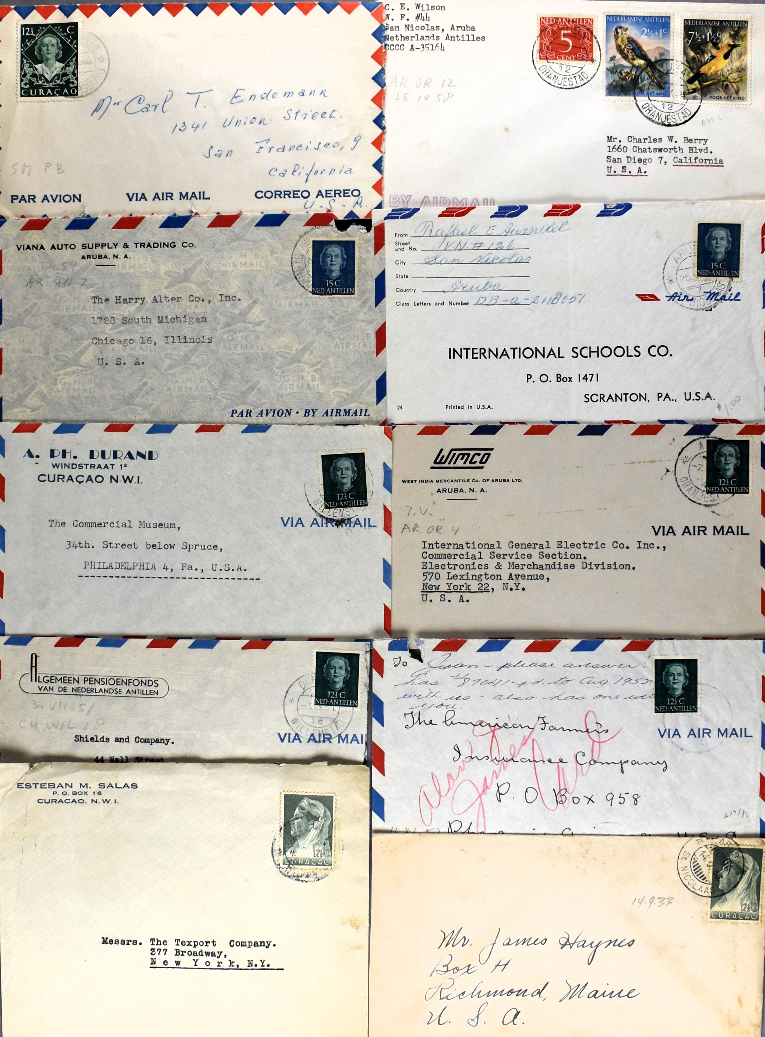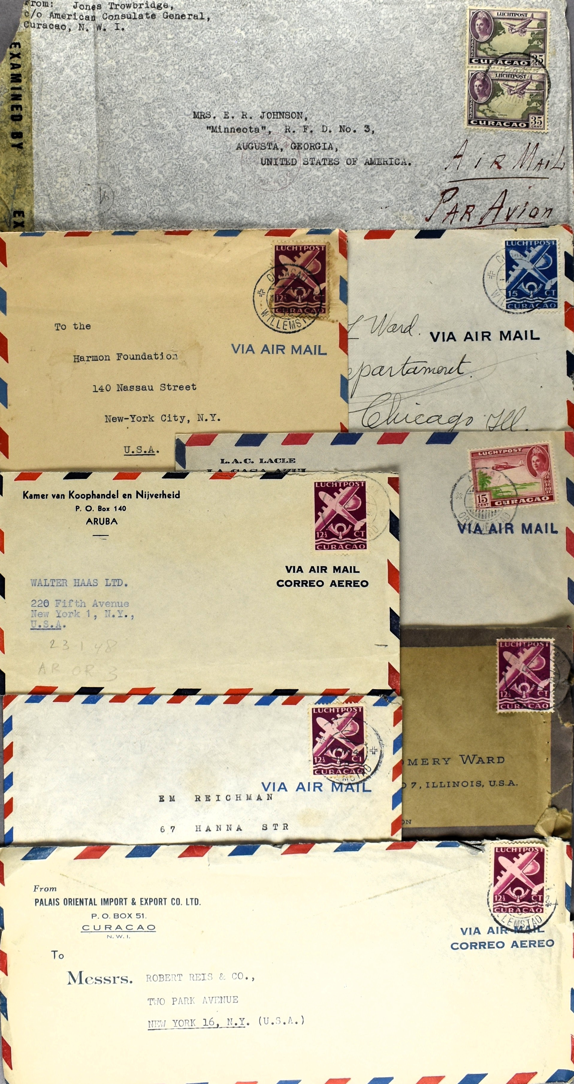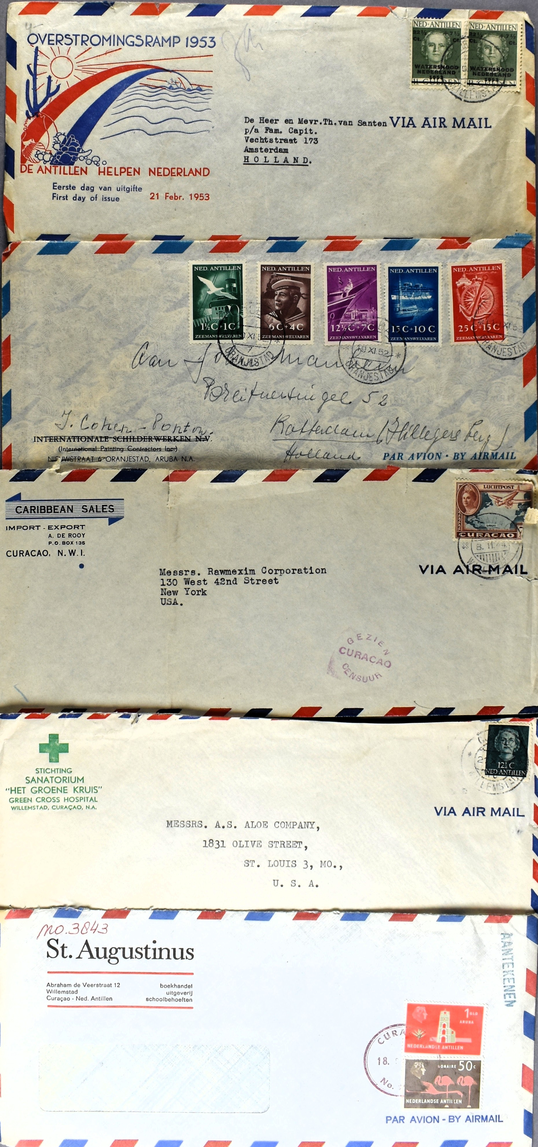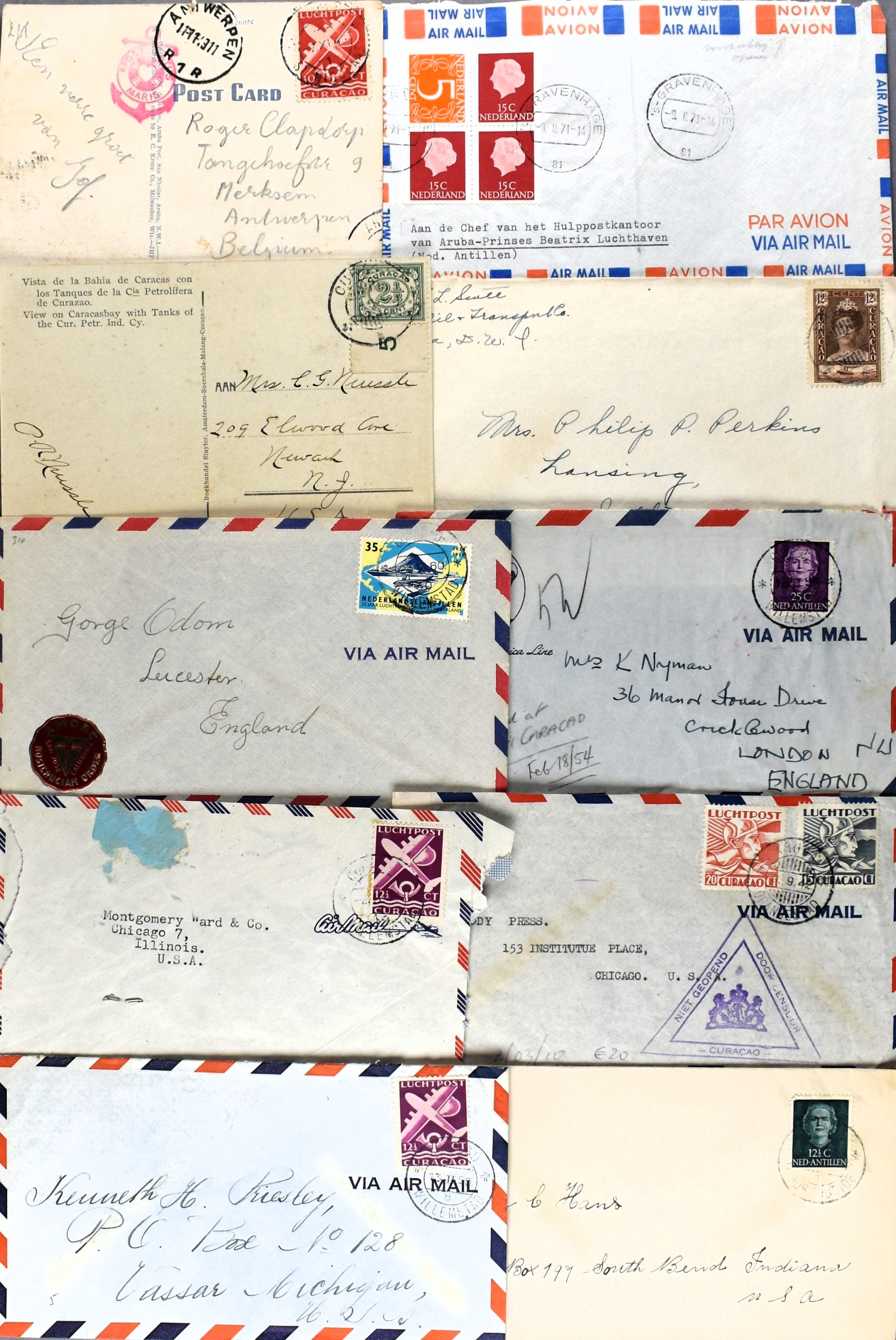 86 imageCURAÇAO & NED. ANTILLEN POSTHISTORIE, partij poststukken w.o. (enkel)frankeringen, aardige variëteit aan poststempels w.o. zeldzame Dokterstuin, roodfrankeringen en machinaal, FDC's, luchtpost en speciale vluchten, aangetekend, censuur stempels en stroken, bestemmingen, etc. (Image) (Image2) (Image3) (Image4) (Image5) (Image6) (Image7) (Image8) (Image9) (Image10) (Image11) (All Images)