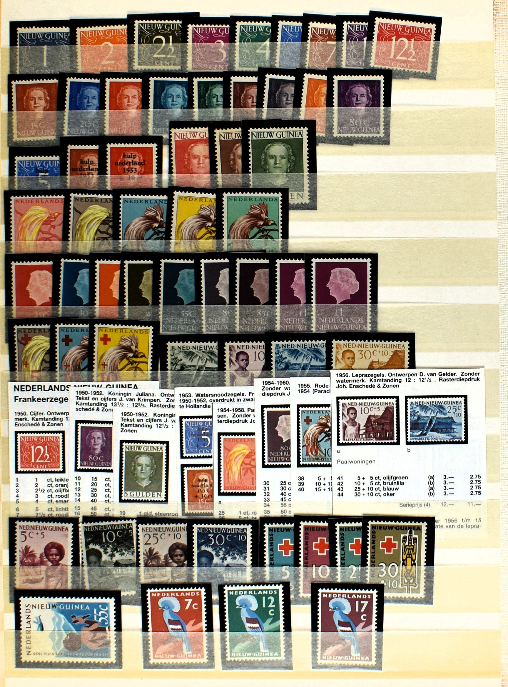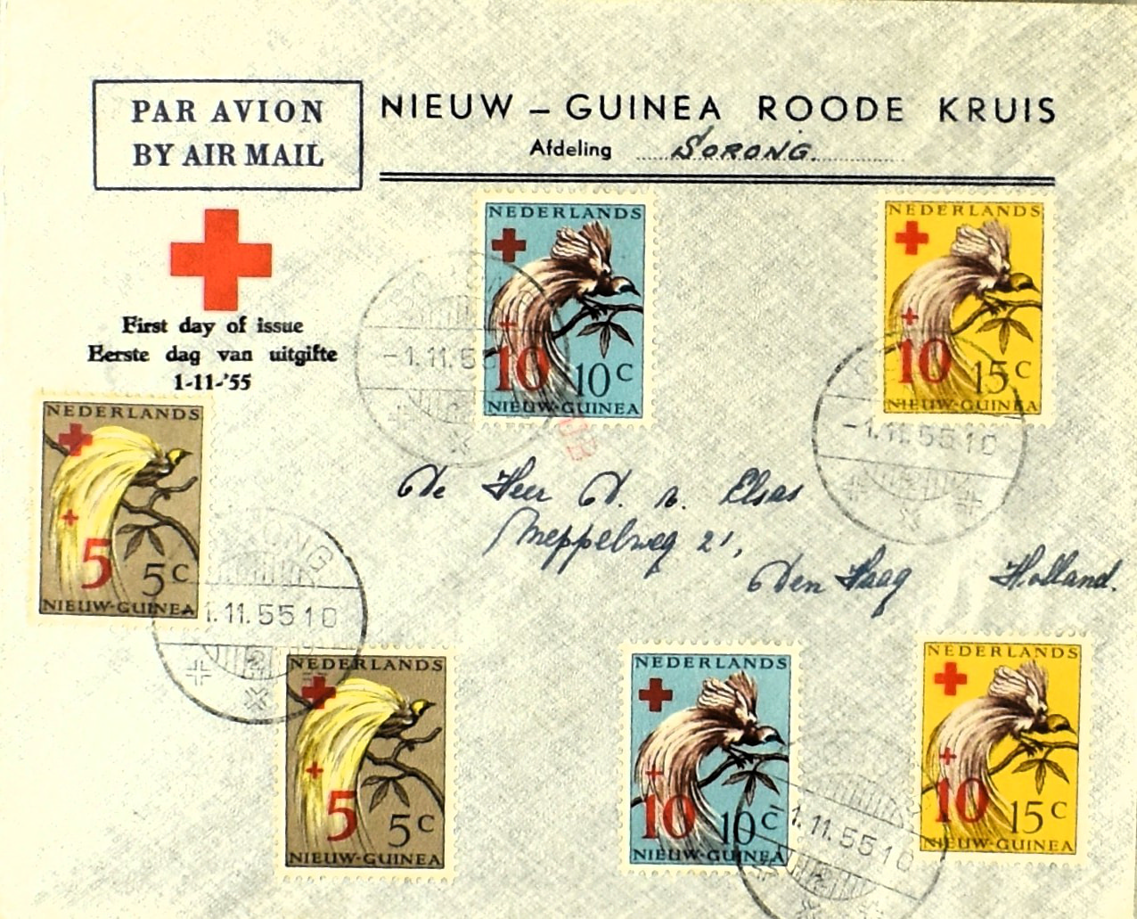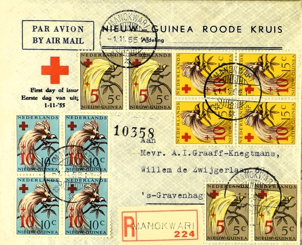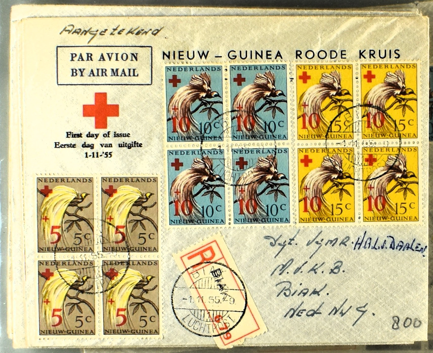 117 imageNED. NIEUW-GUINEA FDC's, een zeer uitgebreide verzameling inclusief voorlopers van nrs. 45/48, 38/40 en 41/44, elk nummer E1 t/m E11 zit in een aparte kleine ringband, sterk gespecialiseerd w.o. aangetekend, binnenlandse bestemmingen en naar Nederland (w.o. vervuild aangekomen exemplaren), diverse aankomststempels, diversen niet met speciaal FDC-stempel maar van bestelhuis met datum, blanco enveloppen, met wellicht voor de expert diverse andere variëteiten, etc. in totaal 12 ringbandjes in doos. Voor de specialistische liefhebber! Ex Hoogenboom (Image) (Image2) (Image3) (Image4) (Image5) (Image6) (Image7) (Image8) (All Images)