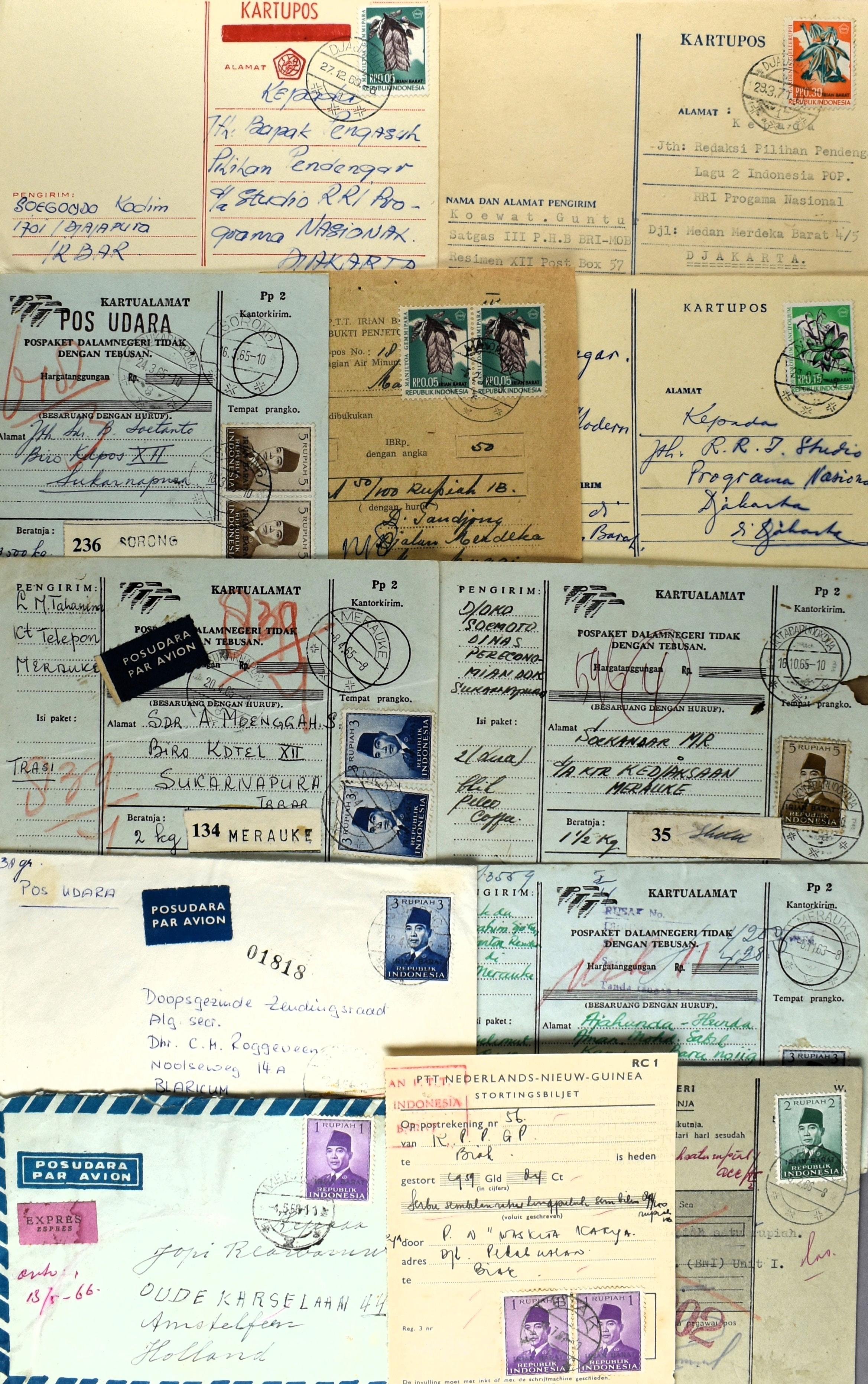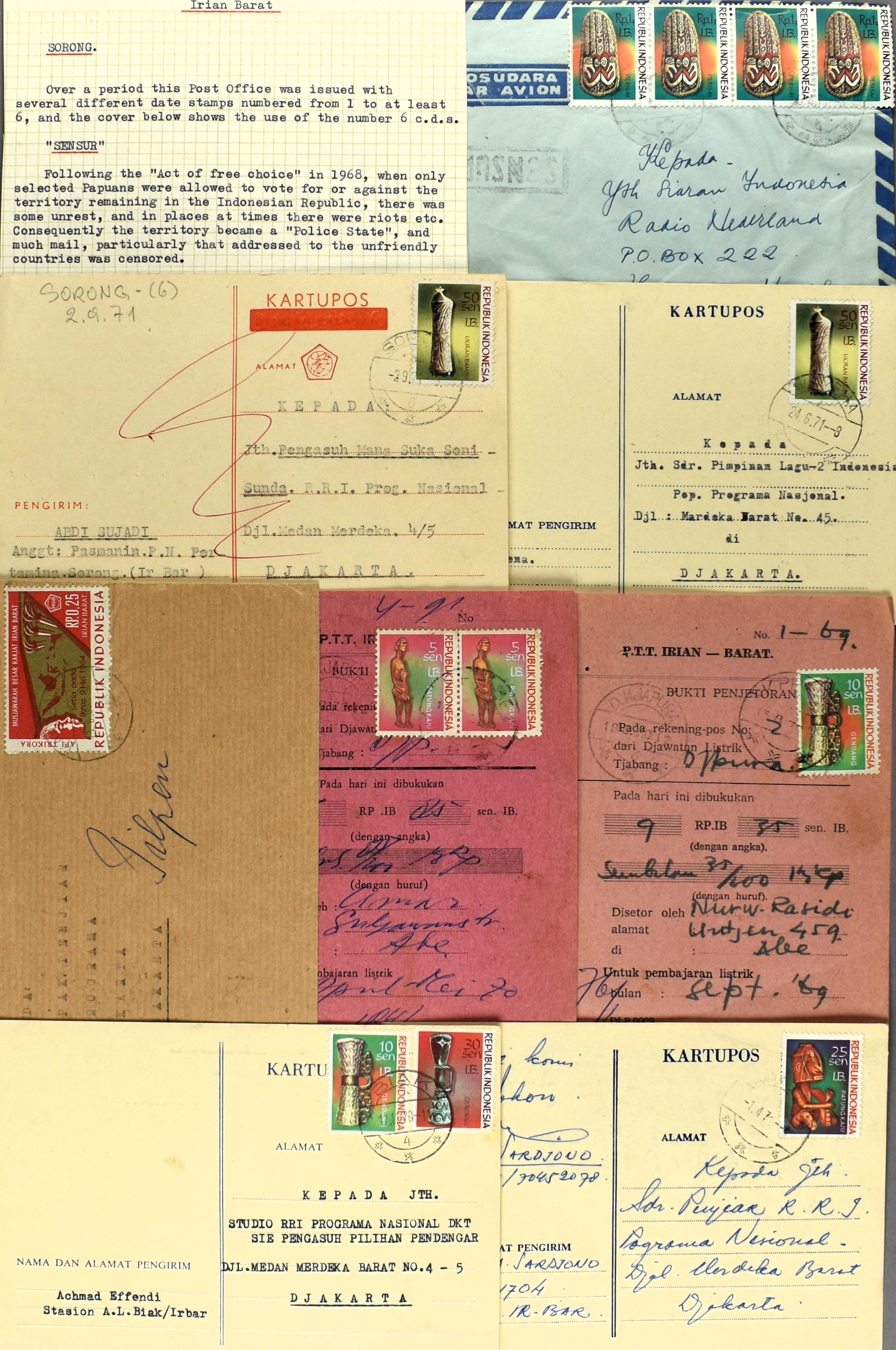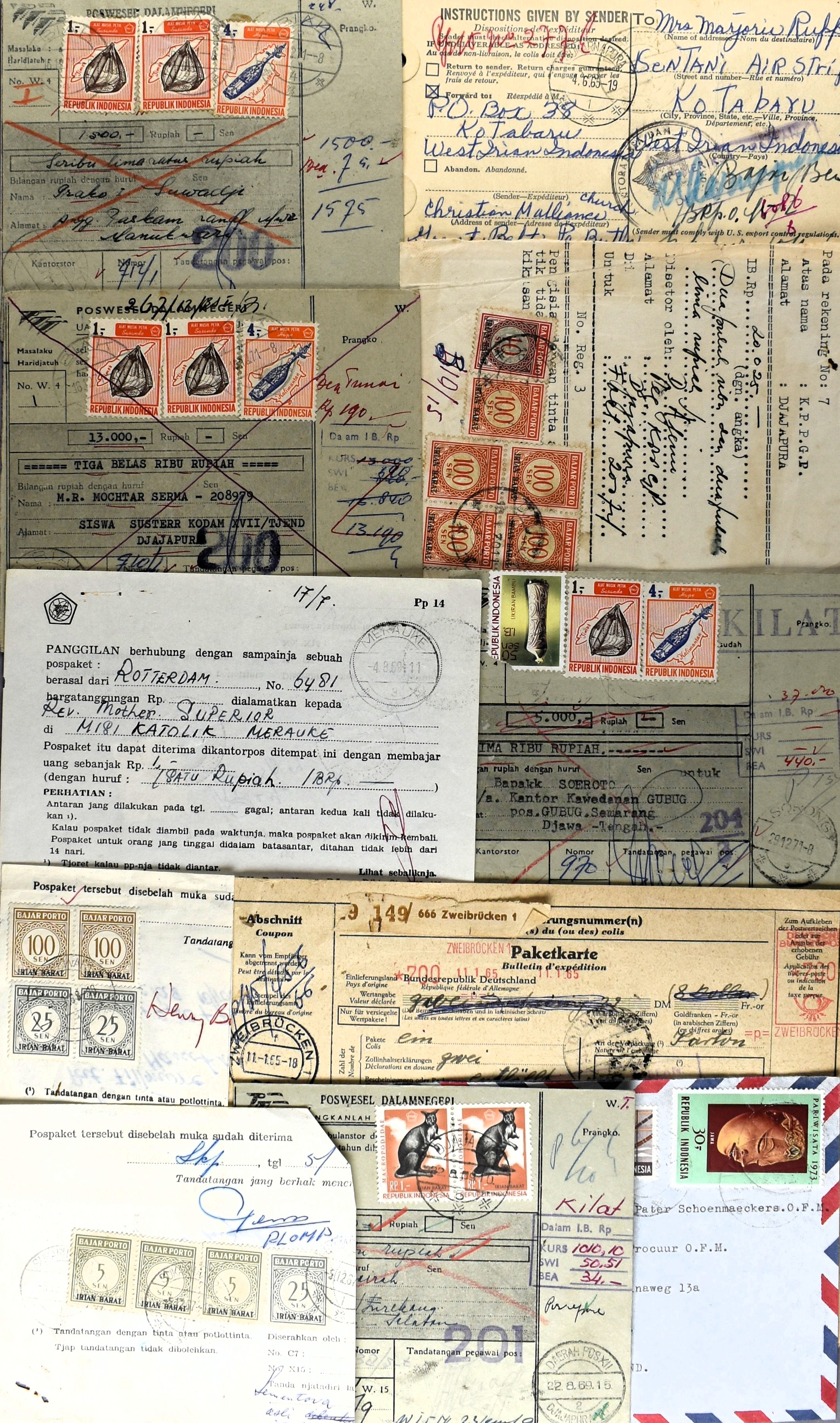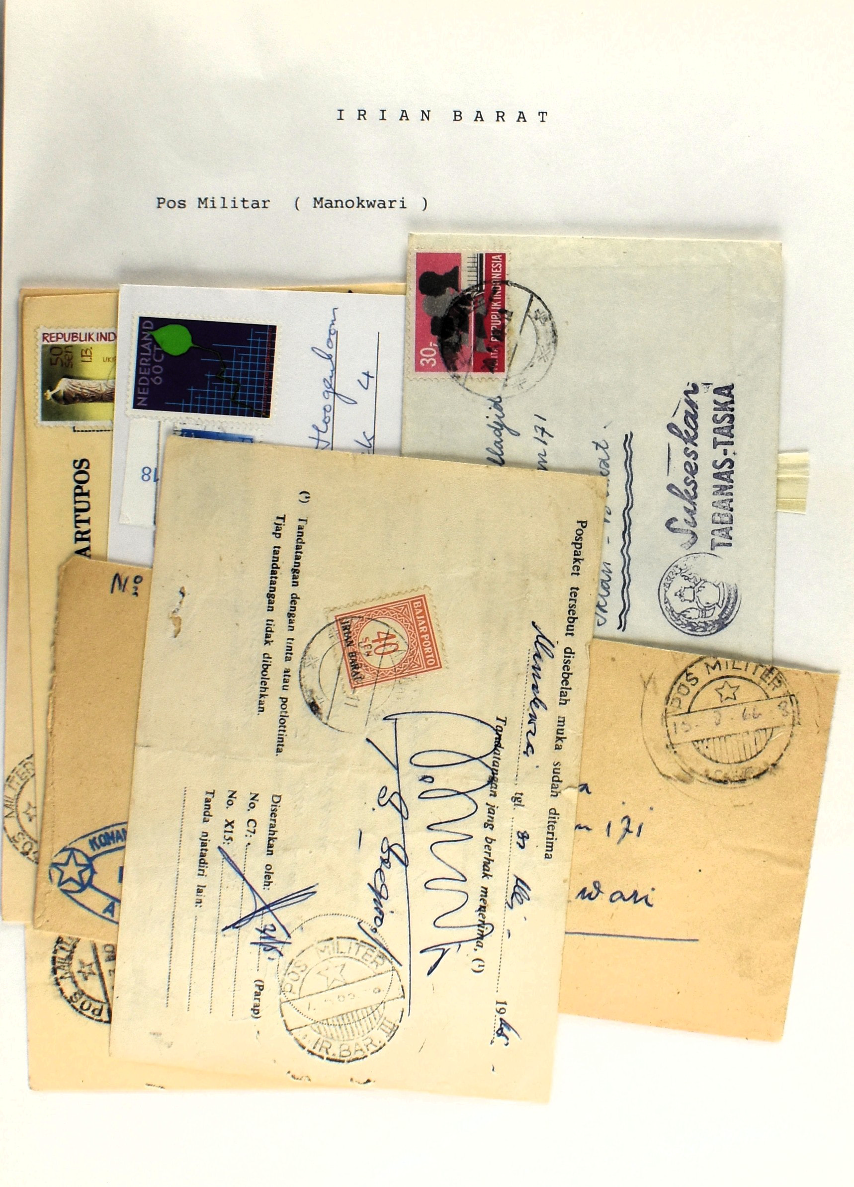 115 imageIRIAN BARAT POSTAL HISTORY, collection of hundreds postal items consisting of covers, postcards, a wide variety of all kinds of postal forms, postal labels including for registered and by express delivery, airmail, postage stamps (IB 1963-1970 and Irian from 1971 onwards), postage stamps including postage dues on entire, a wonderful array of postmarks including many delivery houses (= rumahpos), well documented written up on album pages in 2 ring binders, 3 small boxes (IB, Irian from 1971 and Rumahpos), and 2 stock books with stamps on pieces etc. etc. In such a quantity and variety never offered before. Ex Hoogenboom (Image) (Image2) (Image3) (Image4) (Image5) (Image6) (Image7) (Image8) (Image9) (Image10) (Image11) (Image12) (Image13) (Image14) (Image15) (Image16) (Image17) (Image18) (Image19) (Image20) (Image21) (Image22) (Image23) (Image24) (Image25) (All Images)