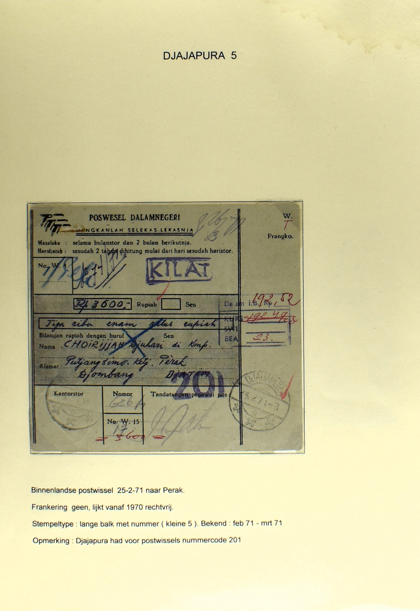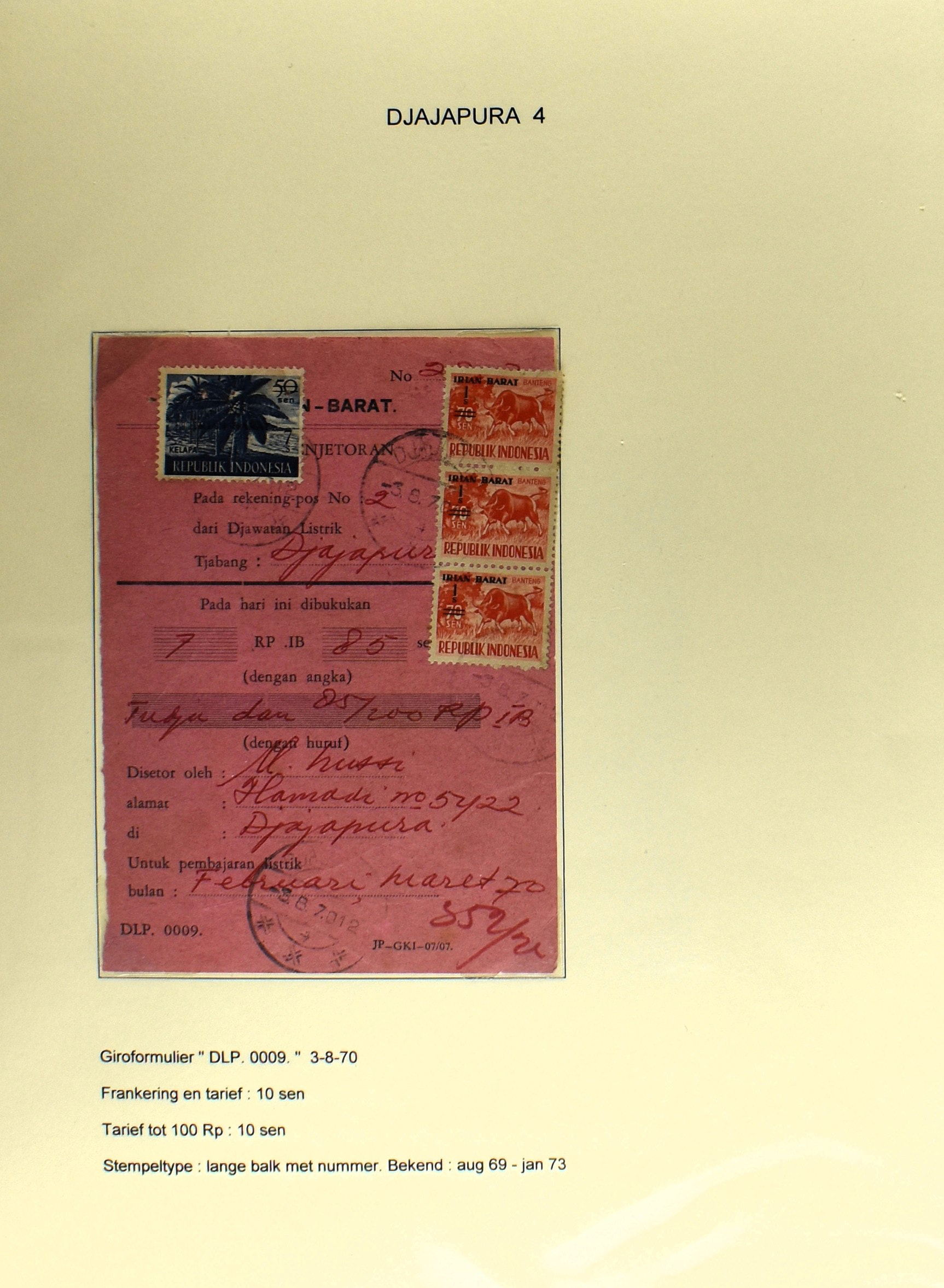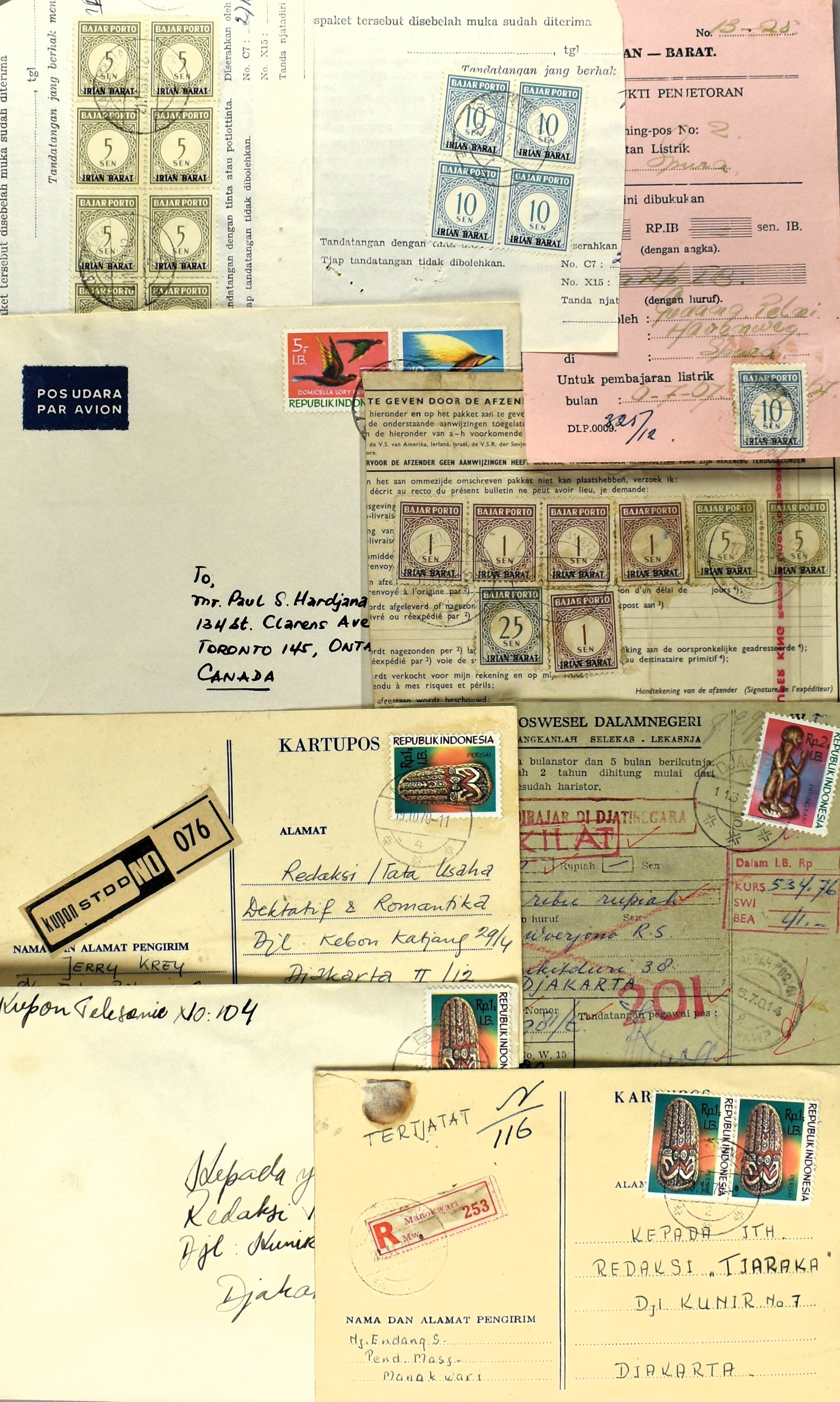 115 imageIRIAN BARAT POSTAL HISTORY, collection of hundreds postal items consisting of covers, postcards, a wide variety of all kinds of postal forms, postal labels including for registered and by express delivery, airmail, postage stamps (IB 1963-1970 and Irian from 1971 onwards), postage stamps including postage dues on entire, a wonderful array of postmarks including many delivery houses (= rumahpos), well documented written up on album pages in 2 ring binders, 3 small boxes (IB, Irian from 1971 and Rumahpos), and 2 stock books with stamps on pieces etc. etc. In such a quantity and variety never offered before. Ex Hoogenboom (Image) (Image2) (Image3) (Image4) (Image5) (Image6) (Image7) (Image8) (Image9) (Image10) (Image11) (Image12) (Image13) (Image14) (Image15) (Image16) (Image17) (Image18) (Image19) (Image20) (Image21) (Image22) (Image23) (Image24) (Image25) (All Images)